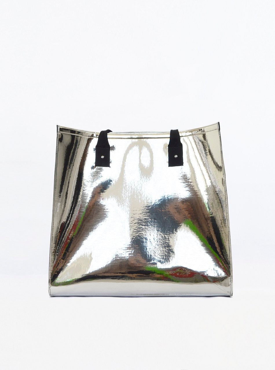 Bolsa de couro na cor prata com alças pretas. Possui interior forrado e dois bolsos.