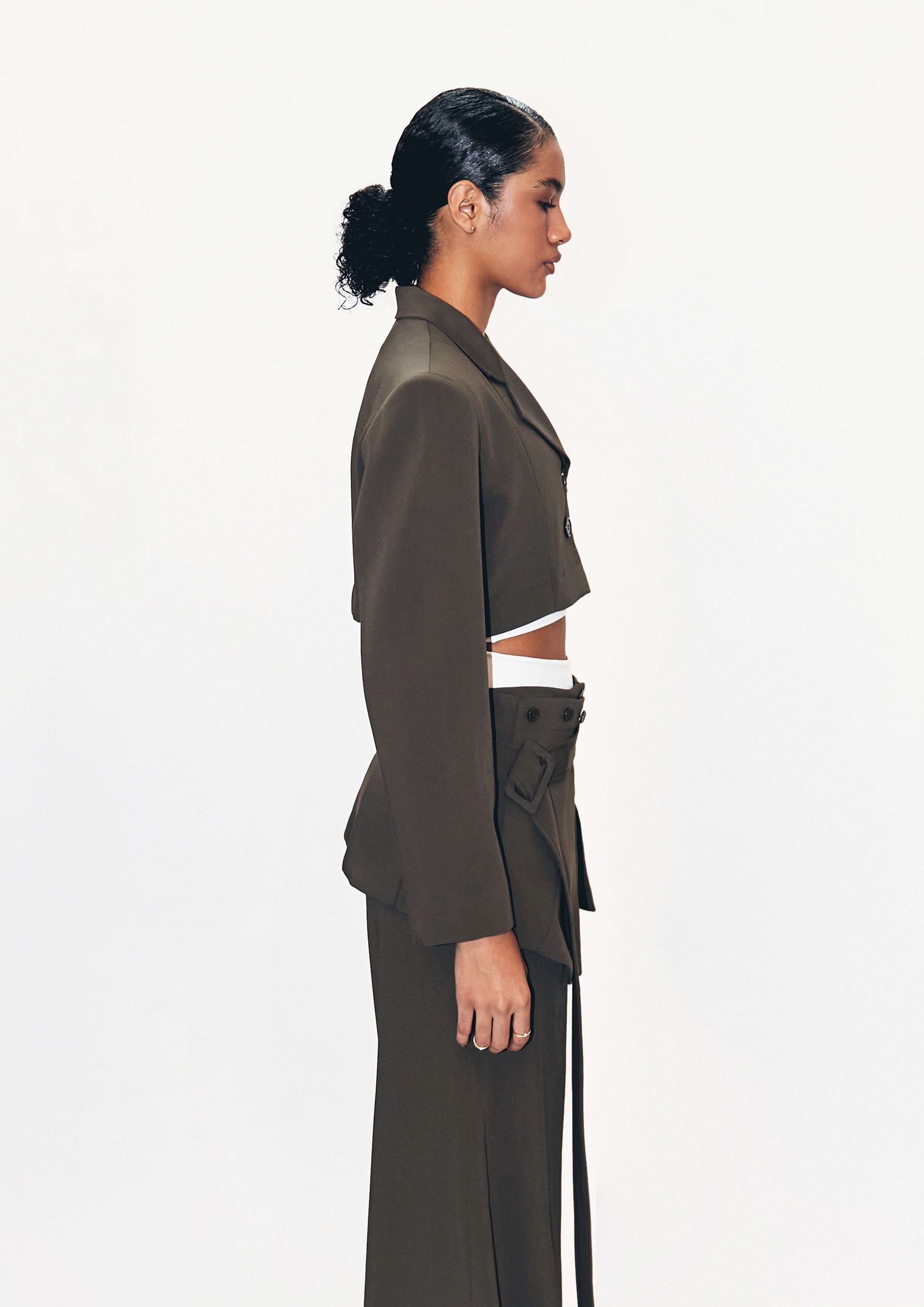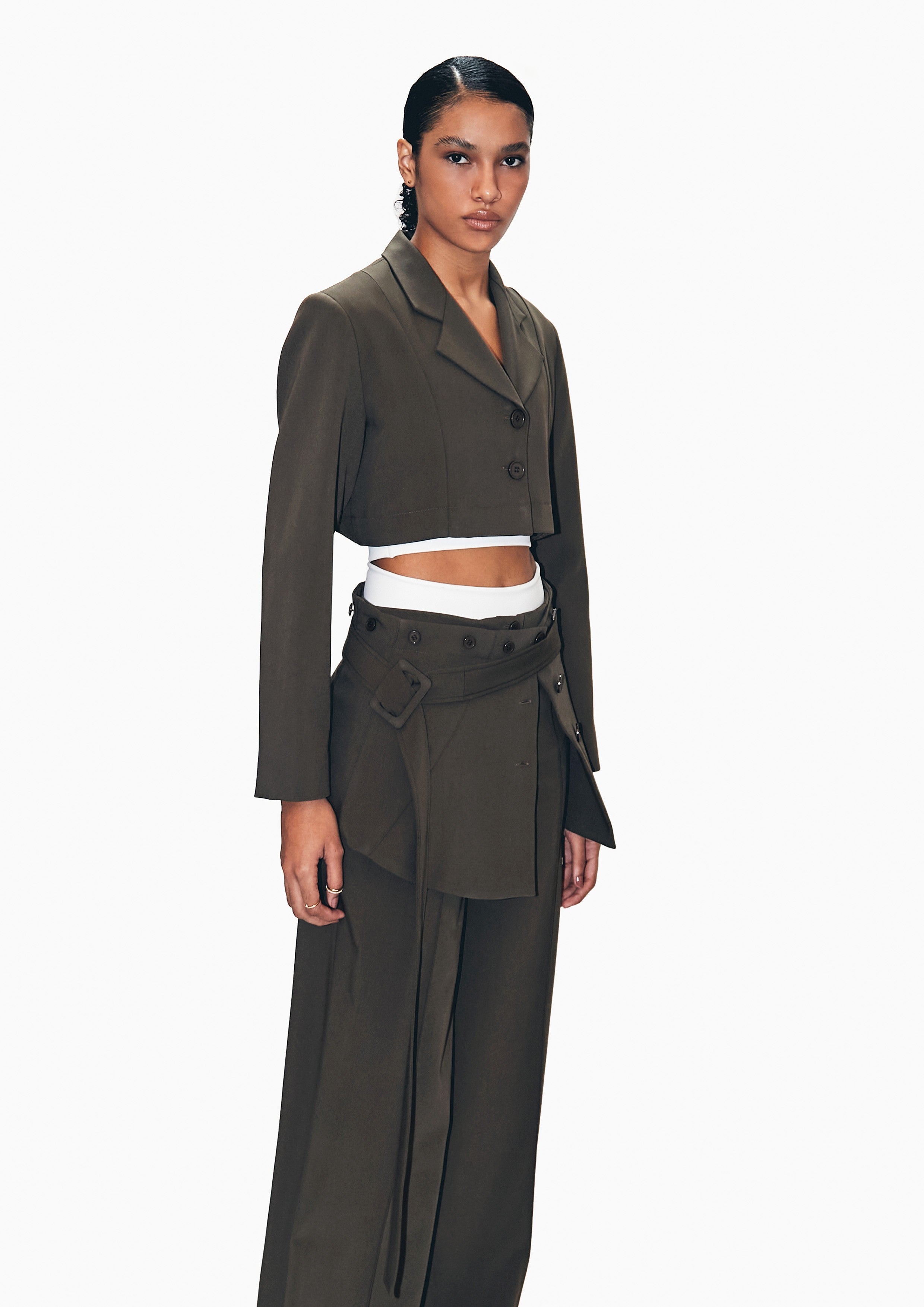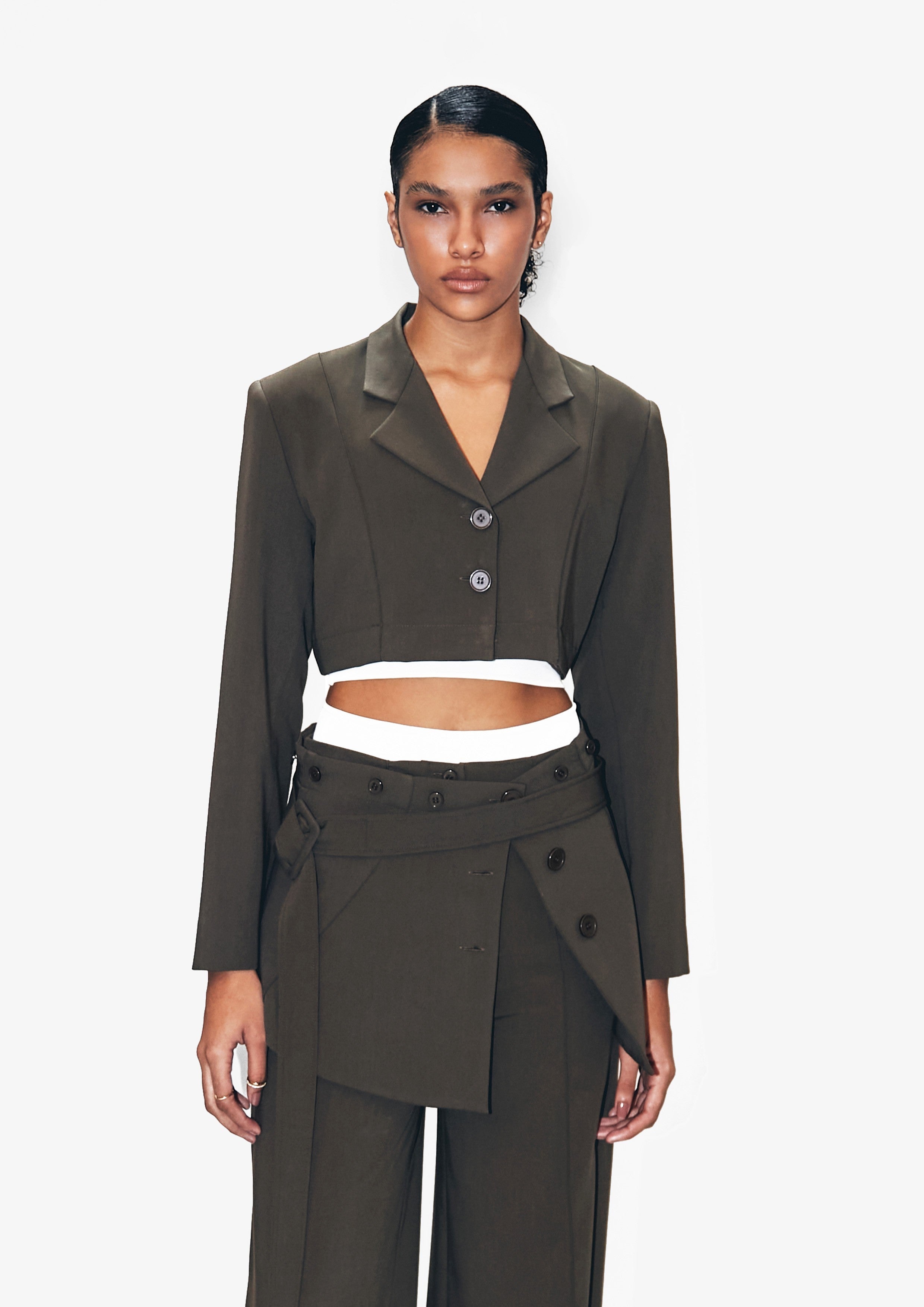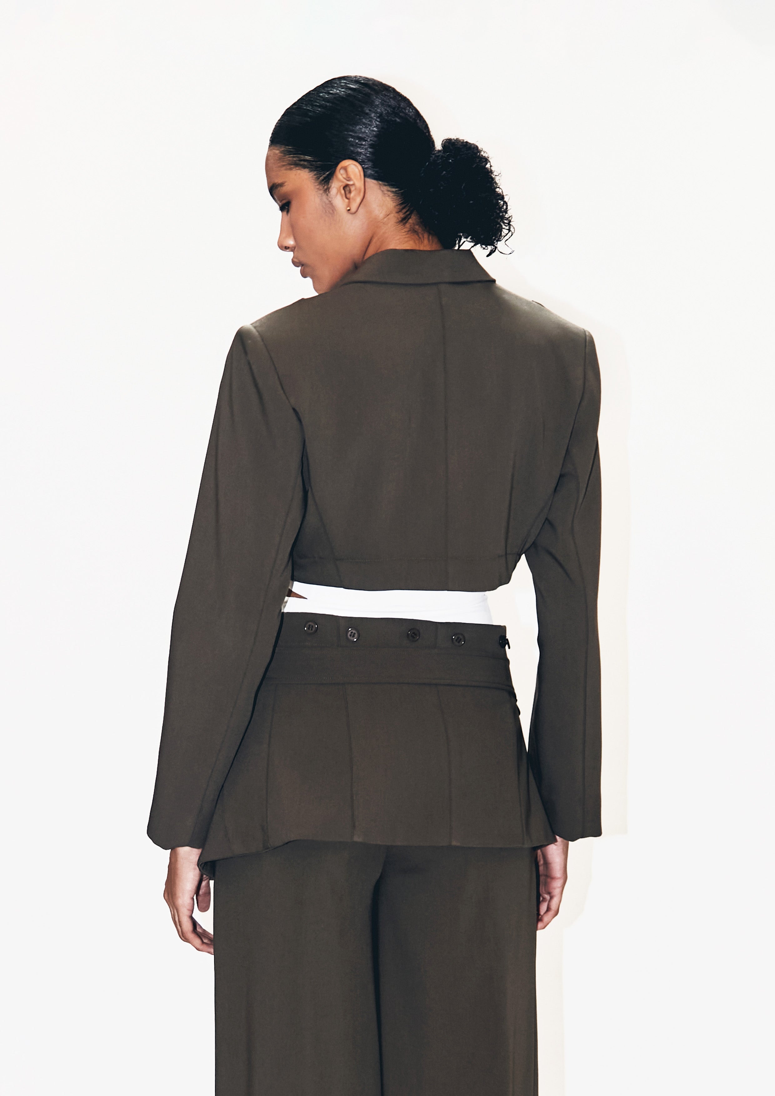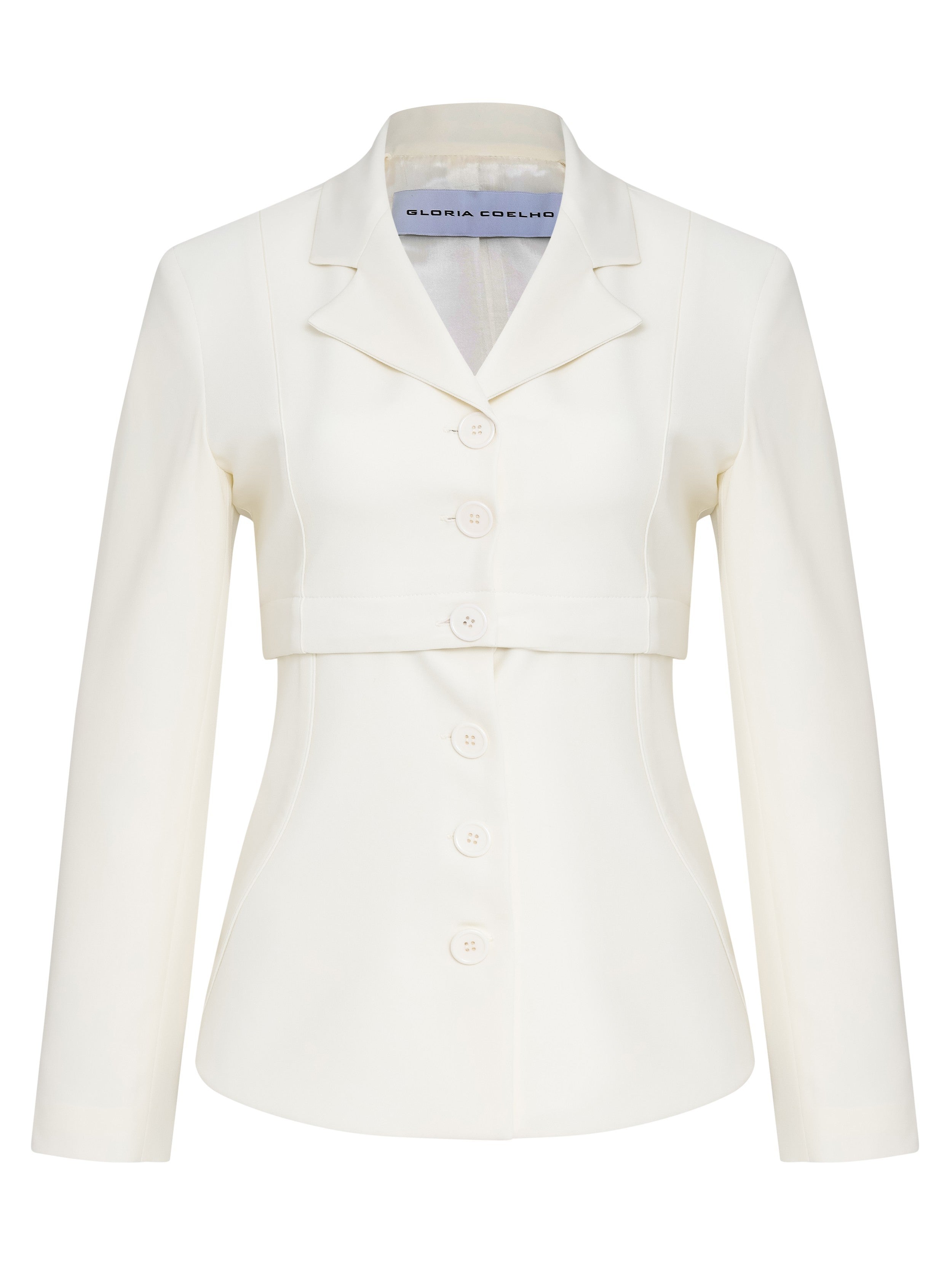 Blazer destacável de gabardine, com recortes, com botões de massa.