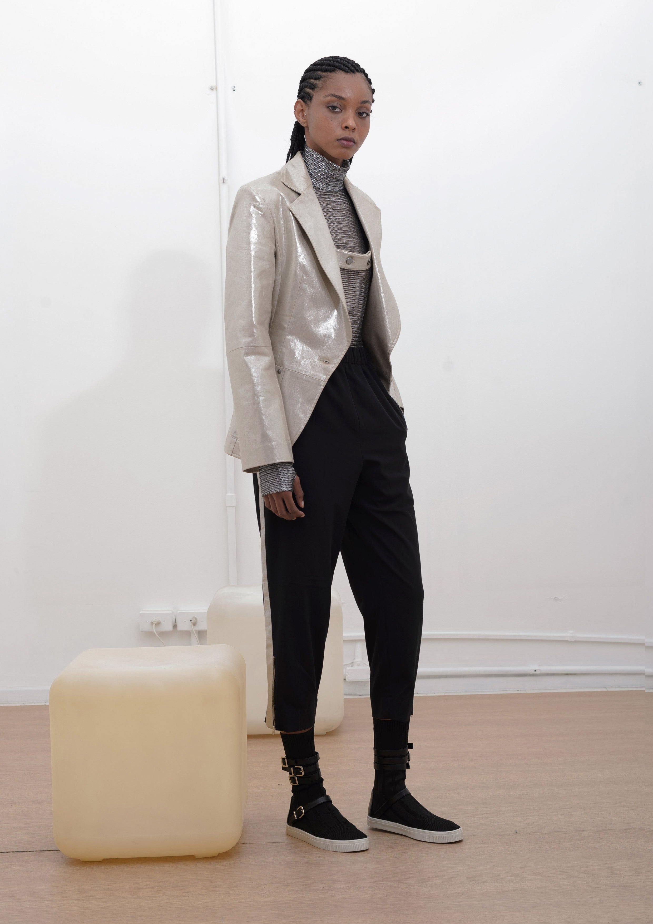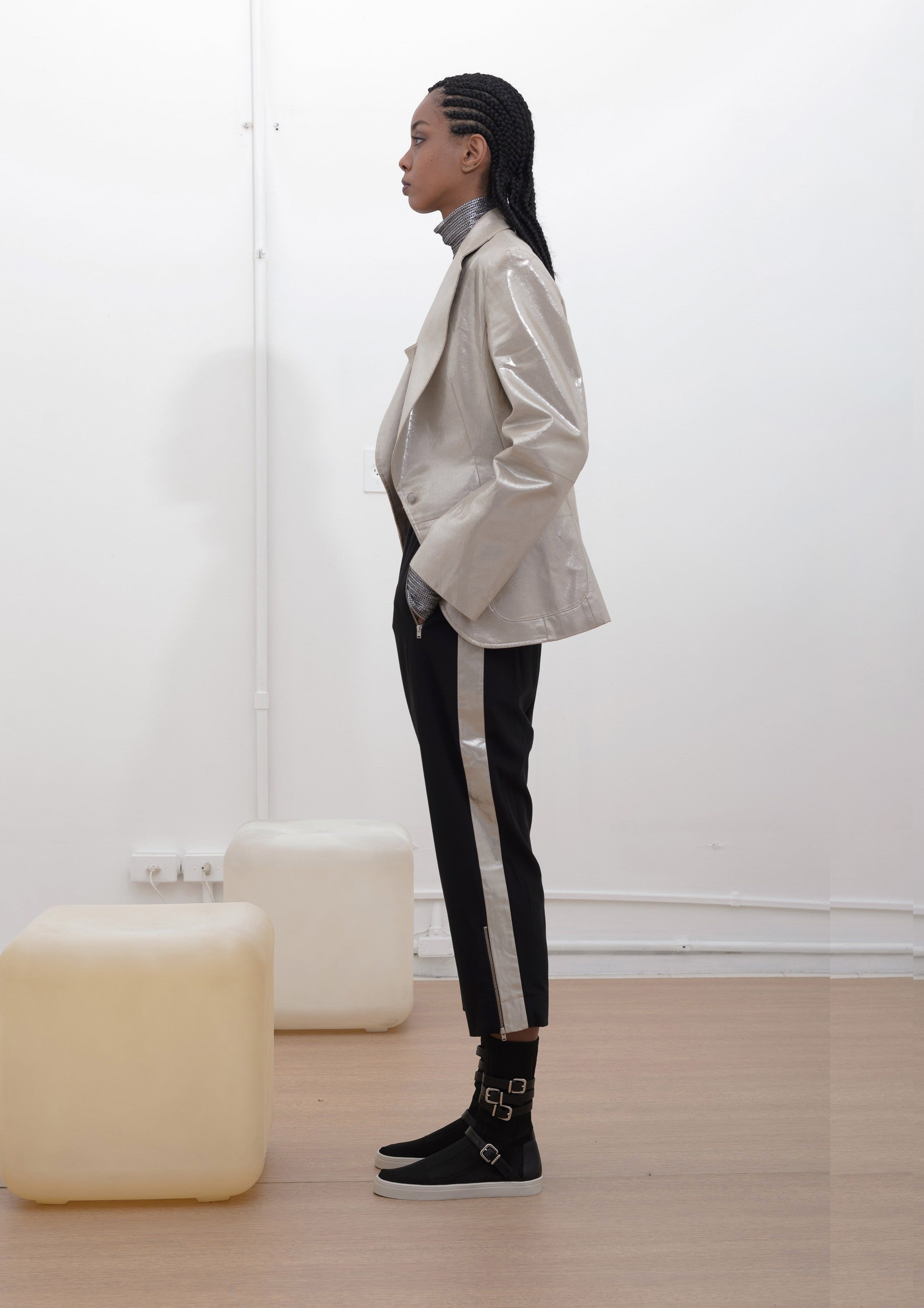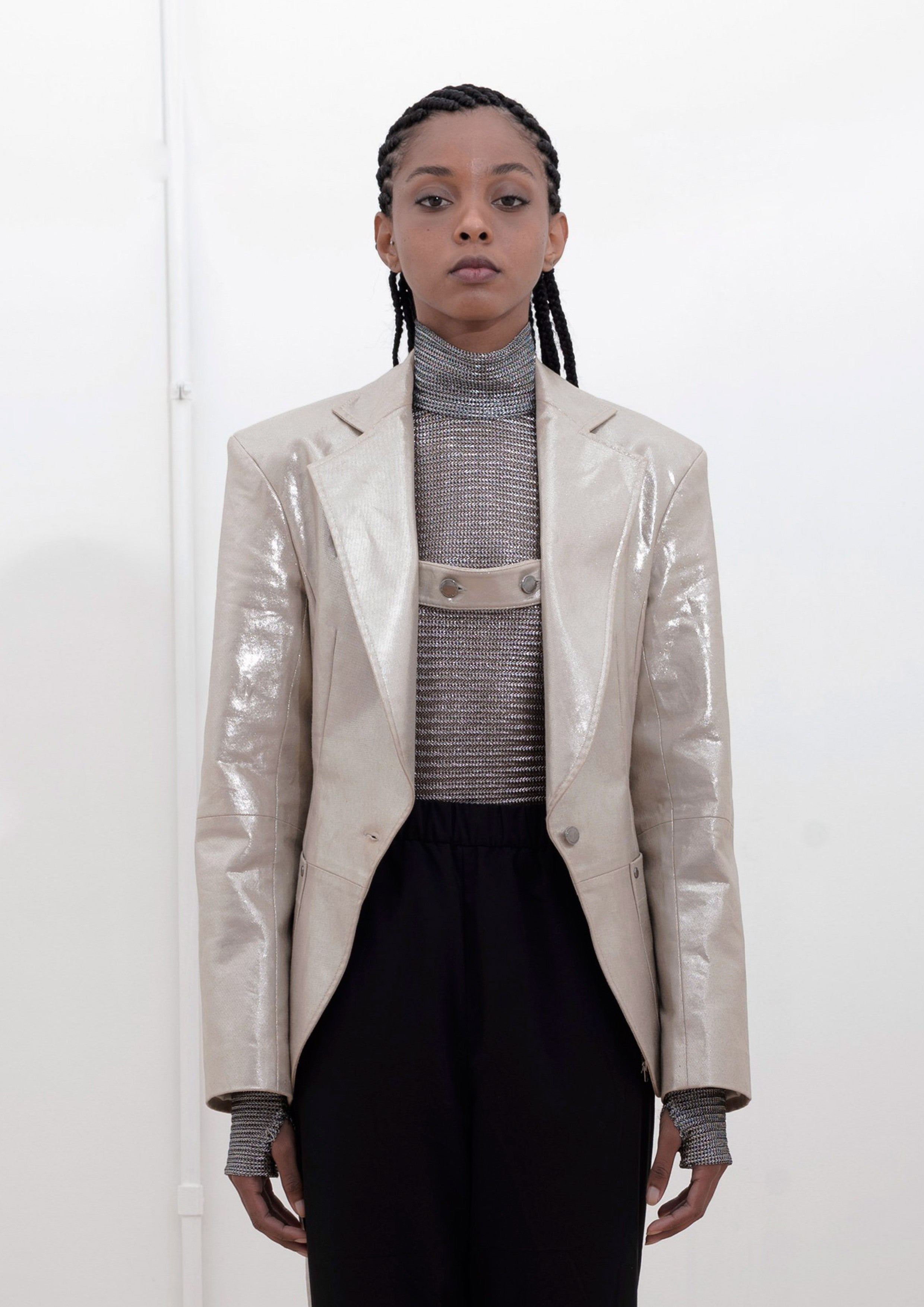 Blazer feito de Sarja de algodão com voil, bolsos laterais funcionais e faixa interna de fechamento no busto.