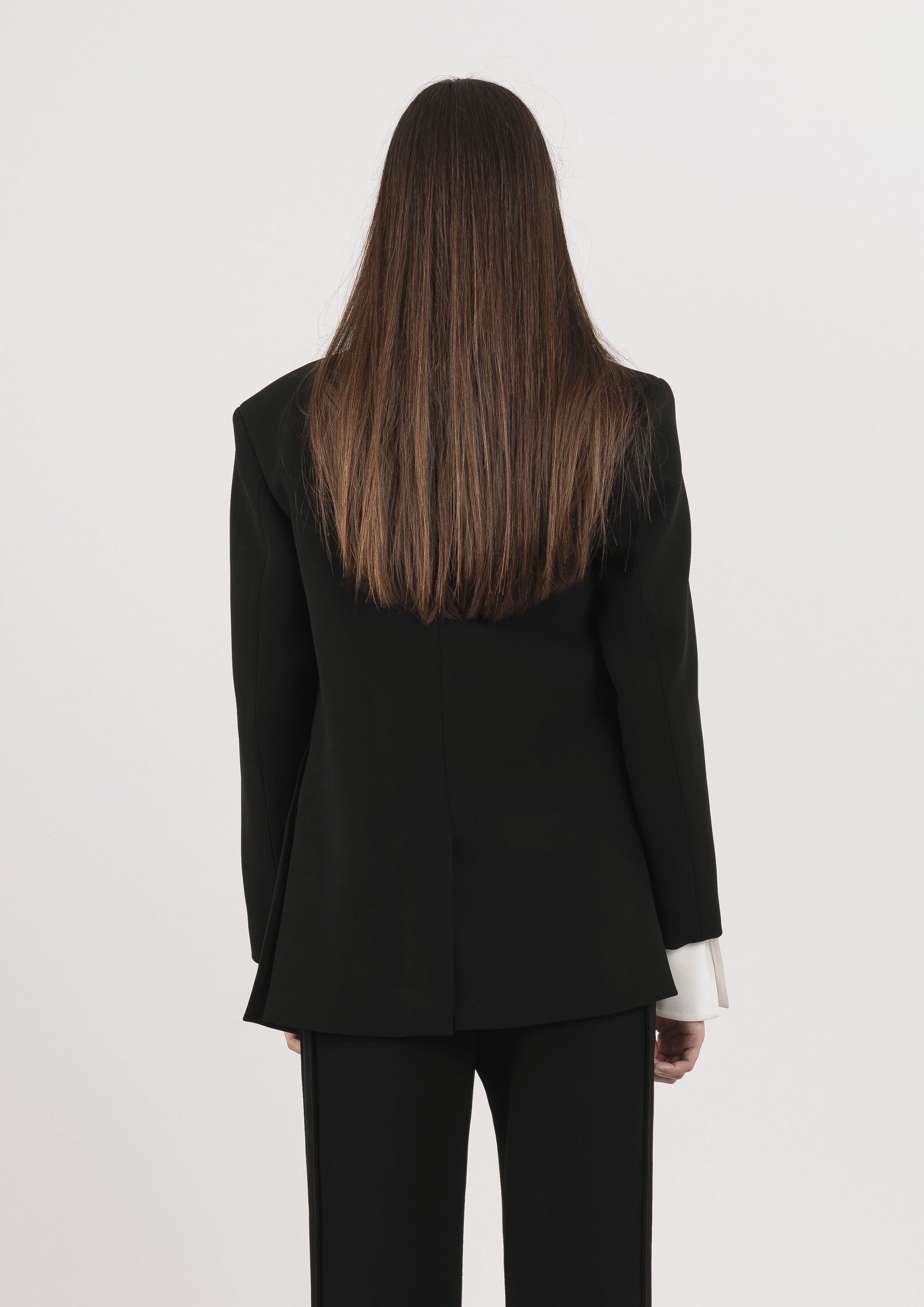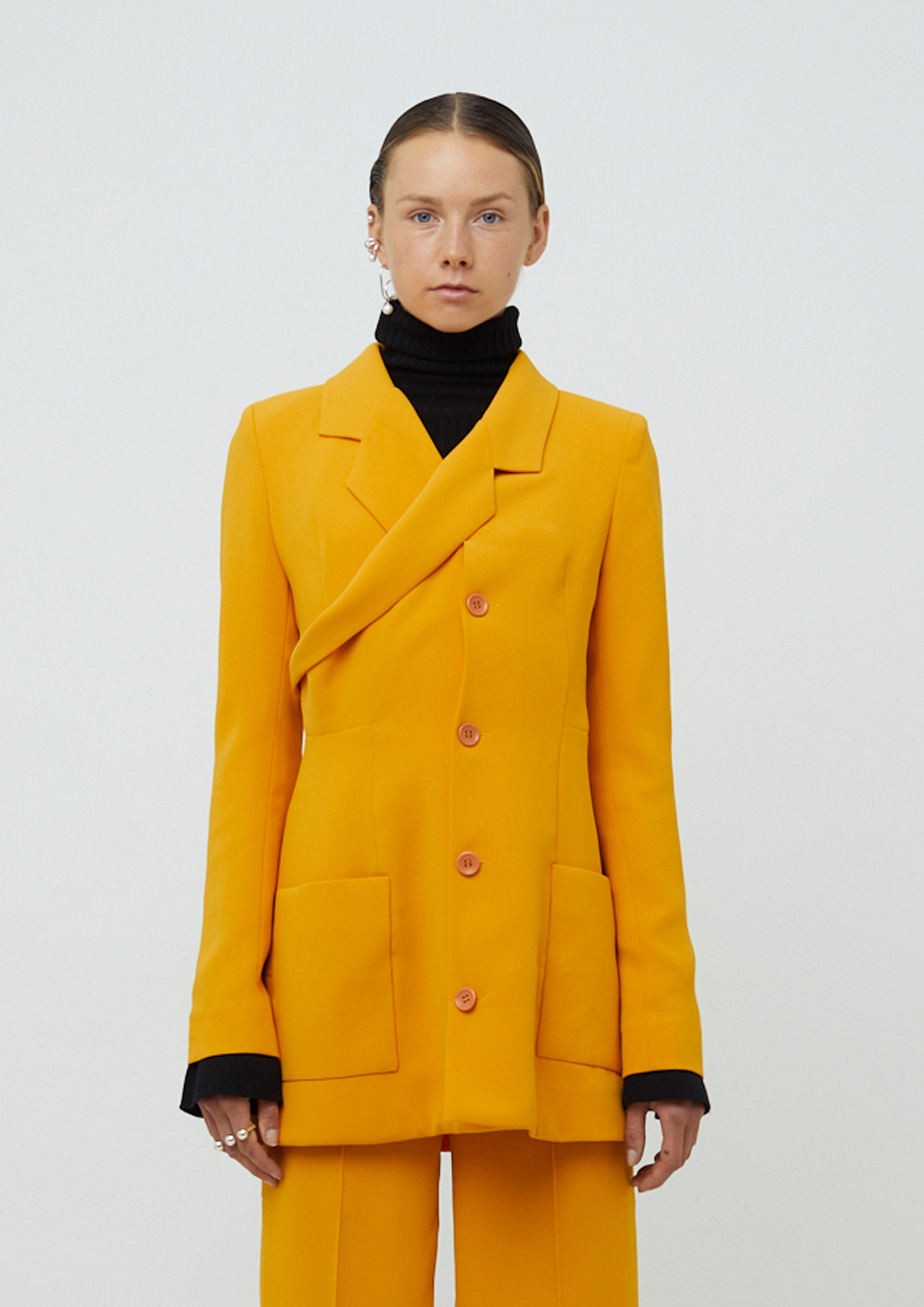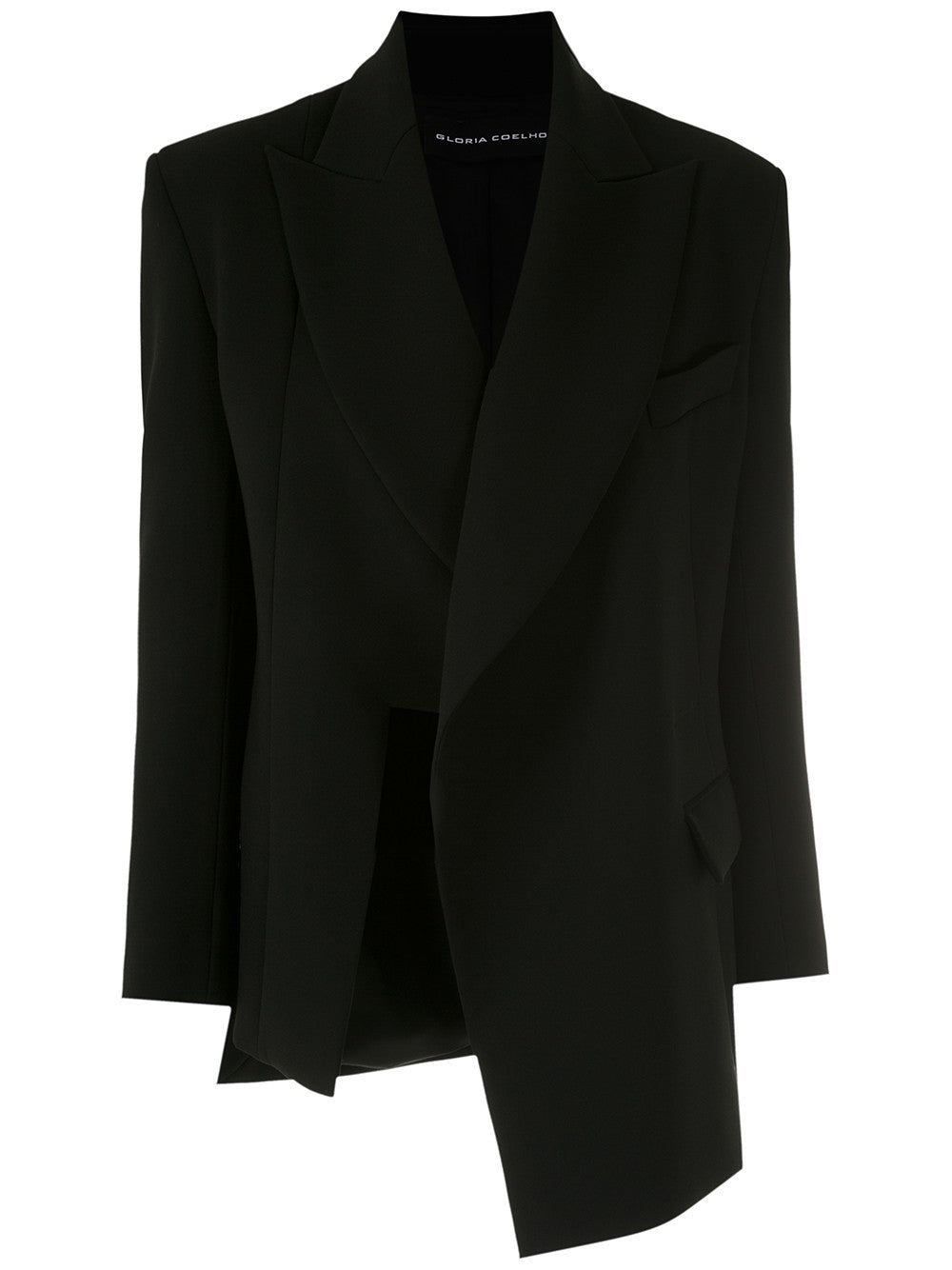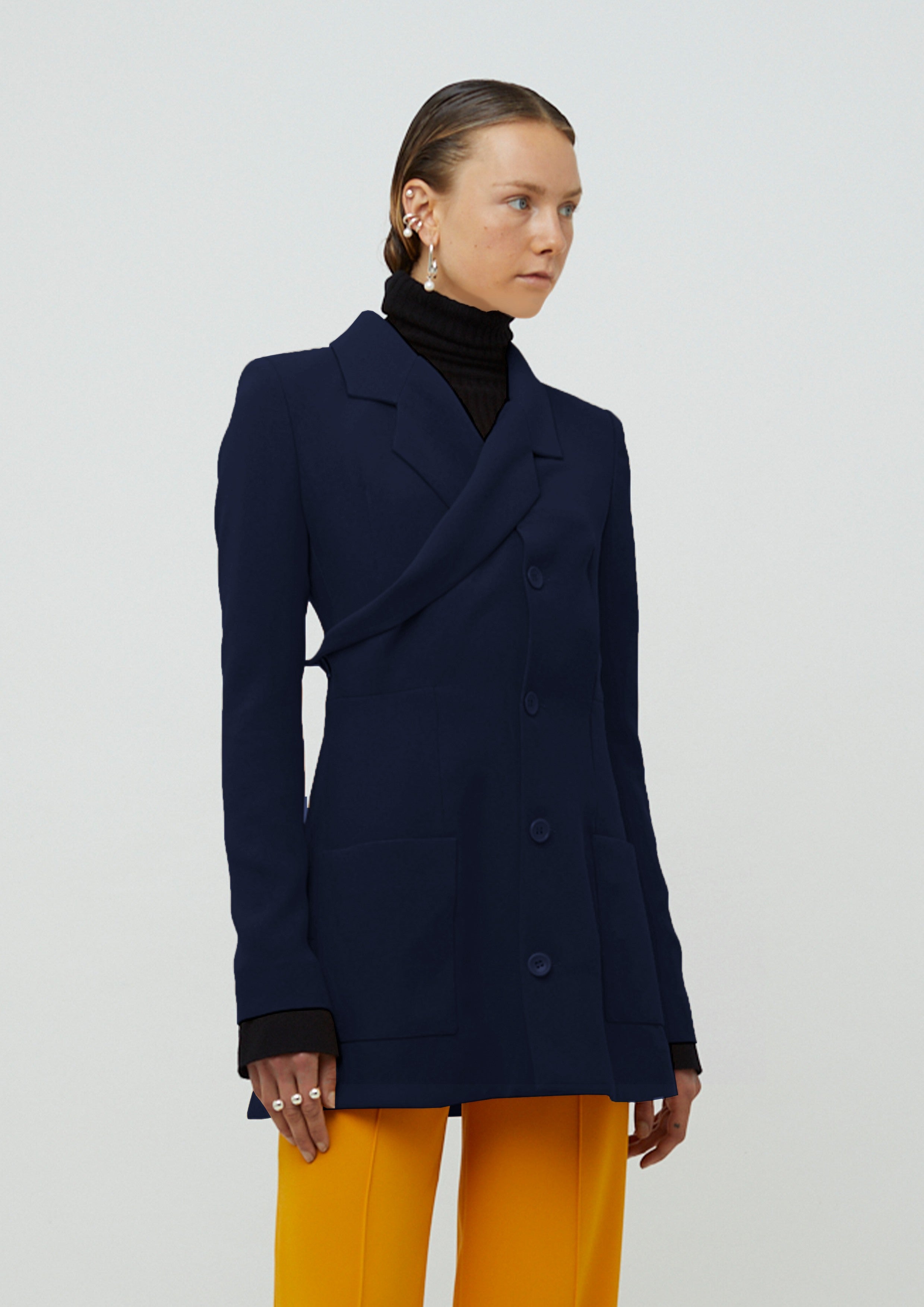 Blazer alongado de alfaiataria em crepe com mangas longas. Possui modelagem acinturada, assimetria, lapela, bolsos frontais na parte inferior e fecho por botões.