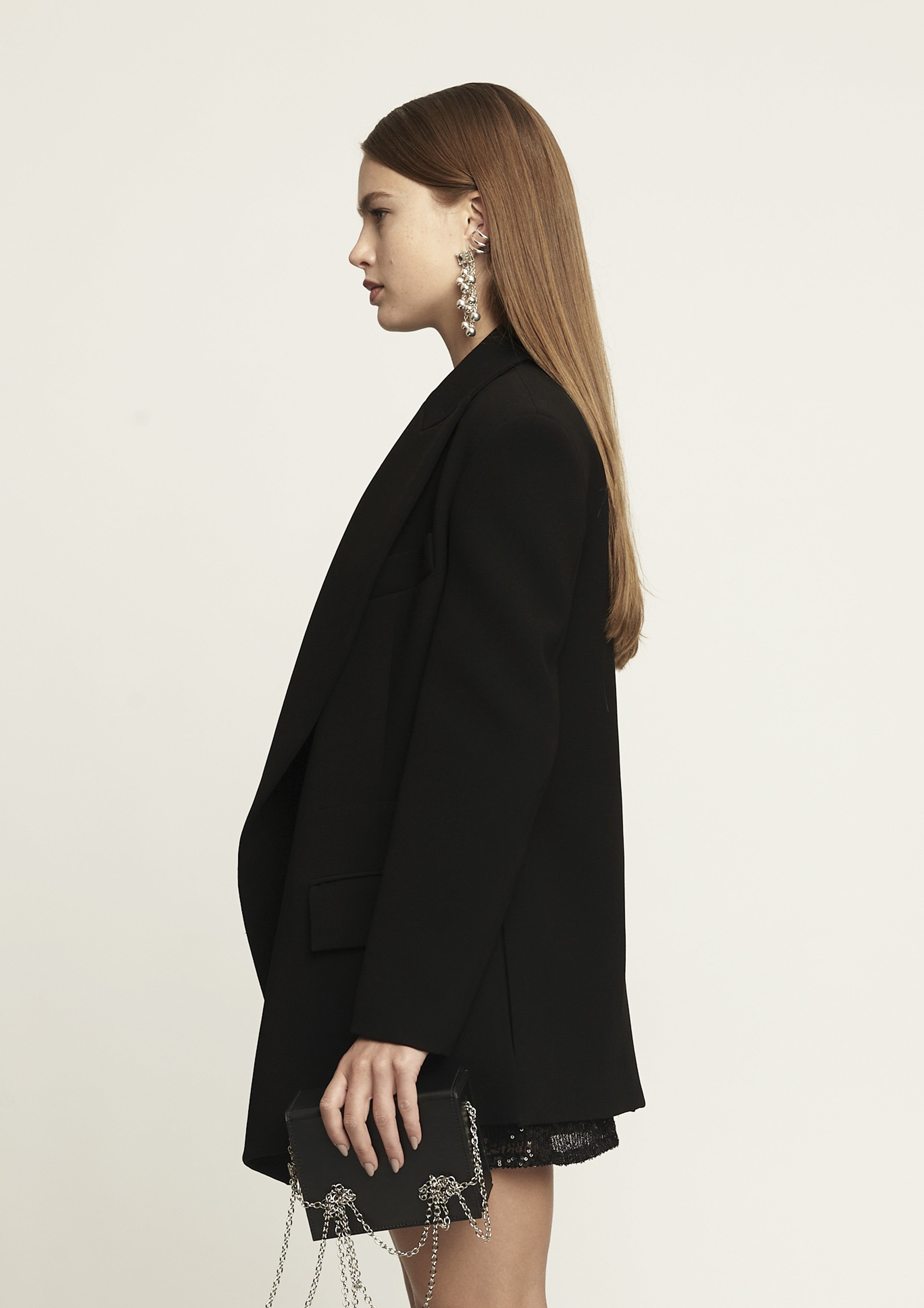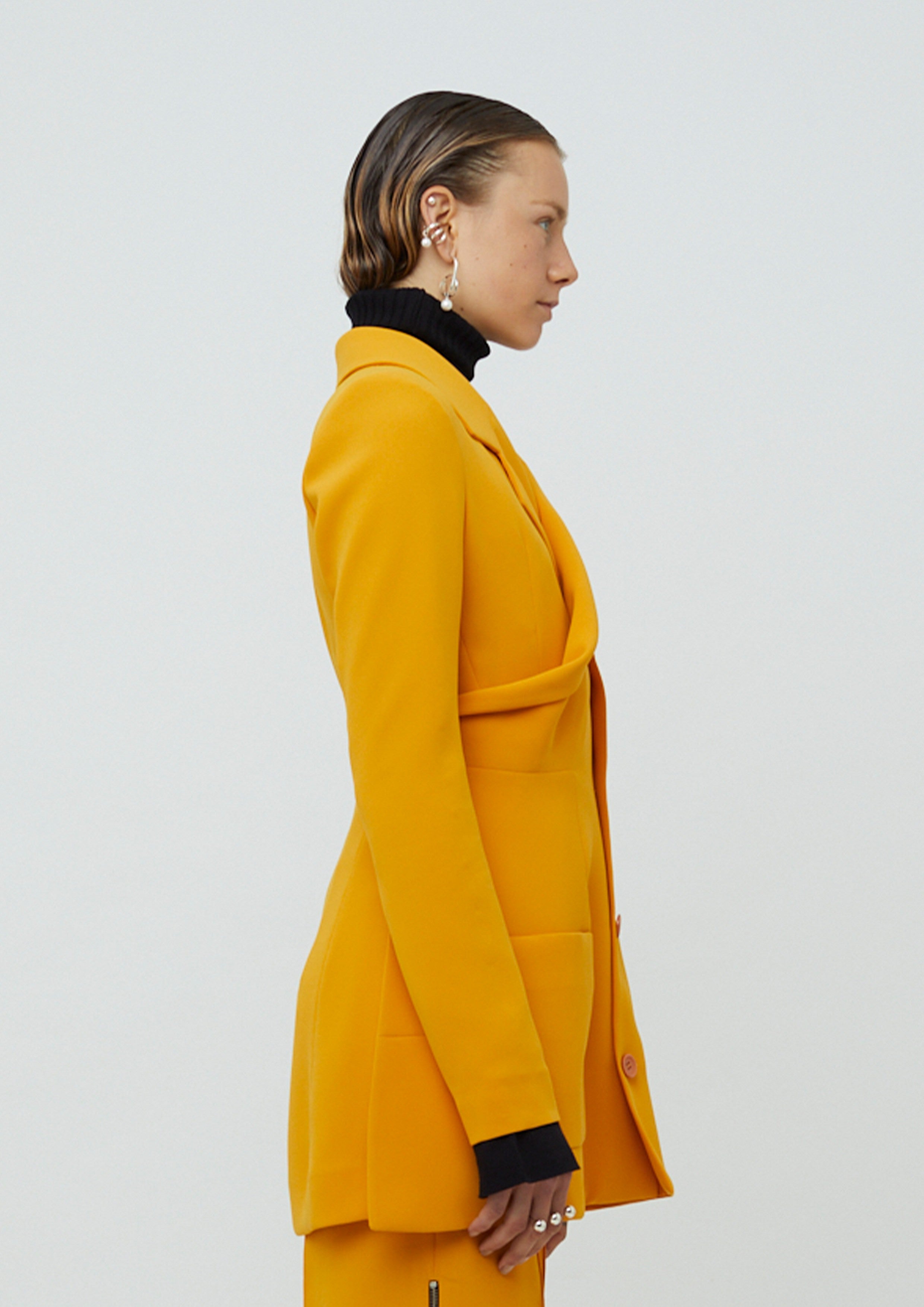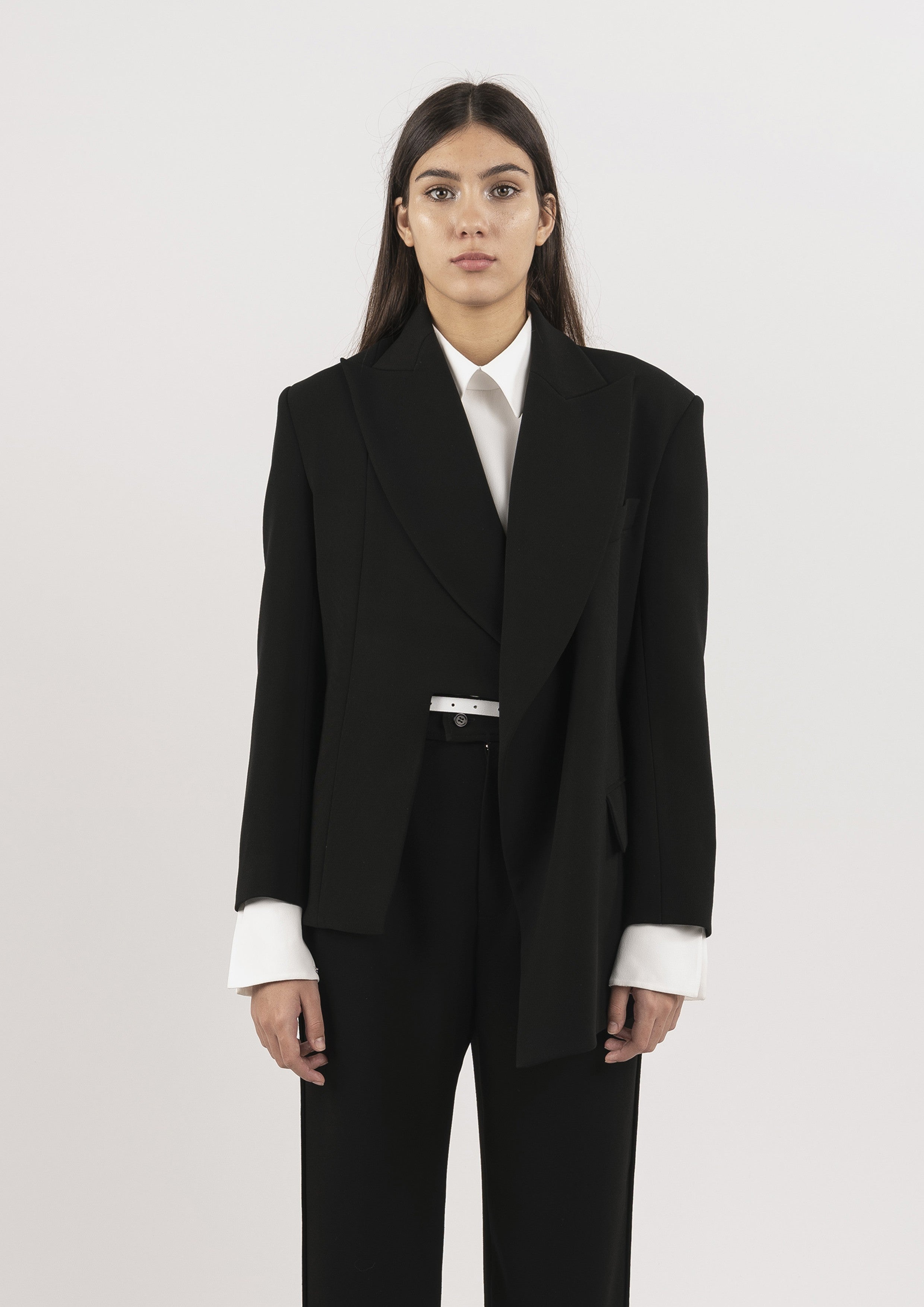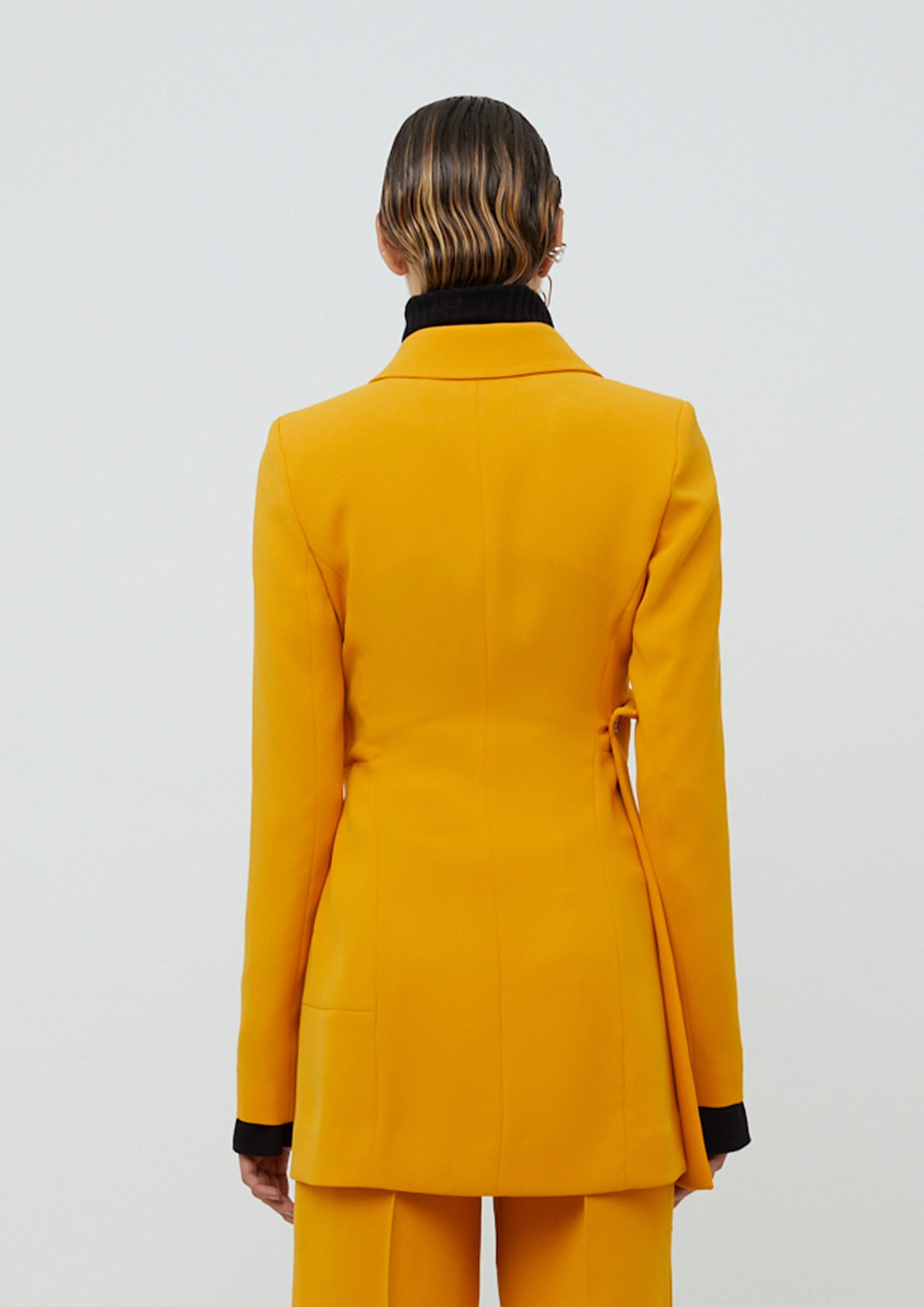 Blazer alongado de alfaiataria em crepe com mangas longas. Possui modelagem acinturada, assimetria, lapela, bolsos frontais na parte inferior e fecho por botões.