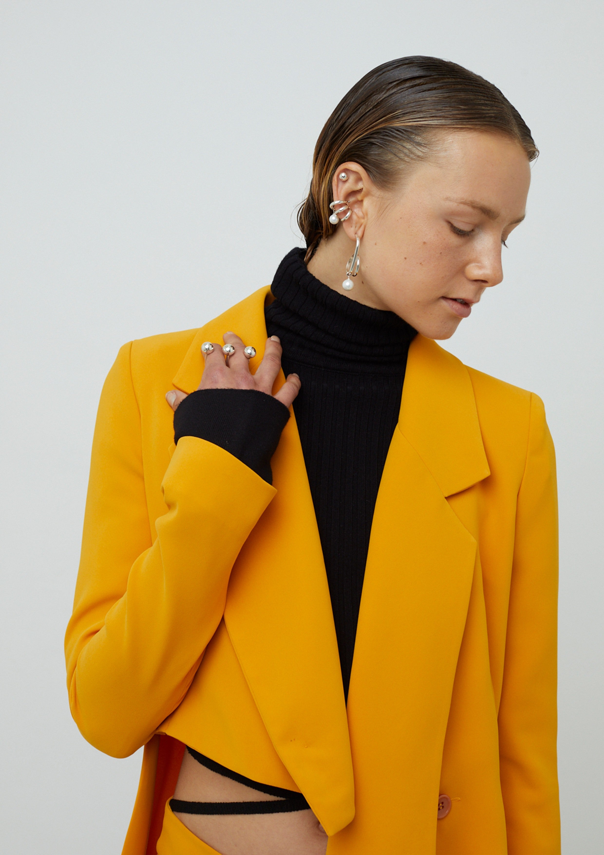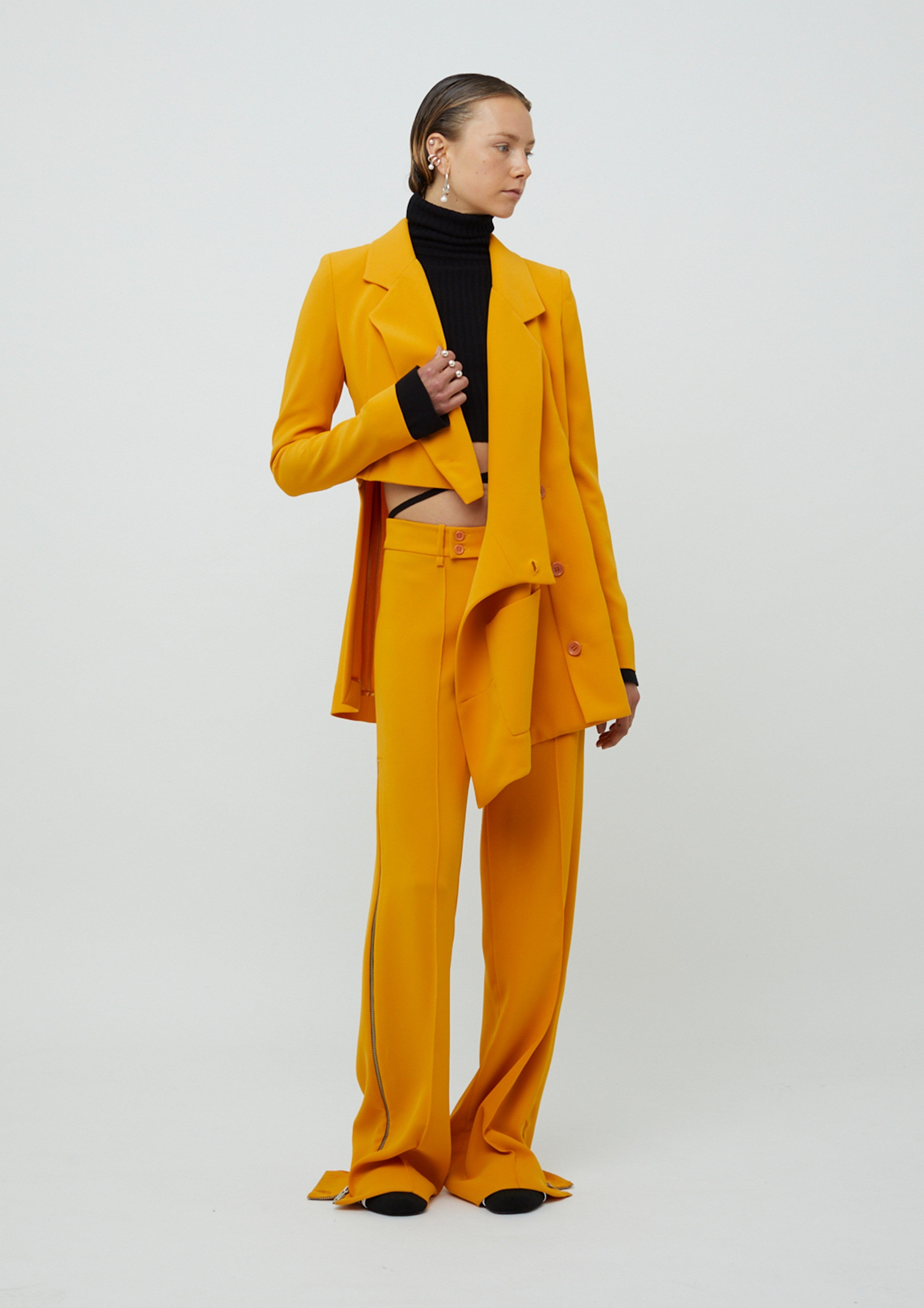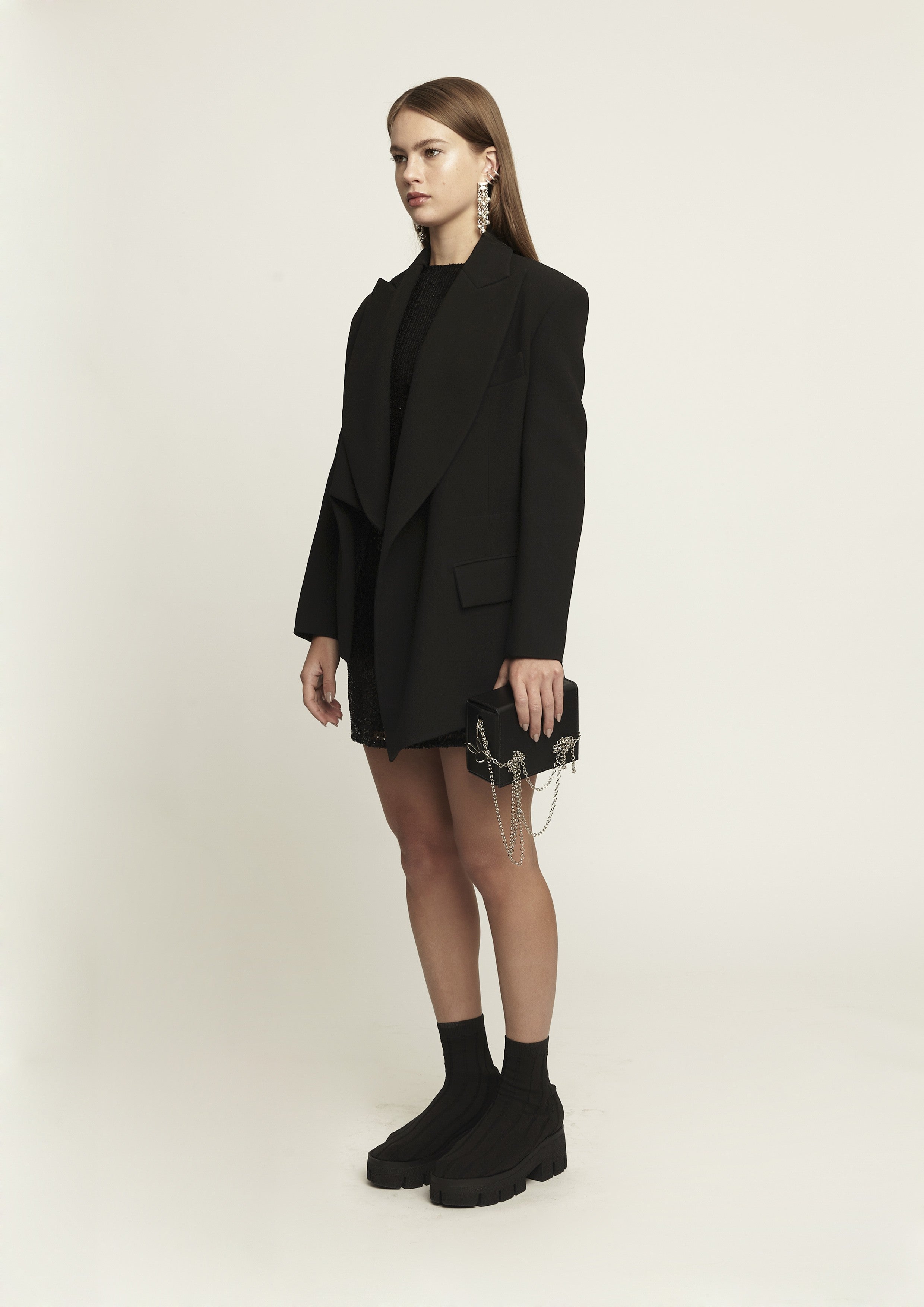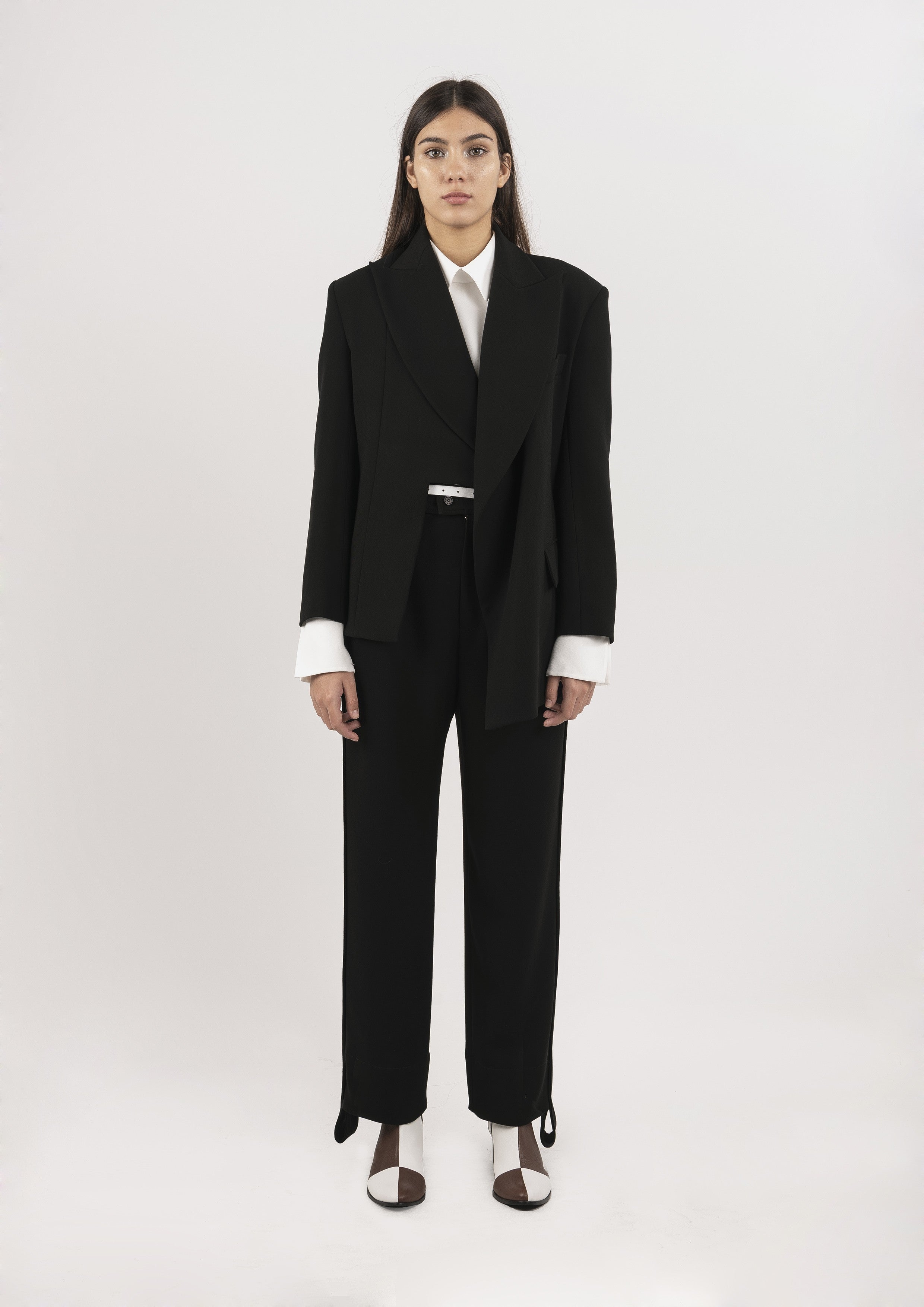 Blazer alongado de alfaiataria em crepe com mangas longas. Possui modelagem acinturada, assimetria, lapela, bolsos frontais na parte inferior e fecho por botões.