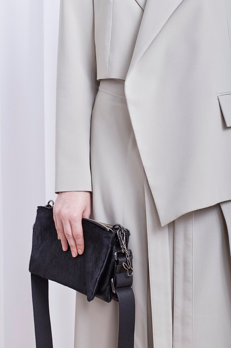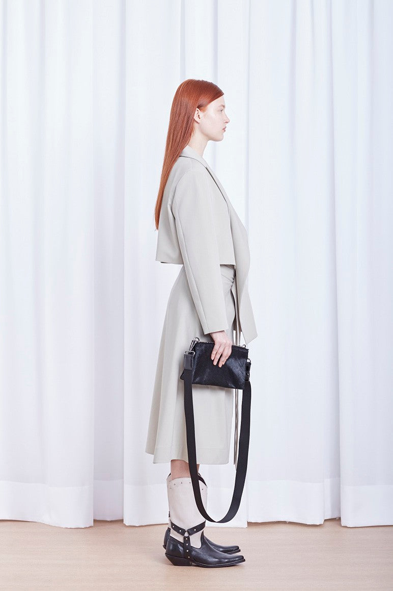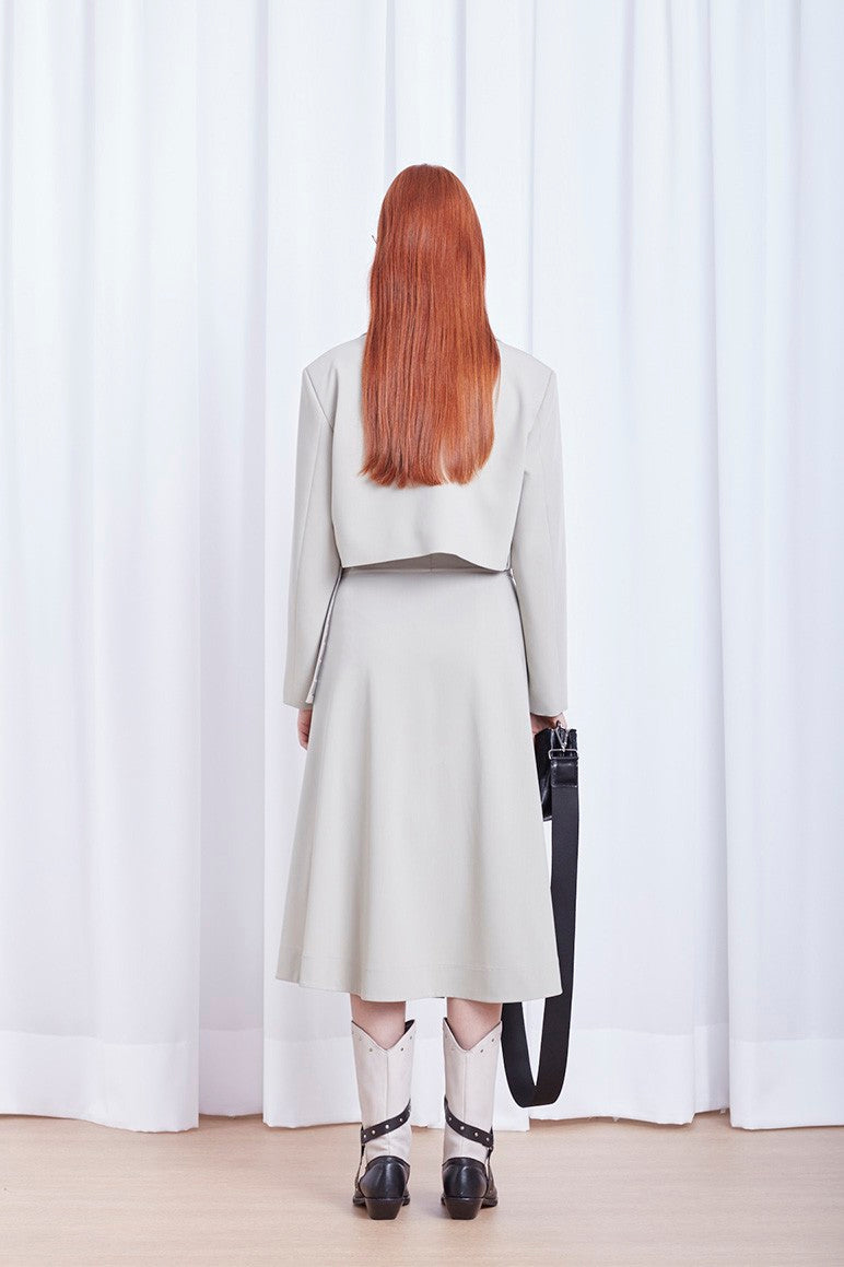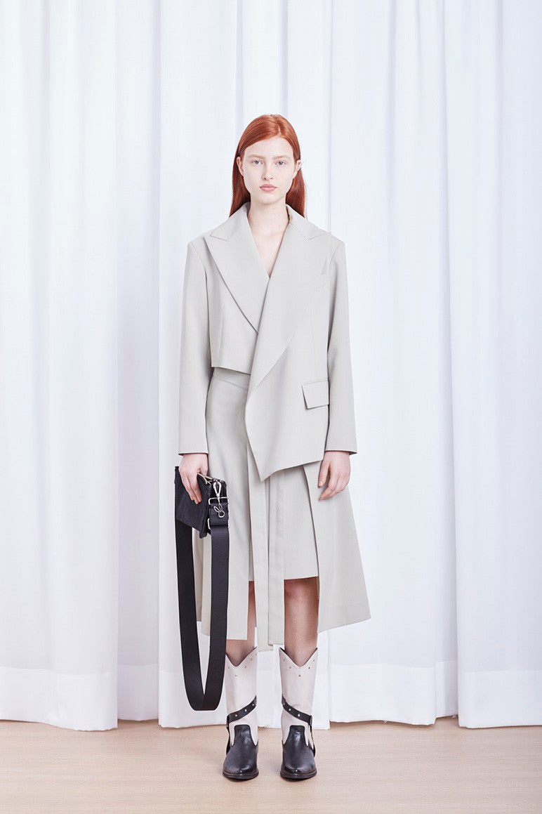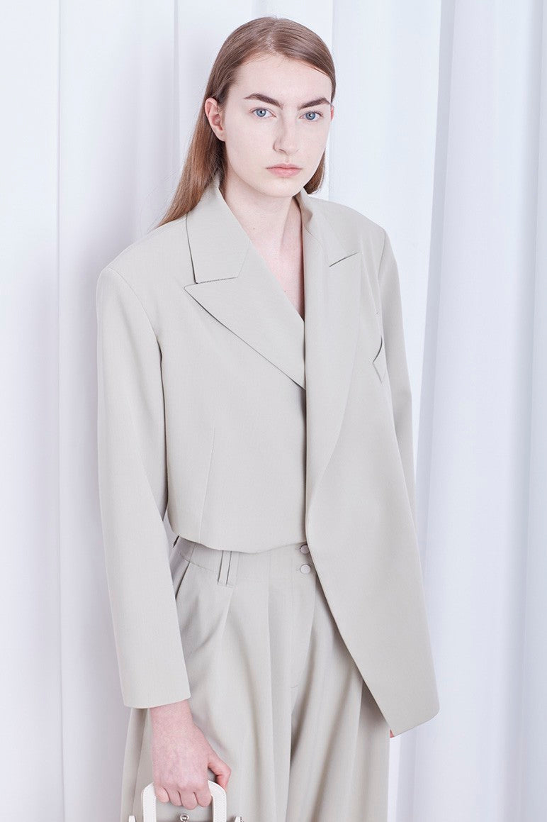 Blazer assimétrico, com lapelas, mangas longas, abotoamento oculto, detalhes de recortes e comprimento assimétrico.