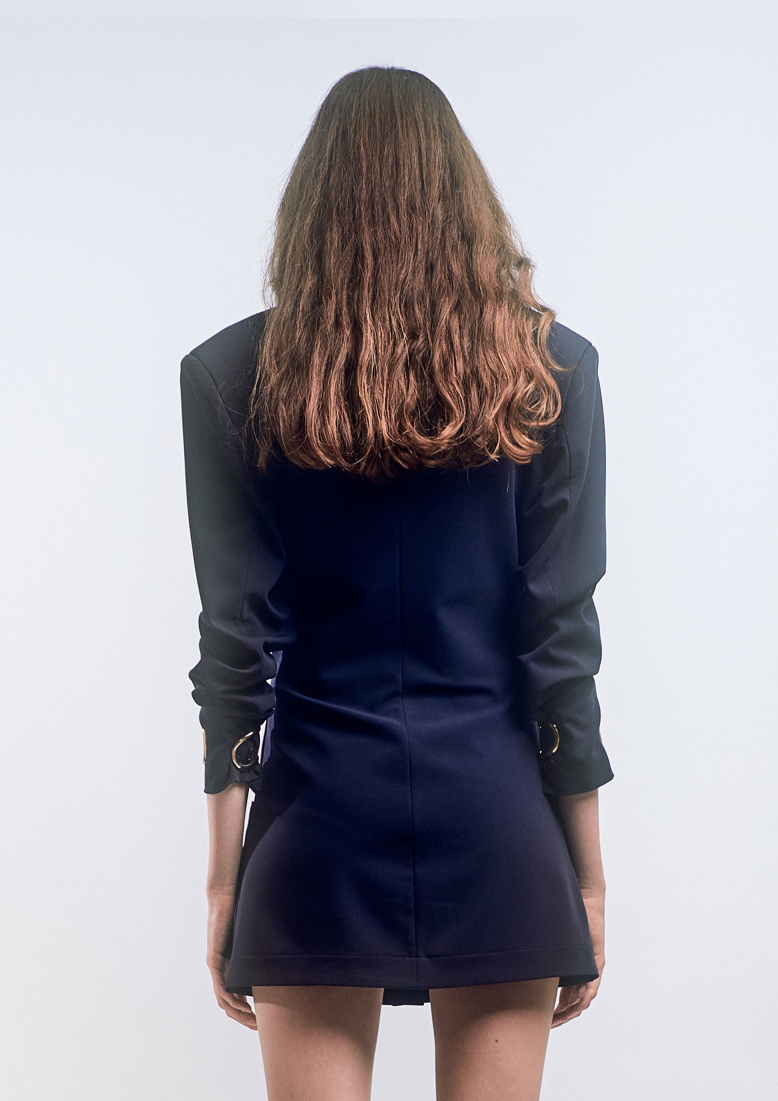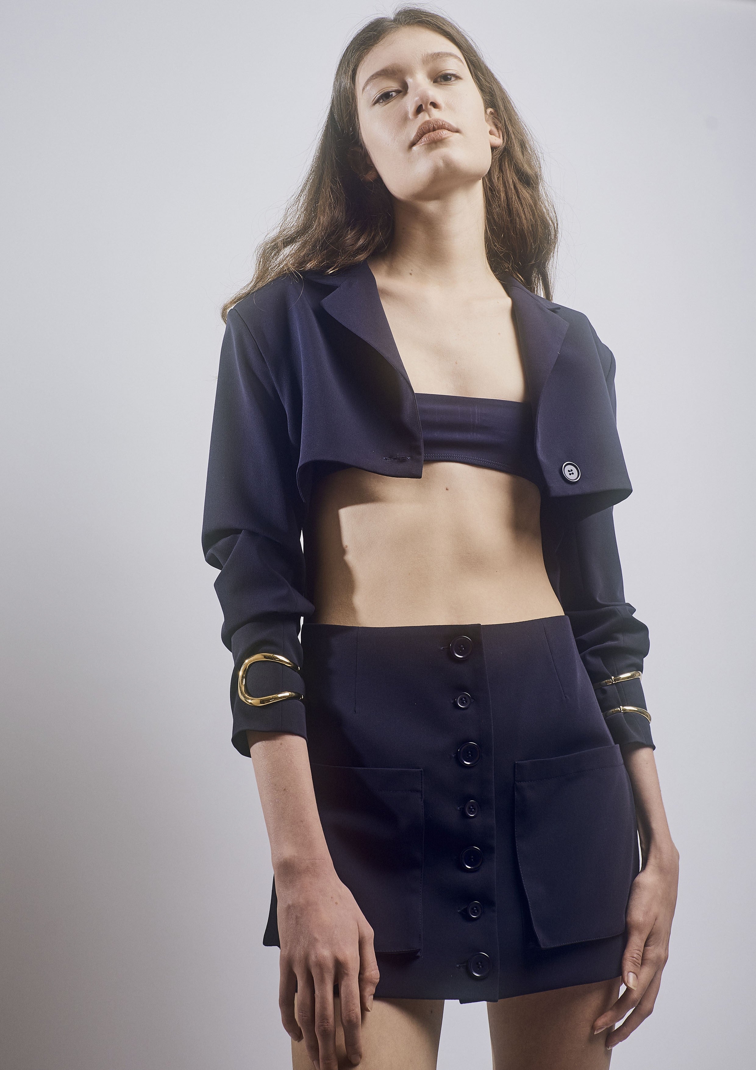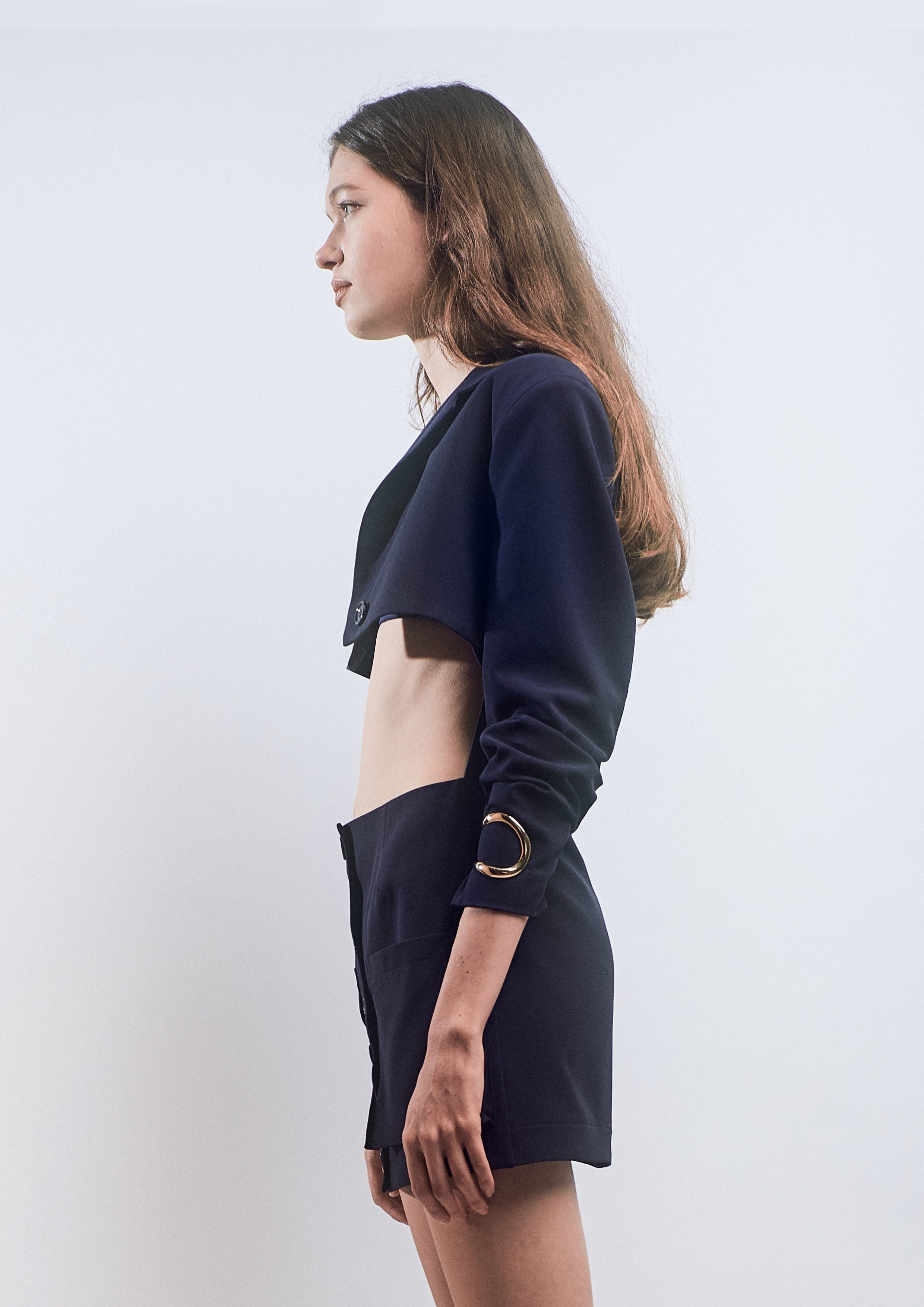 Blazer cropped com saia feito em Gabardine de viscose possui ombreiras, abertura frontal no abdômen e costas fechadas, bolsos funcionais na parte inferior e fechamento frontal por botões.