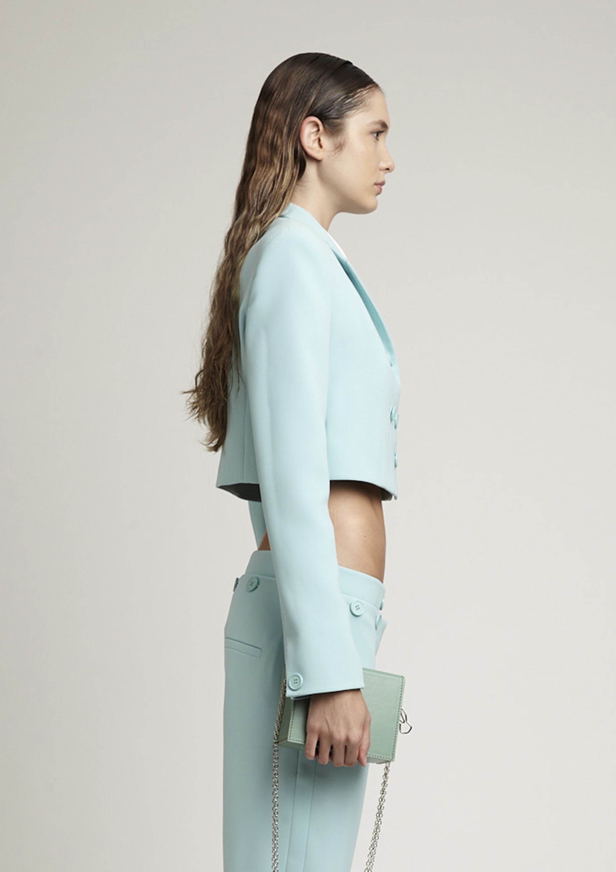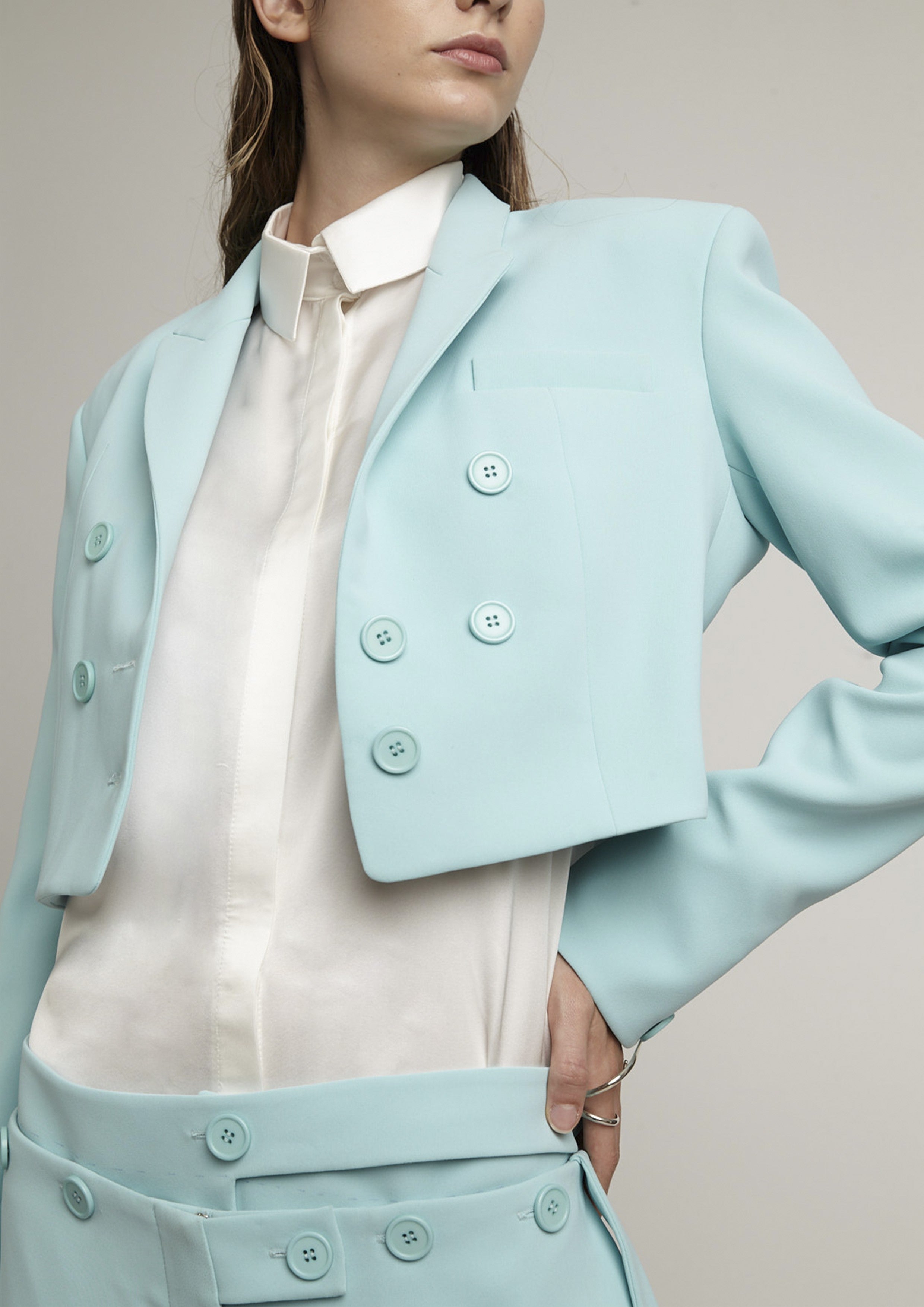 Blazer cropped de crepe com mangas longas. Possui modelagem acinturada e detalhes com botões frontais na parte superior e fecho por botões.