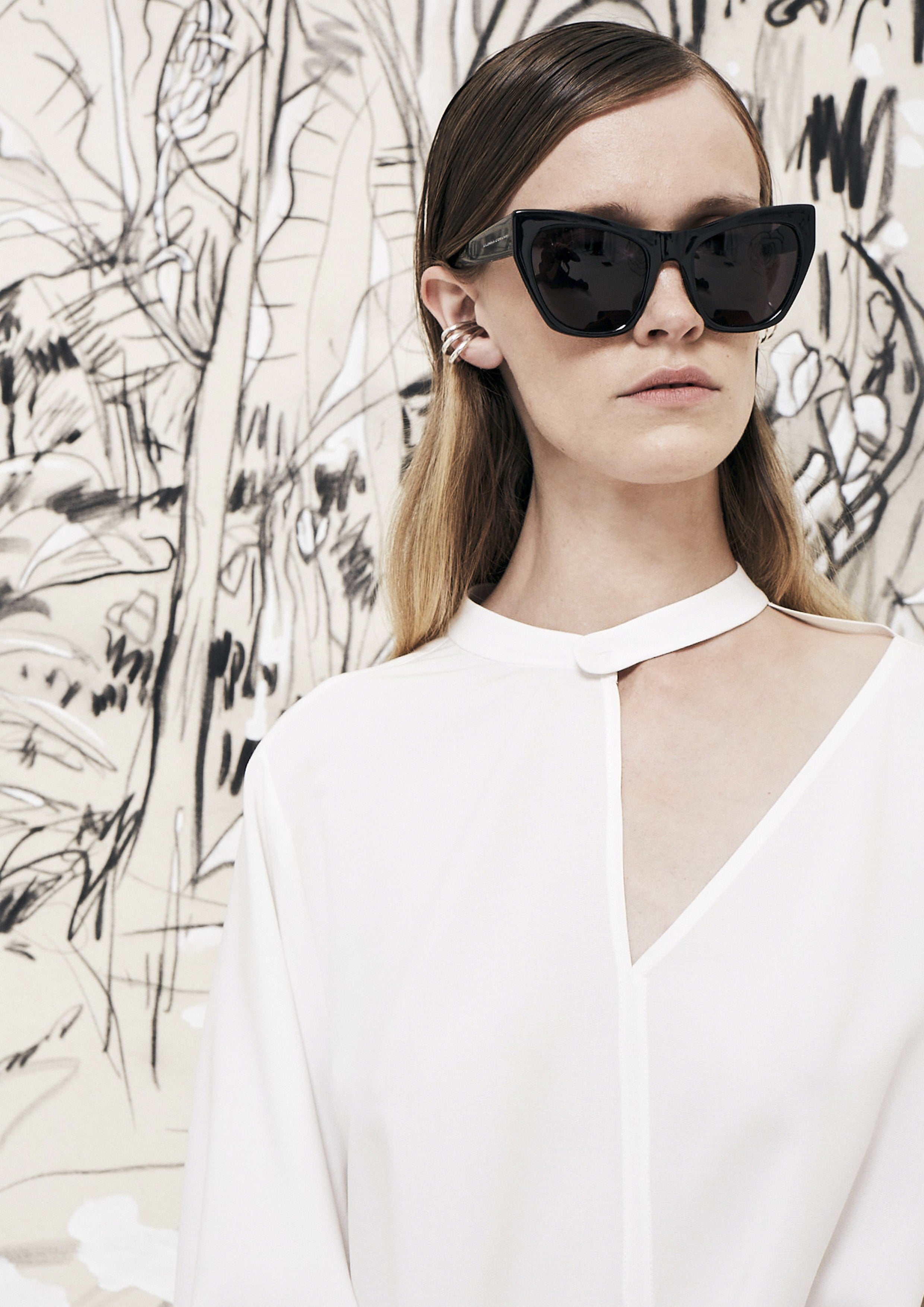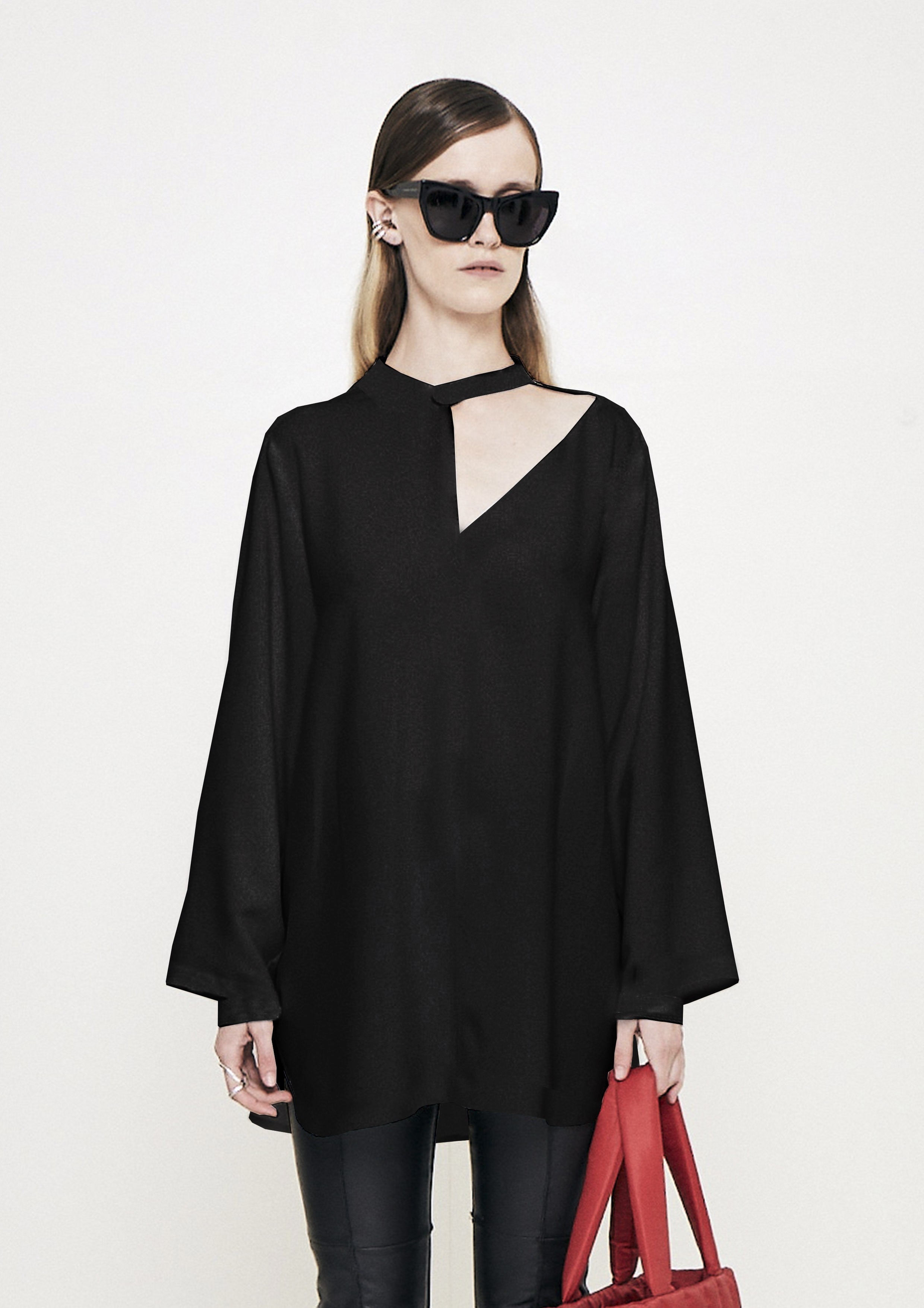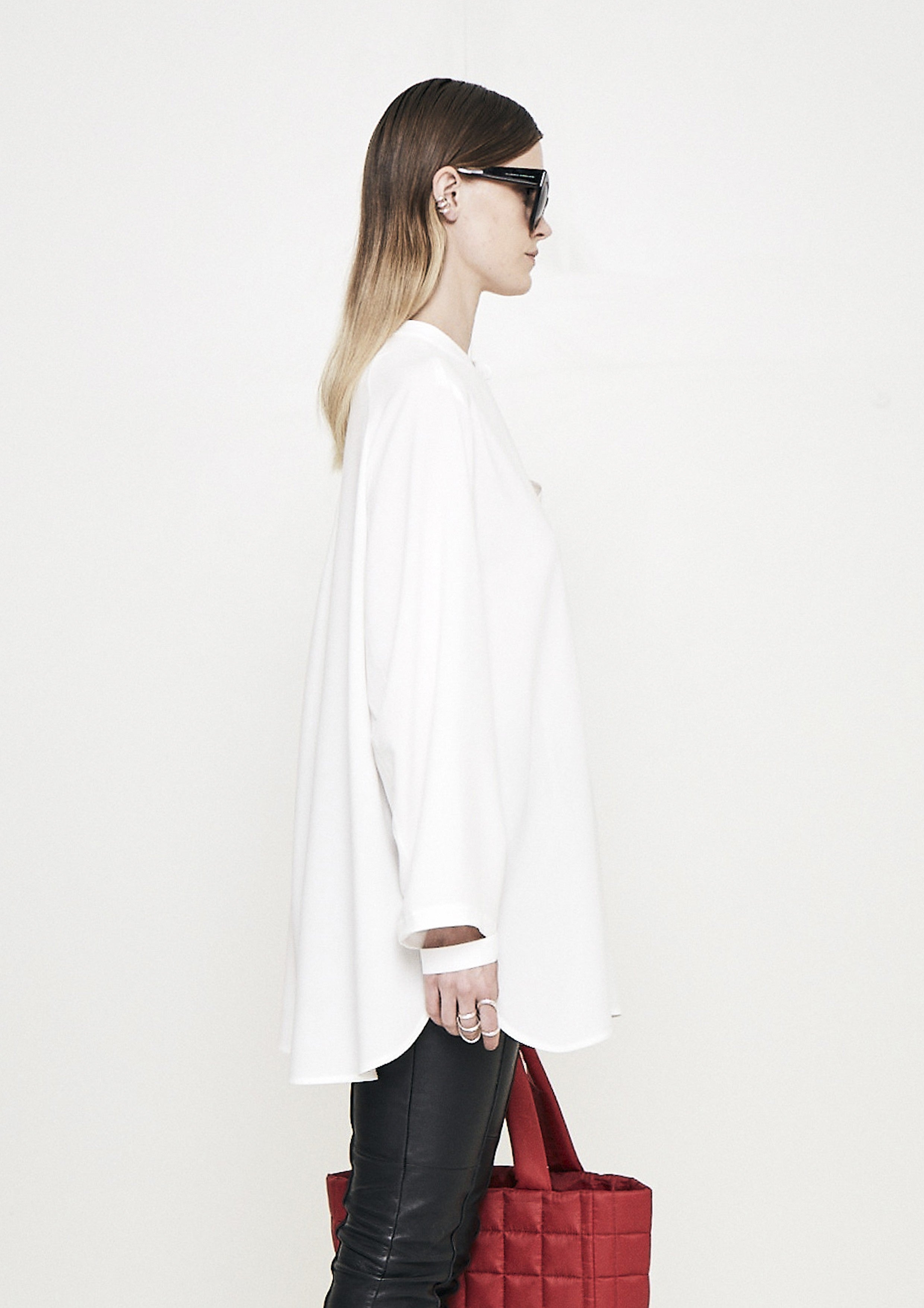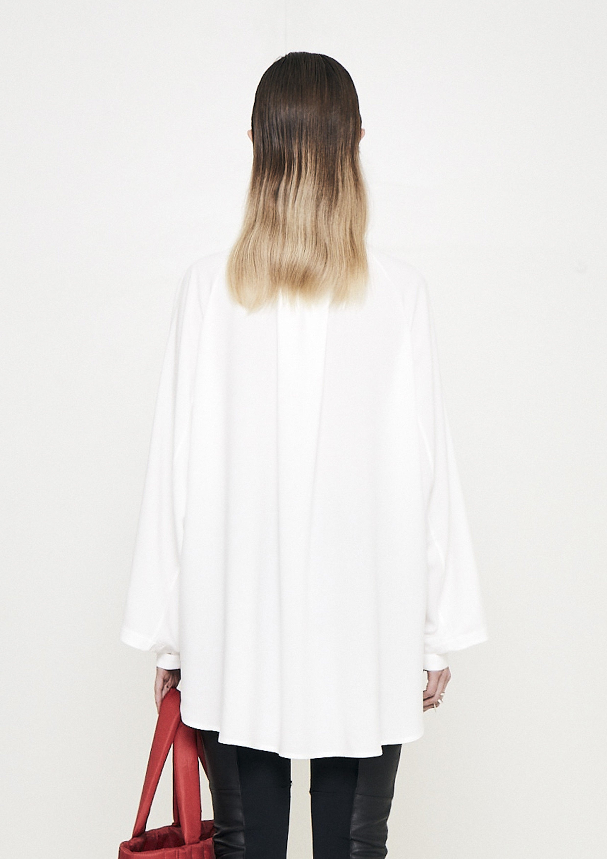Blusa de modelagem ampla com bastante leveza. Possui detalhe no decote fechado por botão; Detalhes semelhantes nos punhos e prega única nas costas.