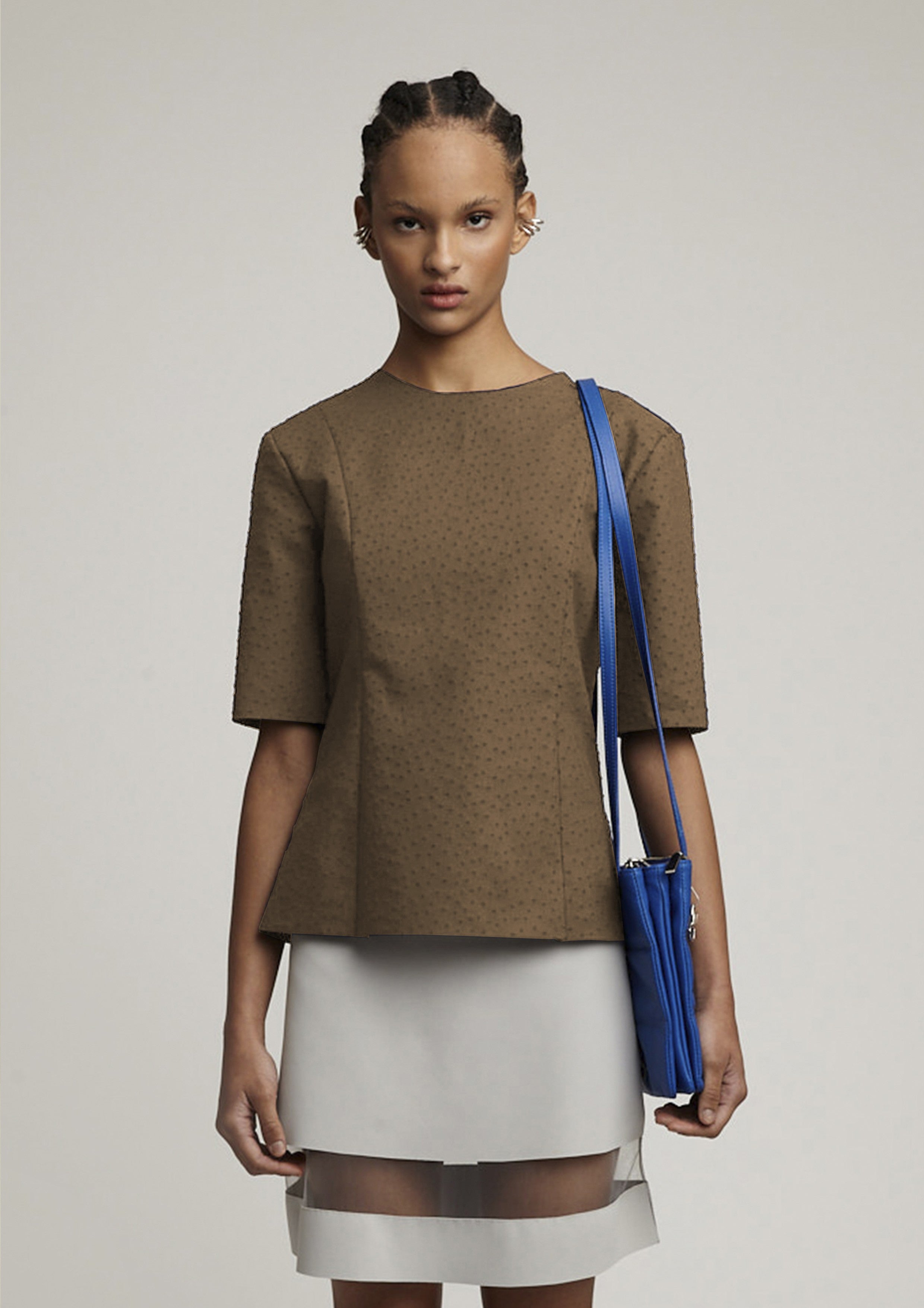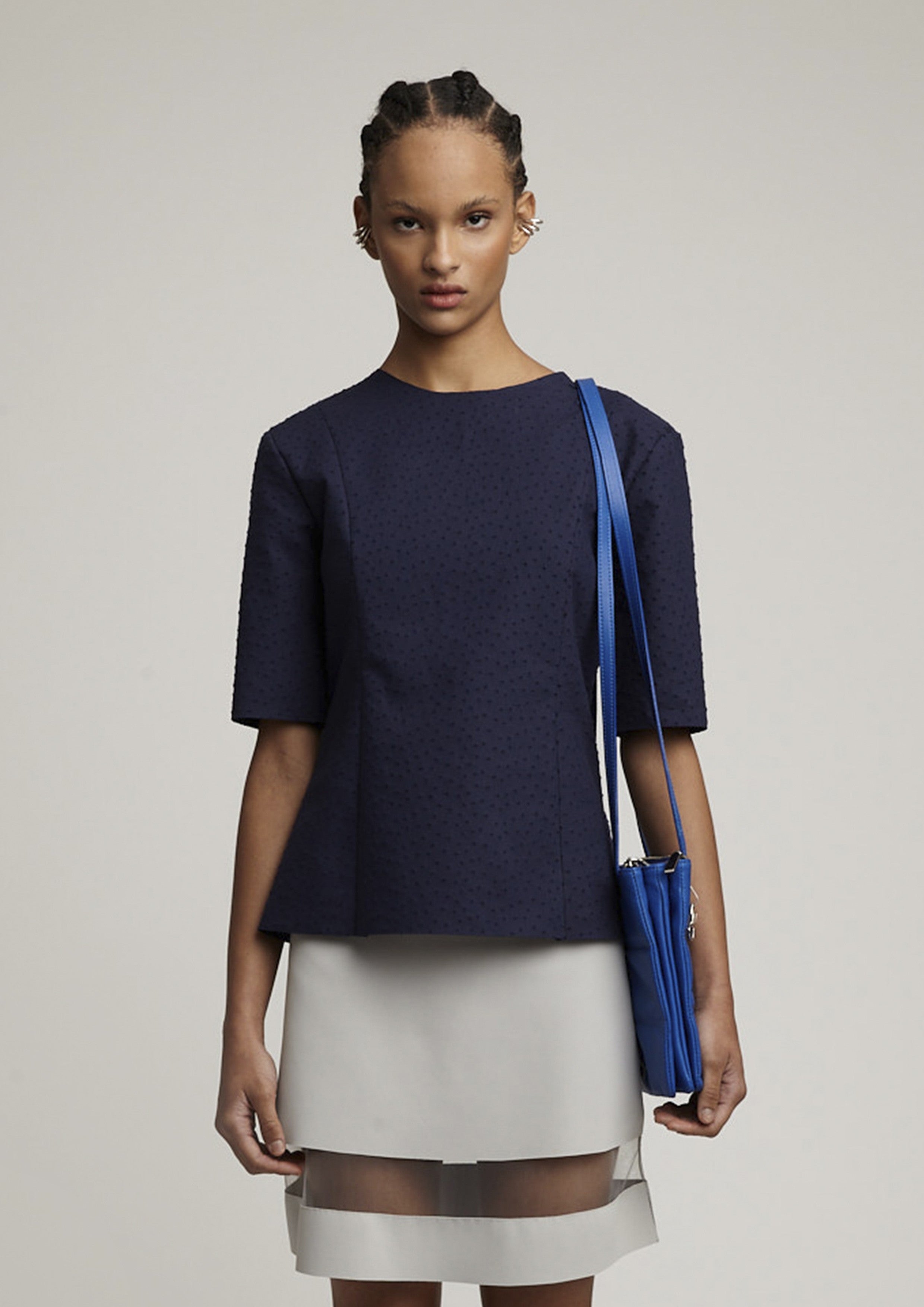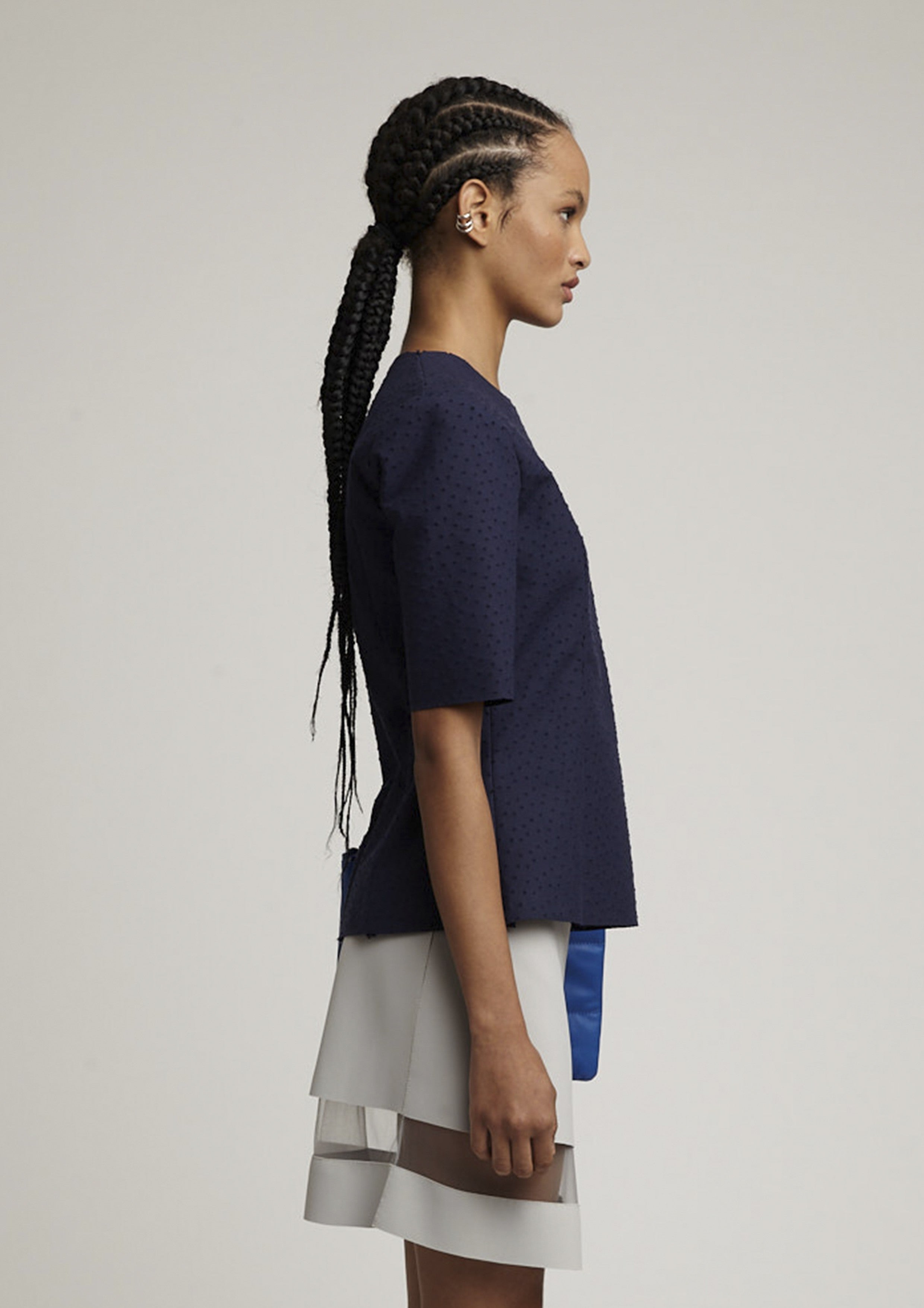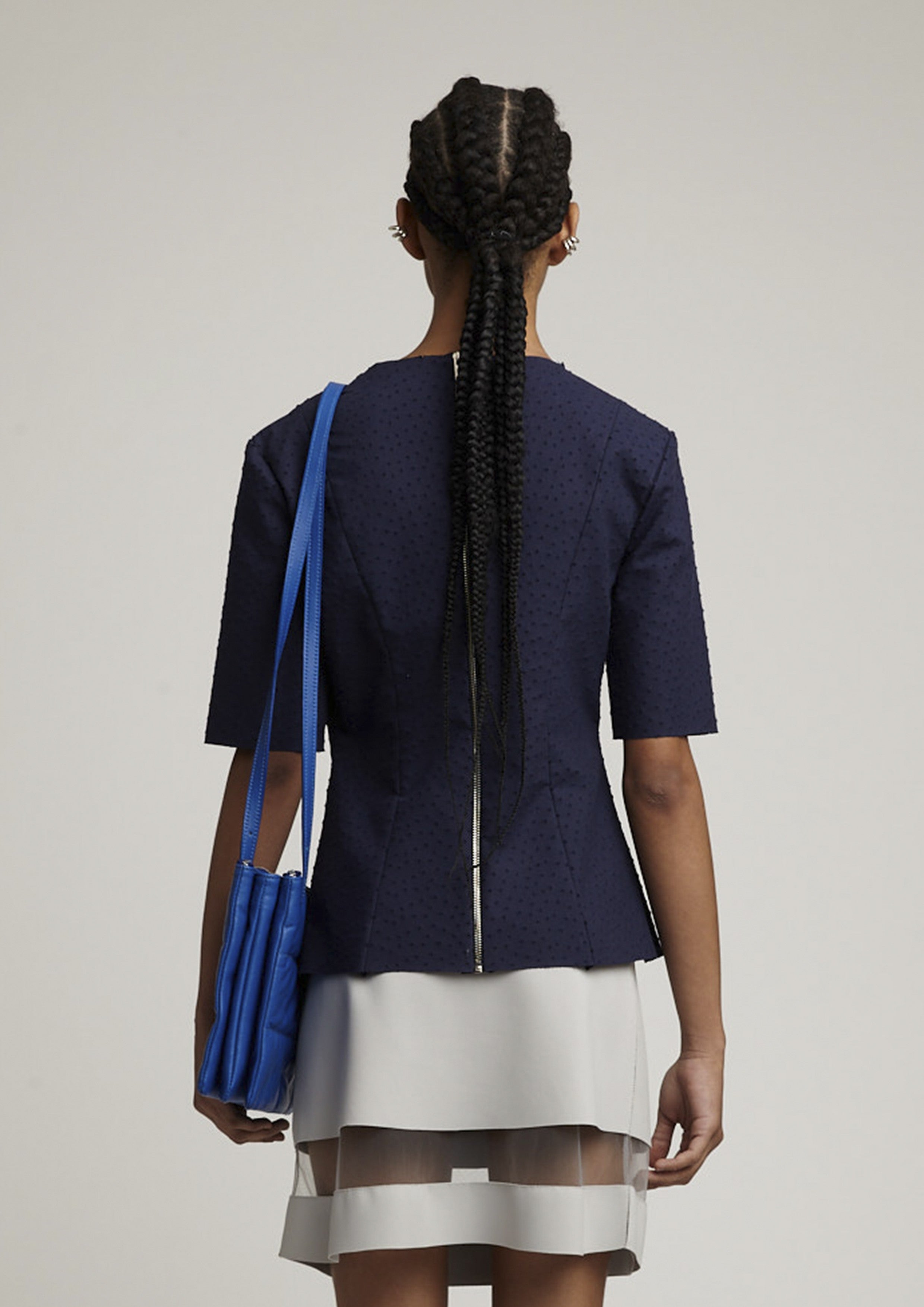 Blusa confeccionada em duck duck bordado, com modelagem clássica e fecho traseiro por