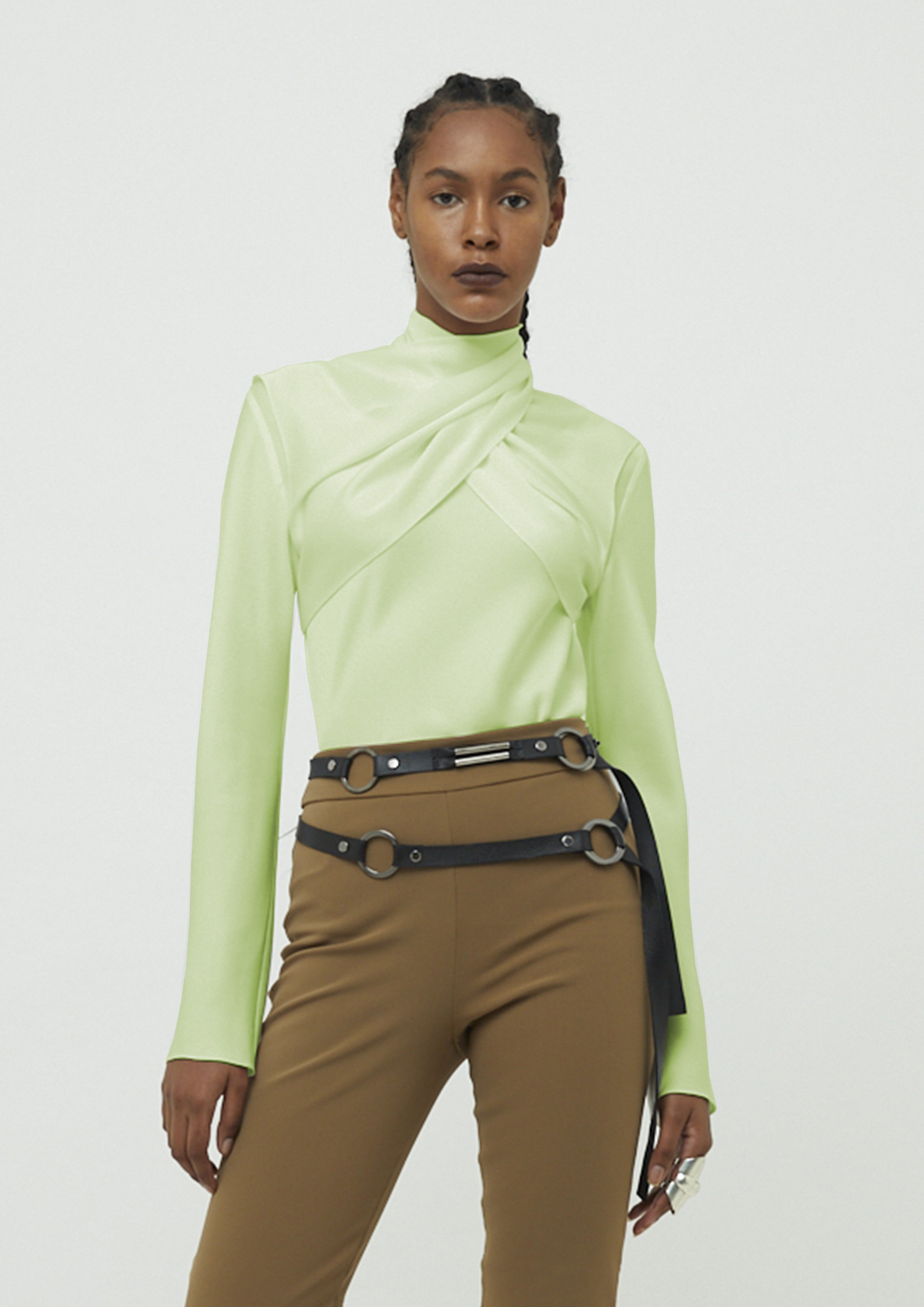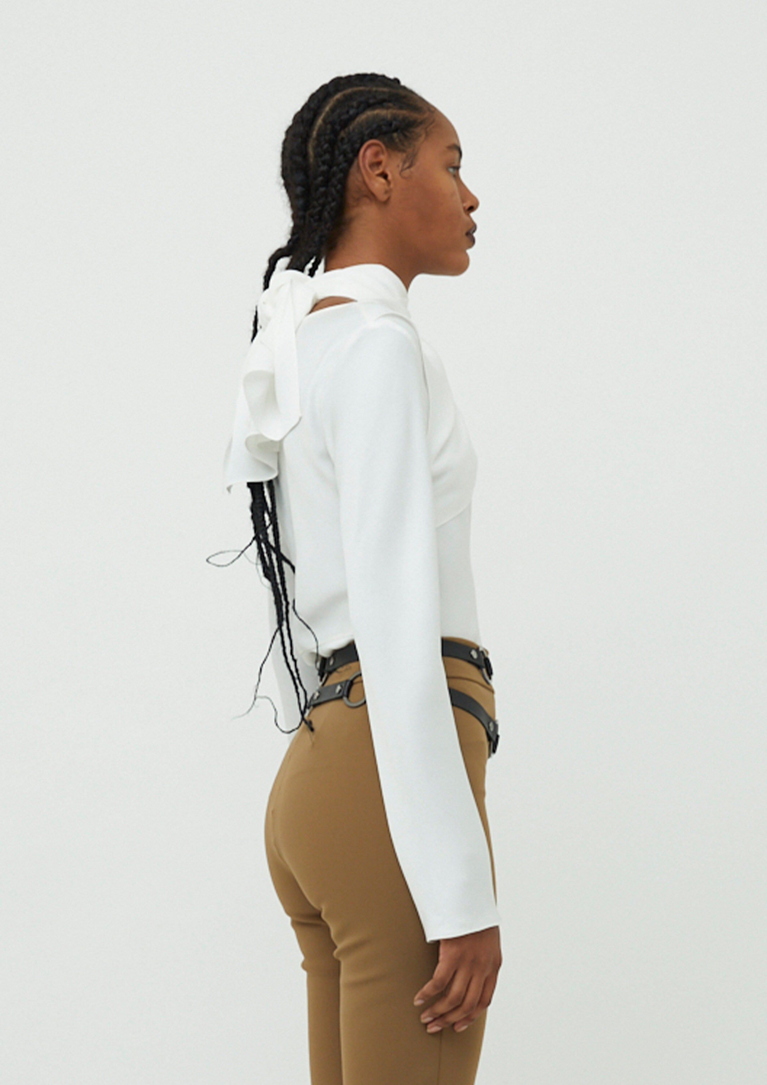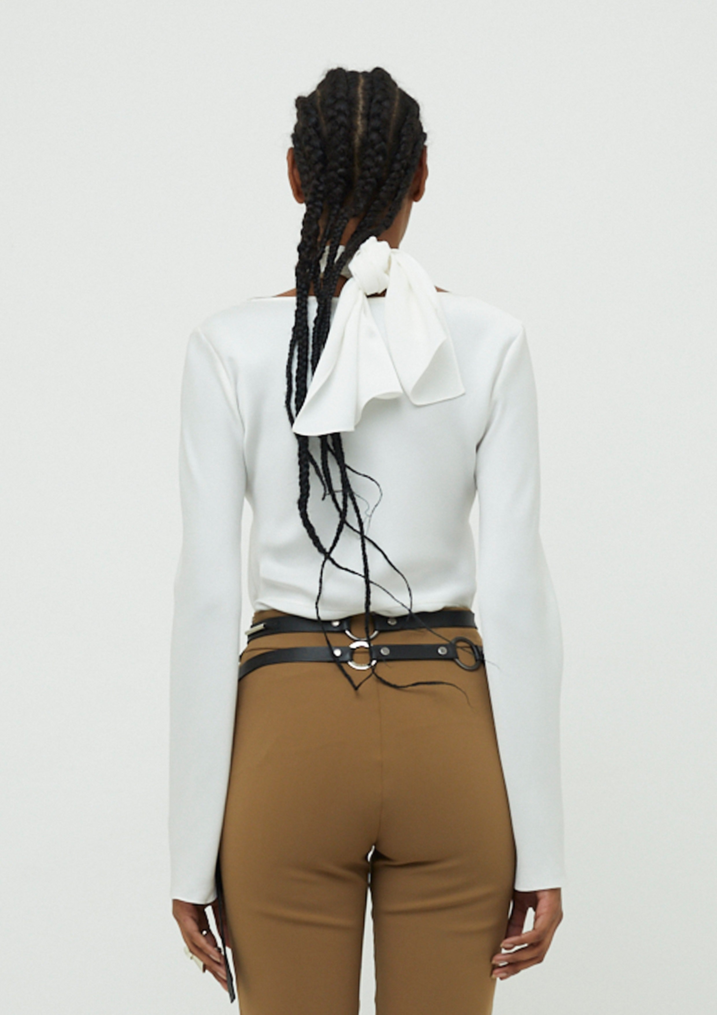 Blusa feita em Crepe possui manga longa e lenços fixos que permitem diversas combinações e amarrações.