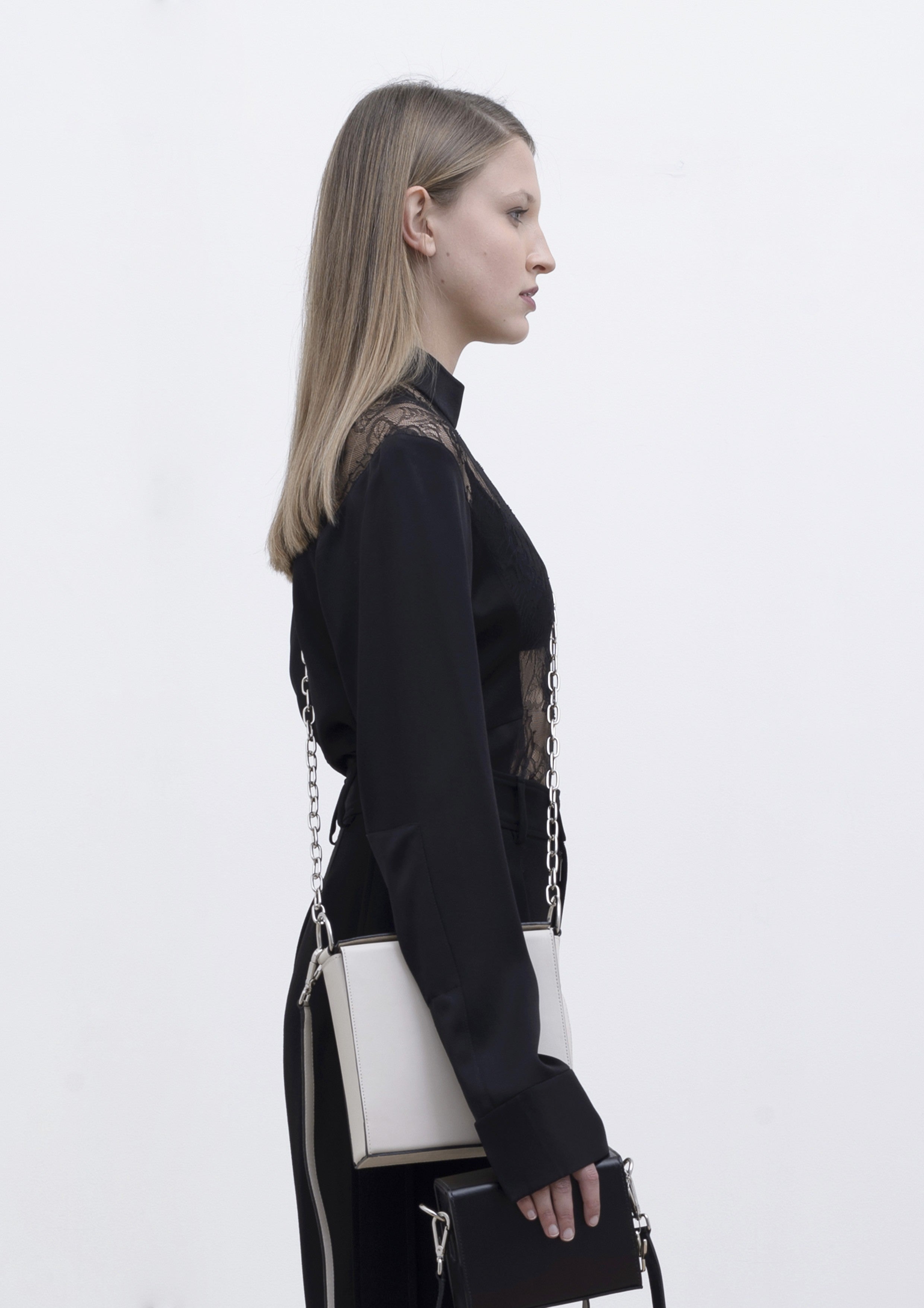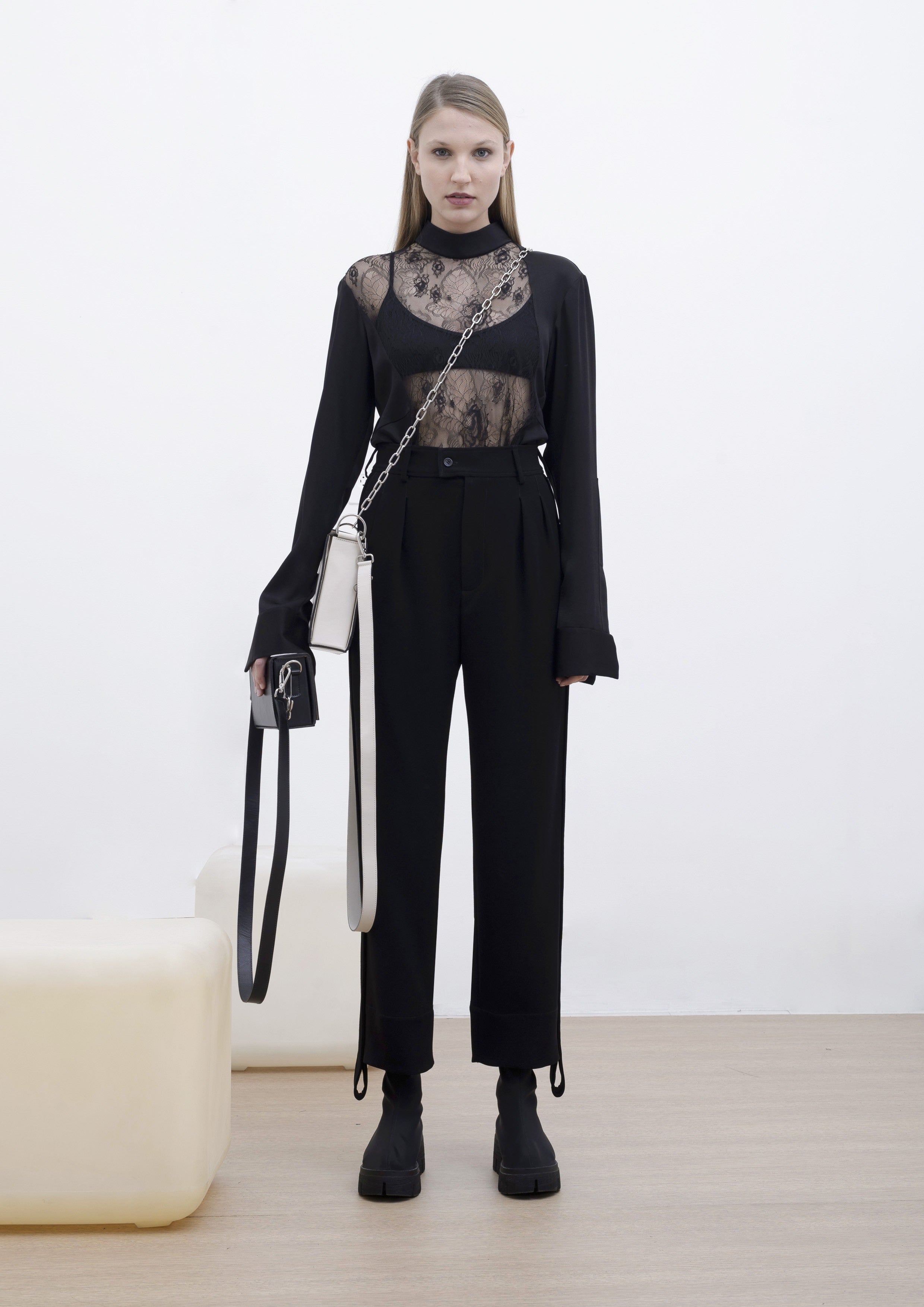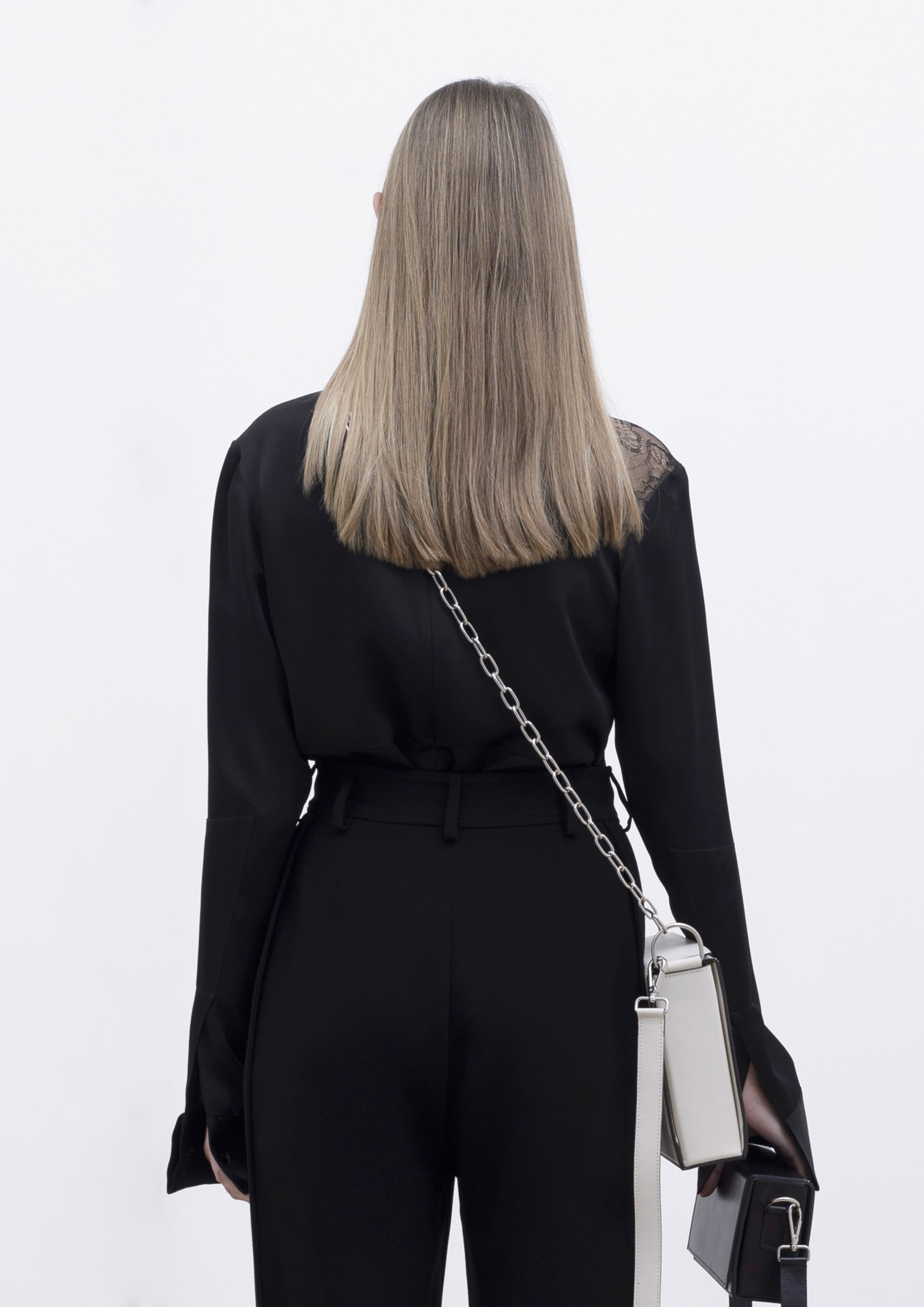 Blusa feita em renda e crepe, com gola padre e renda frontal com transparência. Possui recortes, mangas longas com botões no punho e fechamento traseiro por zíper invisível. Acompanha forro em malha na cor nude.