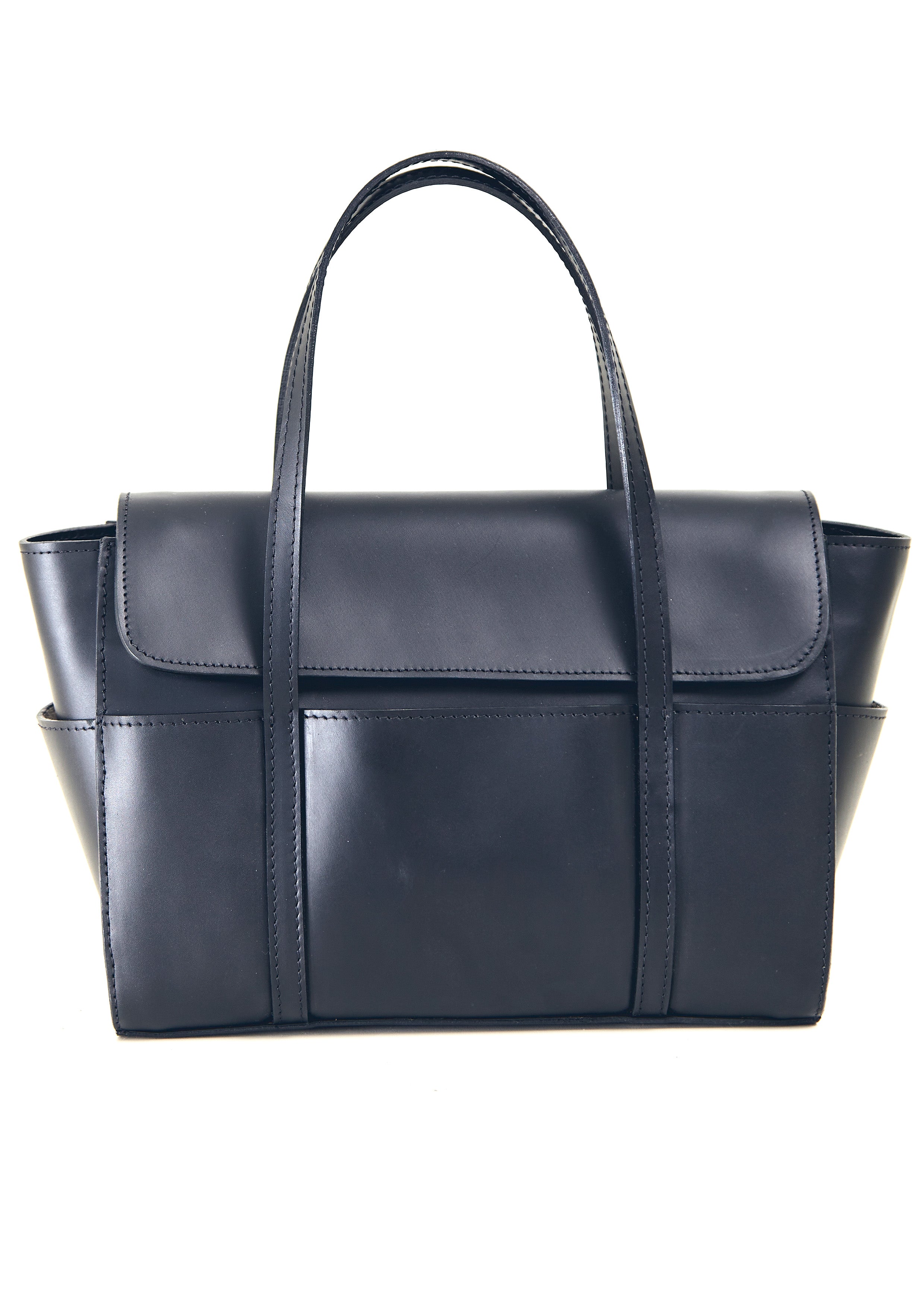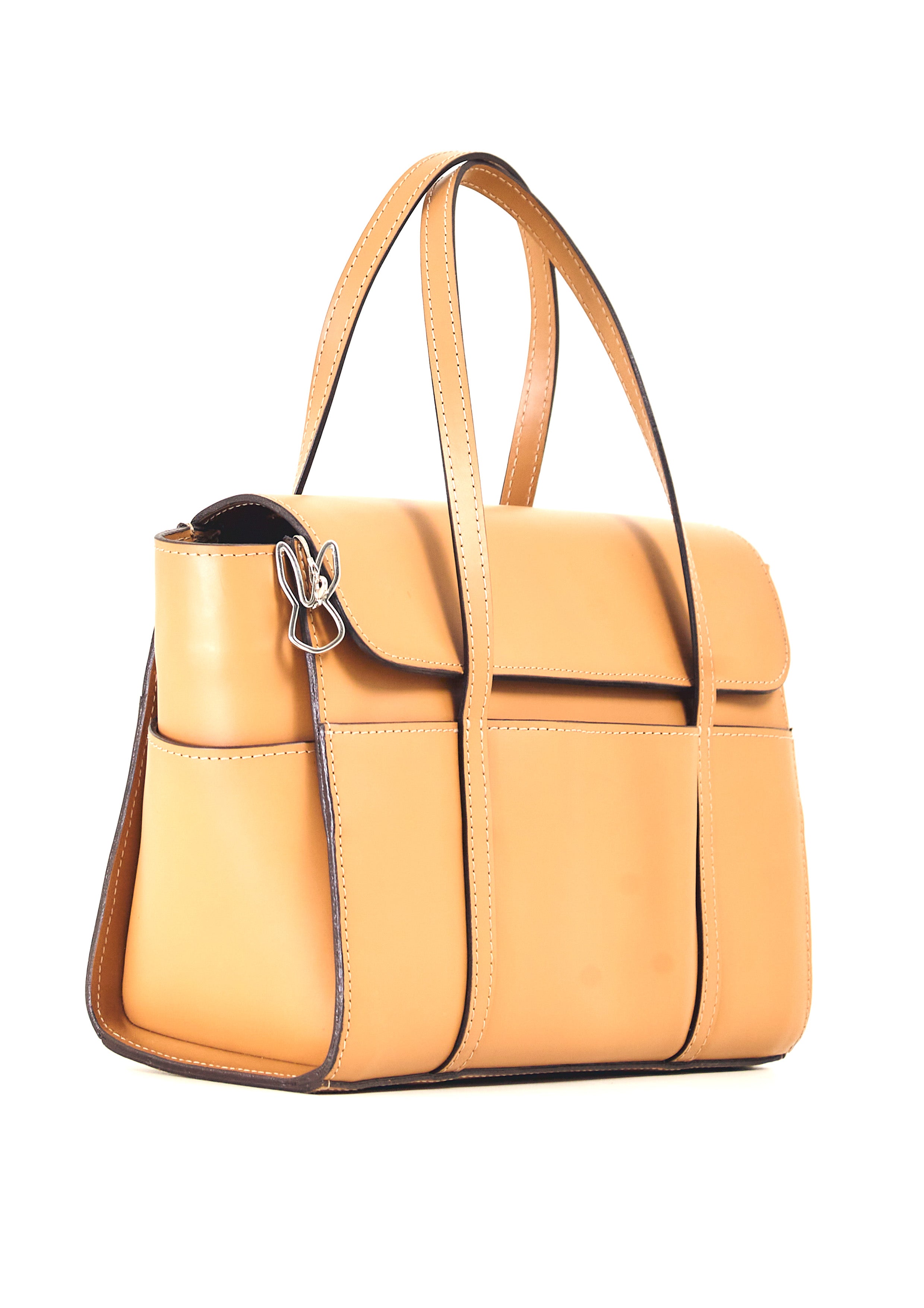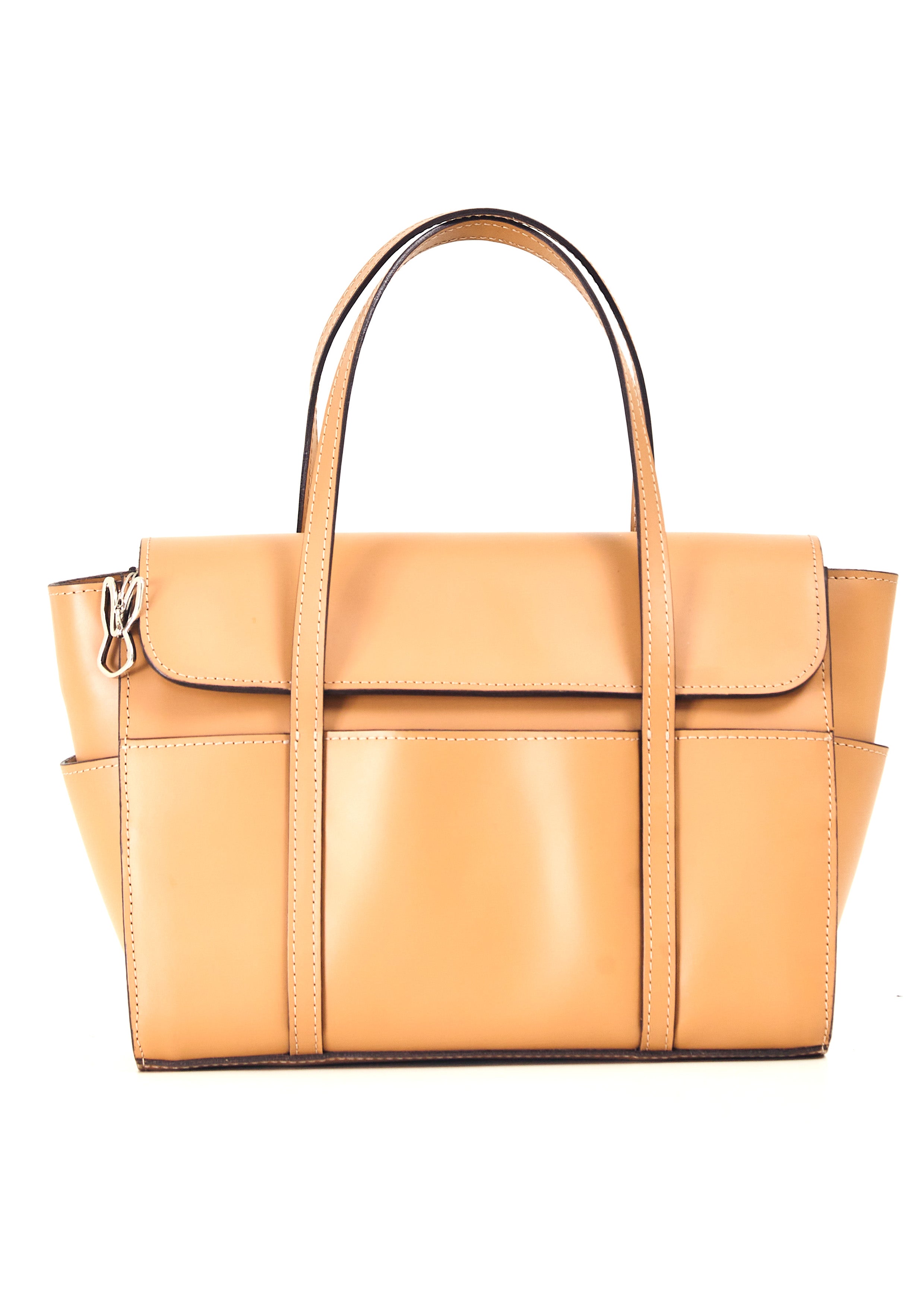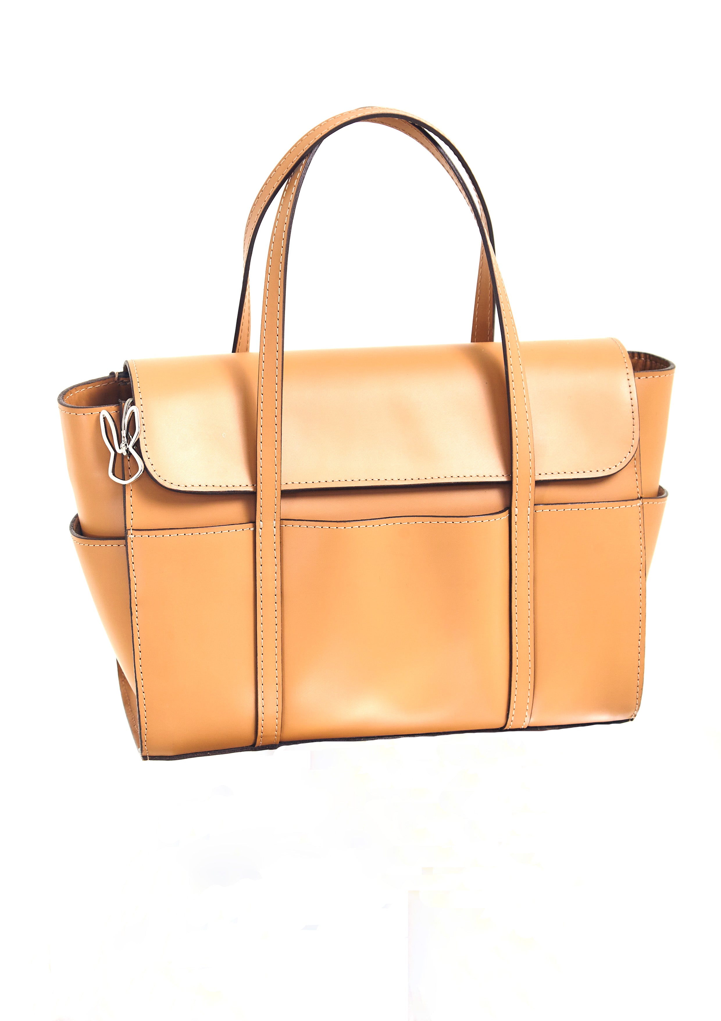 Bolsa de couro pequena, com bolsos externos, alças curtas e aba para fechar.