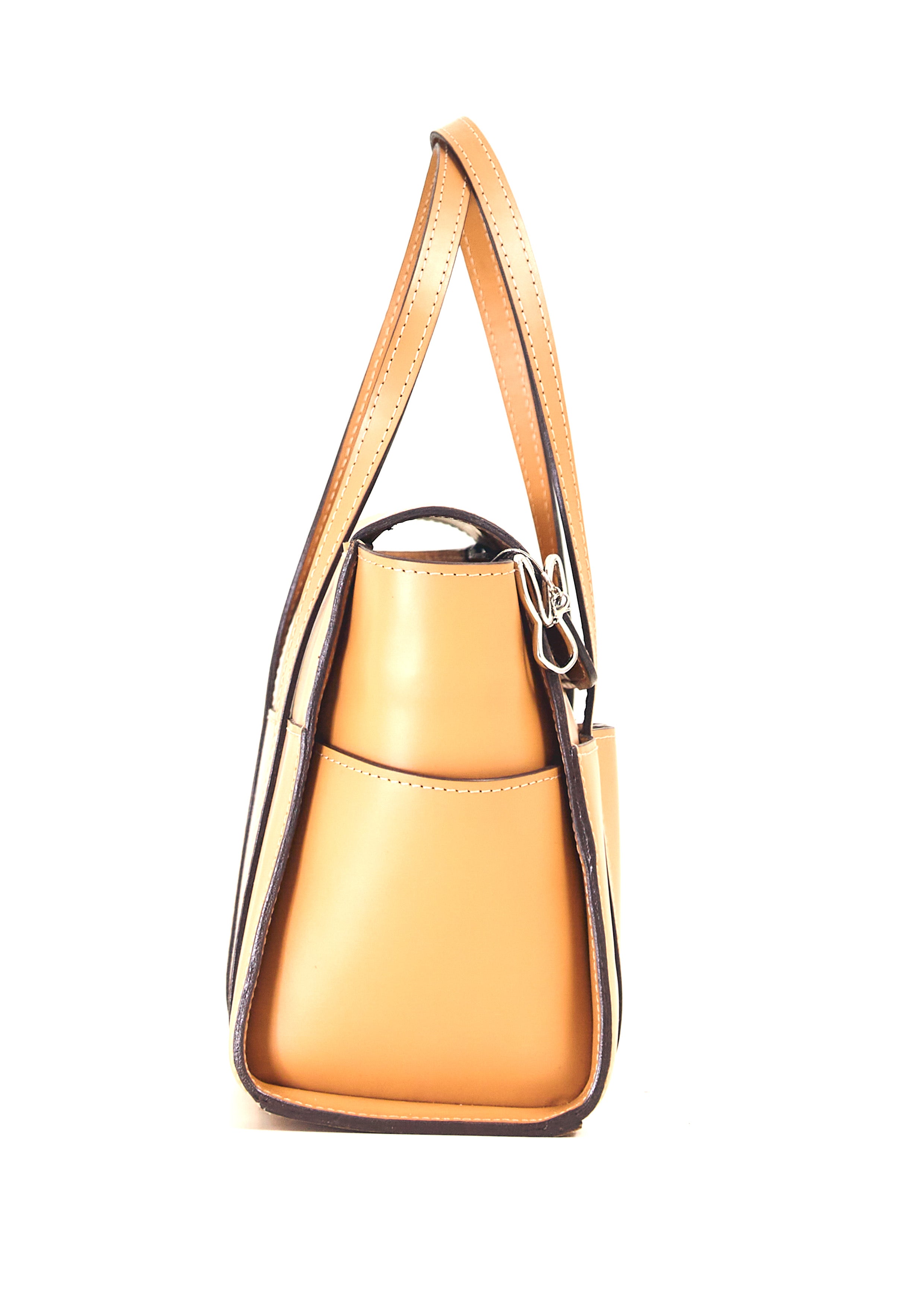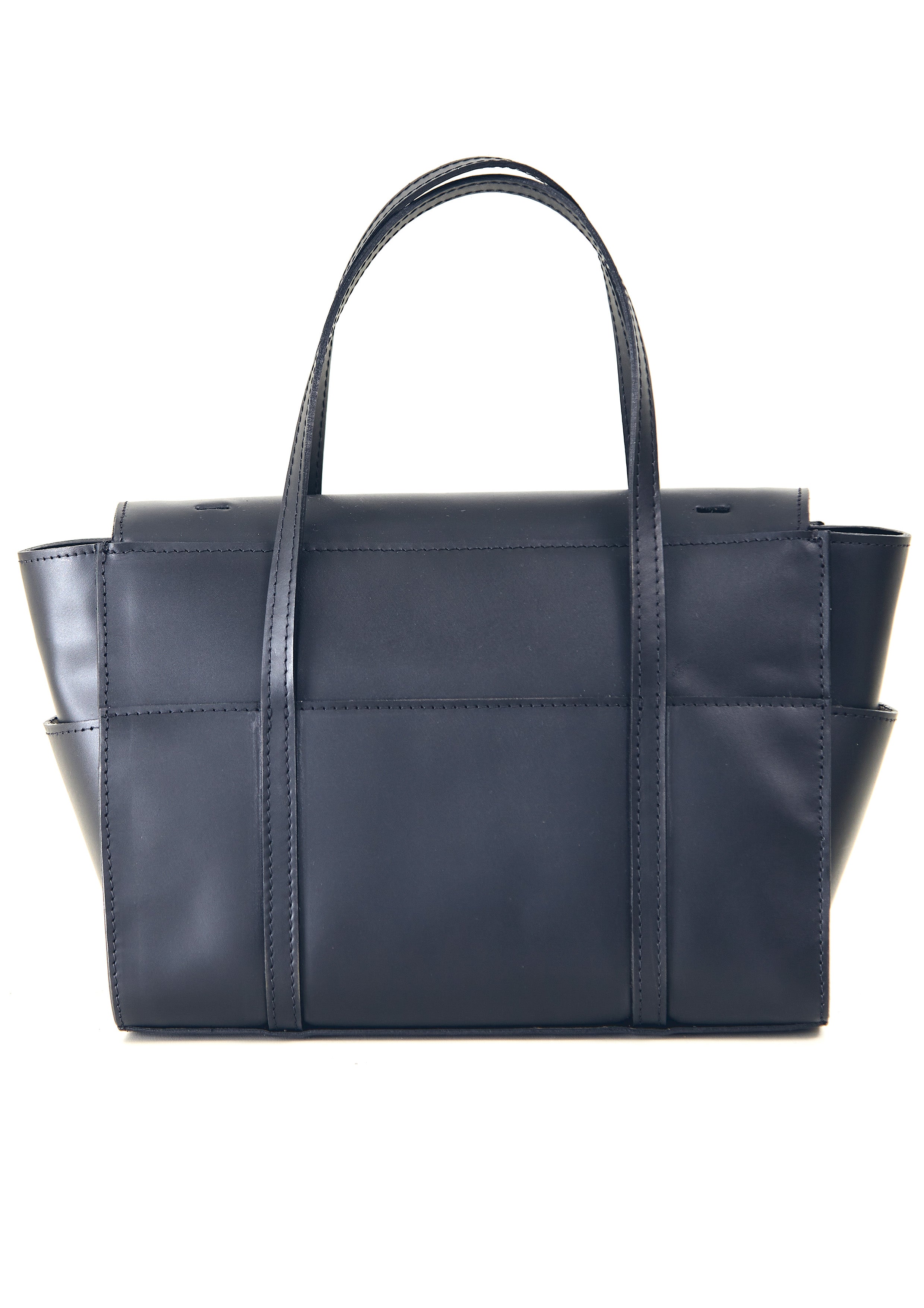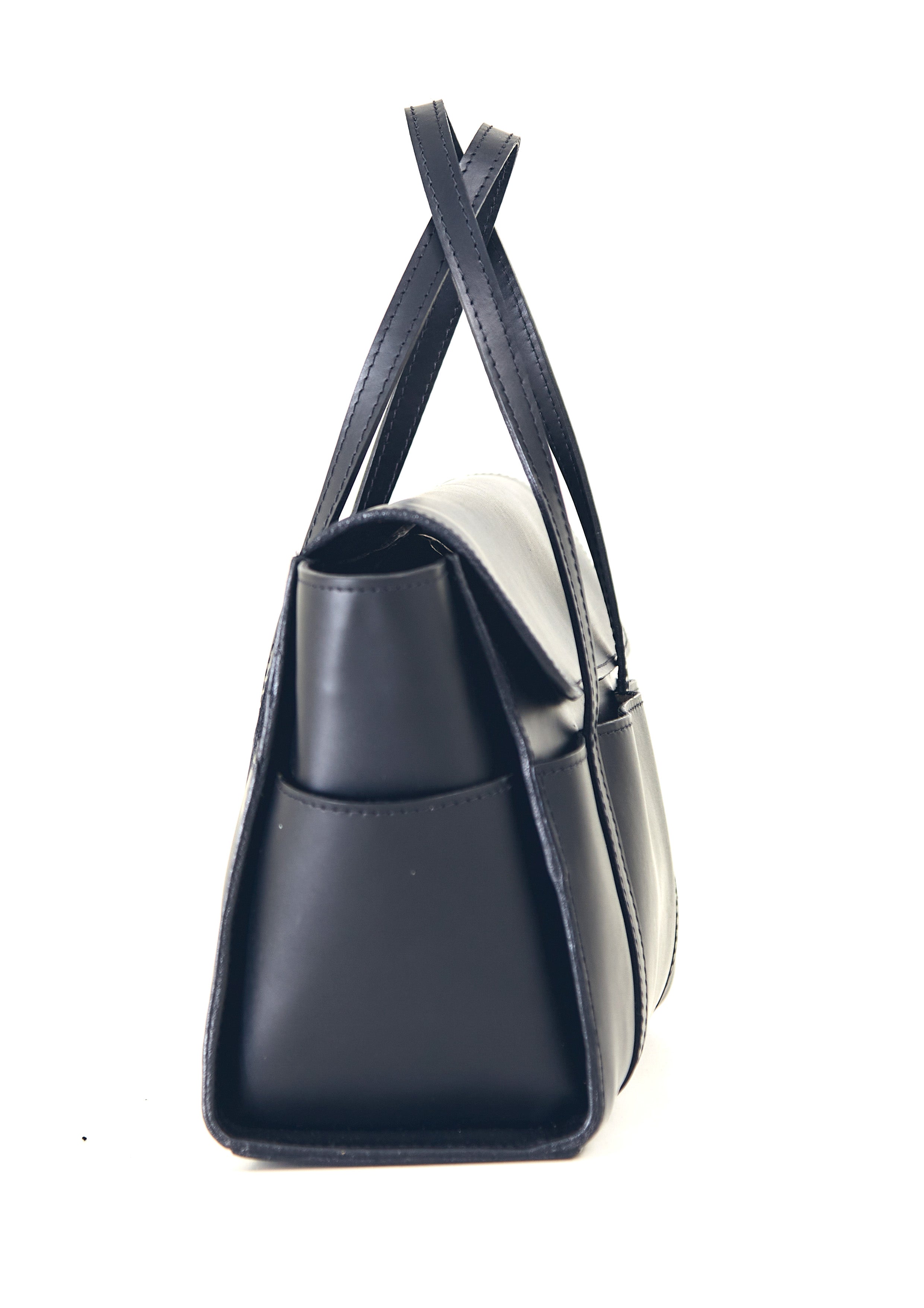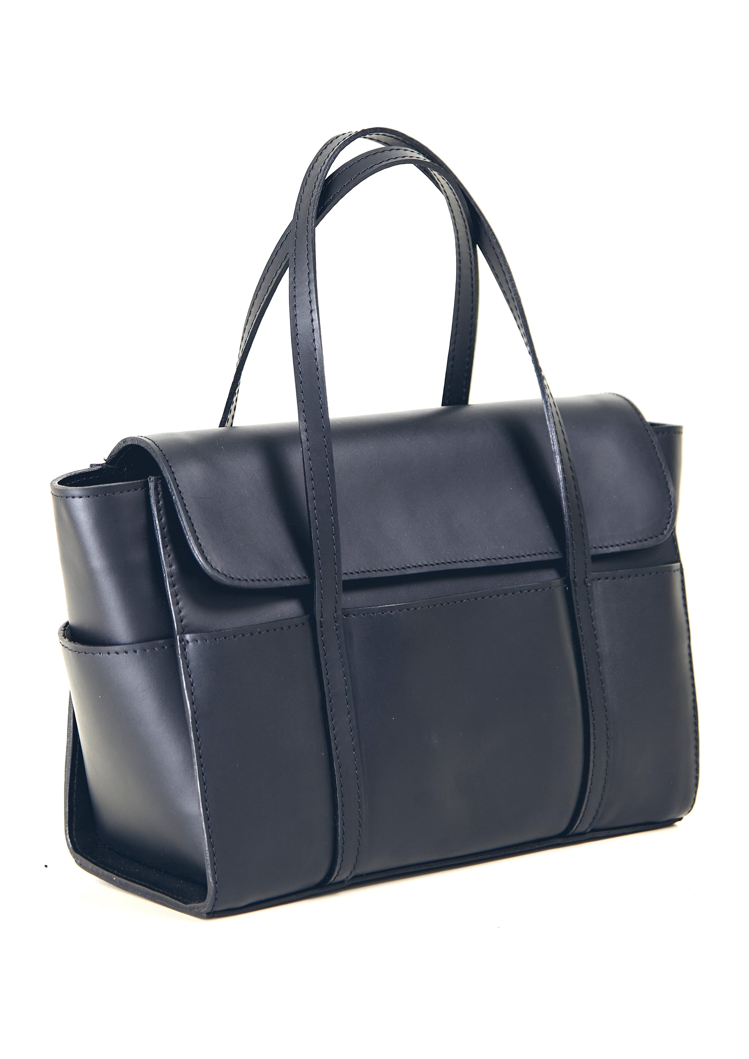 Bolsa de couro pequena, com bolsos externos, alças curtas e aba para fechar.
