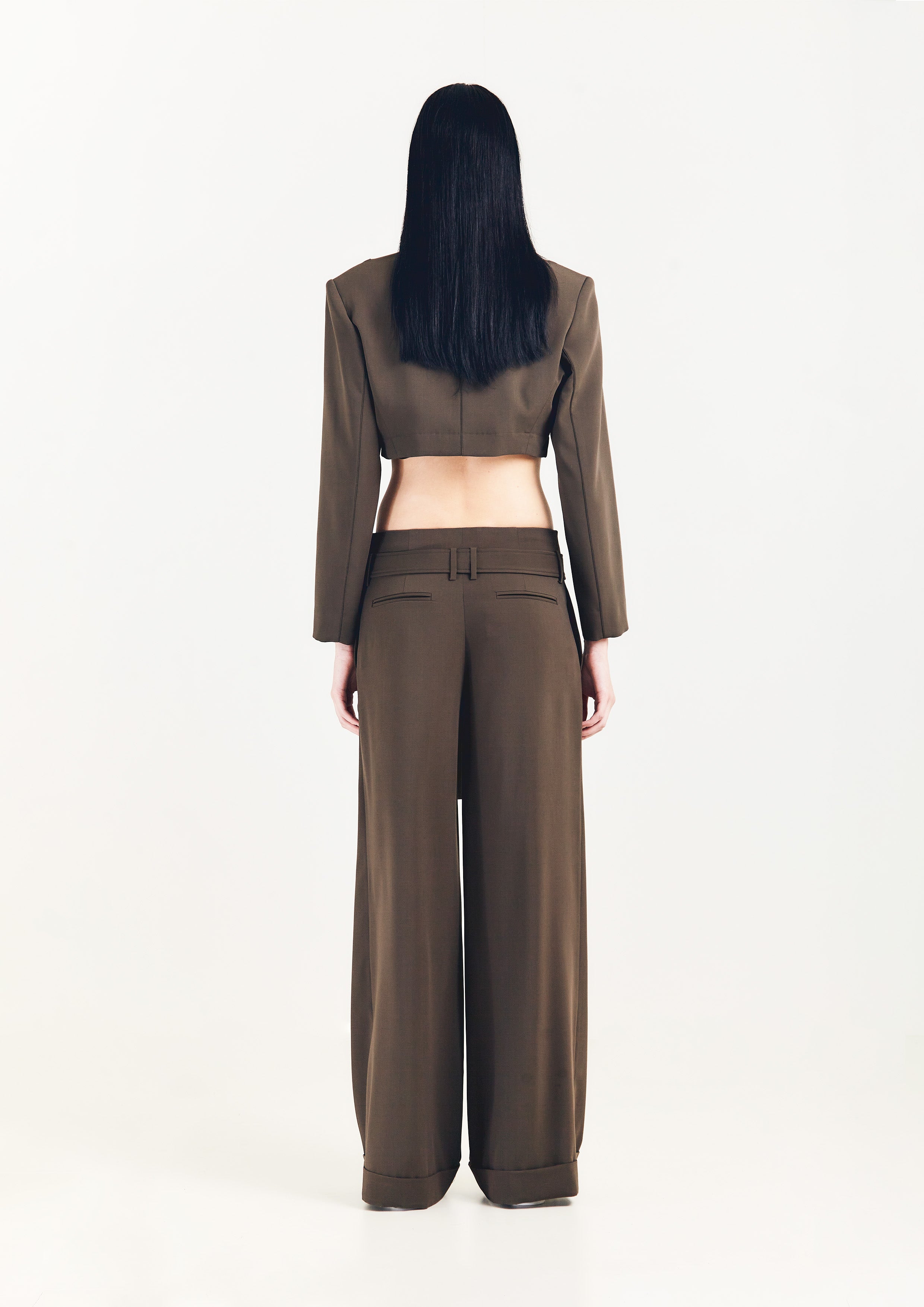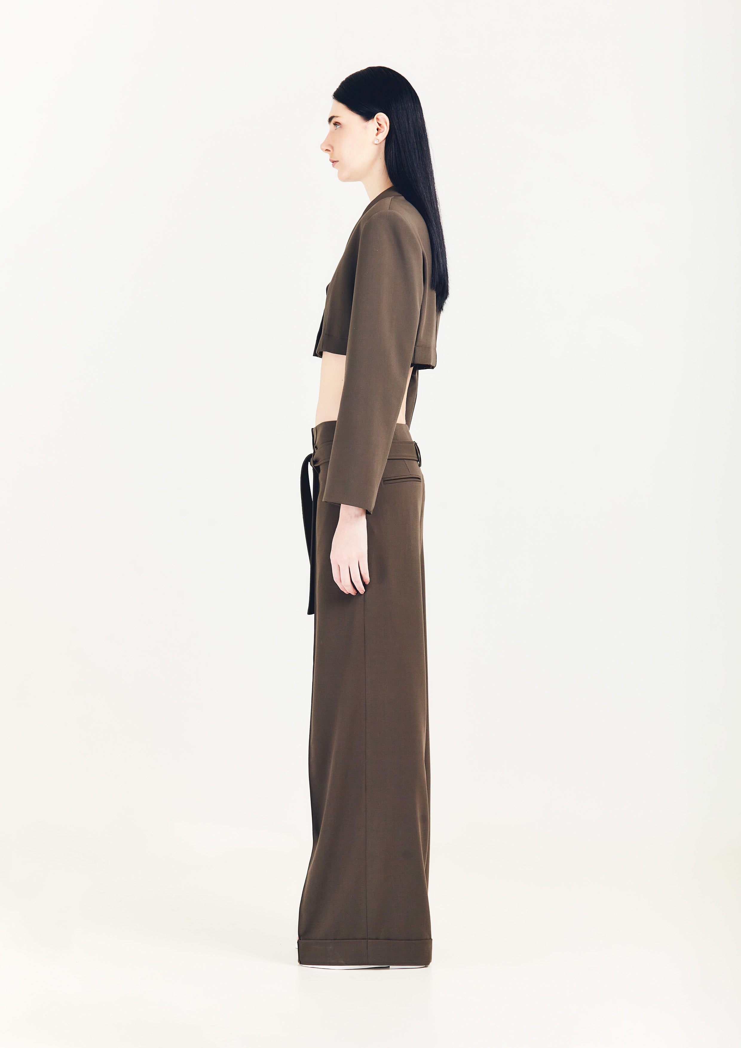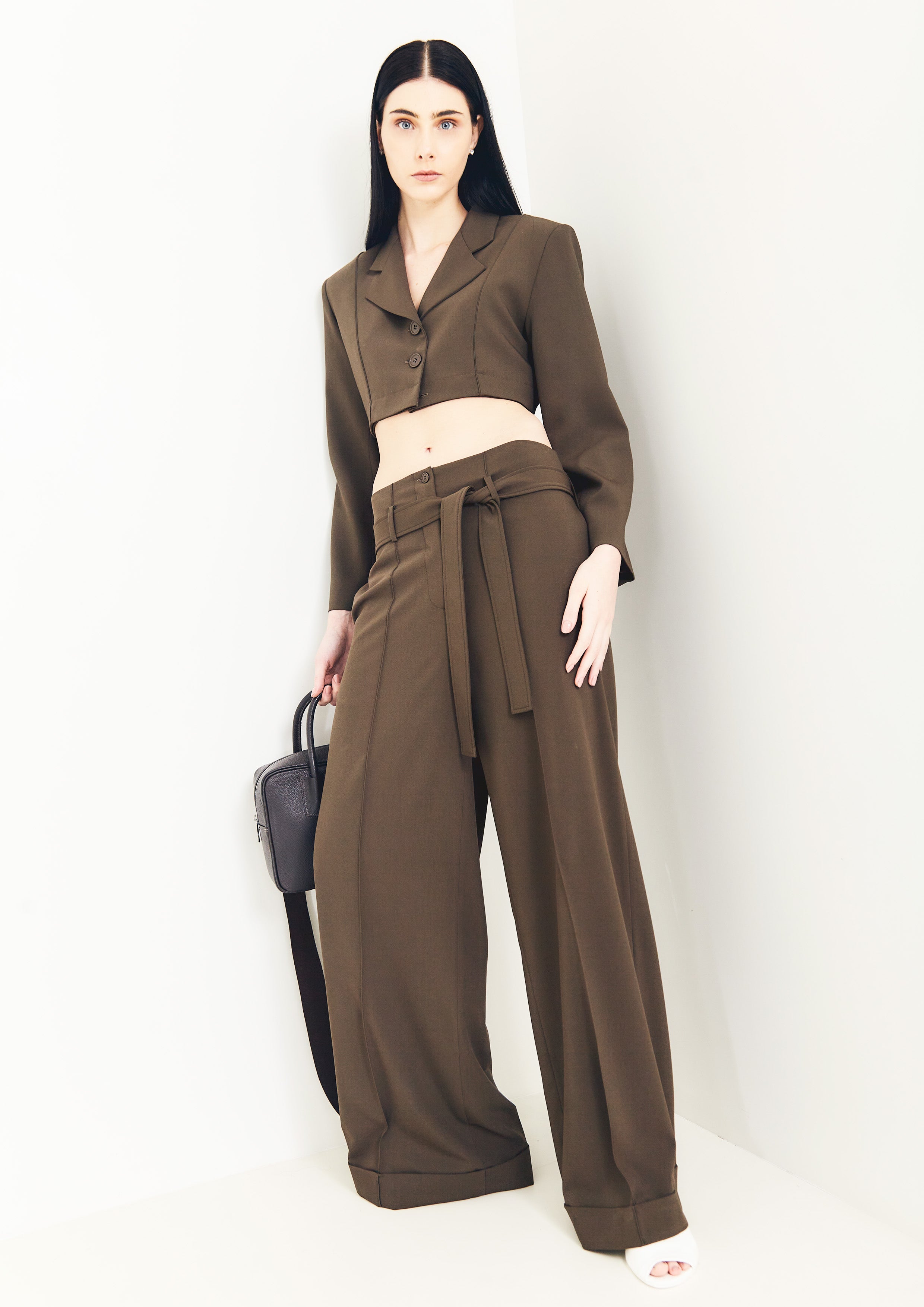 Calça ampla de gabardine, acompanha cinto no mesmo tecido.