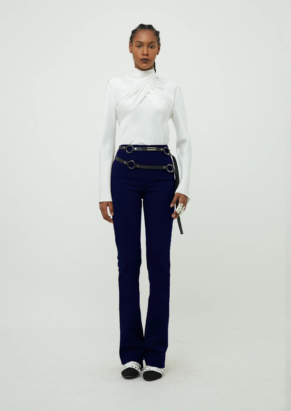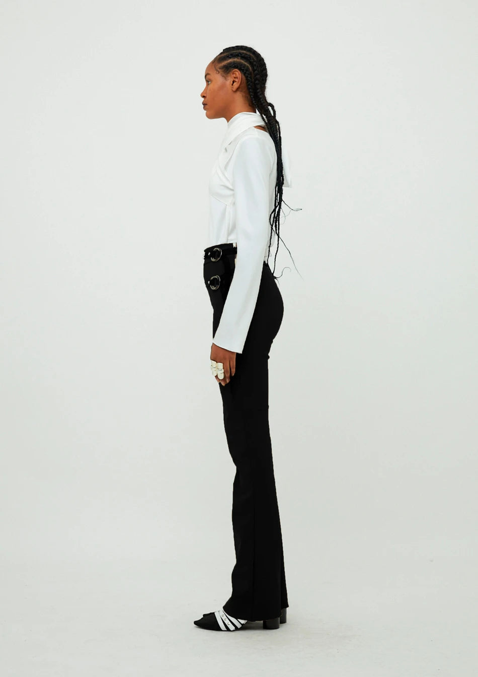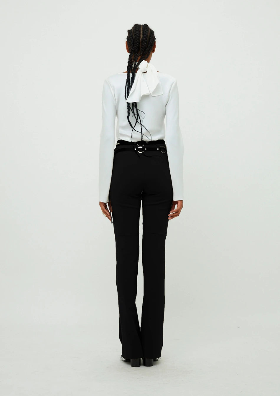 Calça em Tecno K (material exclusivo). Possui modelagem ajustada ao corpo, cintura alta e barra ampla.