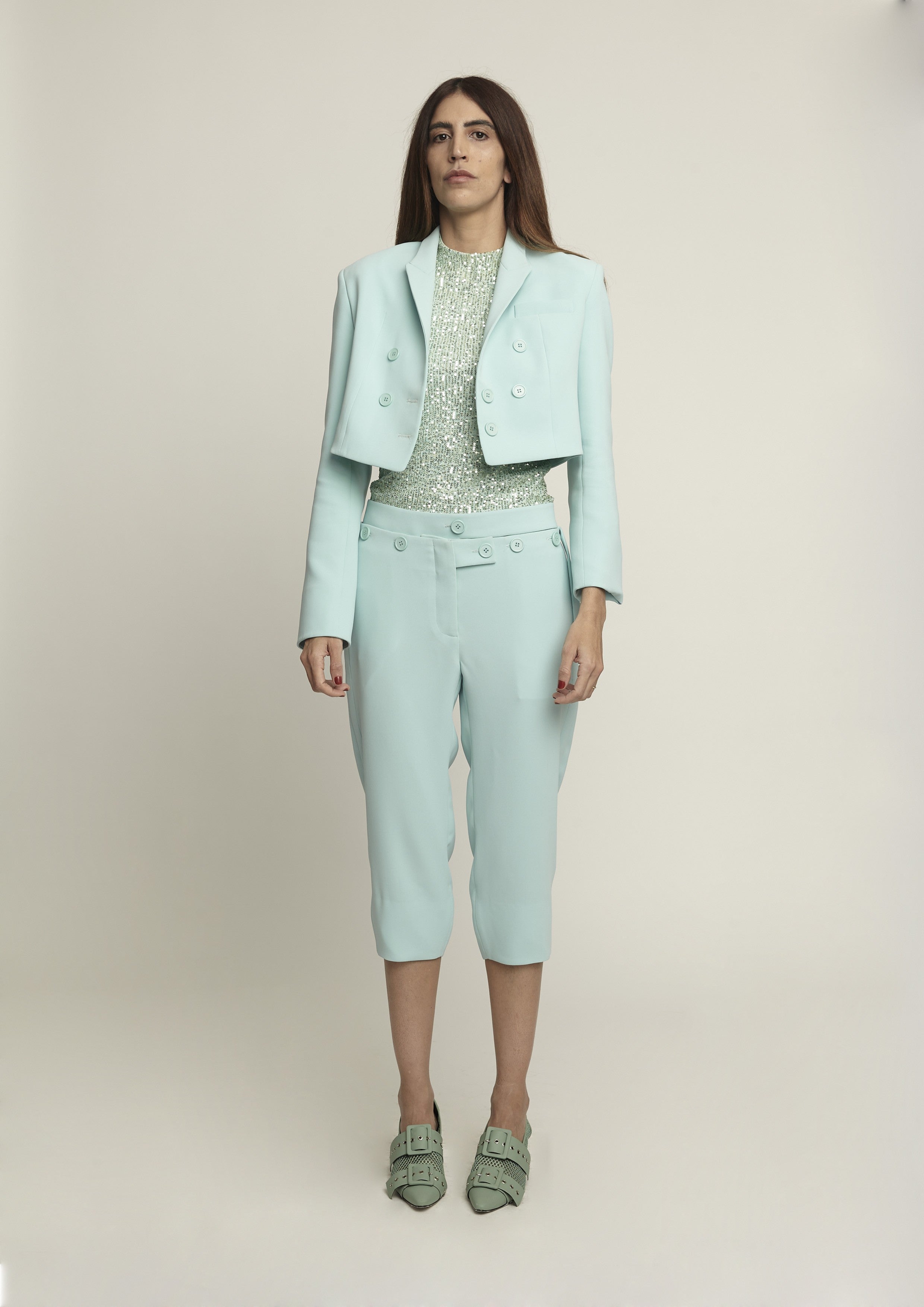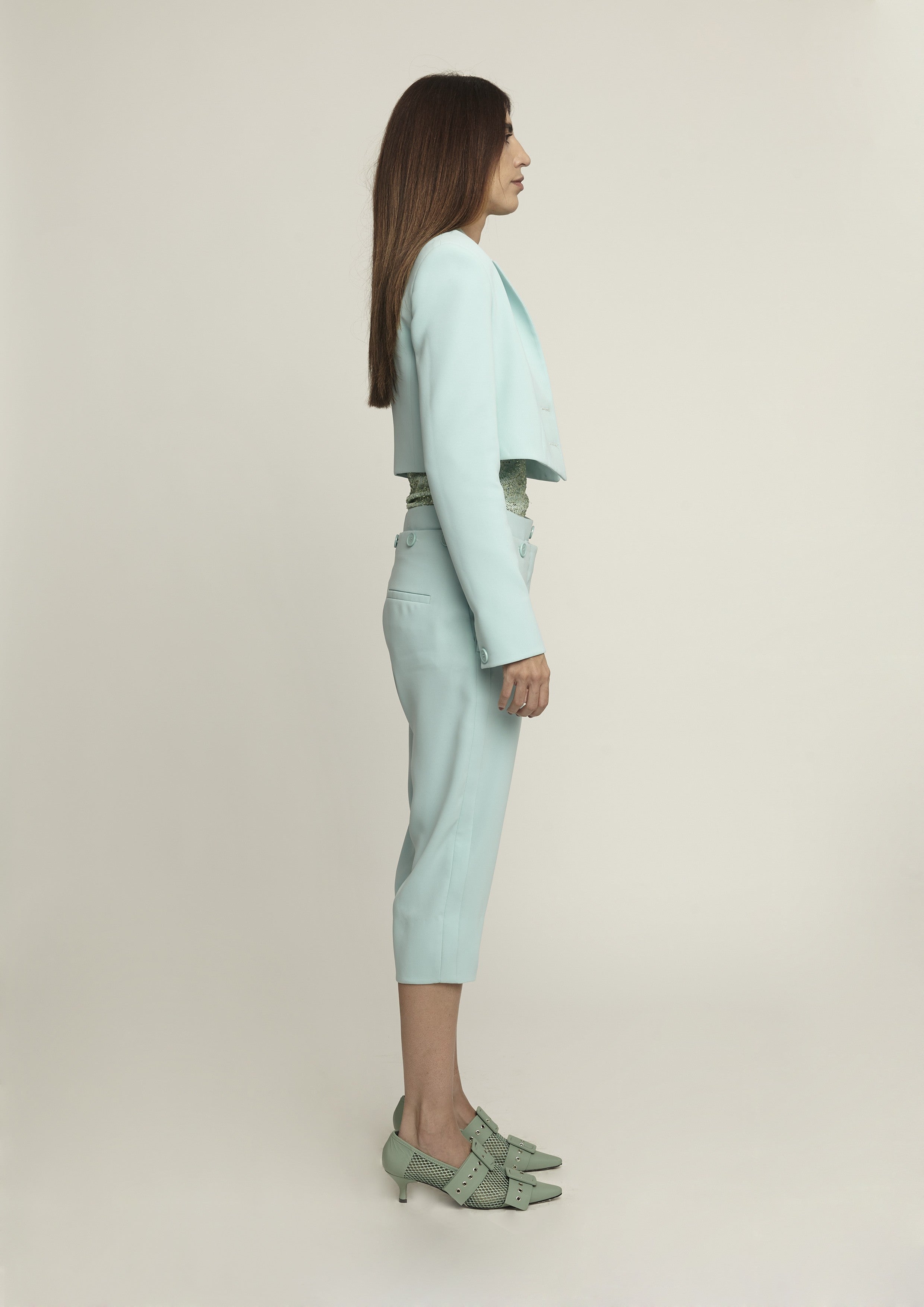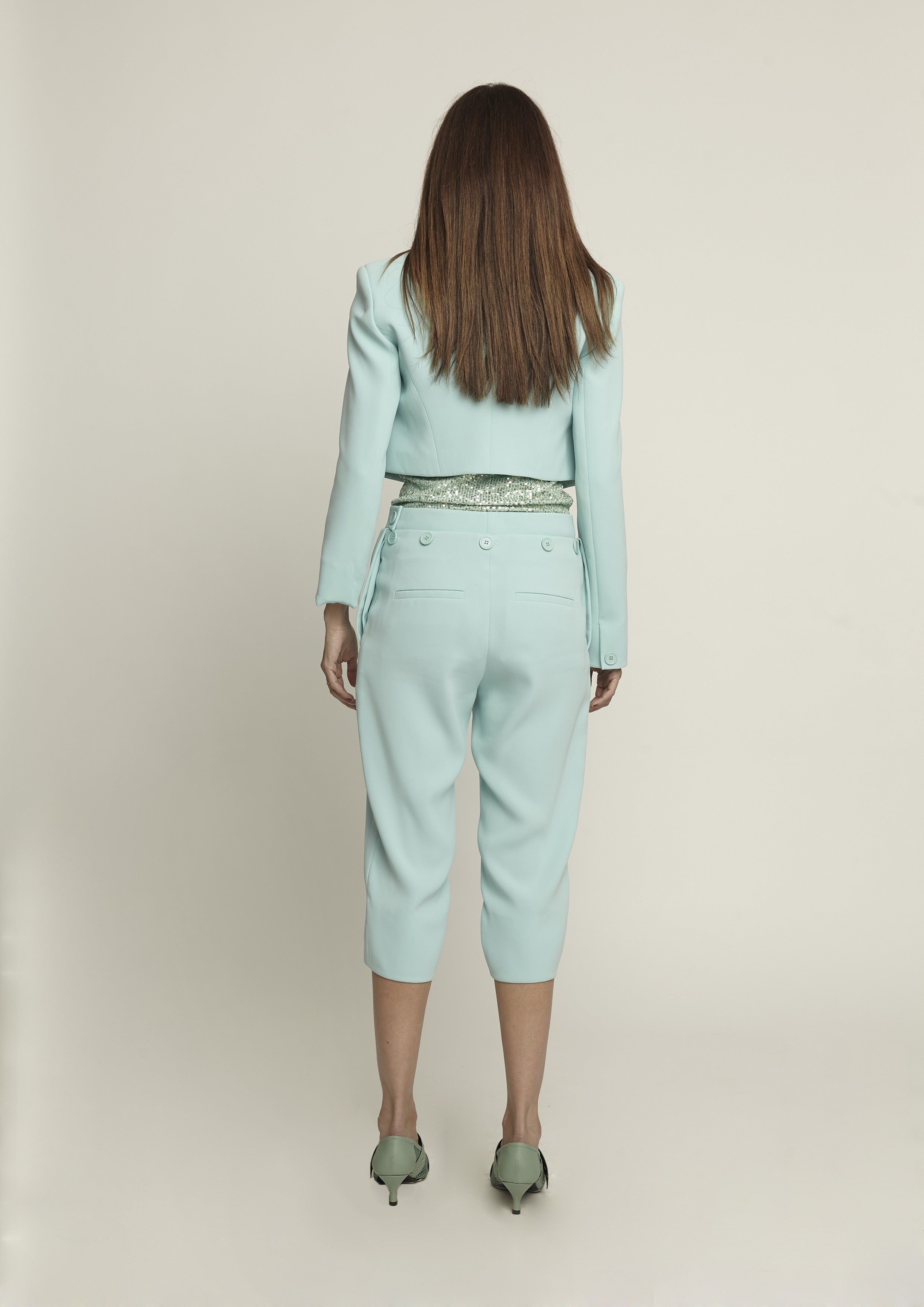 Calça Kincers confeccionada em crepe de cintura baixa com aplicações em botões e