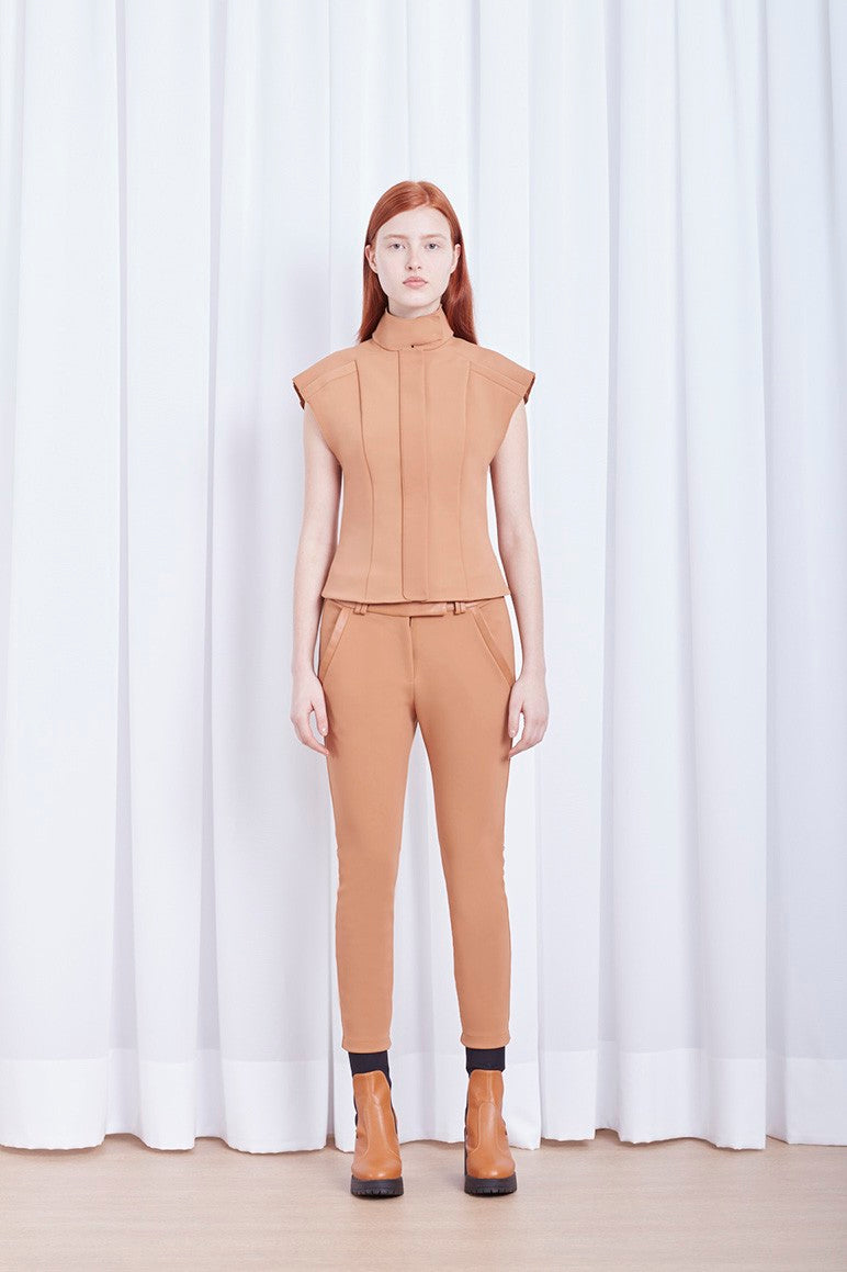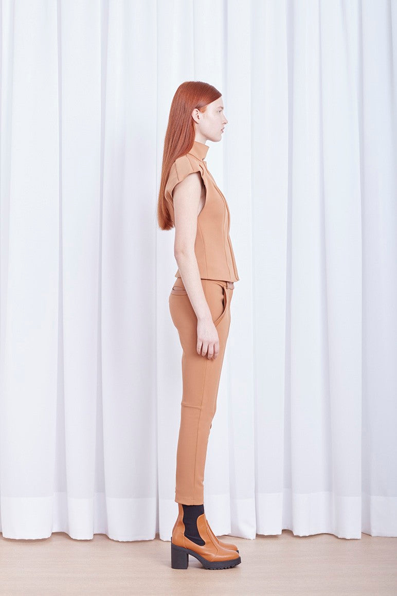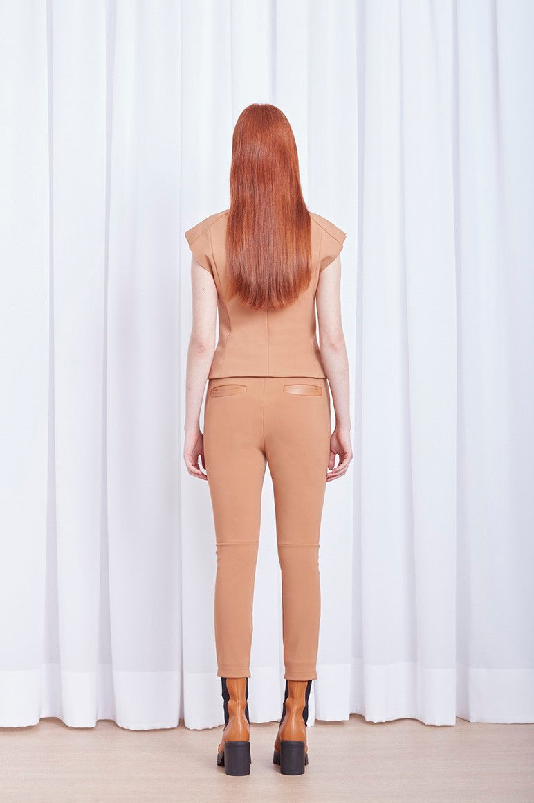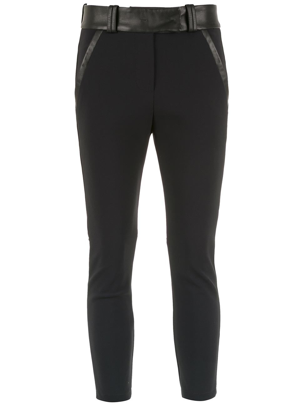 Calça legging cós de couro produzida em TK exclusivo Gloria Coelho, com passantes no cós, fechamento por botão e zíper, bolsos faca e shape justo.
