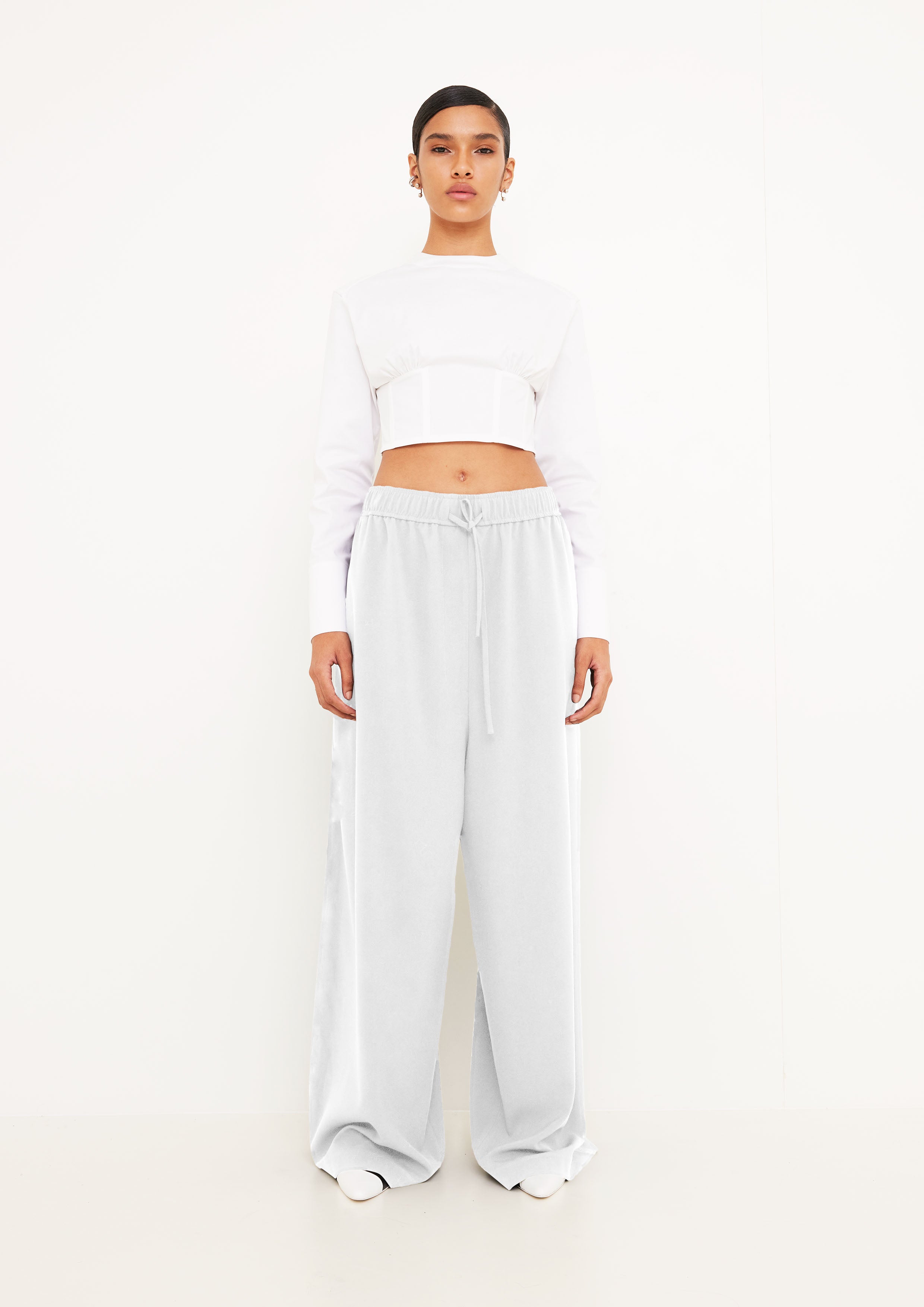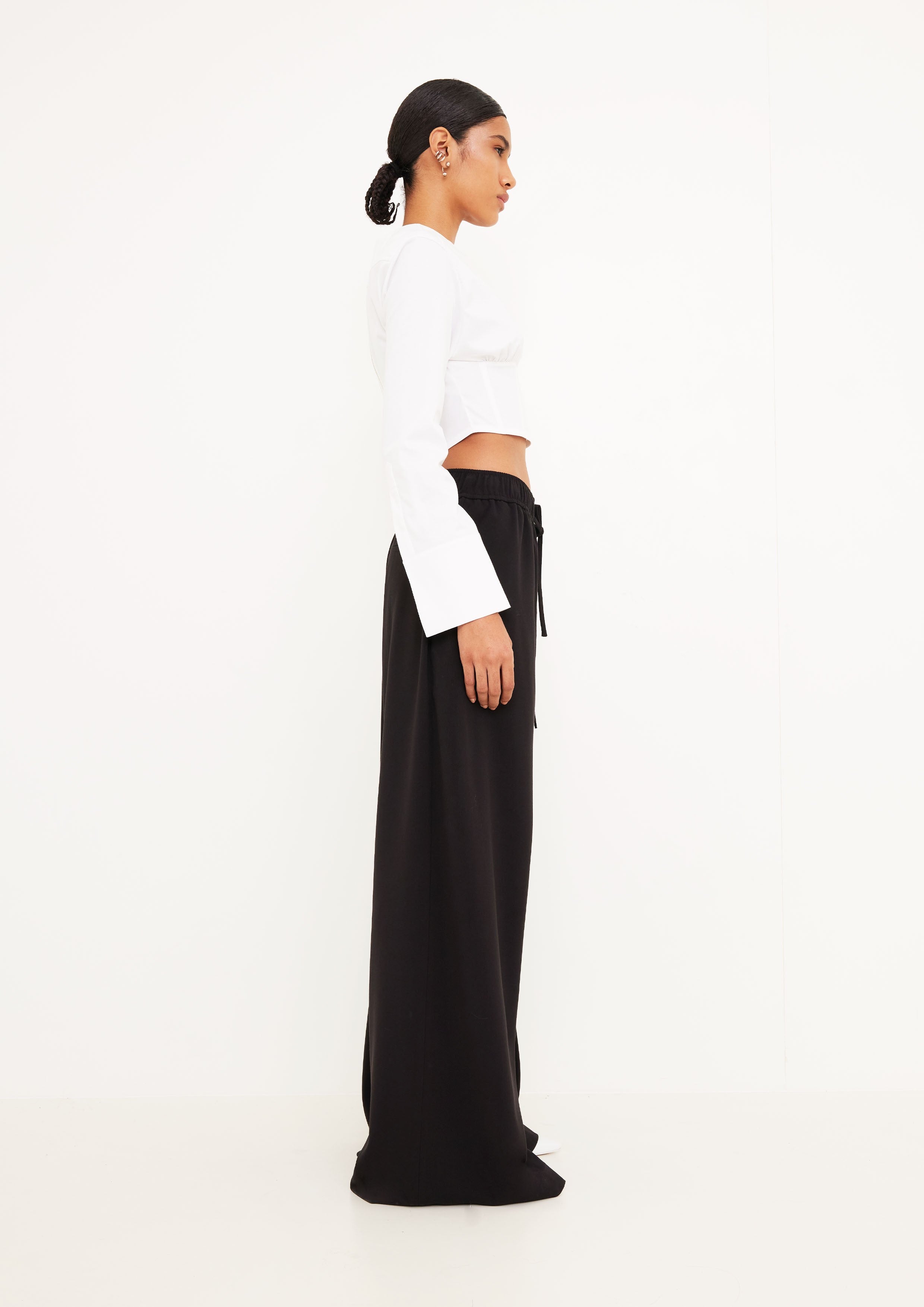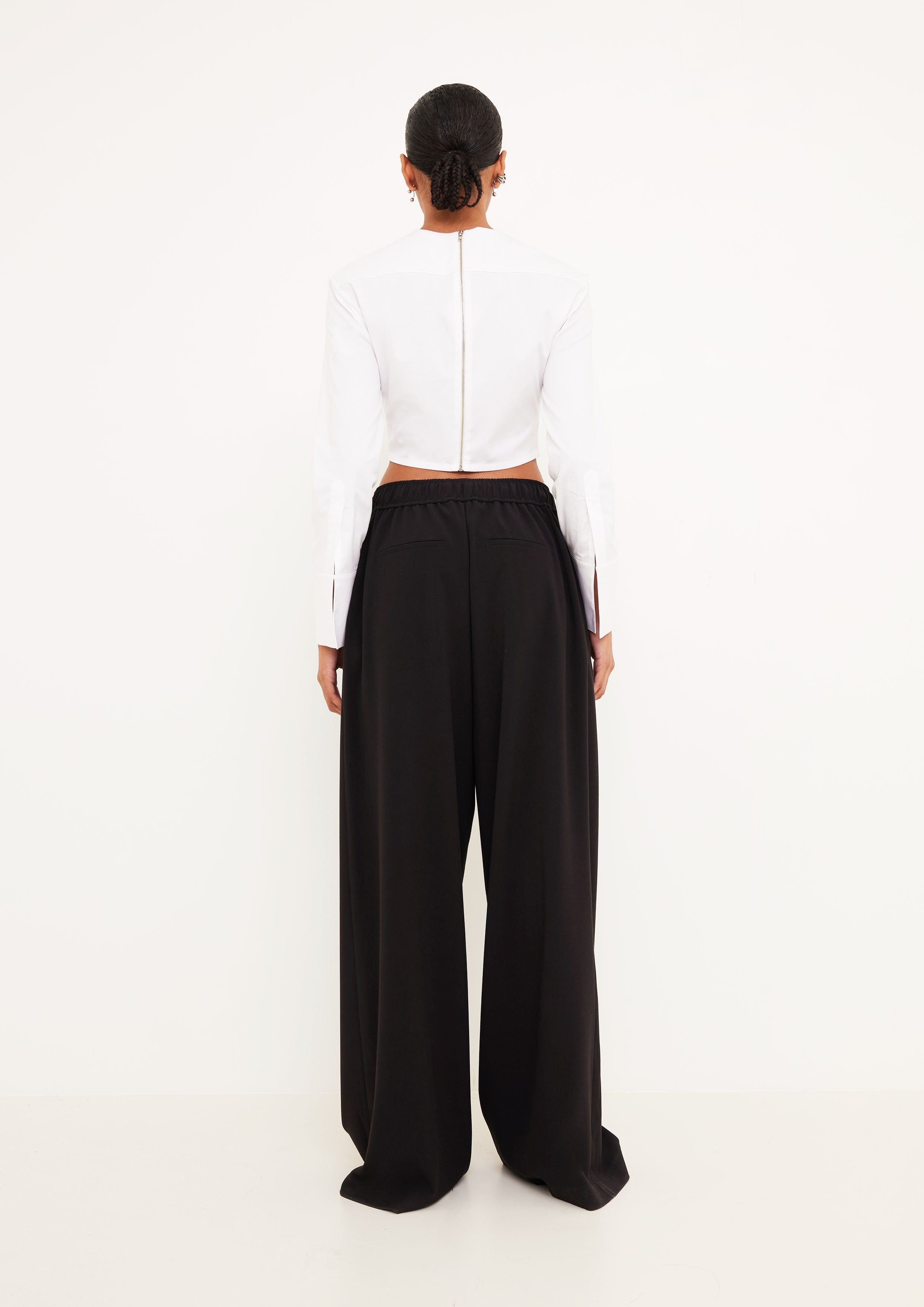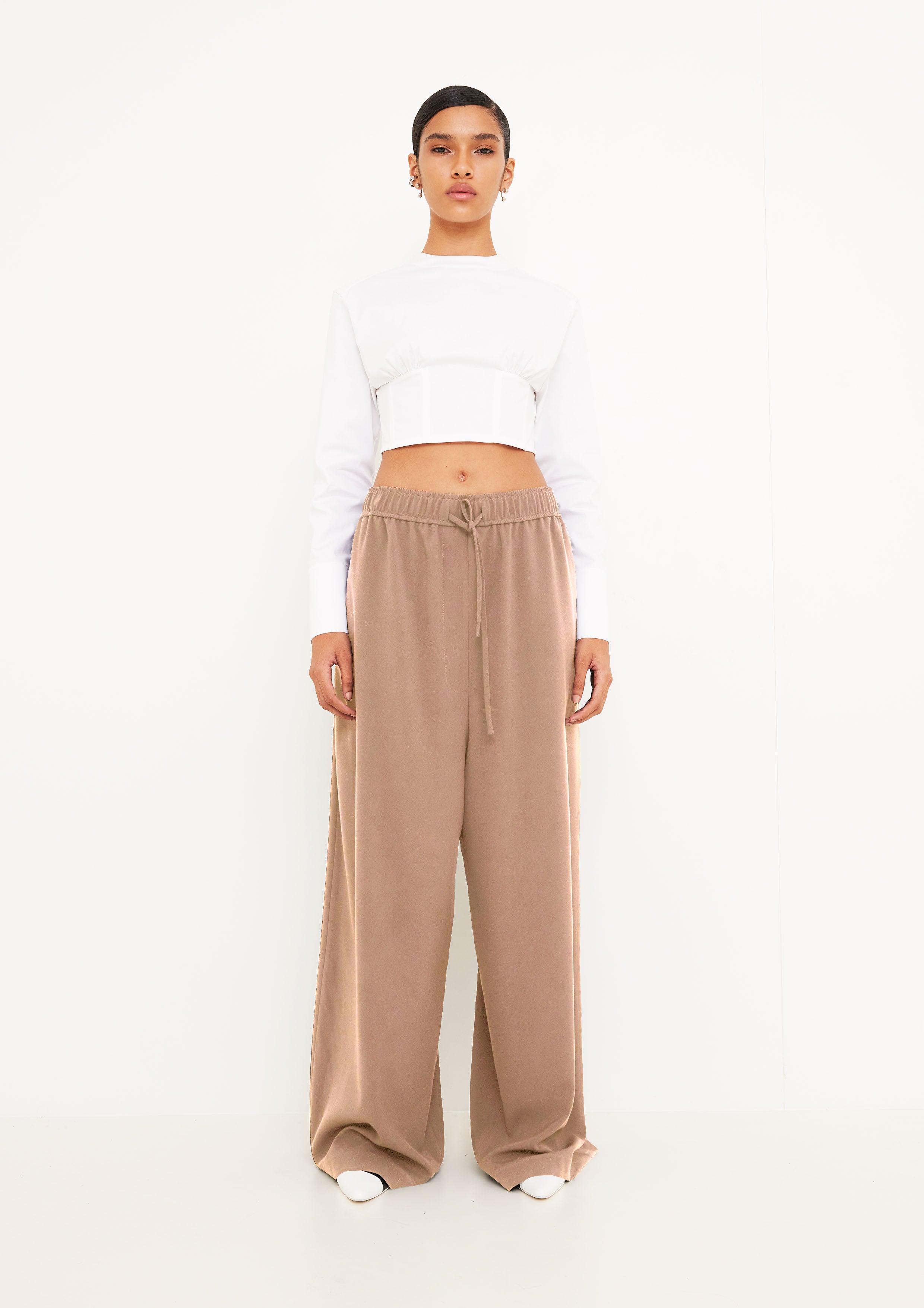 Calça de modelagem oversized com elástico no cós.e cordão para amarração.Possui bolsos laterais e traseiros.