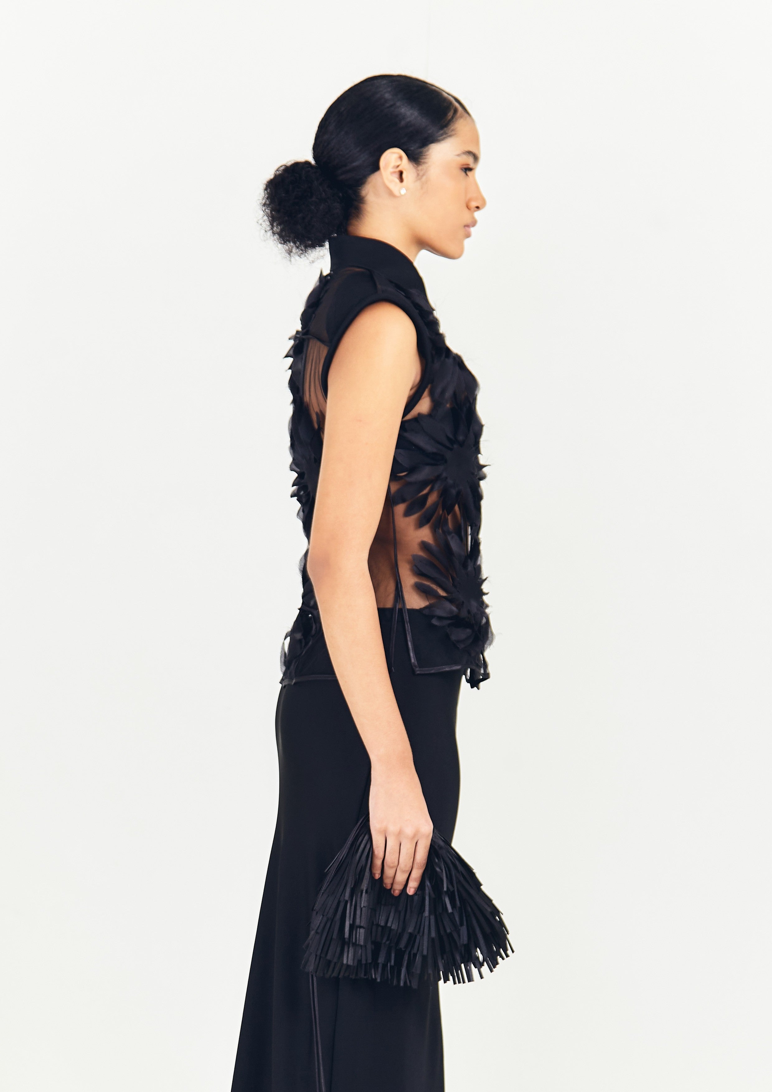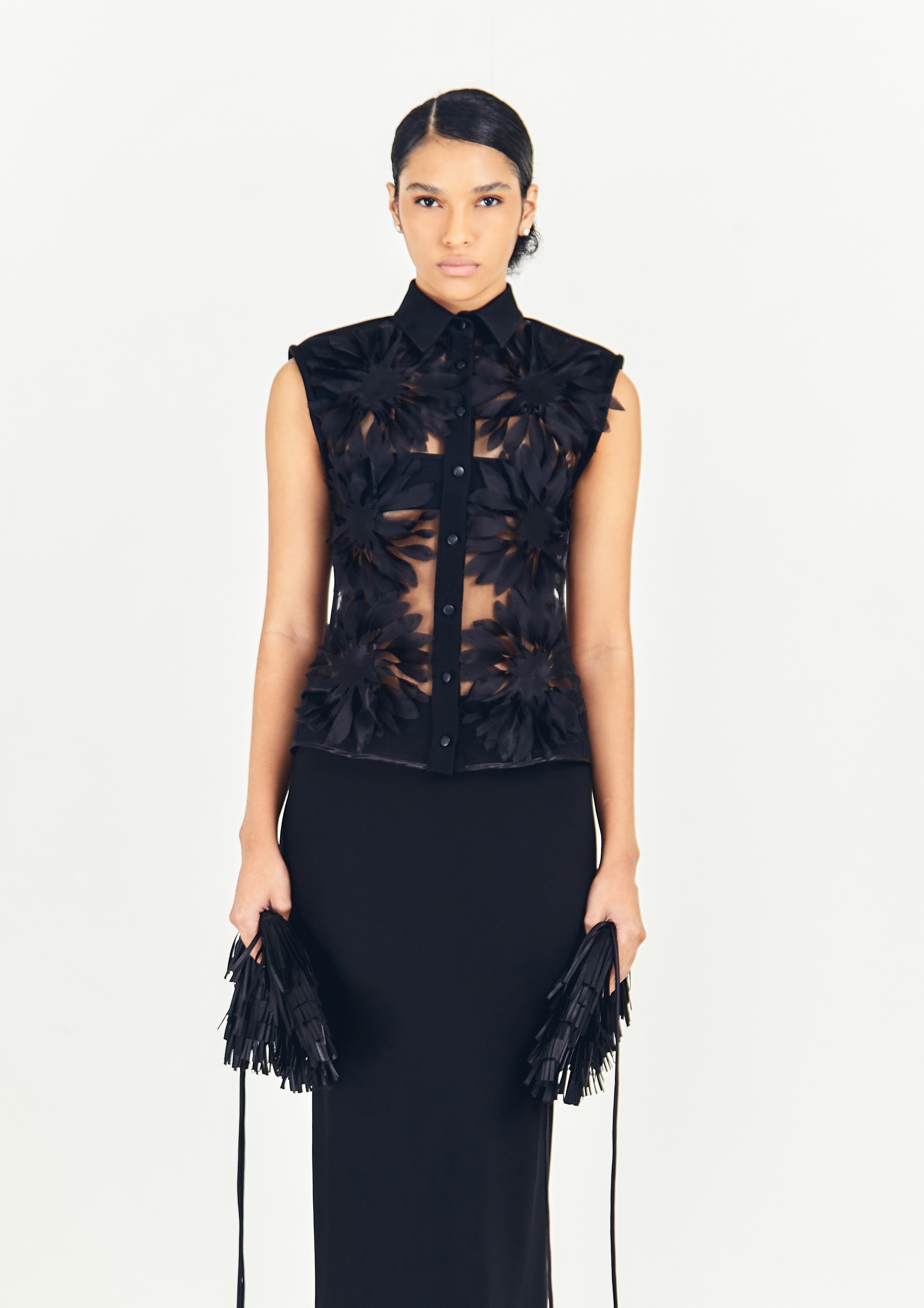 Camisa sem mangas de tule, com acabamentos em crepe e flores de gazar de seda bordadas.