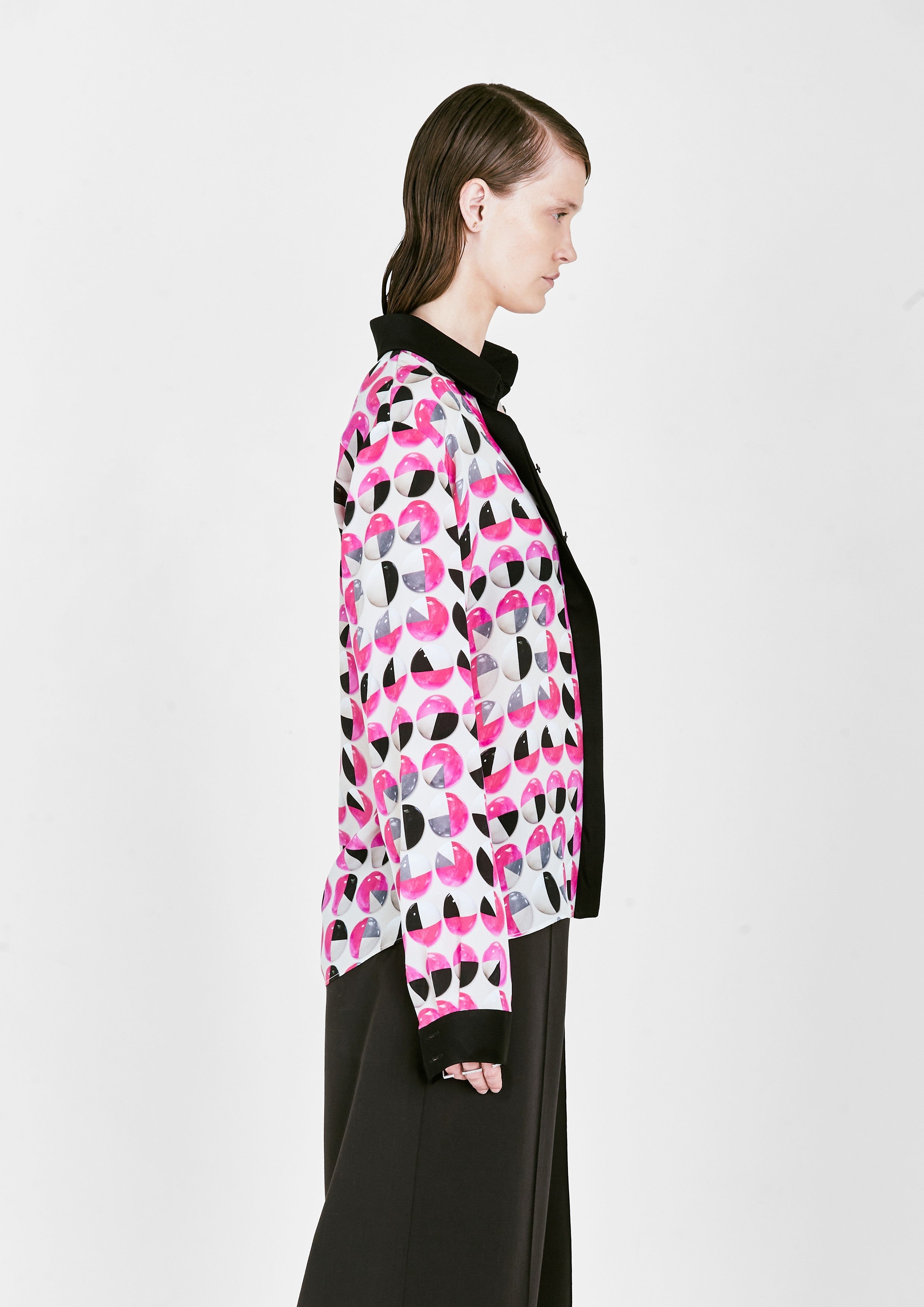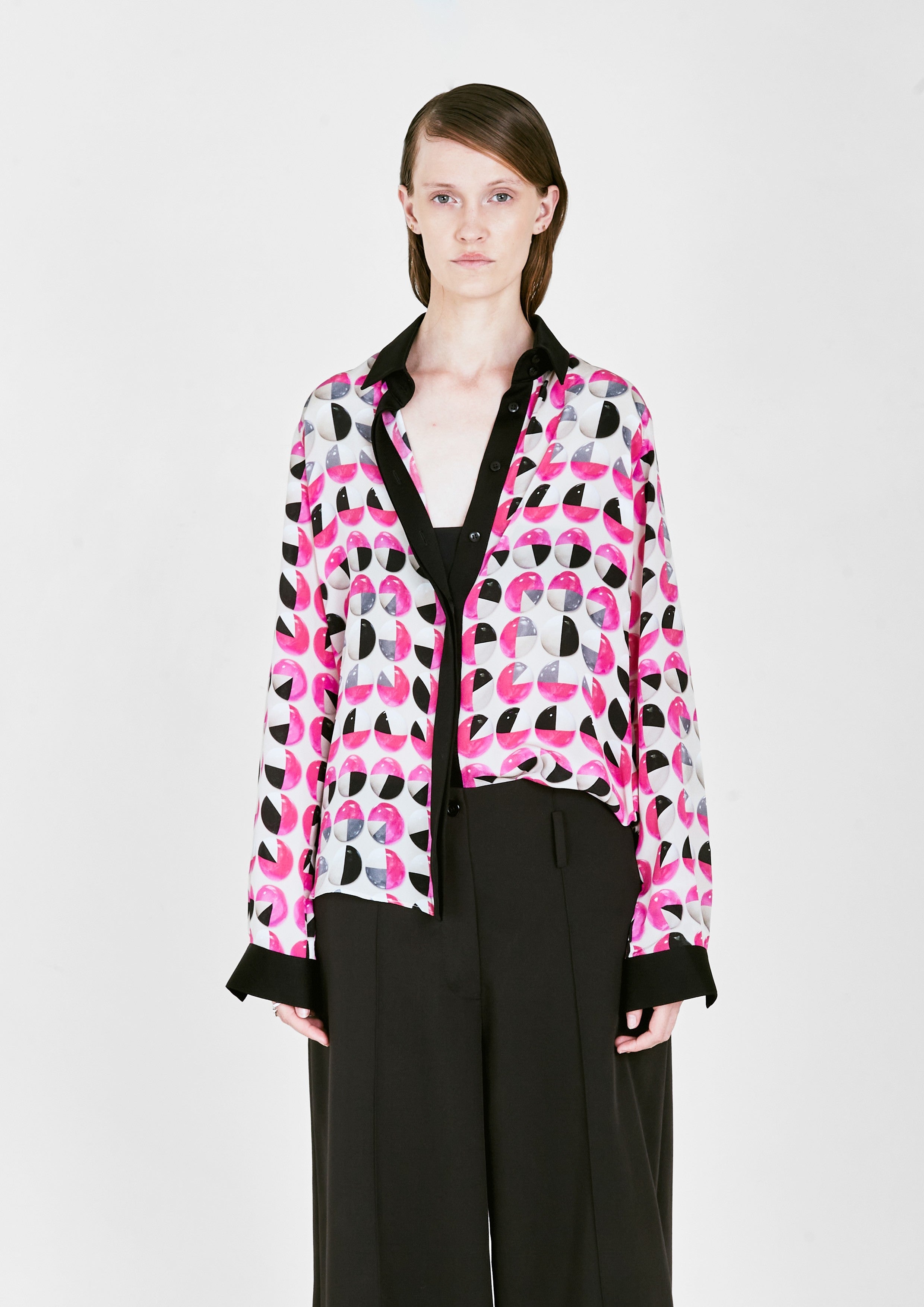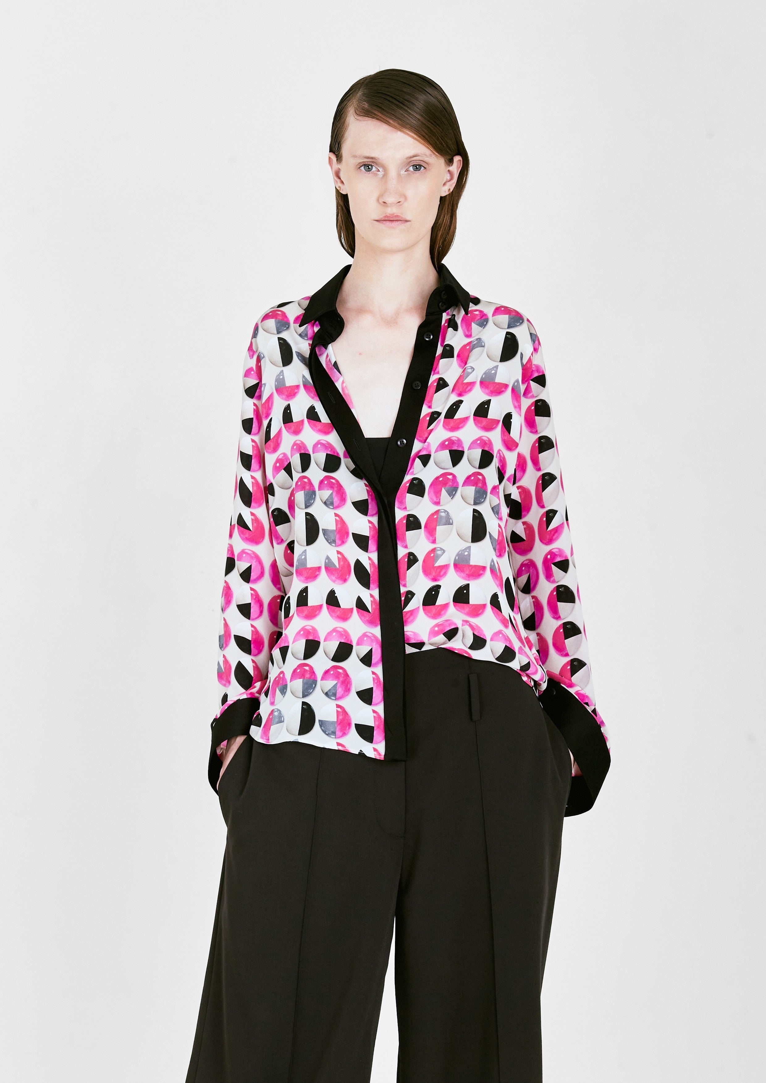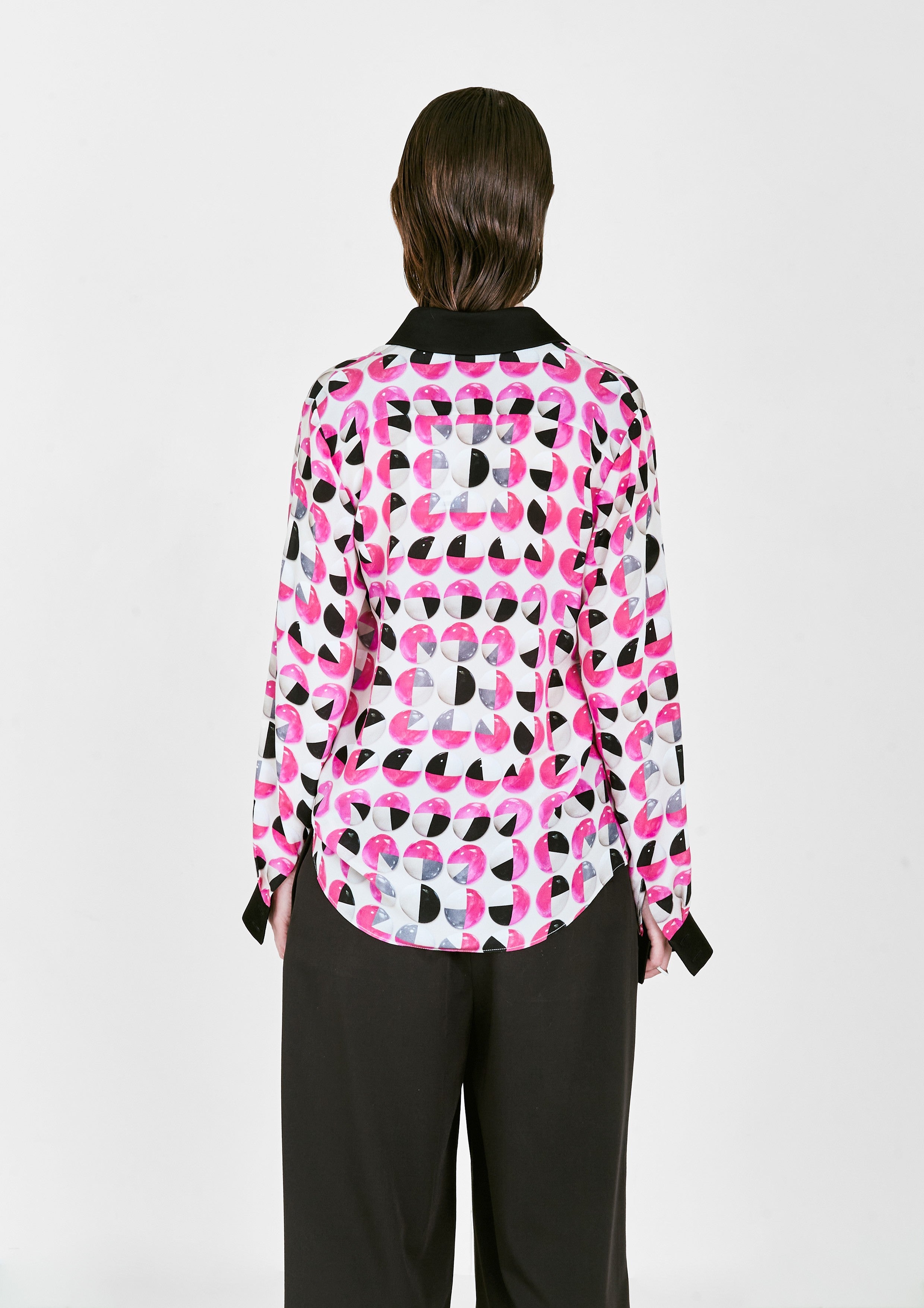 Camisa clássica de crepe de chine estampado, com punho, vista e gola de crepe preto.