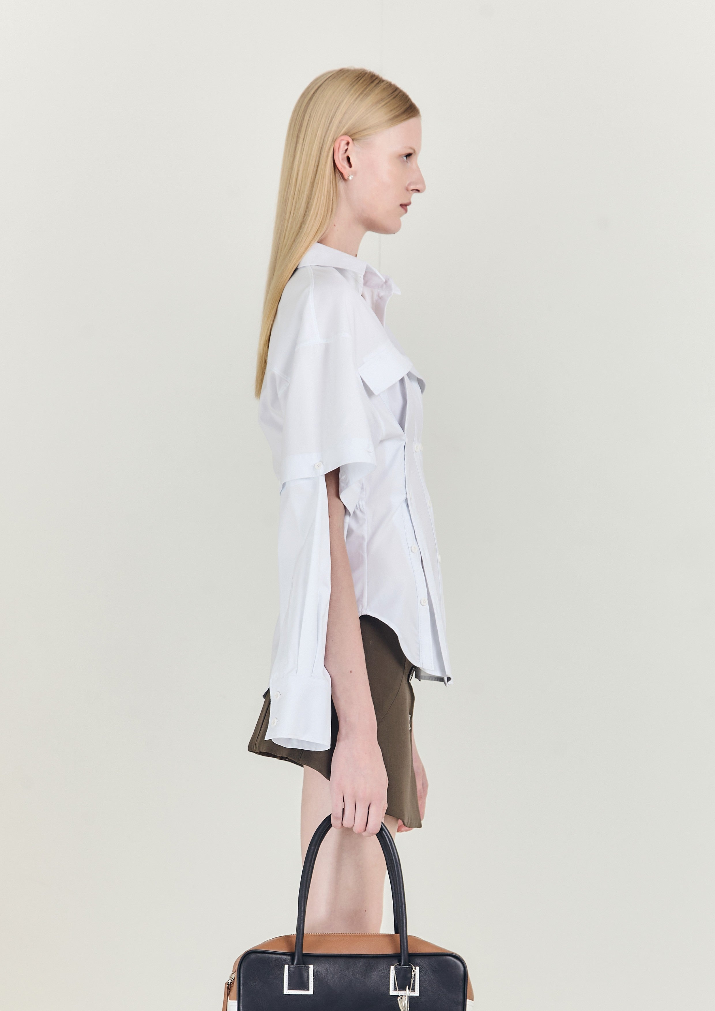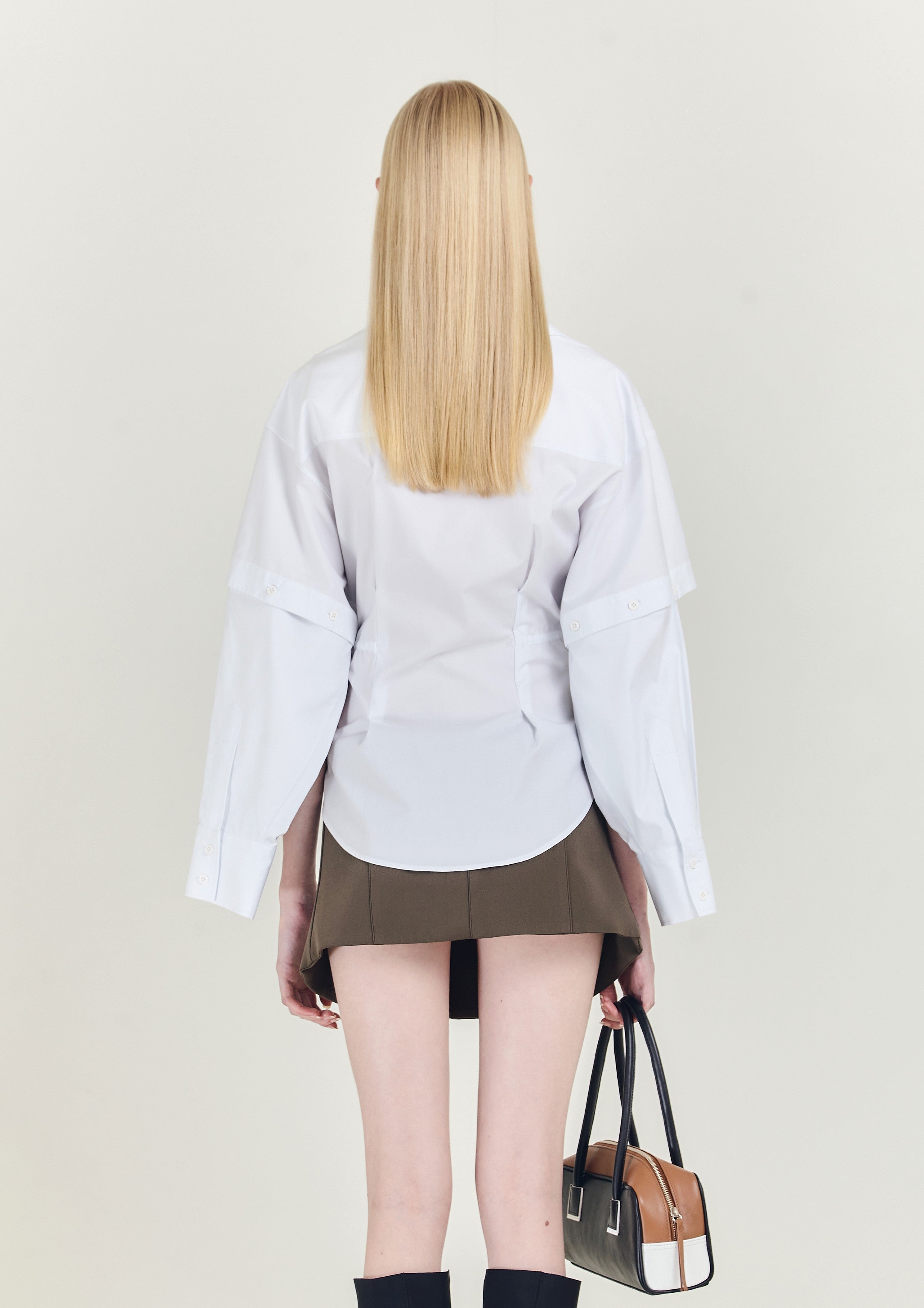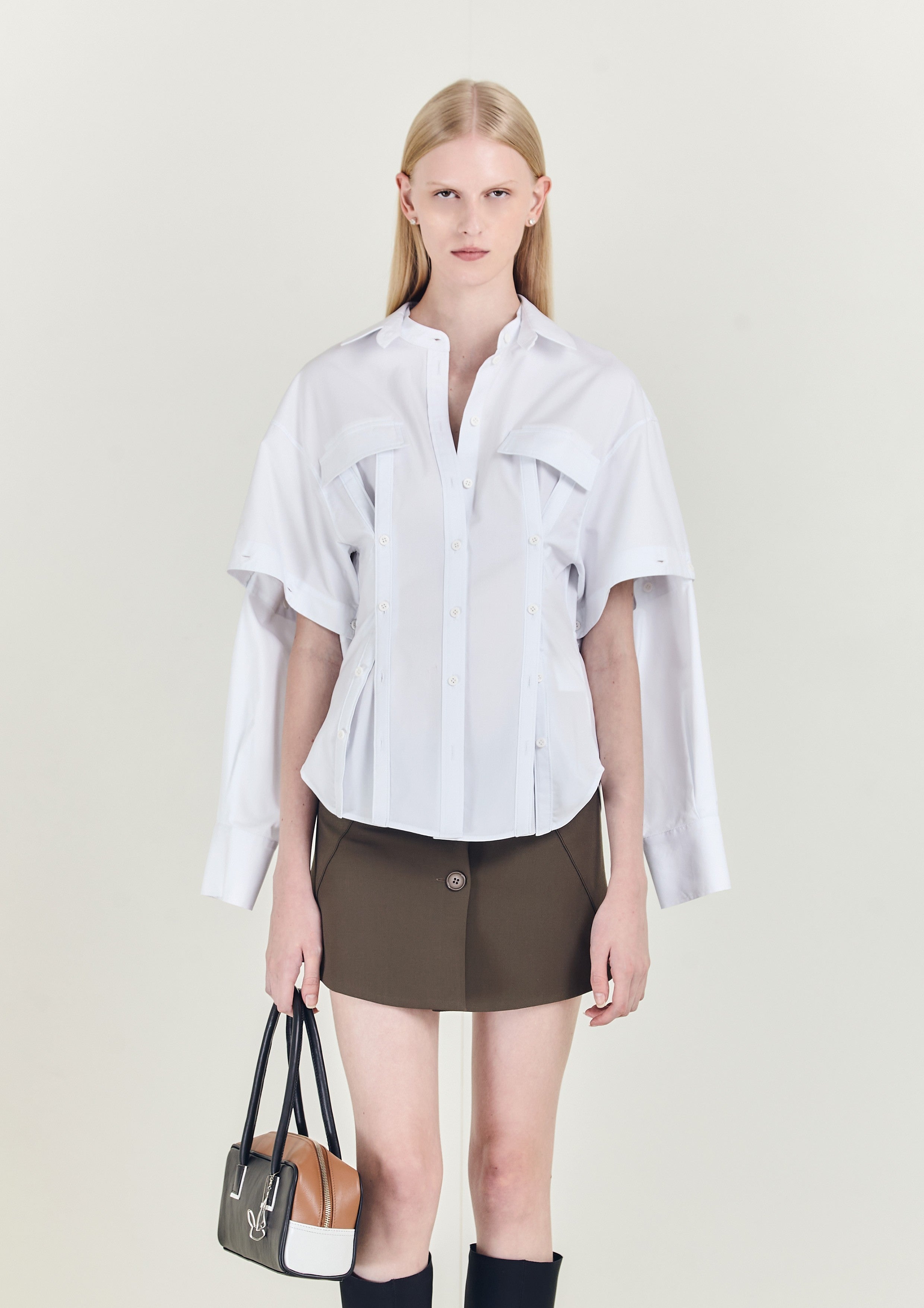 Camisa ampla com efeito corselet em algodão, com mangas destacáveis e elástico nas costas. Todo o abotoamento é feito com botões de massa.
