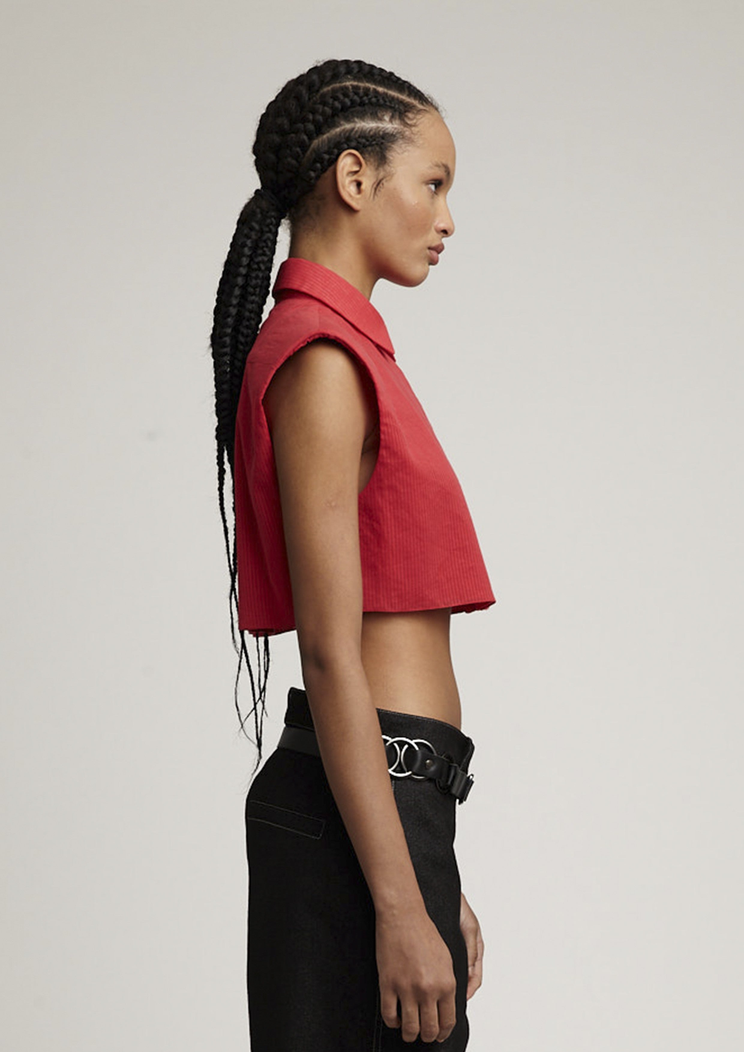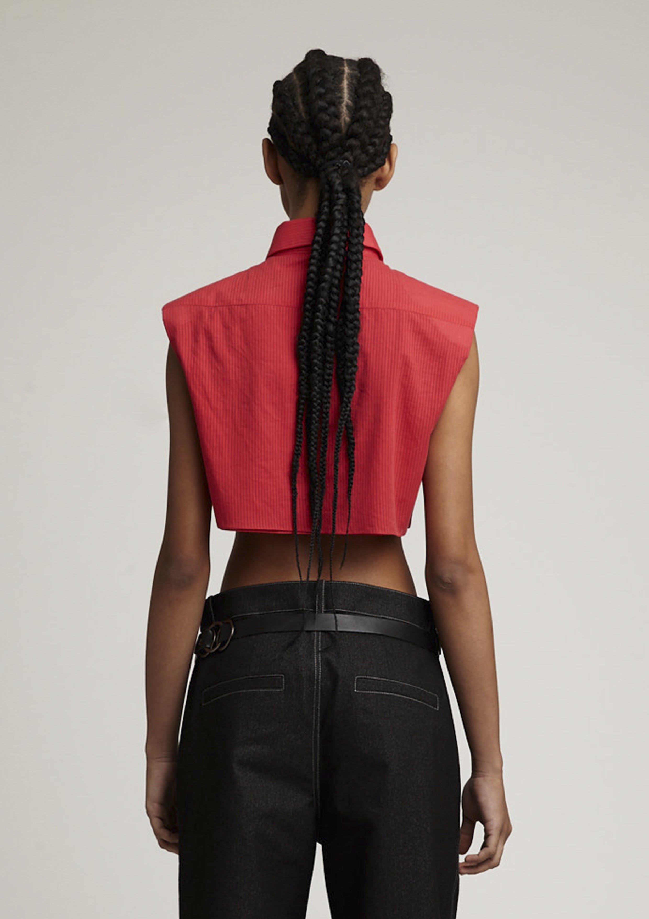 Camisa cropped sem manga com ombreira e gola com fechamento em botões em todo o busto.