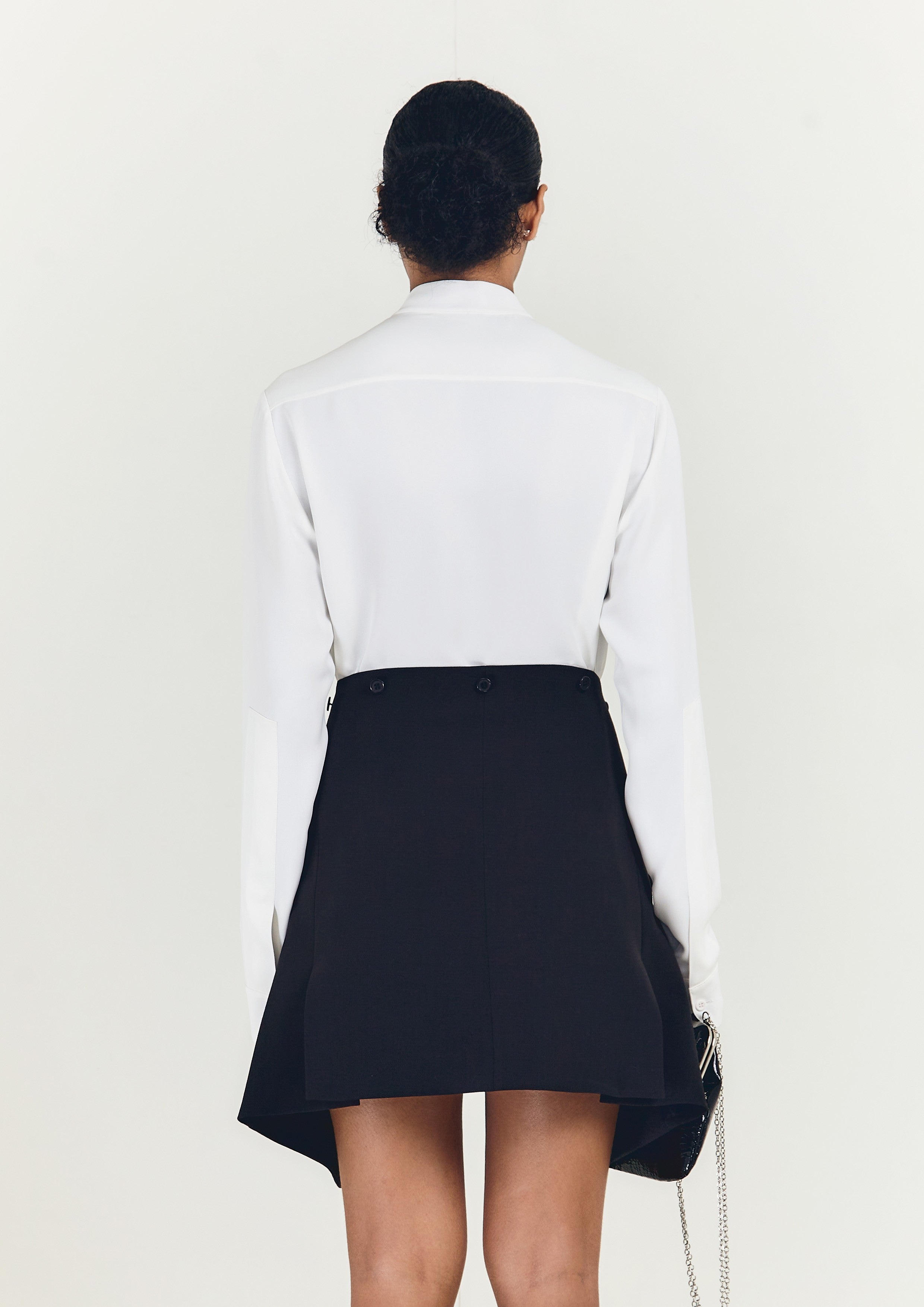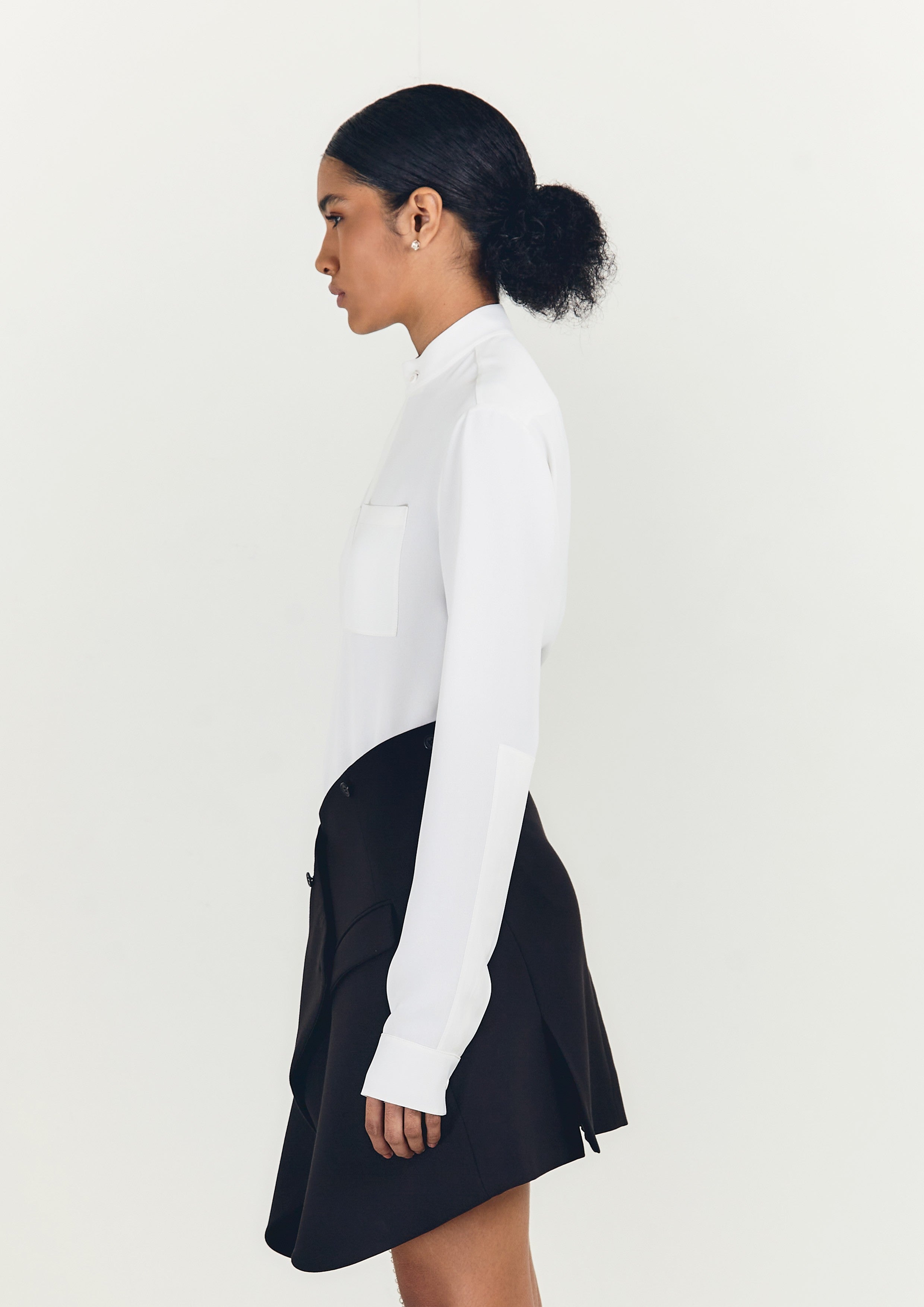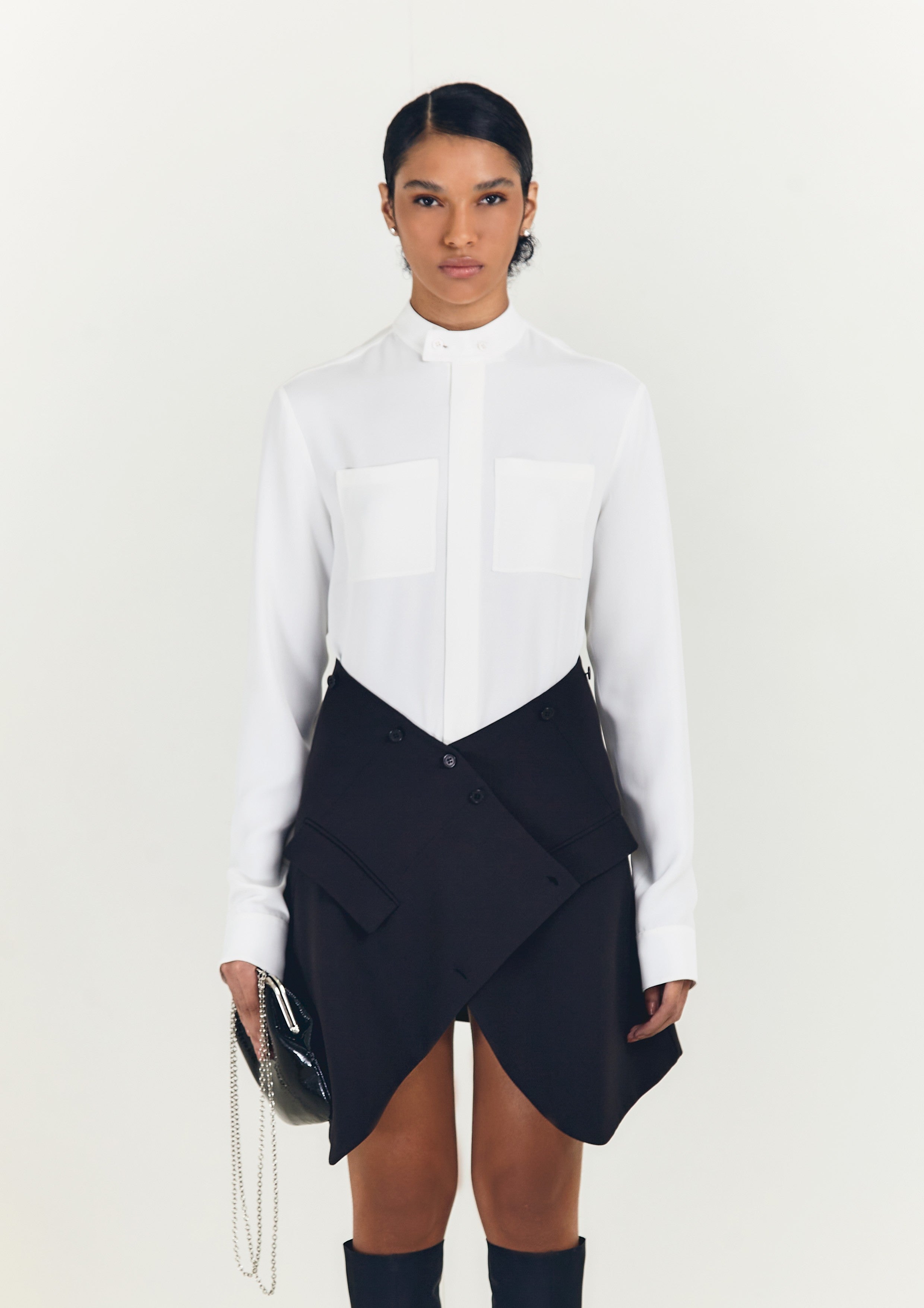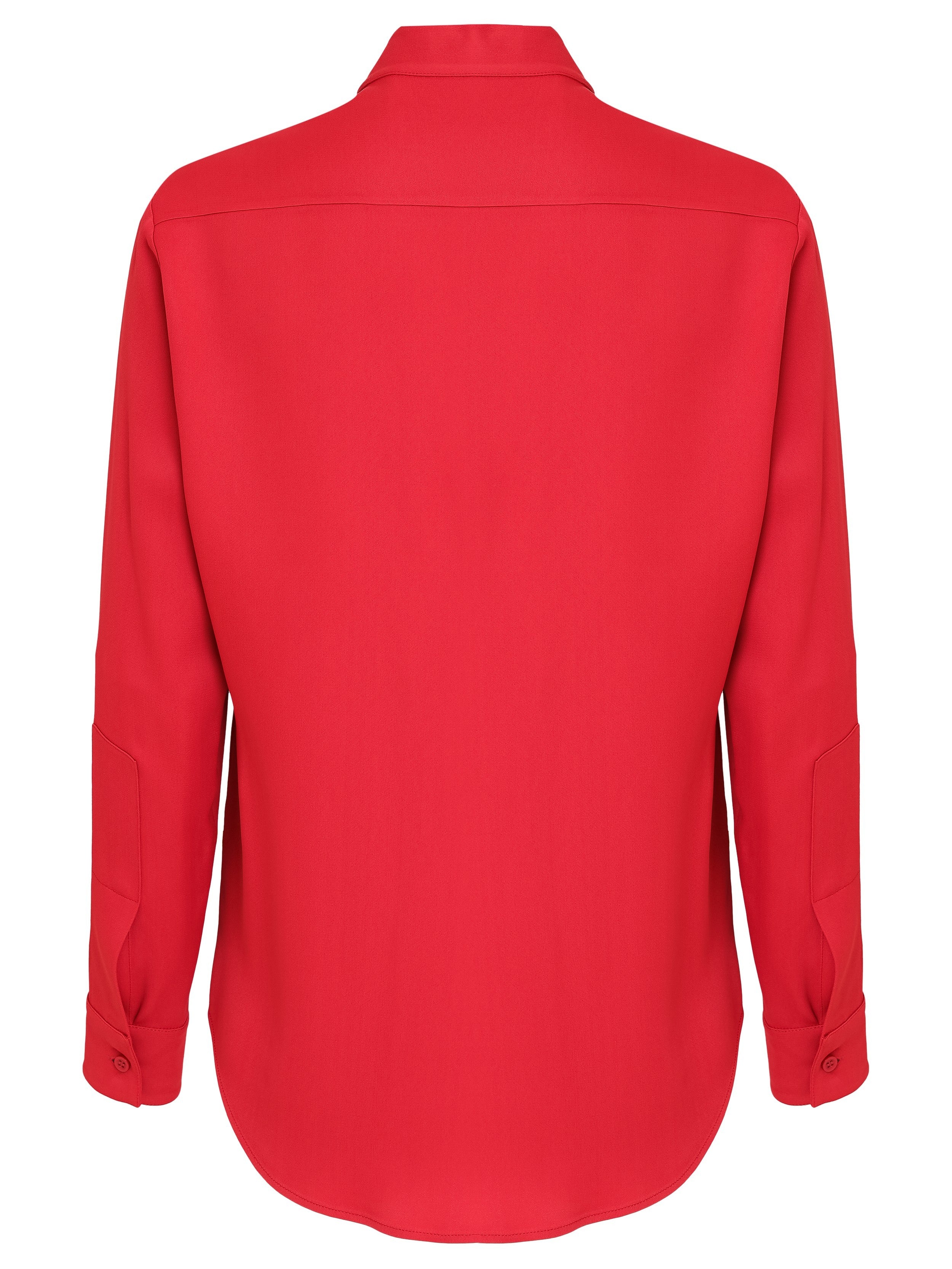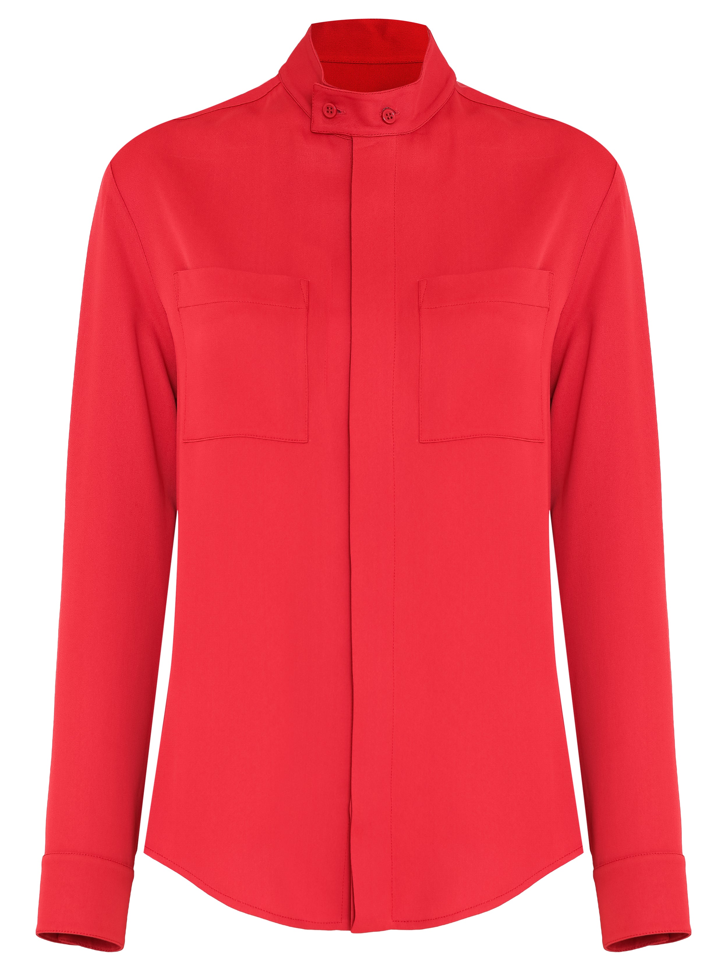 Camisa de crepe, com transpasse na gola e bolsos frontais.