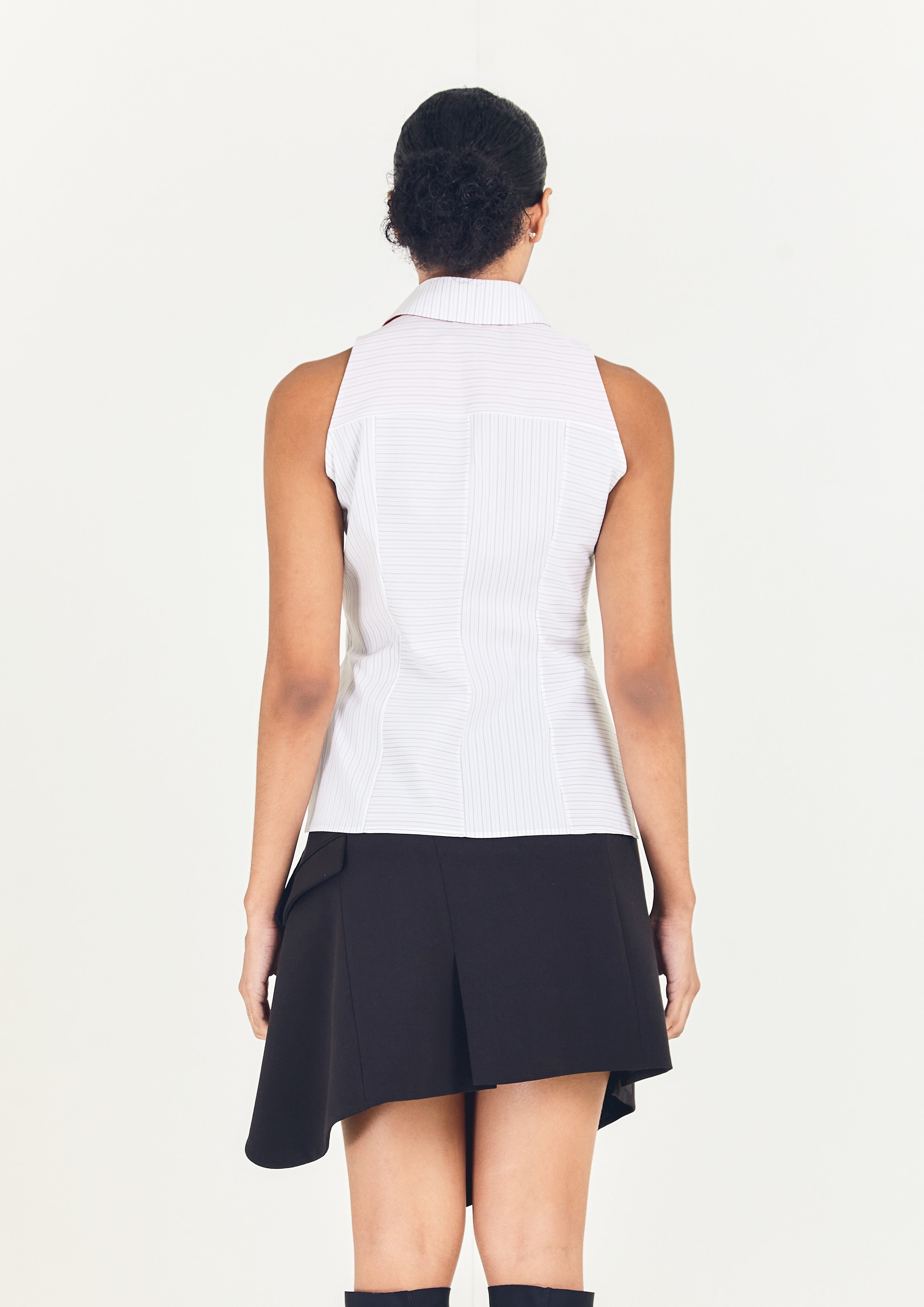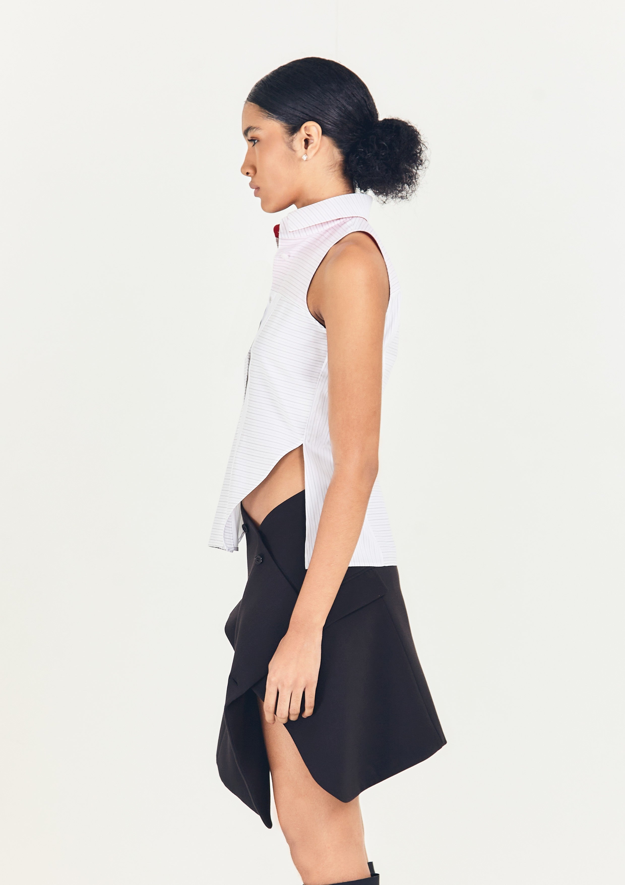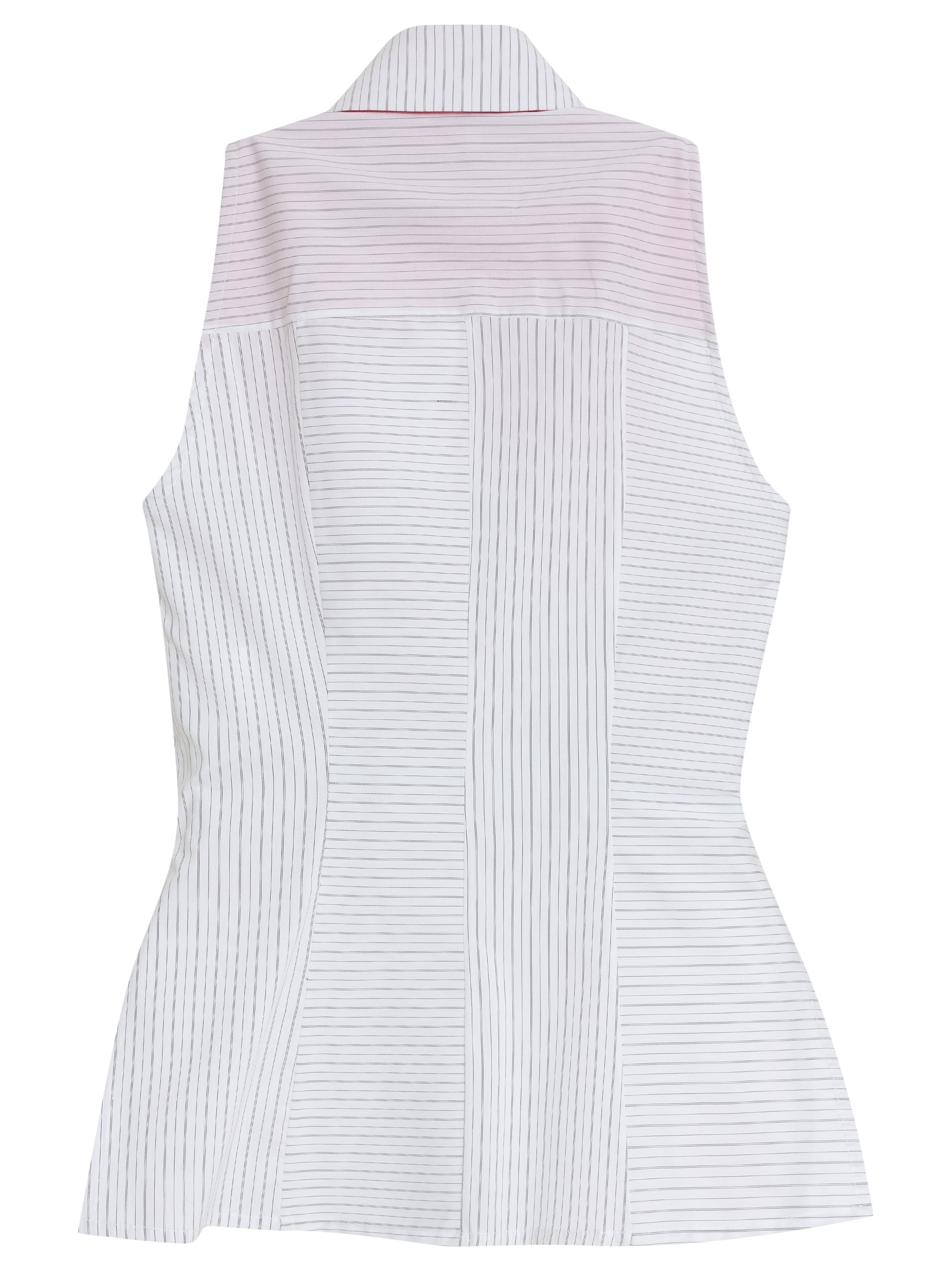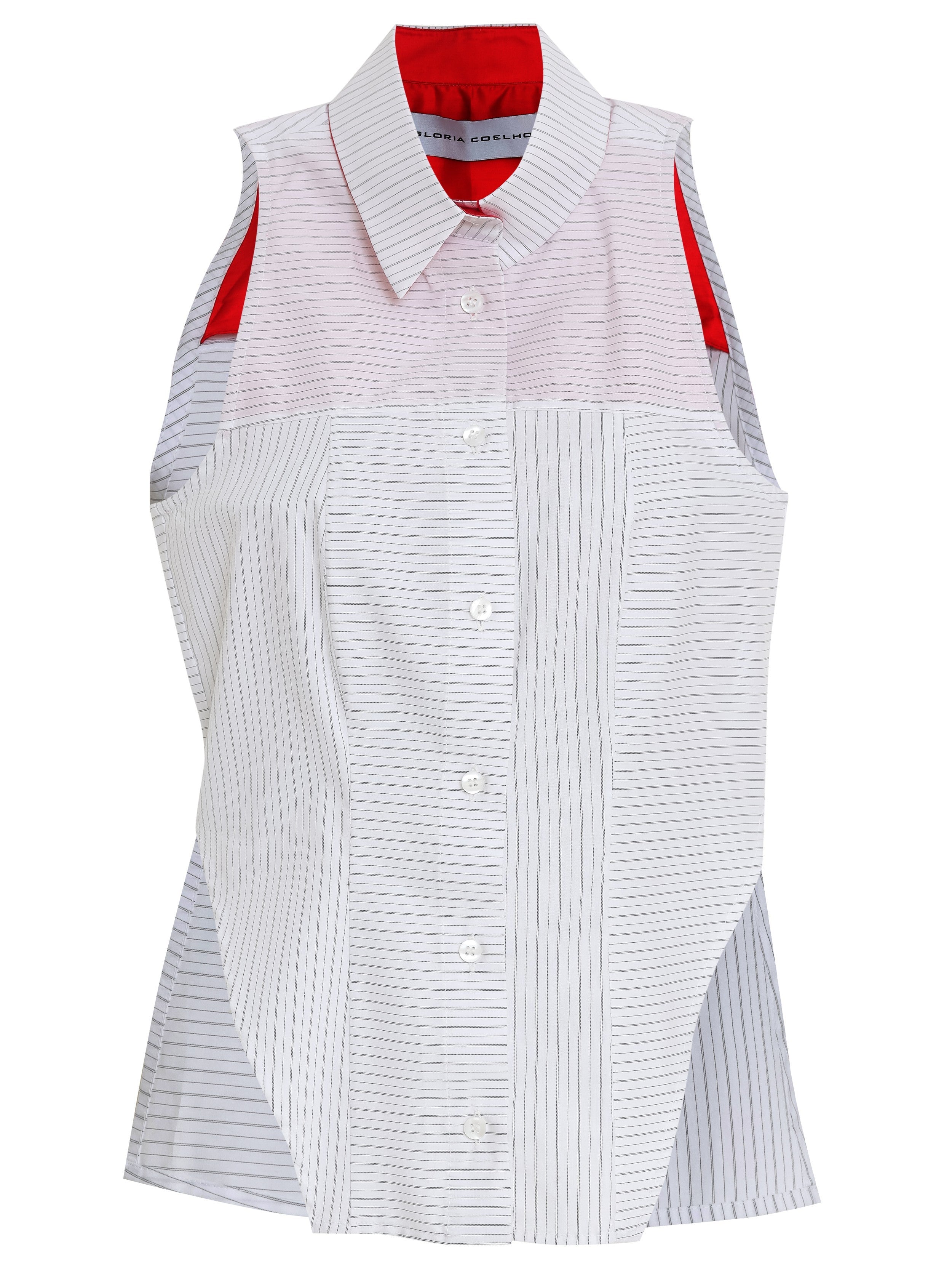 Camisa slim em algodão listrado, com abertura na lateral e detalhes em algodão vermelho na parte interna da pala e verso da gola.