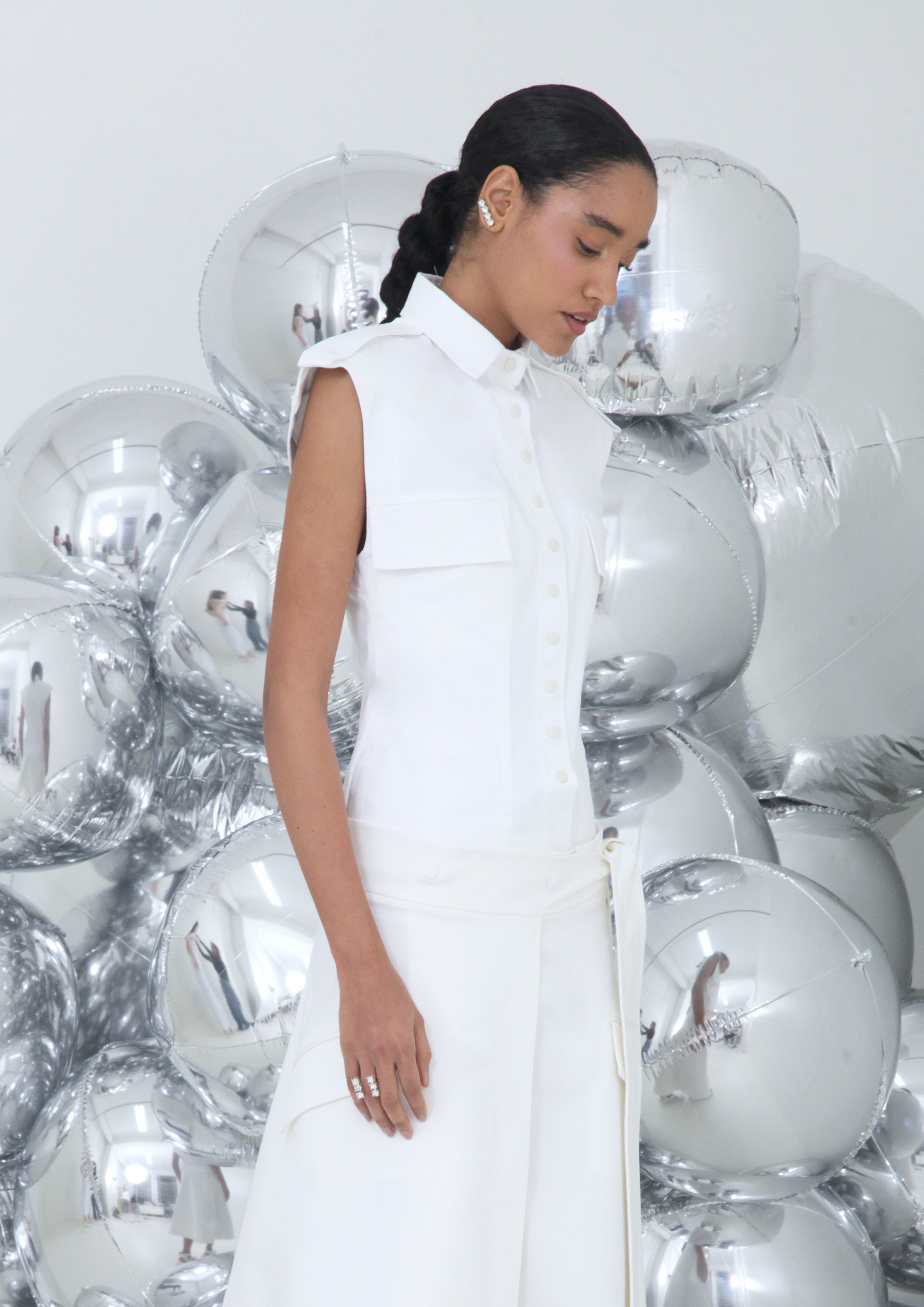 Camisa Safari Sem Manga apresenta gola clássica e bolsos frontais, reinterpretando o ícone do estilo safari em versão clean e contemporânea.
