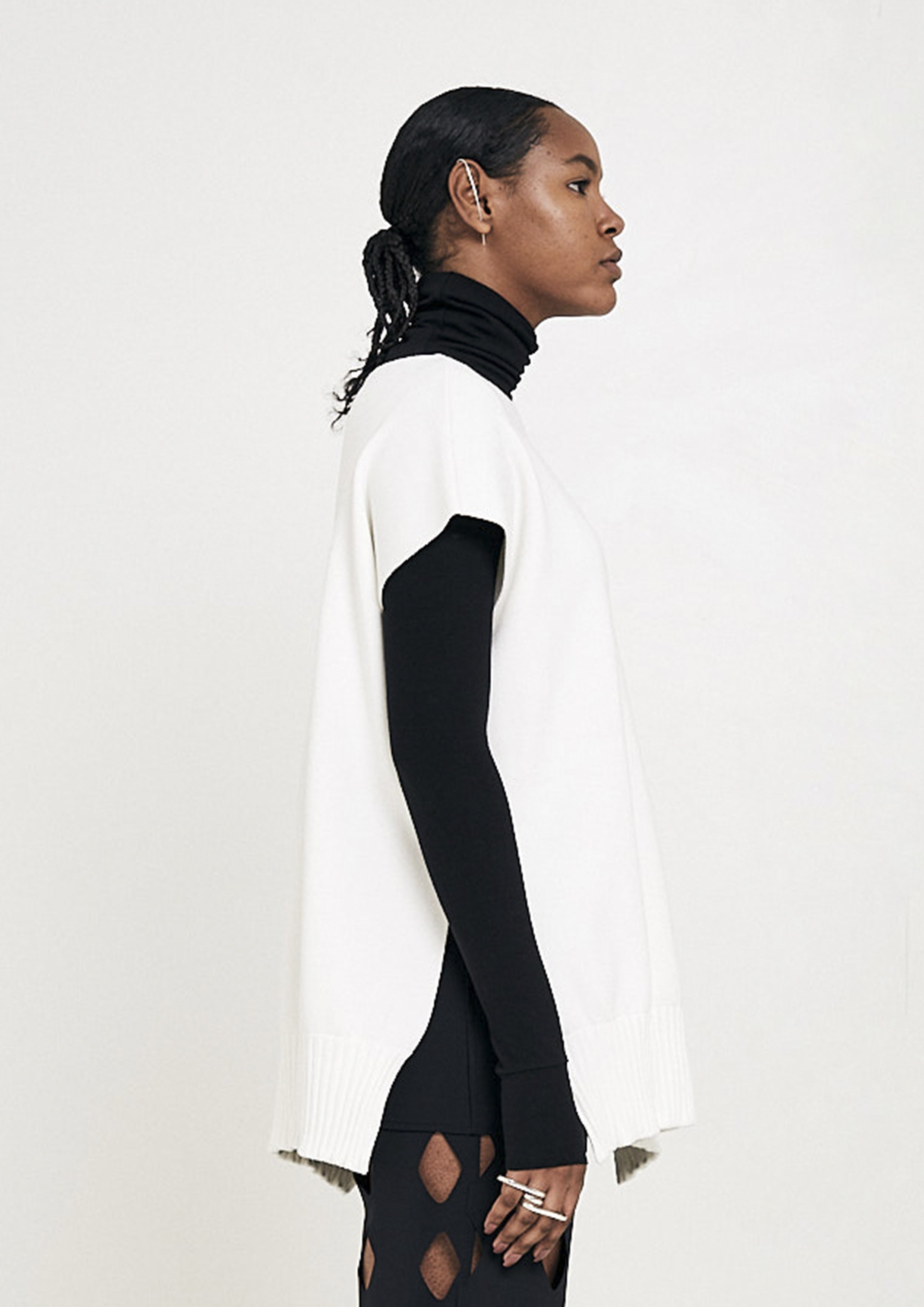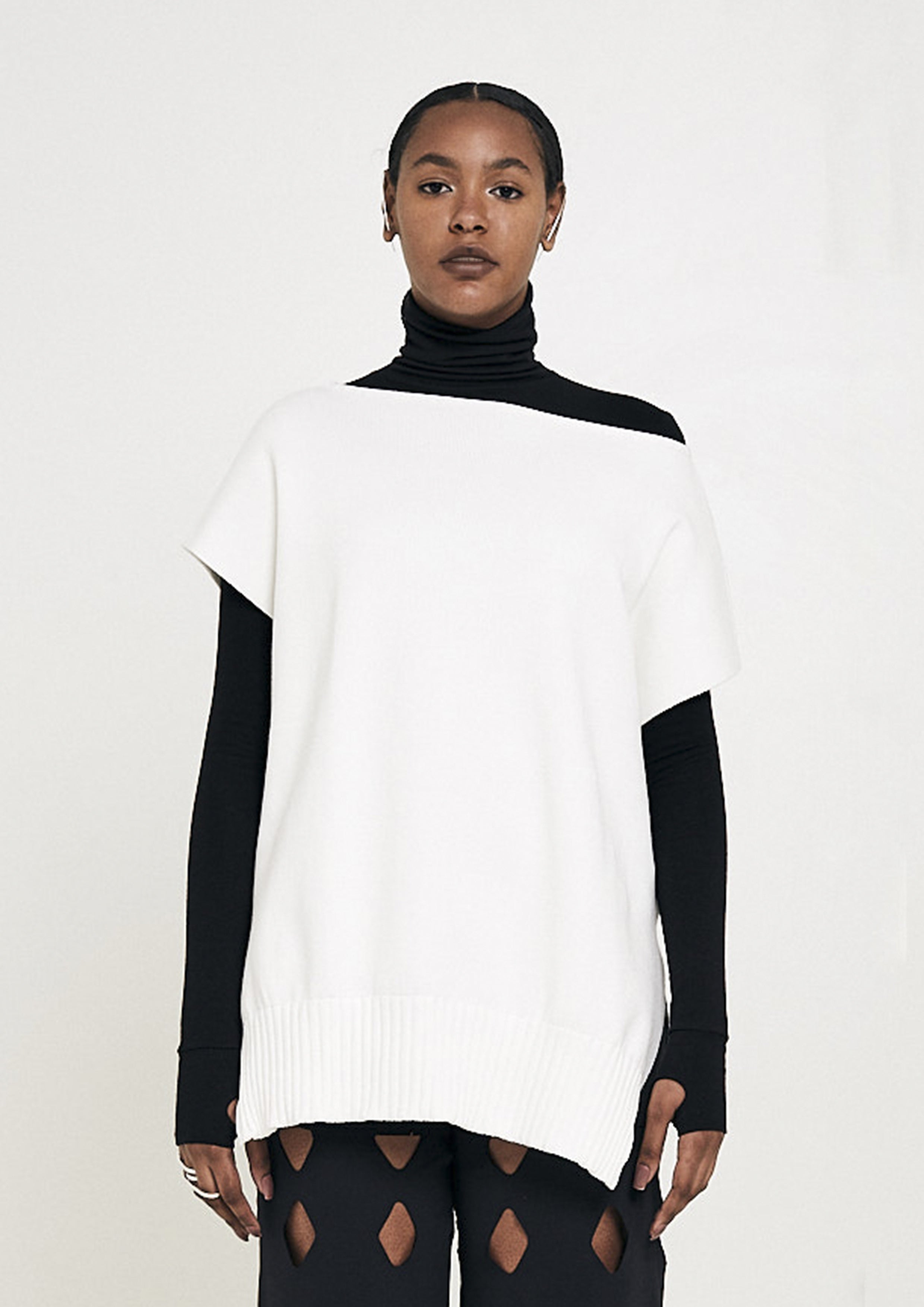Colete de tricot sem mangas com decote ombro a ombro assimétrico e fendas nas laterais.
