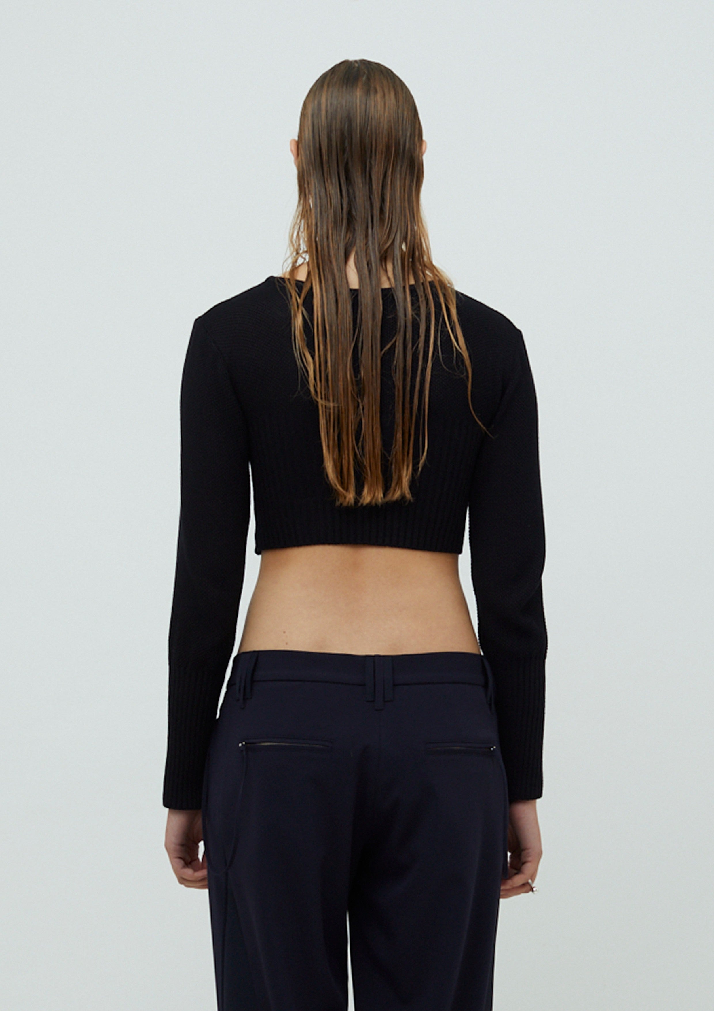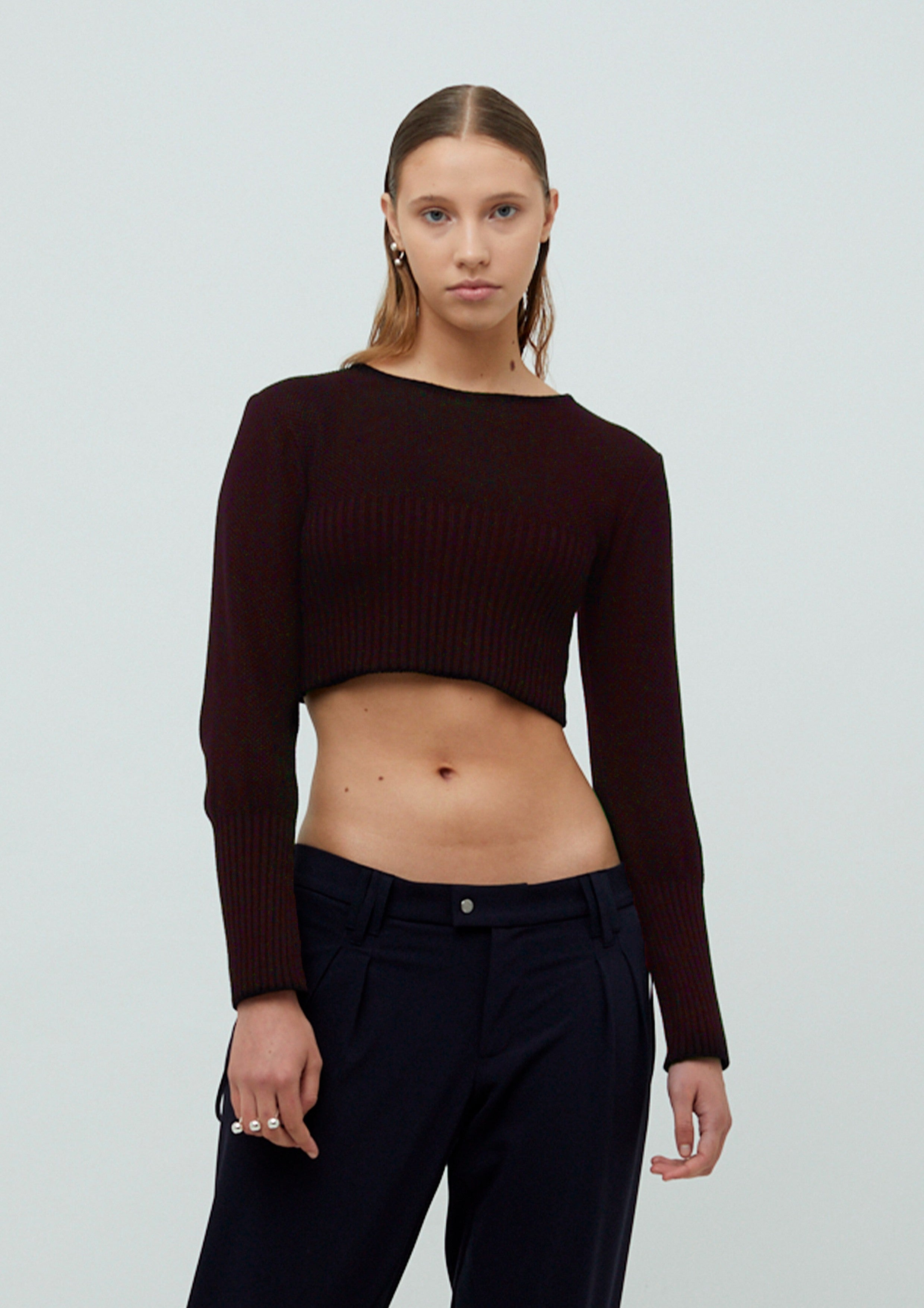 Tricot com comprimento cropped e mangas longas. Possui detalhe canelado na barra e nos punhos.