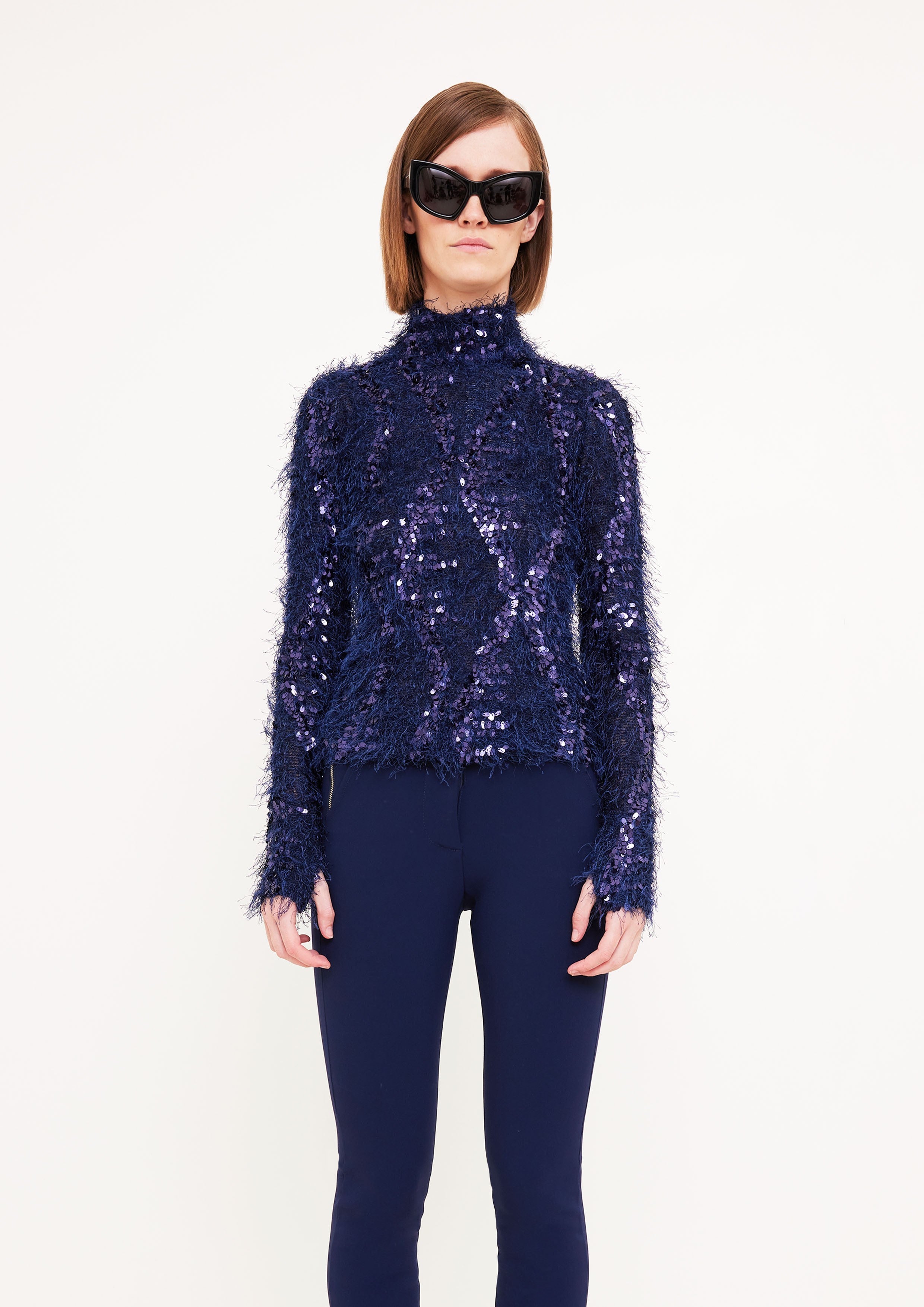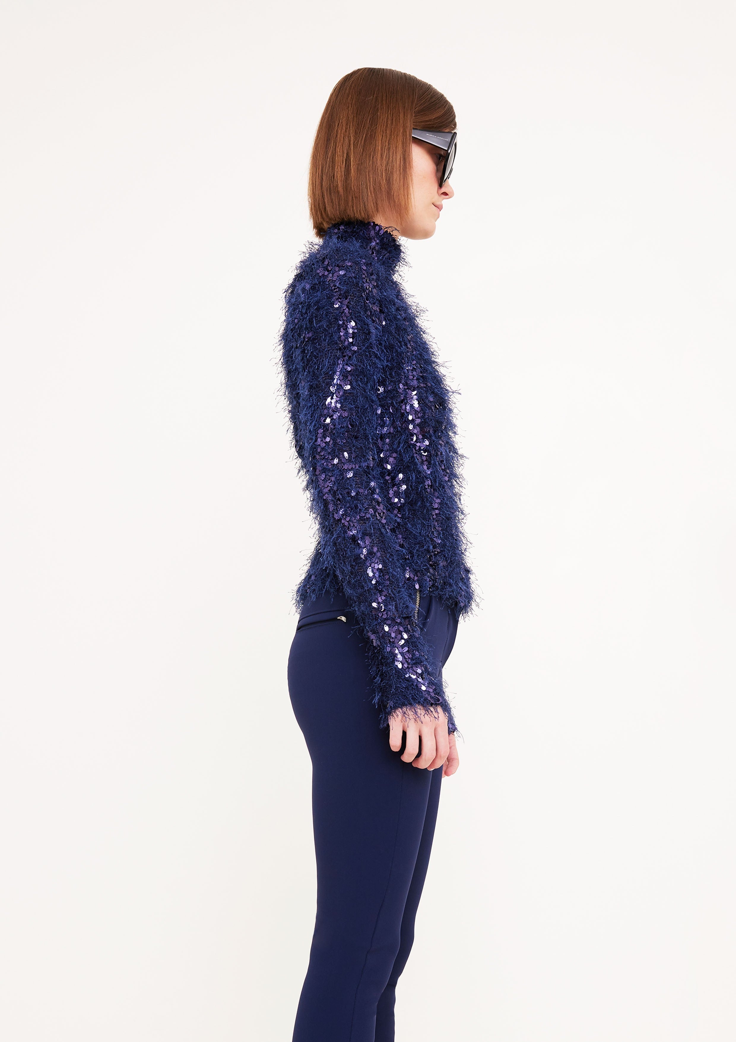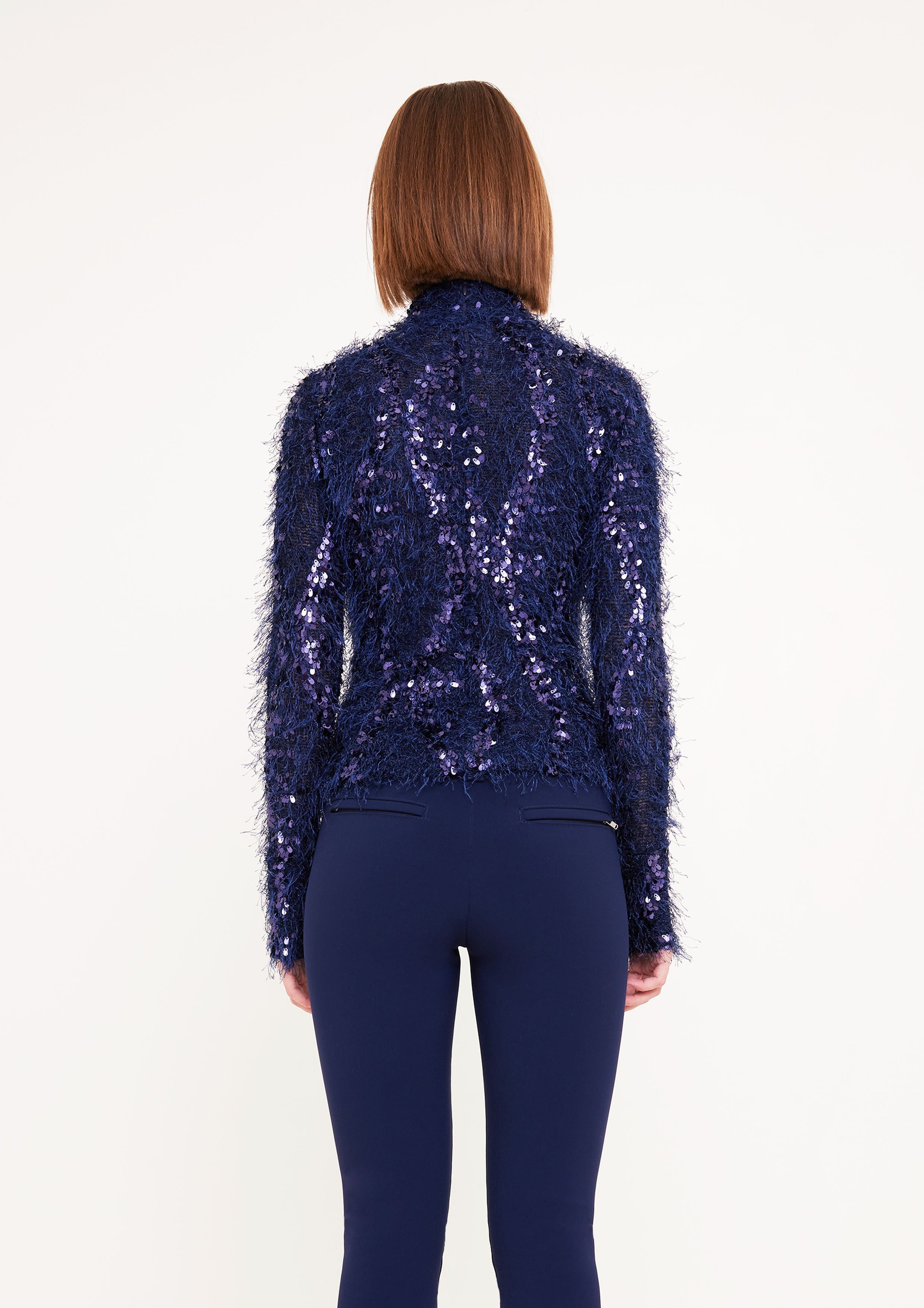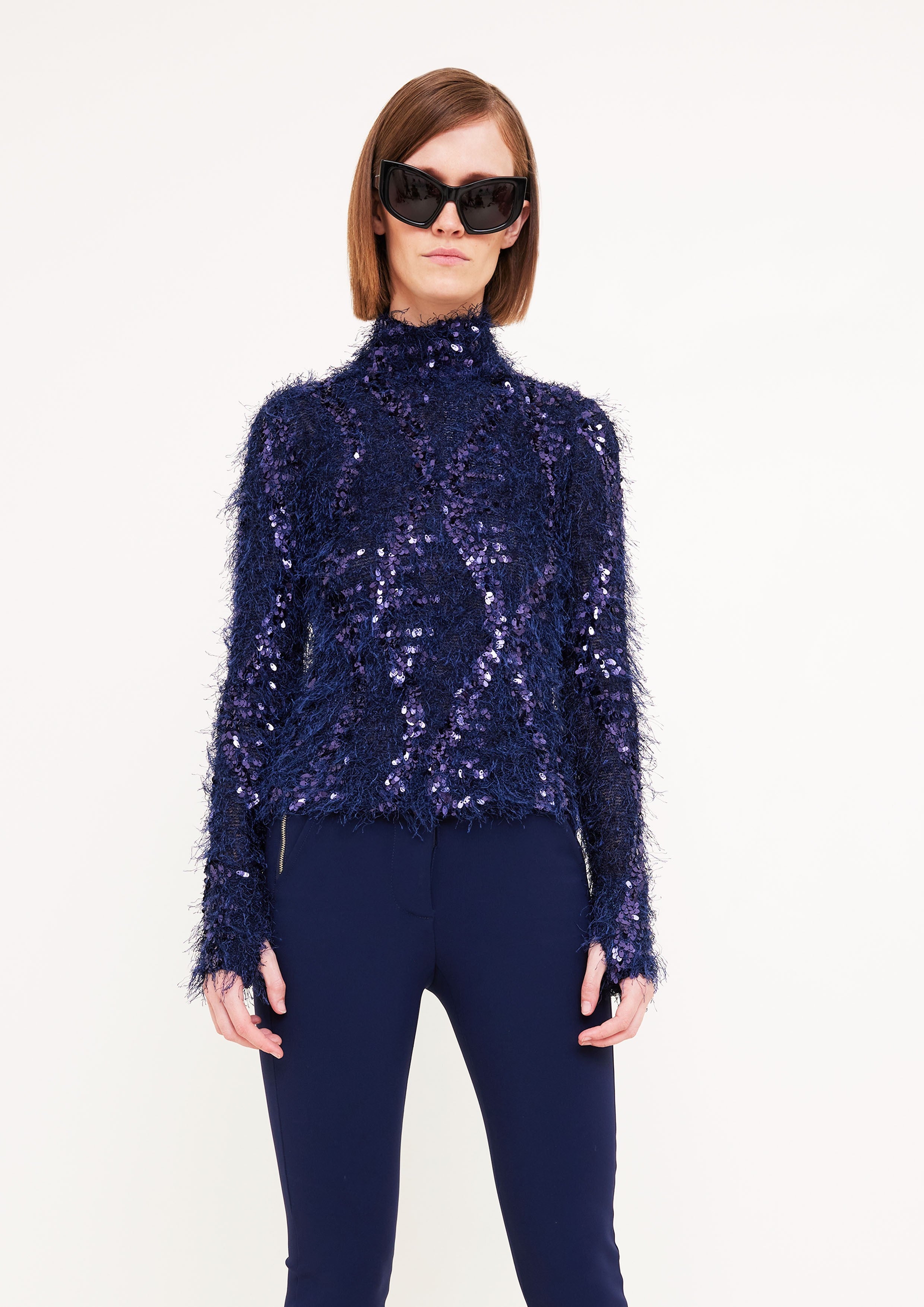 Tricot de paetê com pelos, gola rolê e mangas compridas com abertura no punho para o polegar.