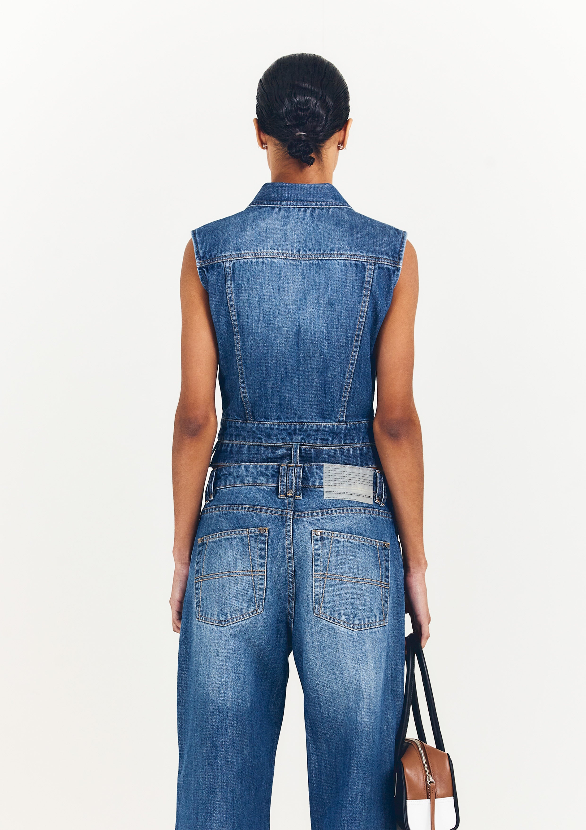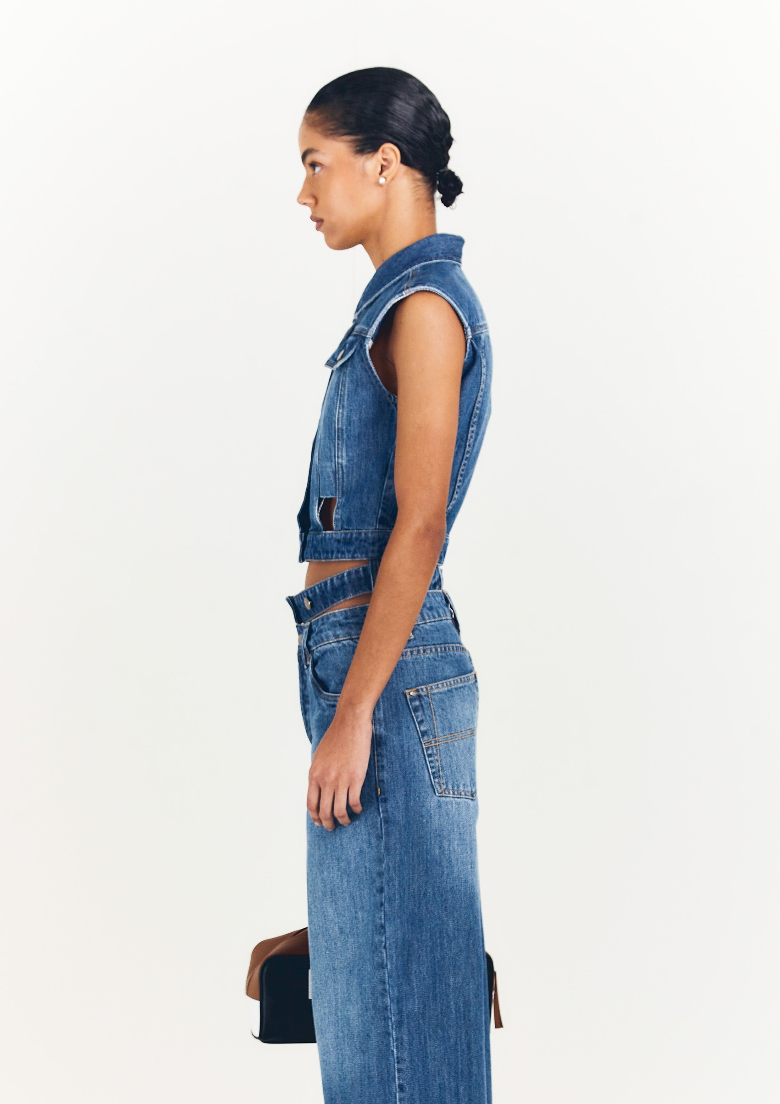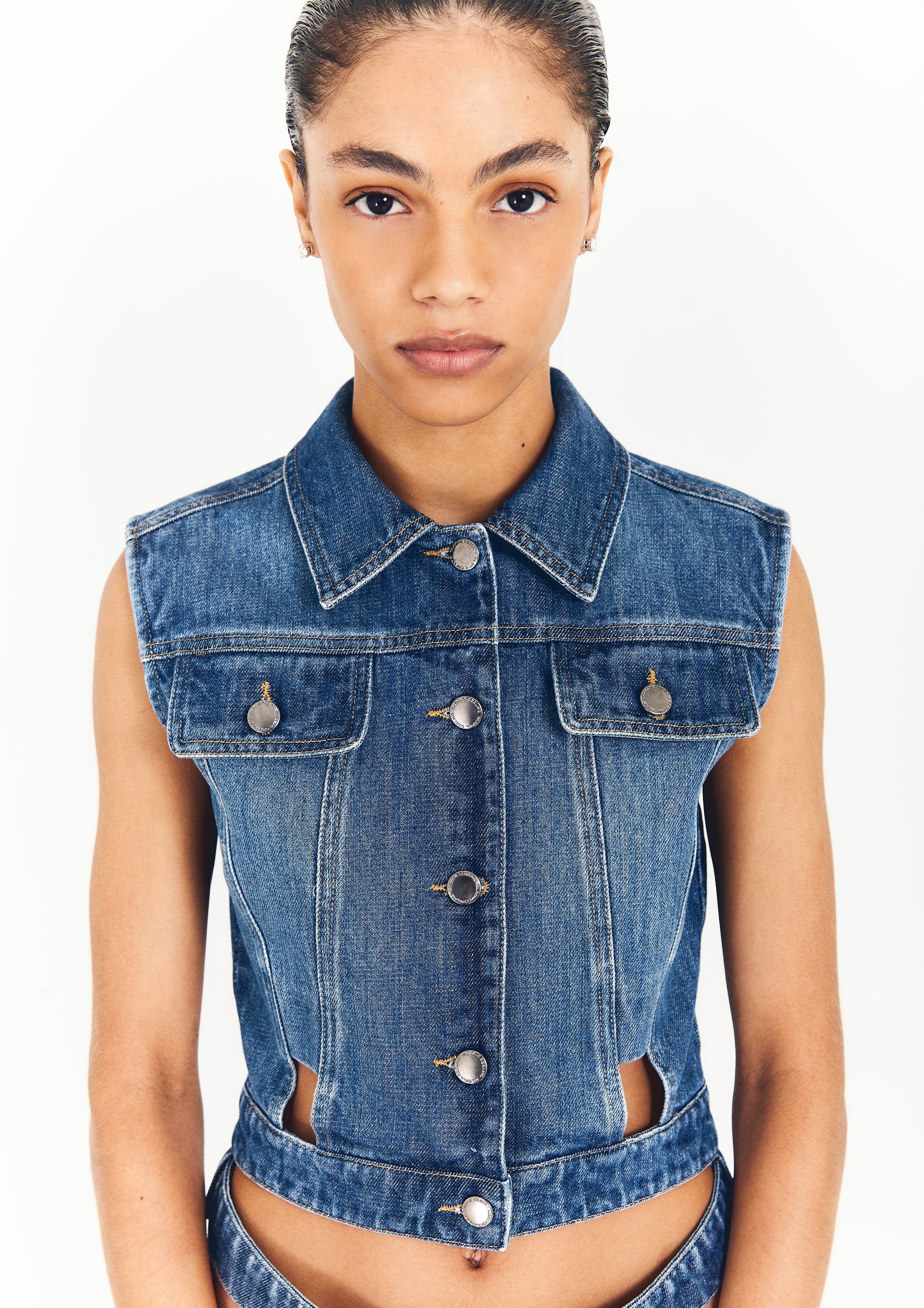 Jaqueta jeans, sem mangas, com vazados na frente e cinto removível.