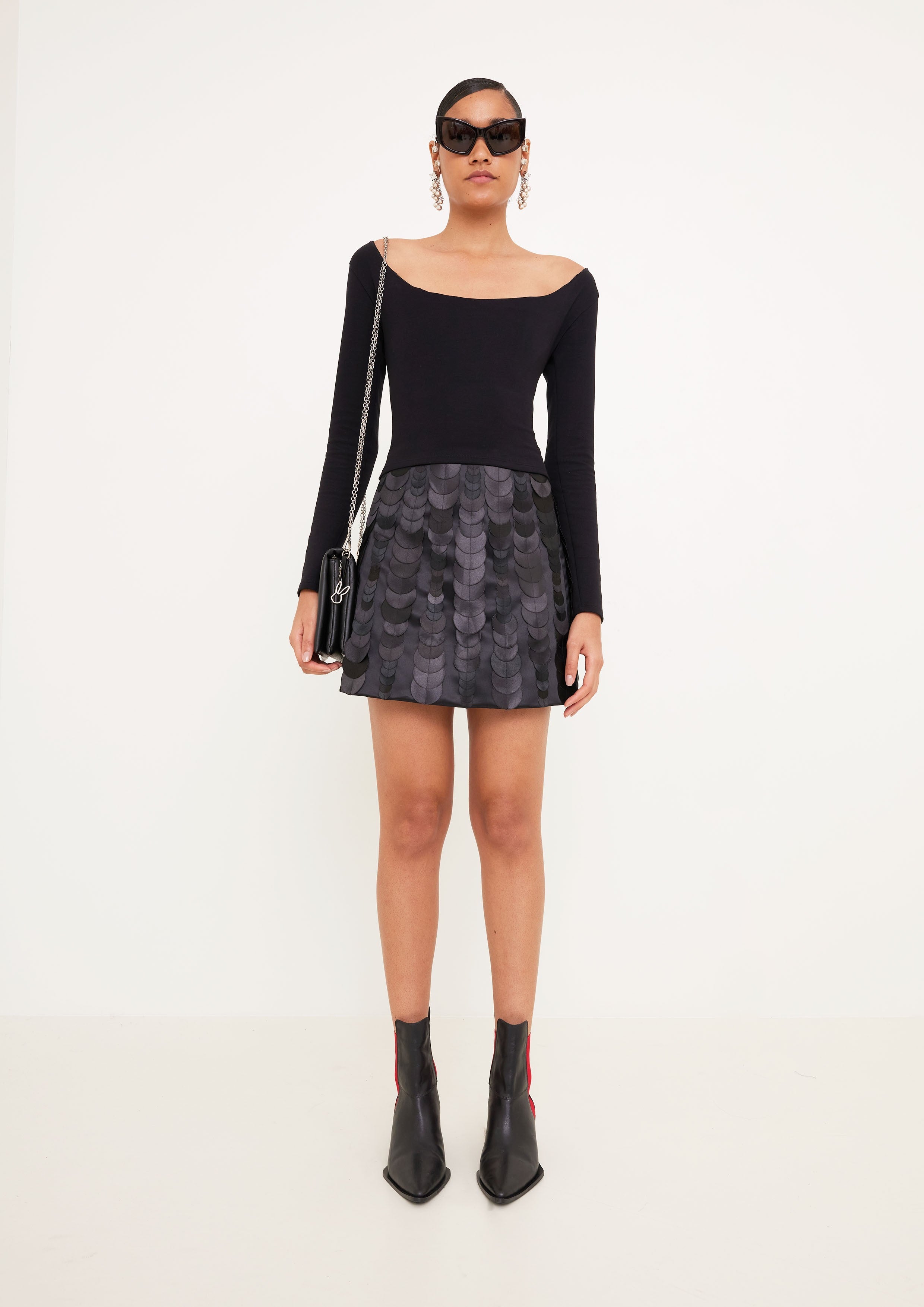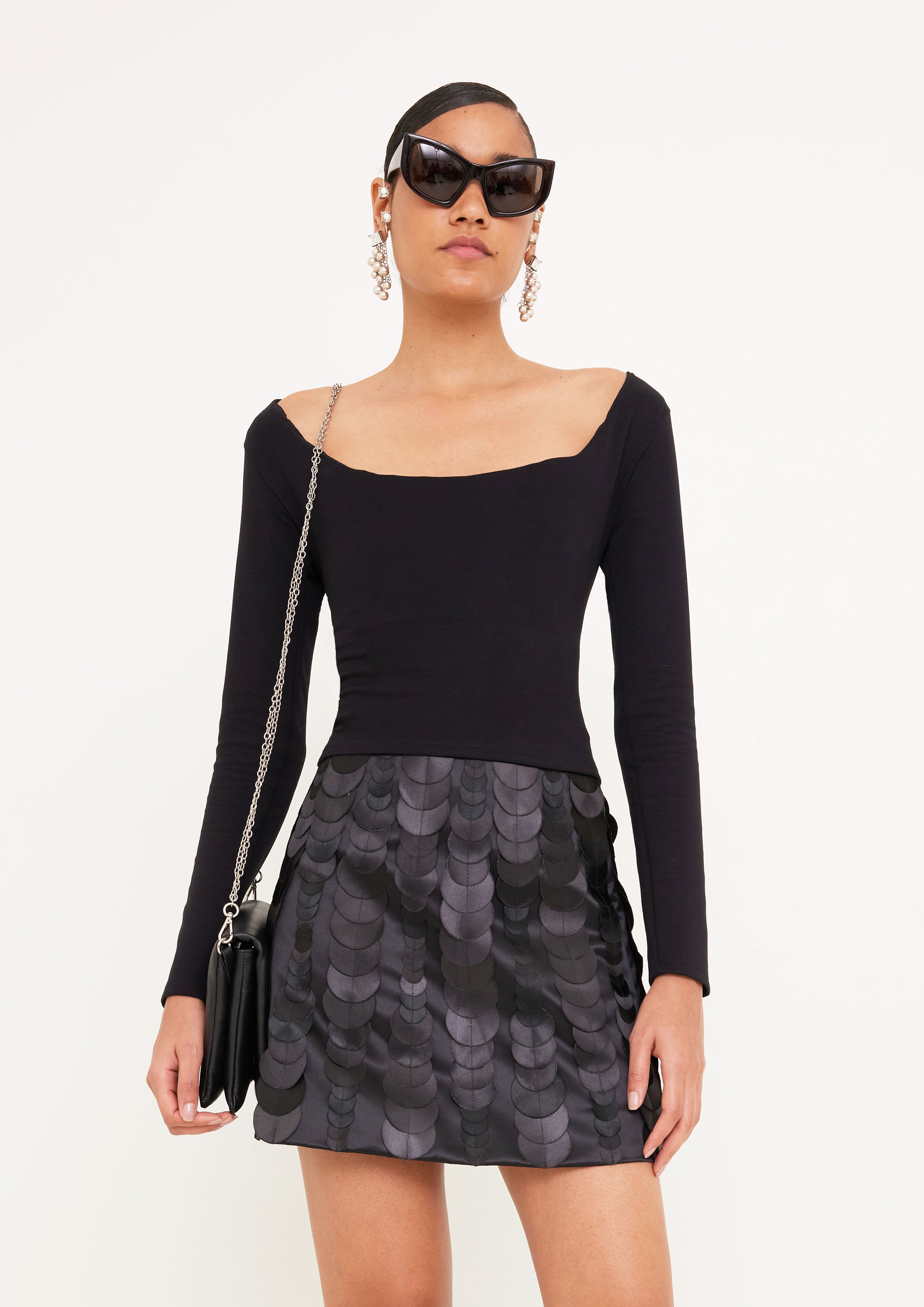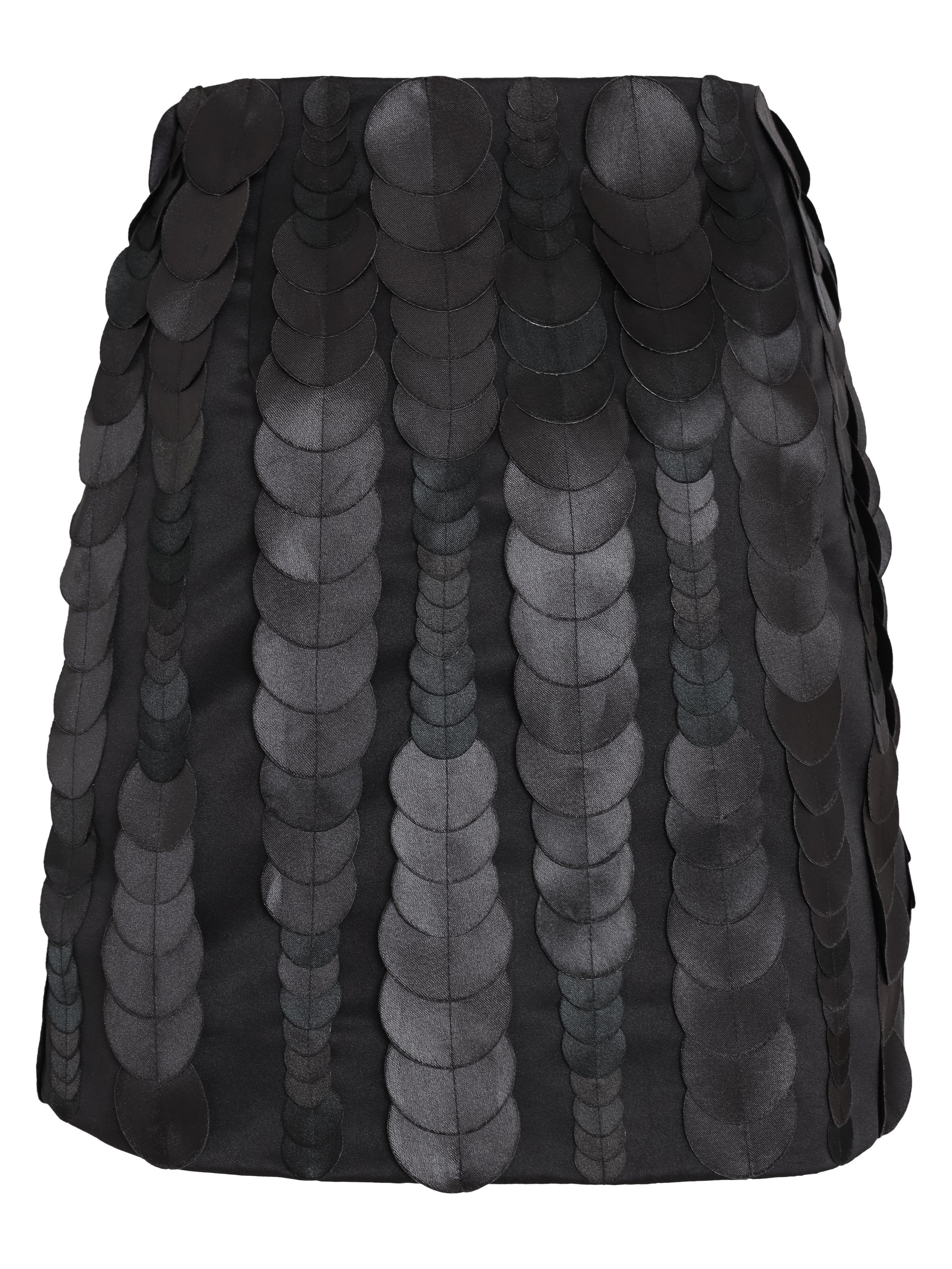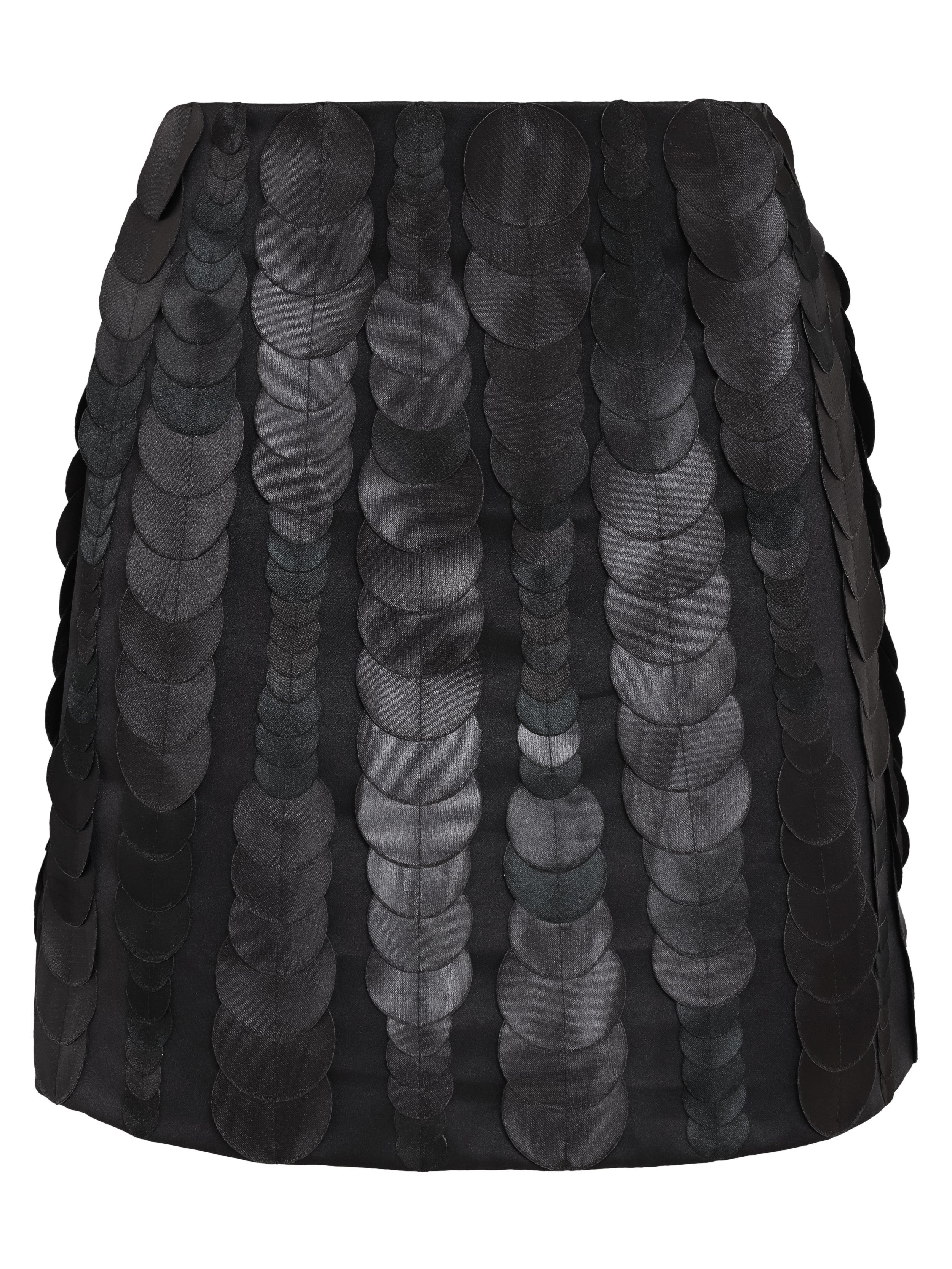 Saia evasê de comprimento mini com aplicações circulares por toda a peça.