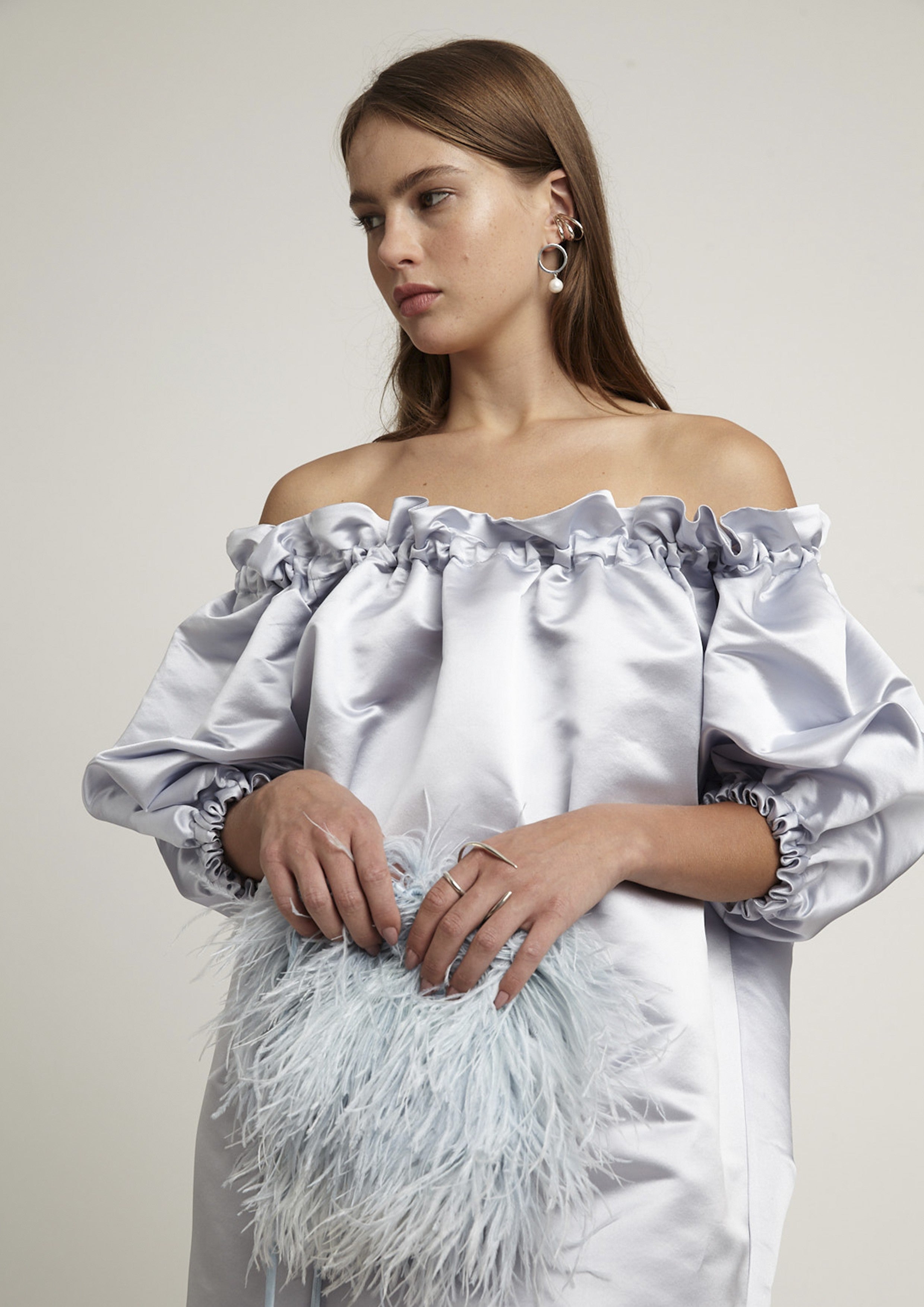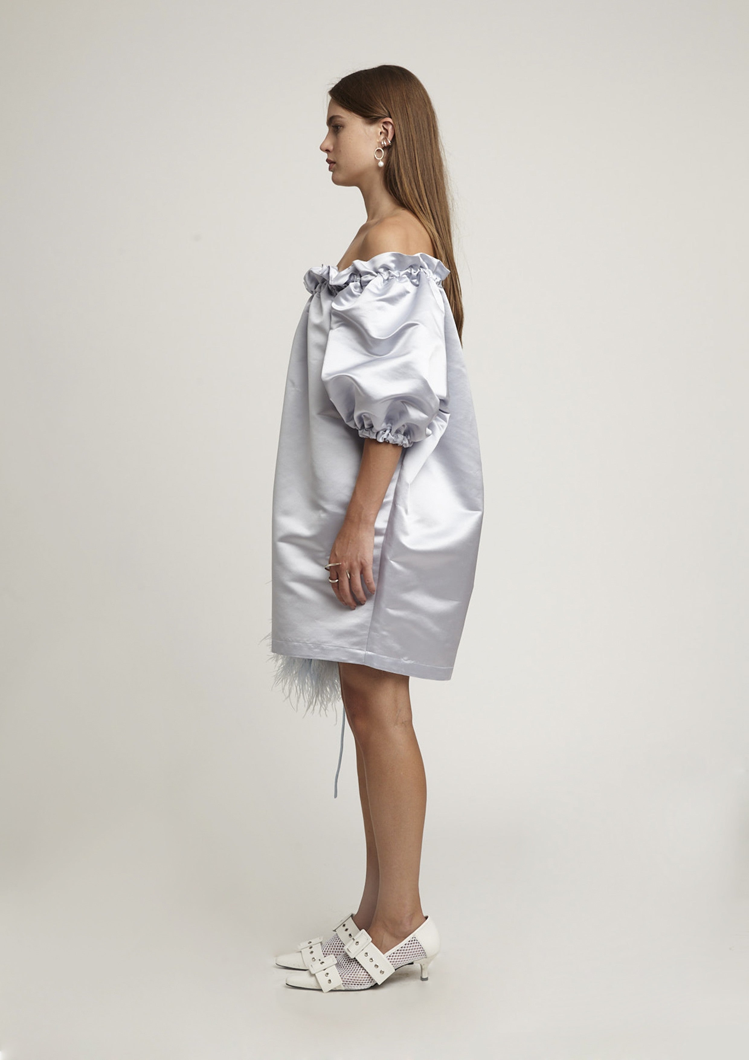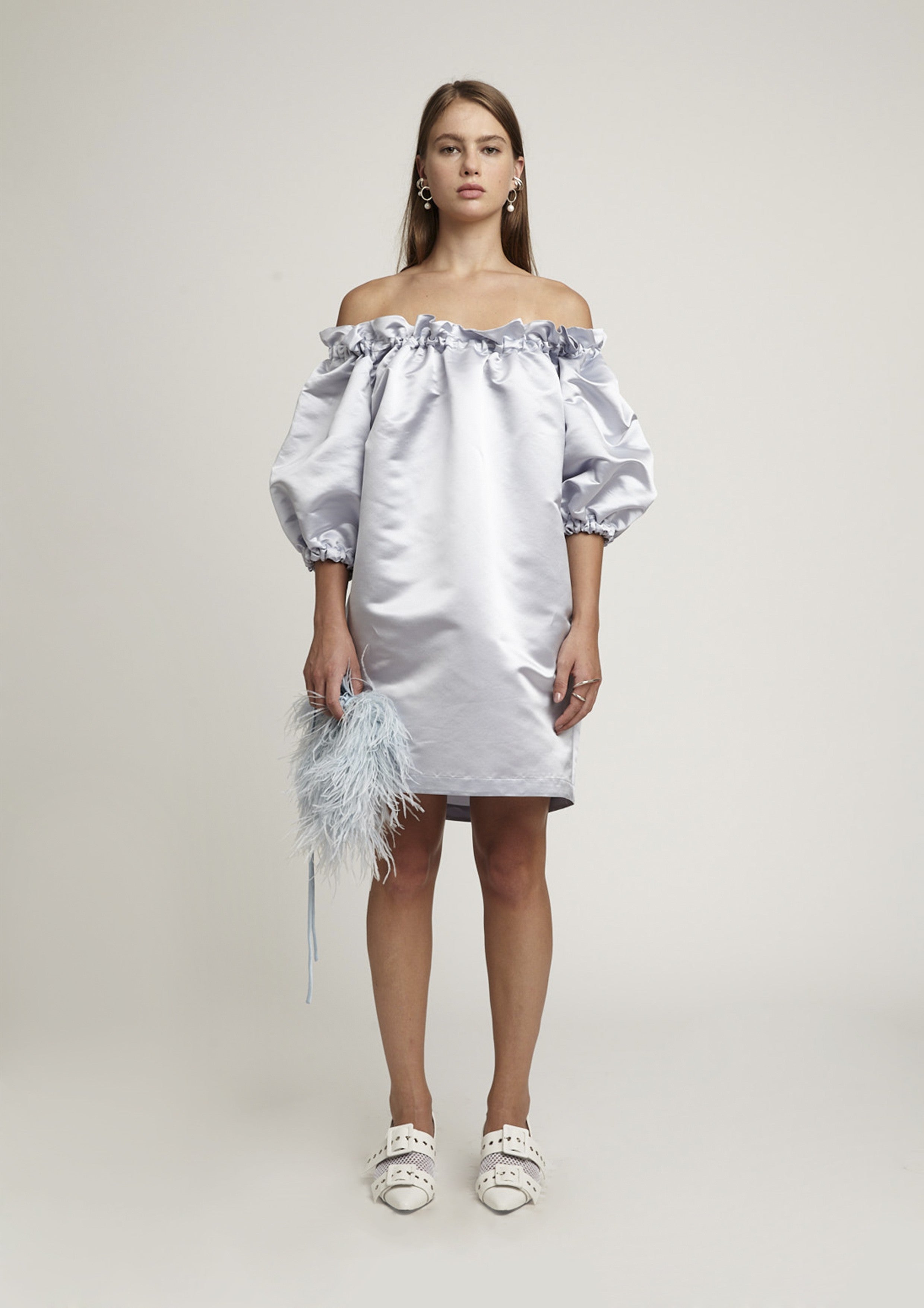 Mini vestido ombro a ombro em seda possui um caimento mais estruturado mesmo sendo