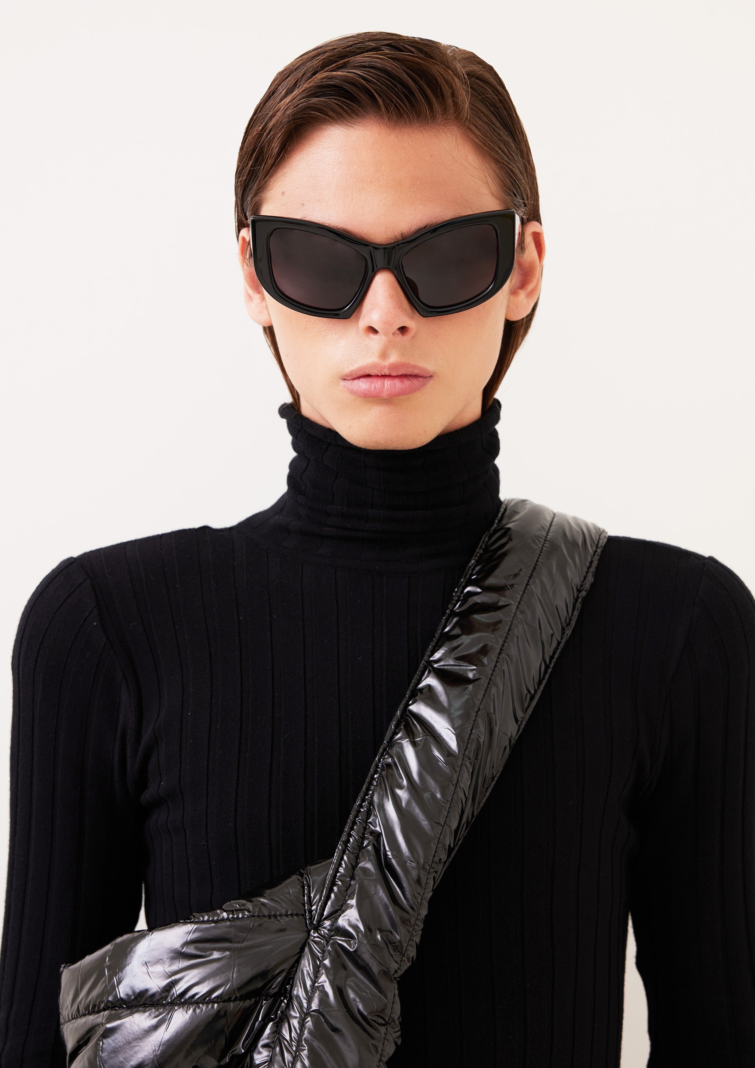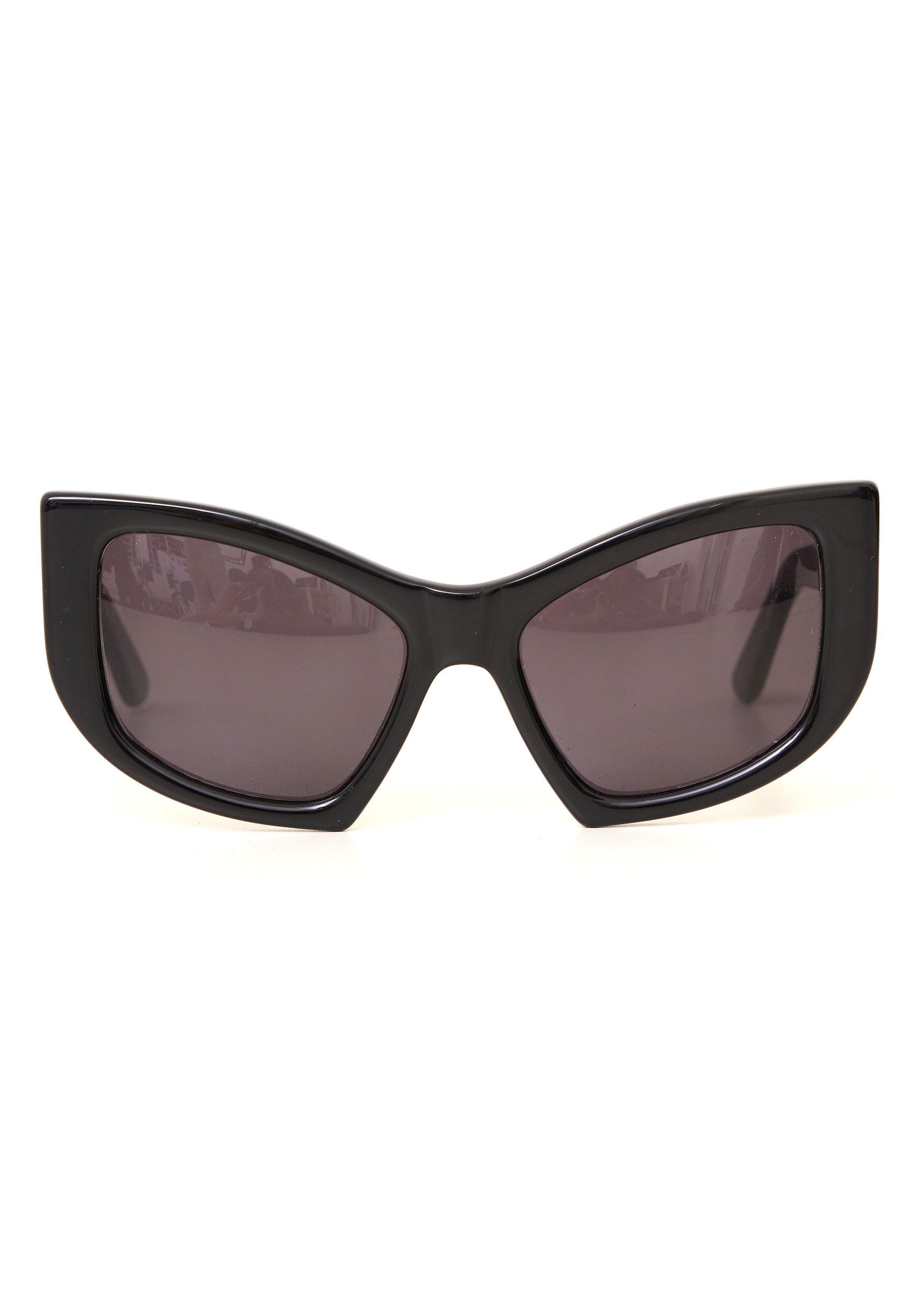 Óculos de sol inspirado nos anos 80. Possui armação e lentes arredondadas e hastes de espessura grossa com nome da marca gravado.