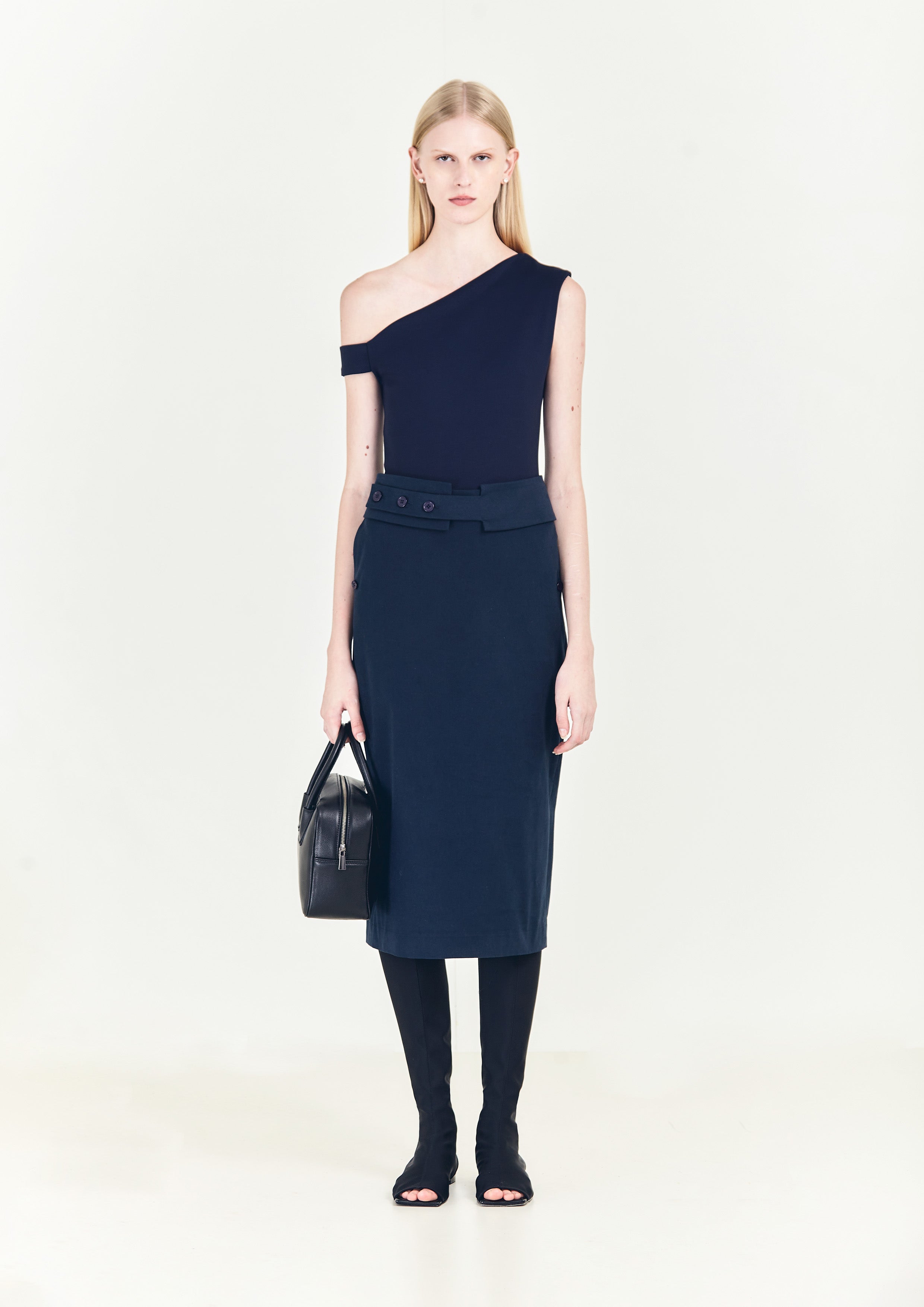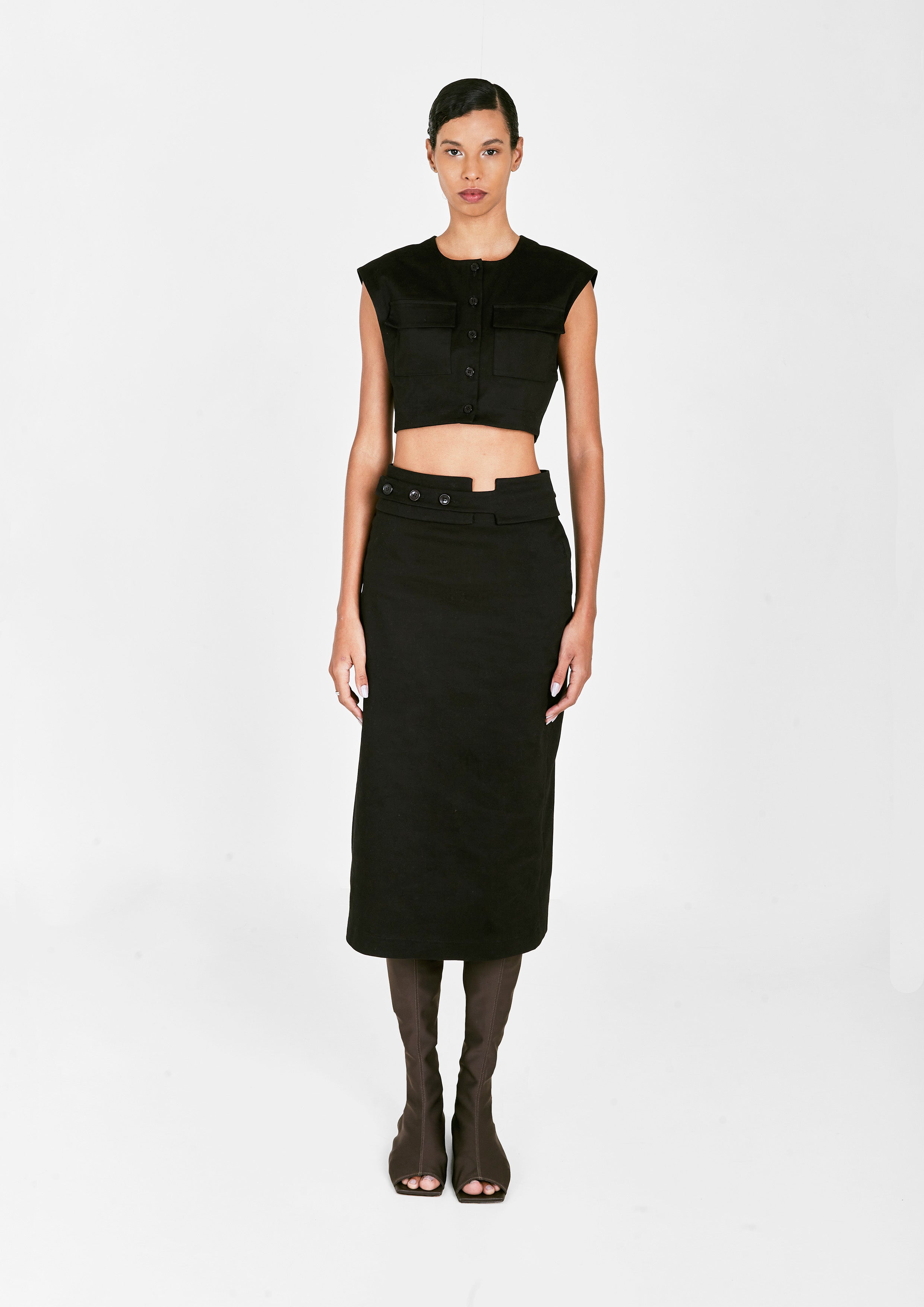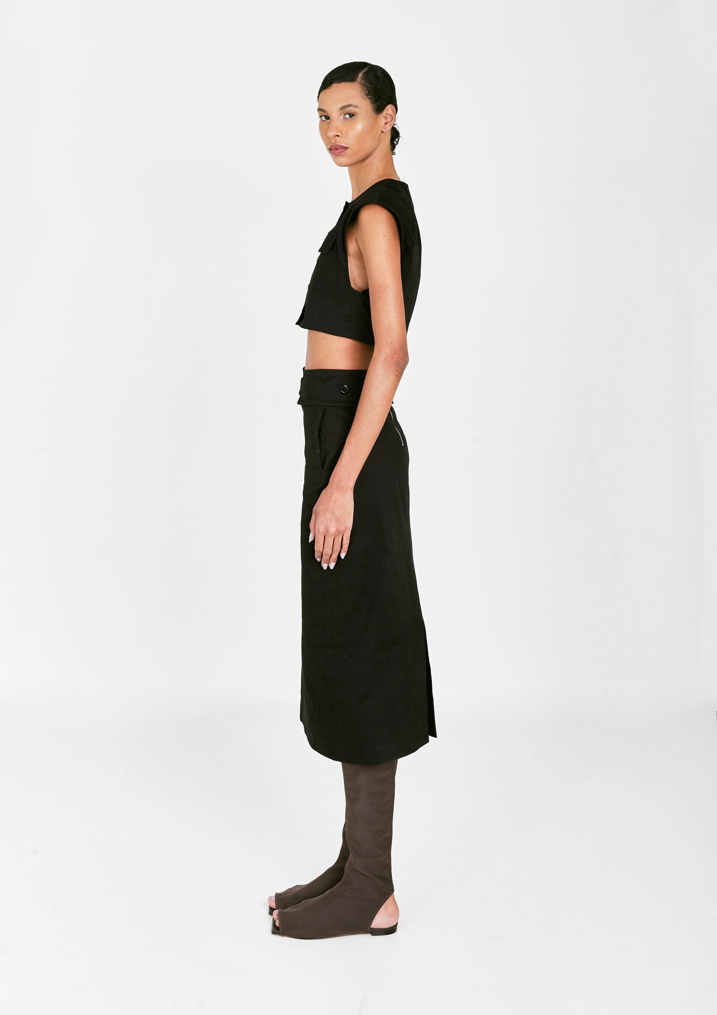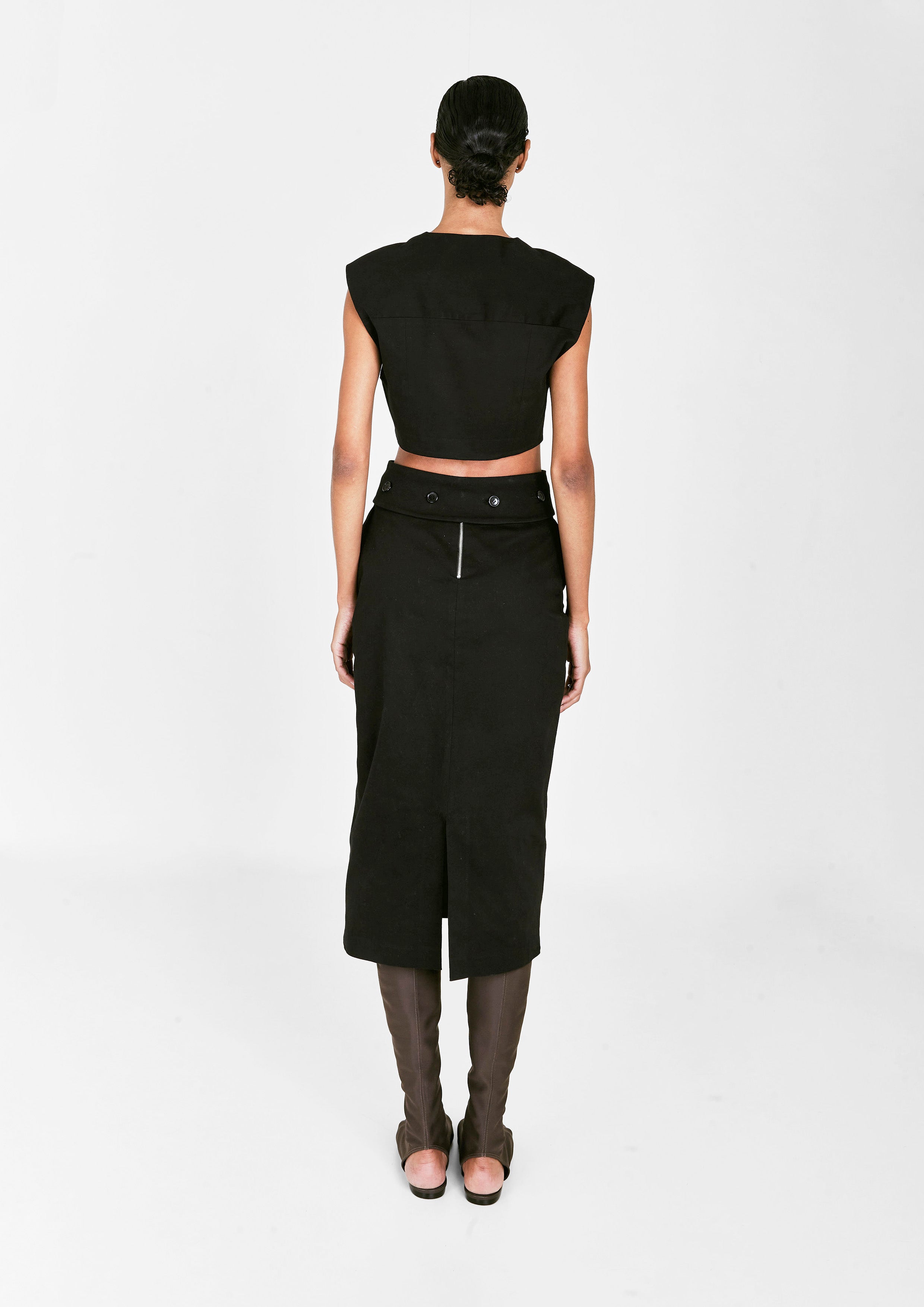 Saia midi de sarja, com cós destacável. Abertura de zíper de metal no centro costas.