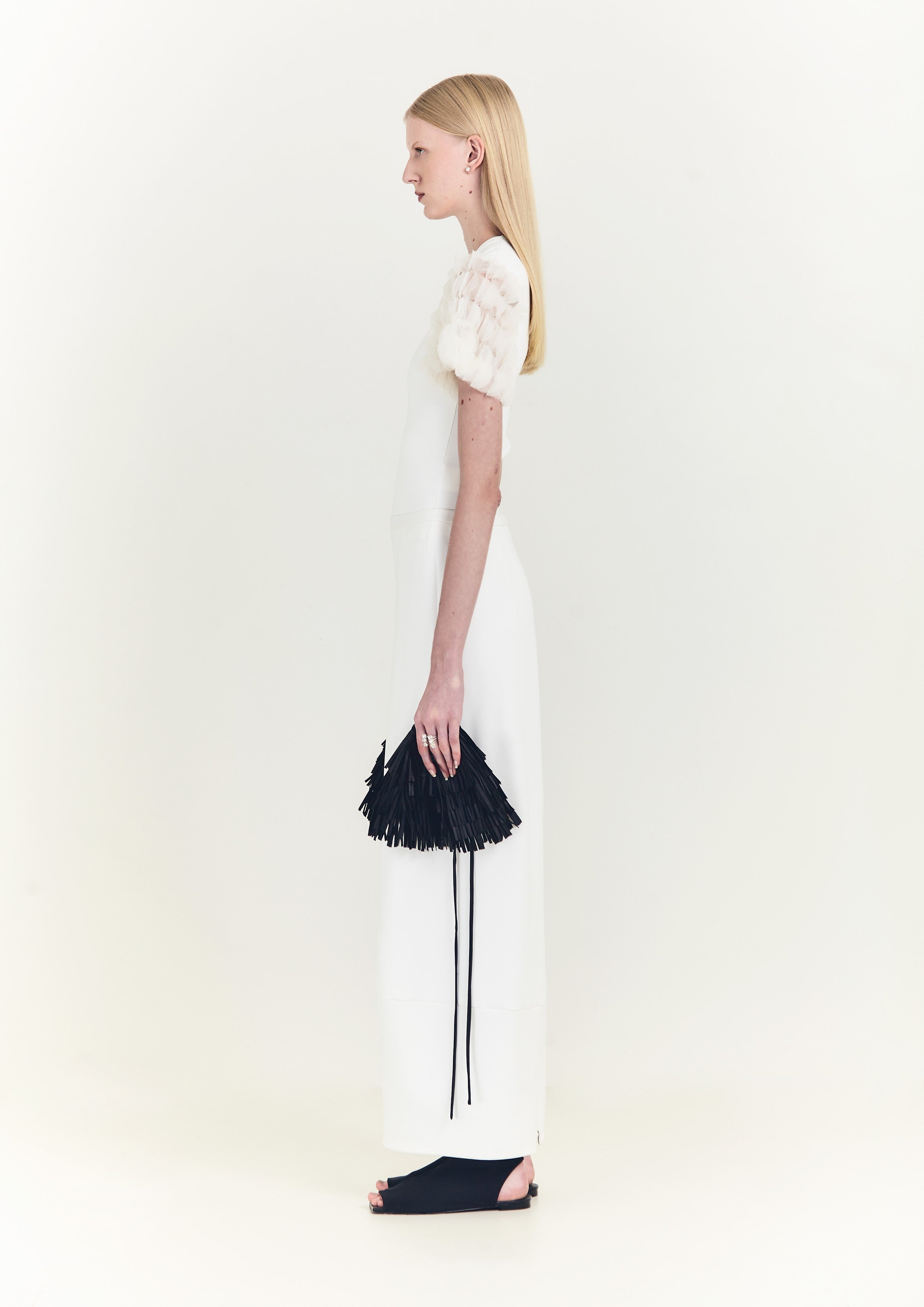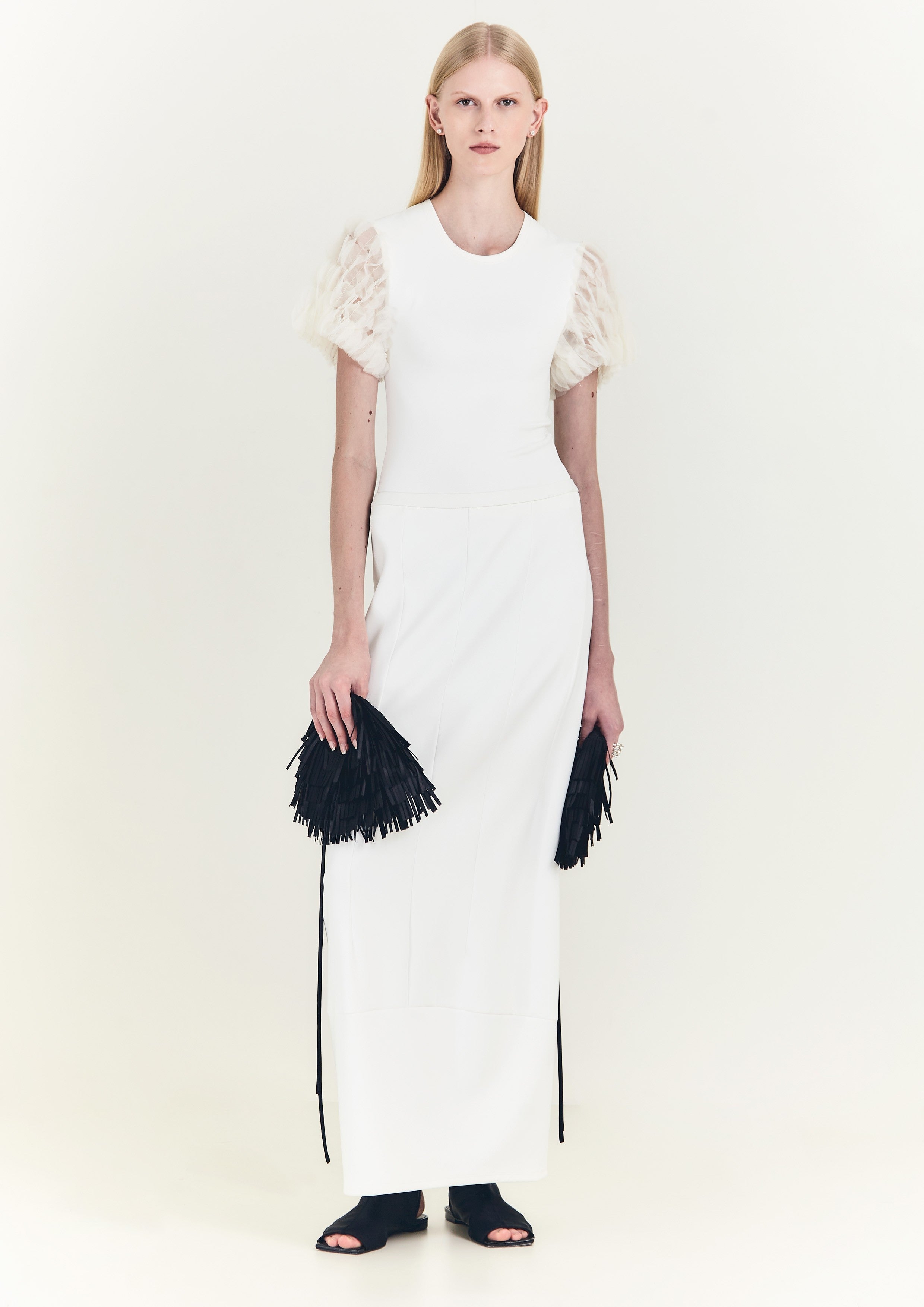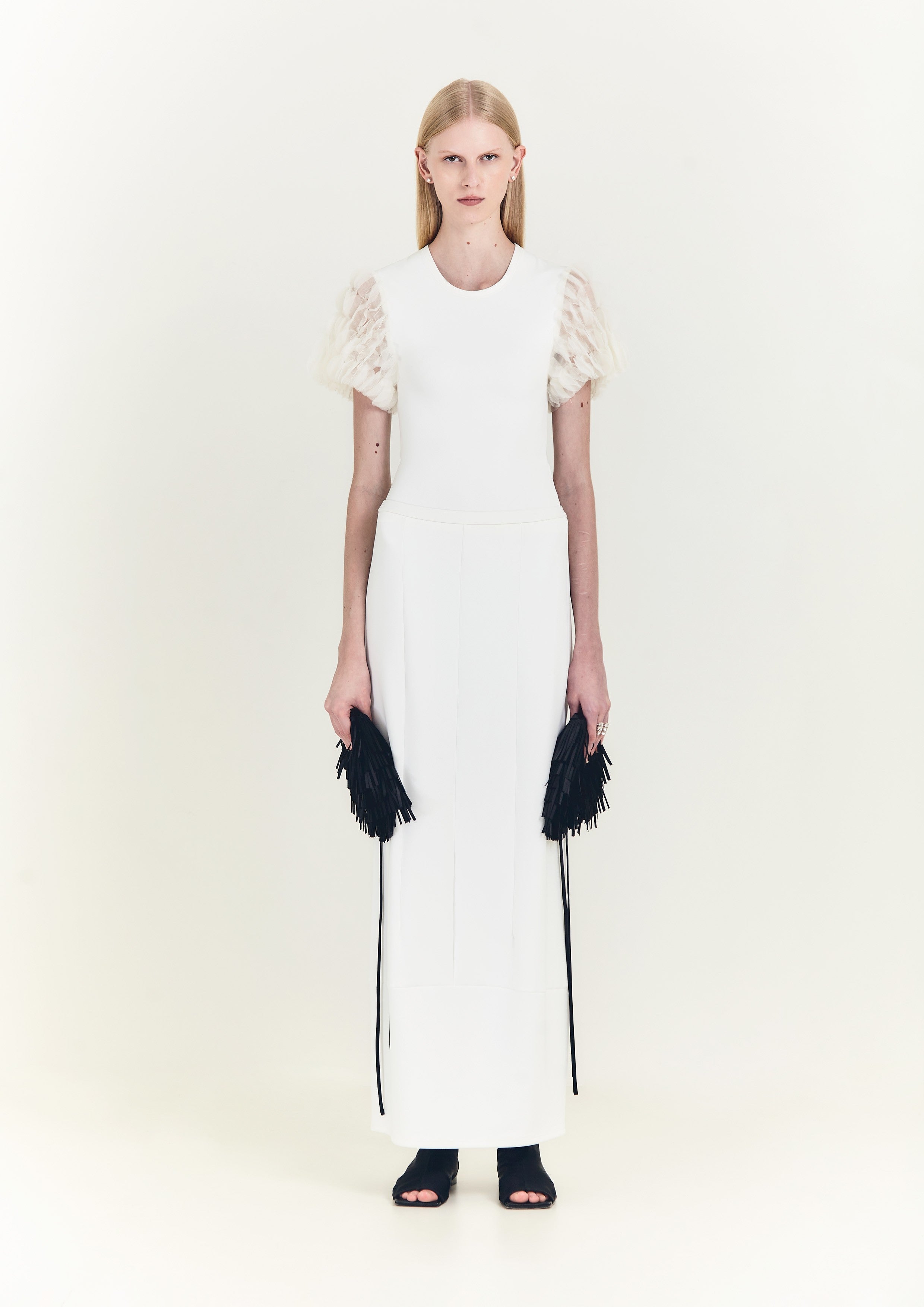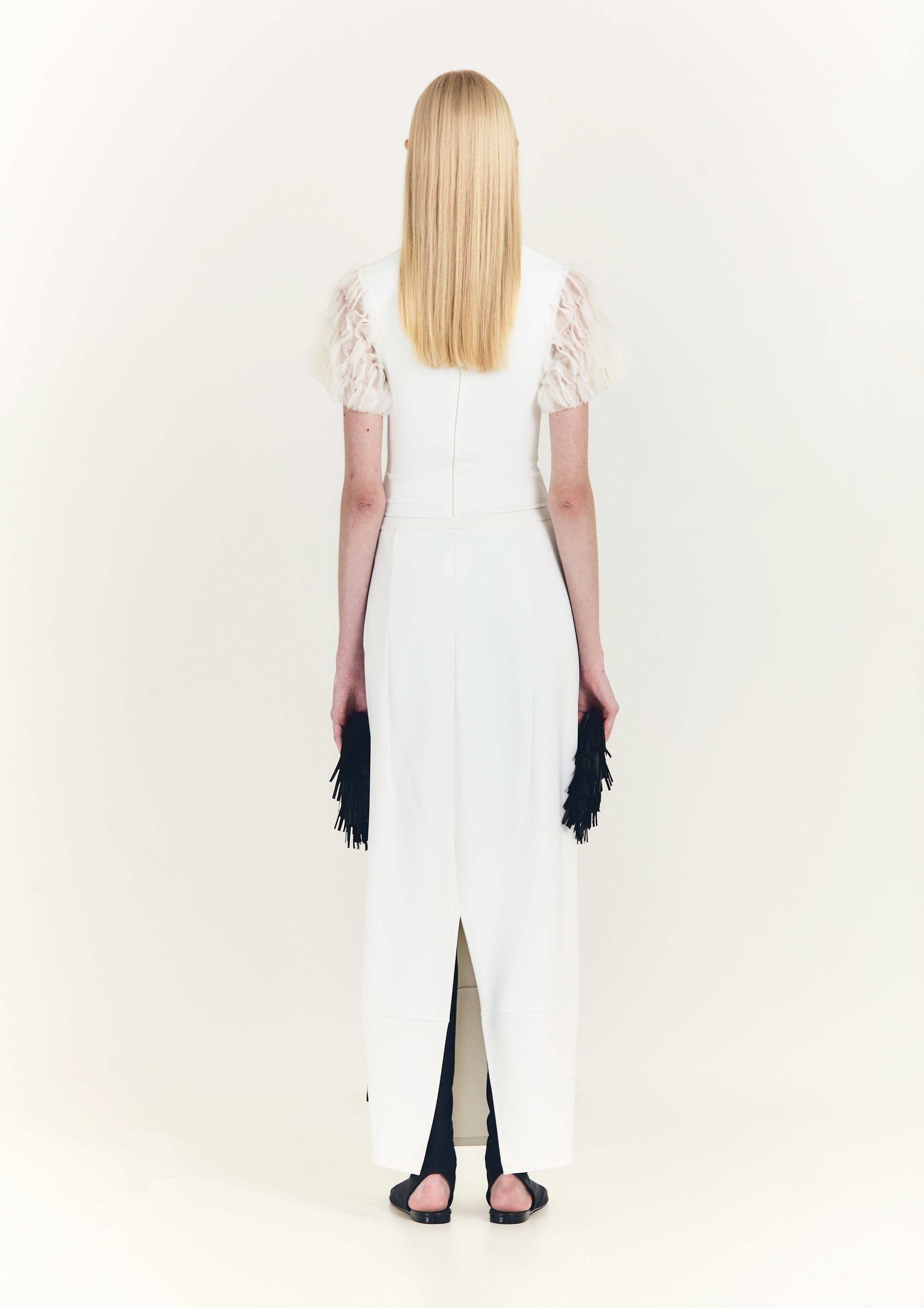 Saia reta longa de malha, com recortes geométricos e fenda nas costas.