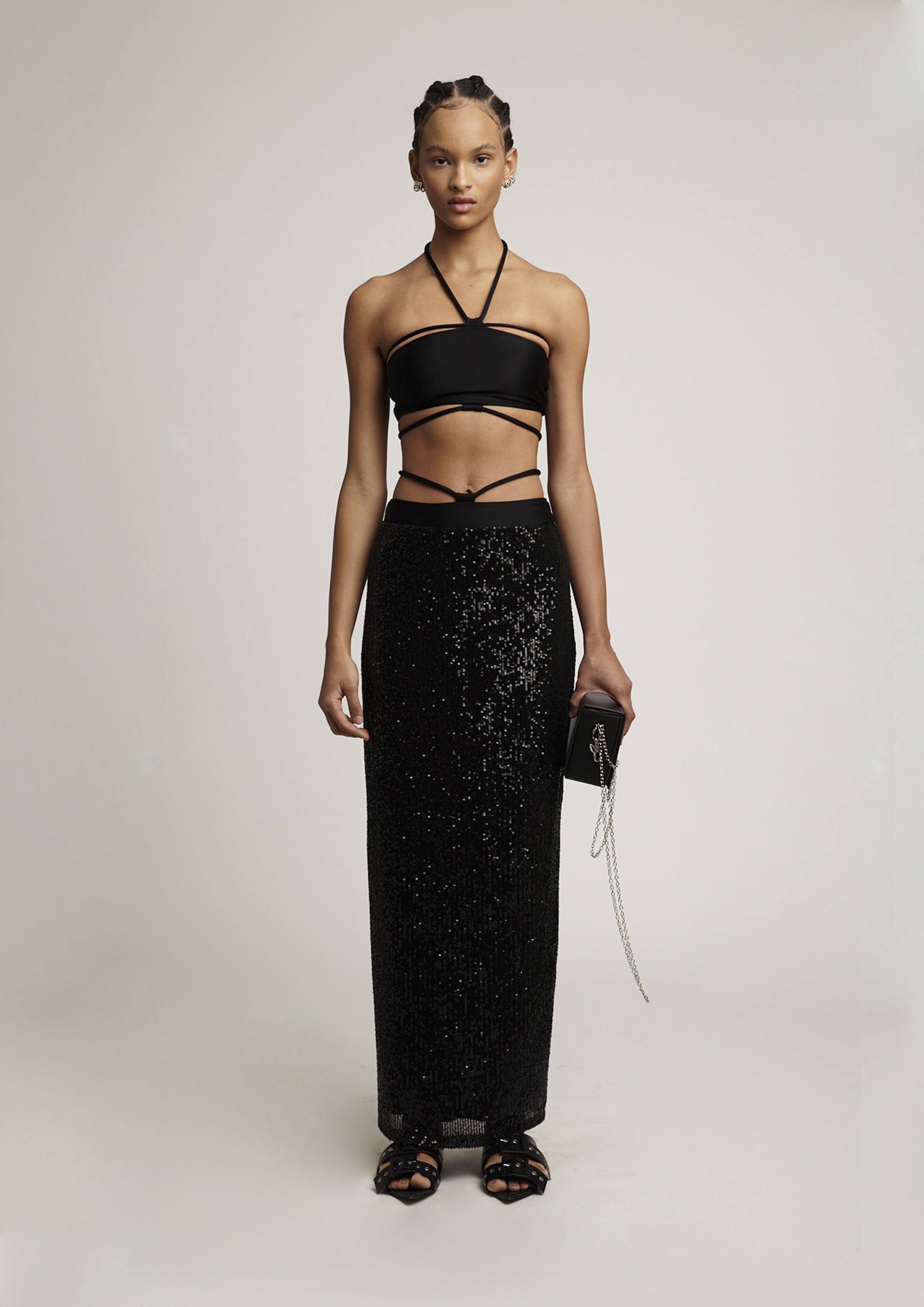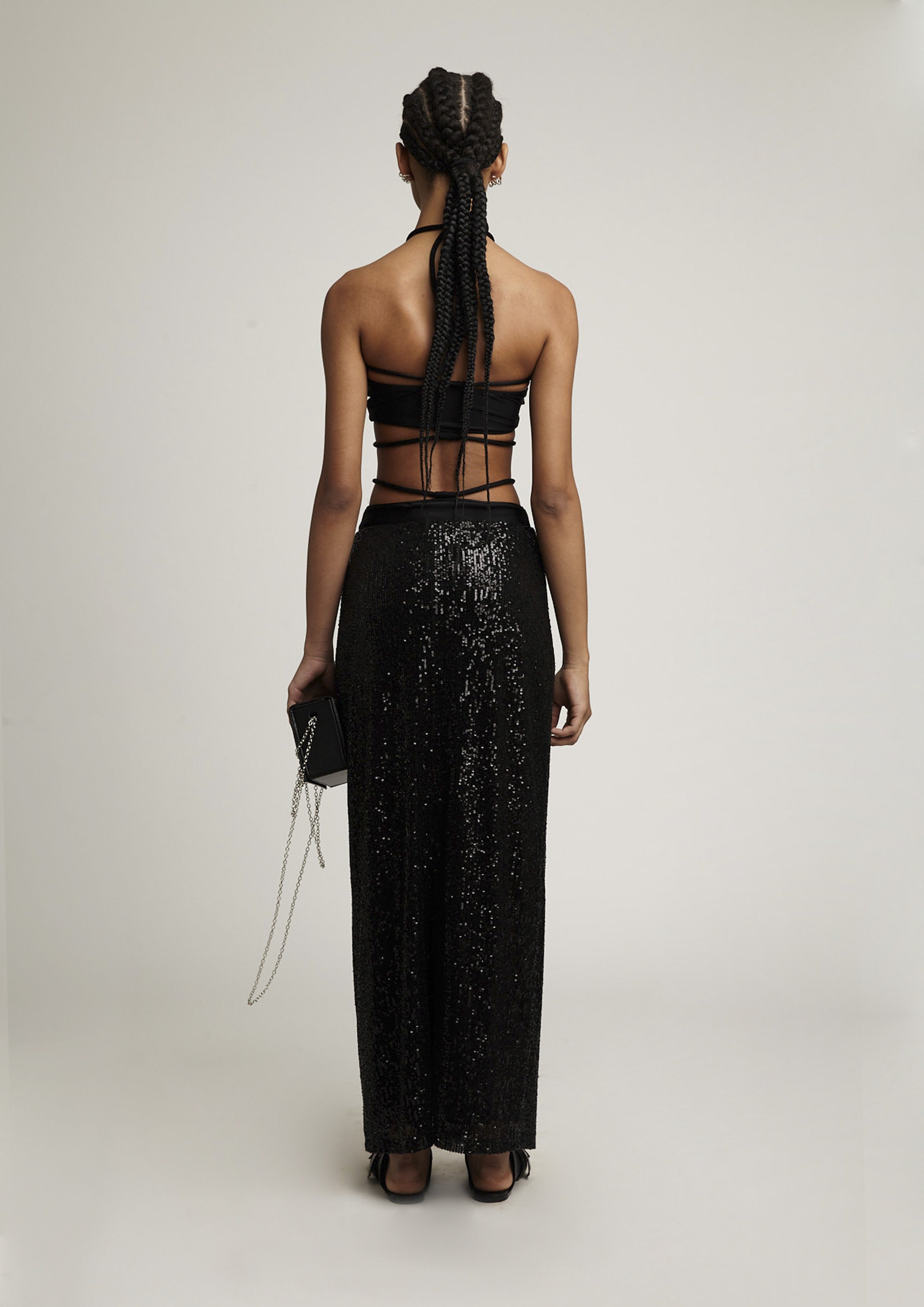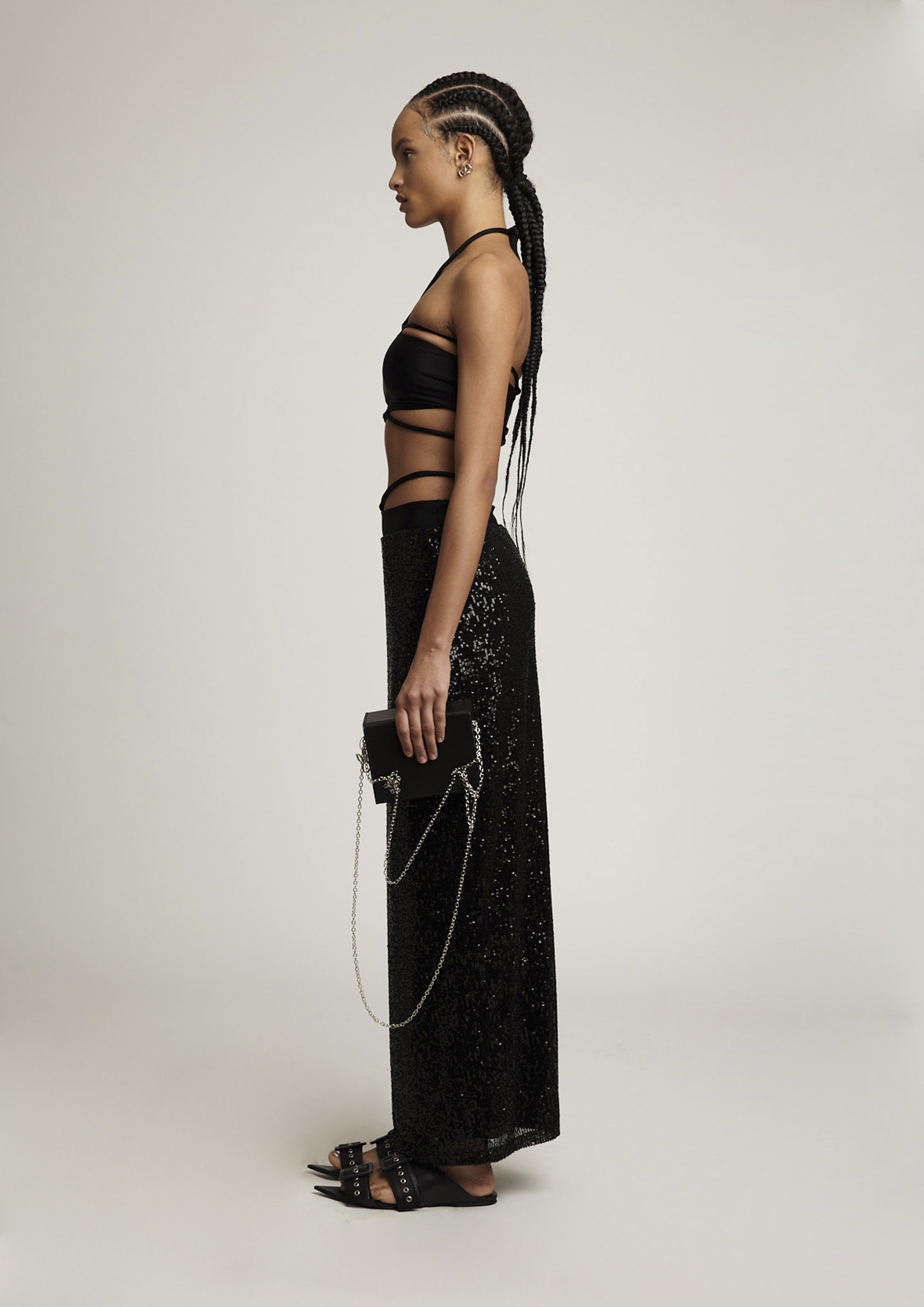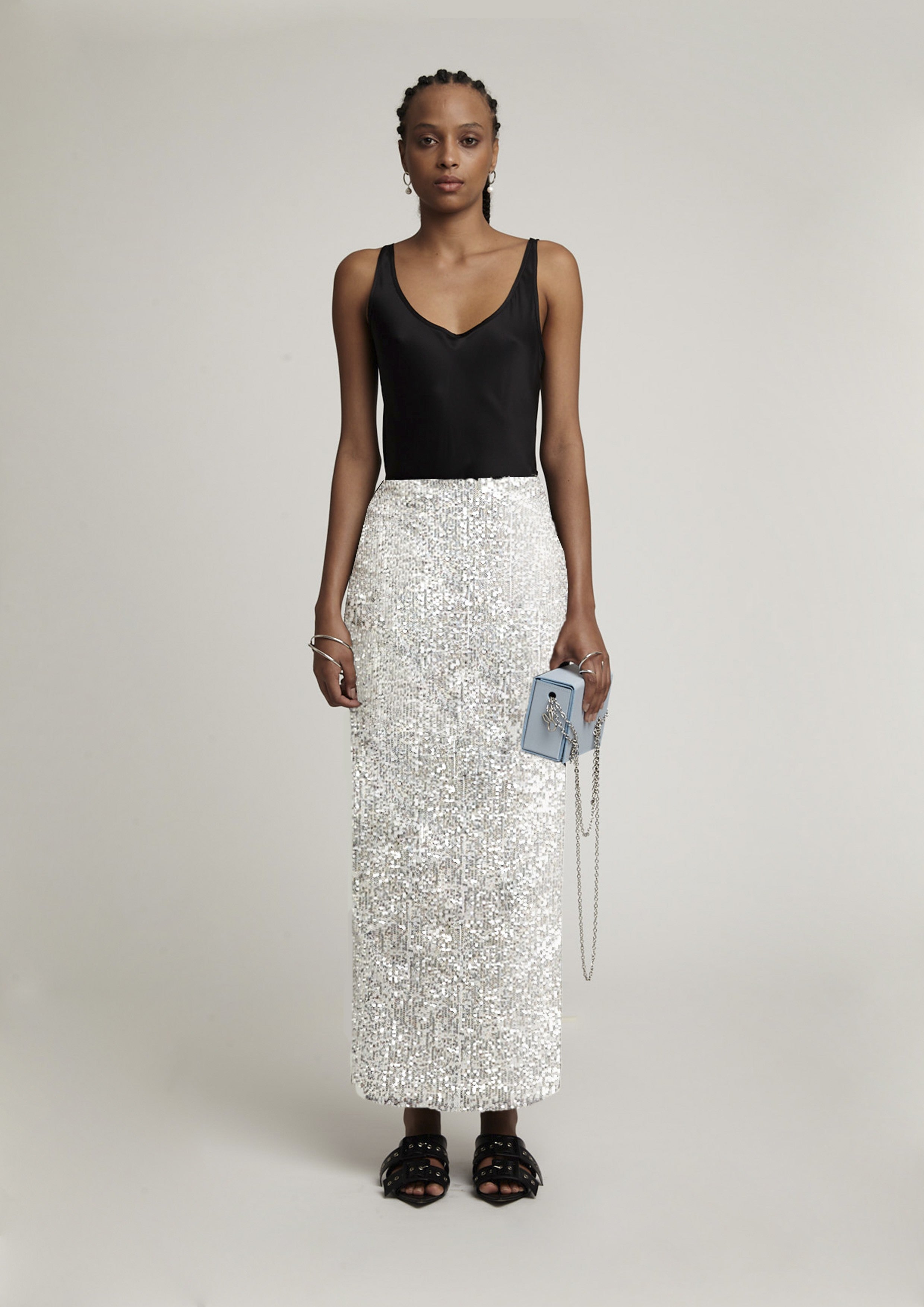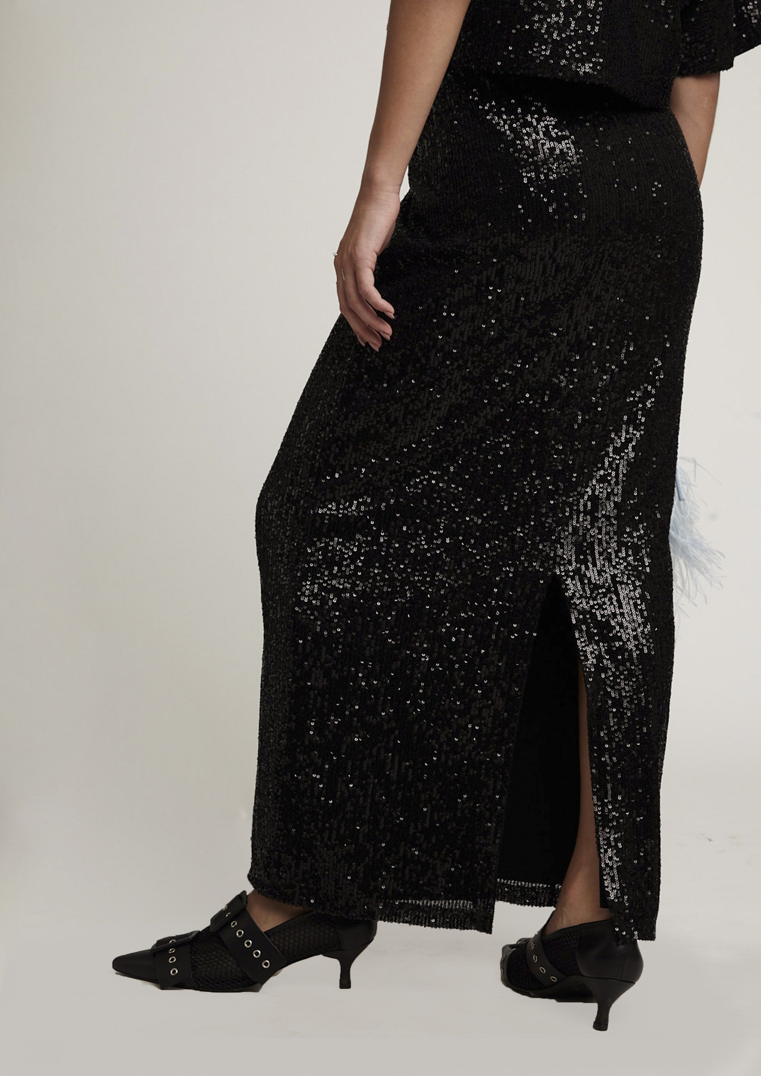 Saia longa de paetê é uma peça versátil que se adapta à ocasião. Possui modelagem