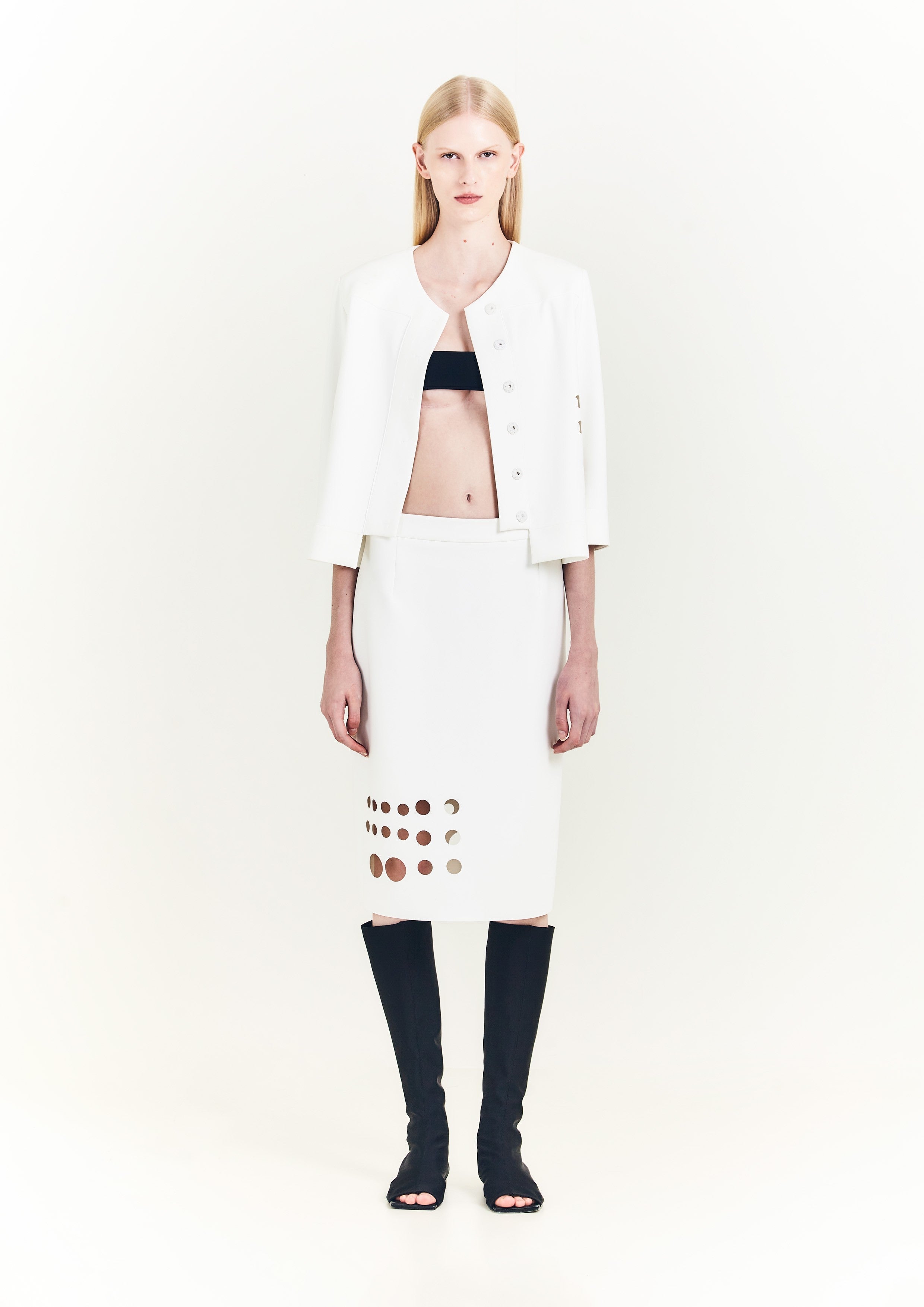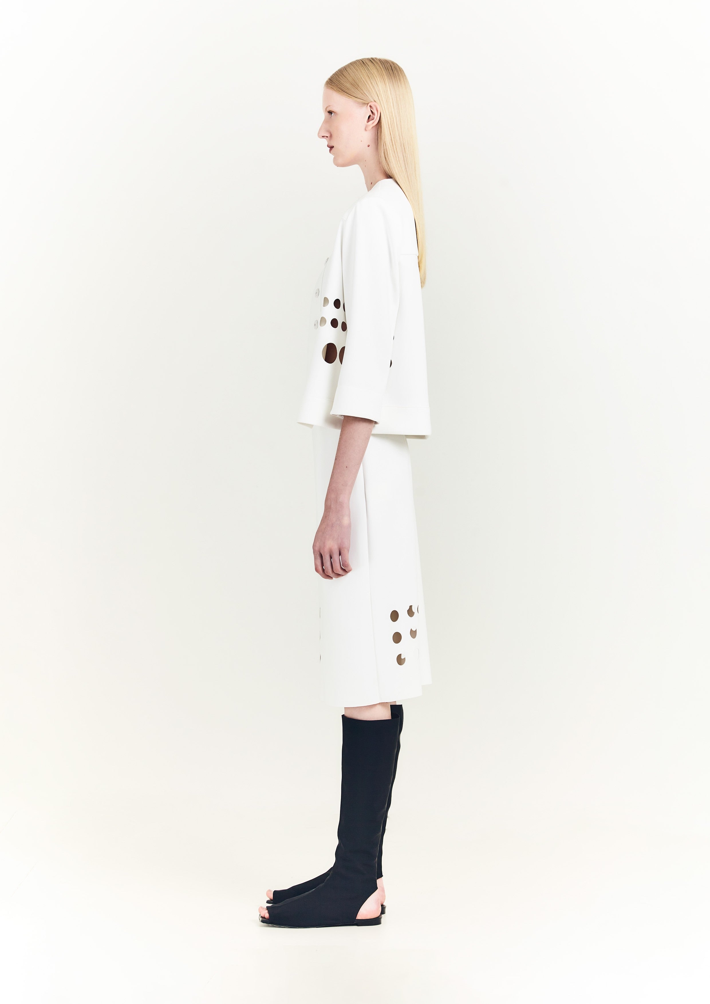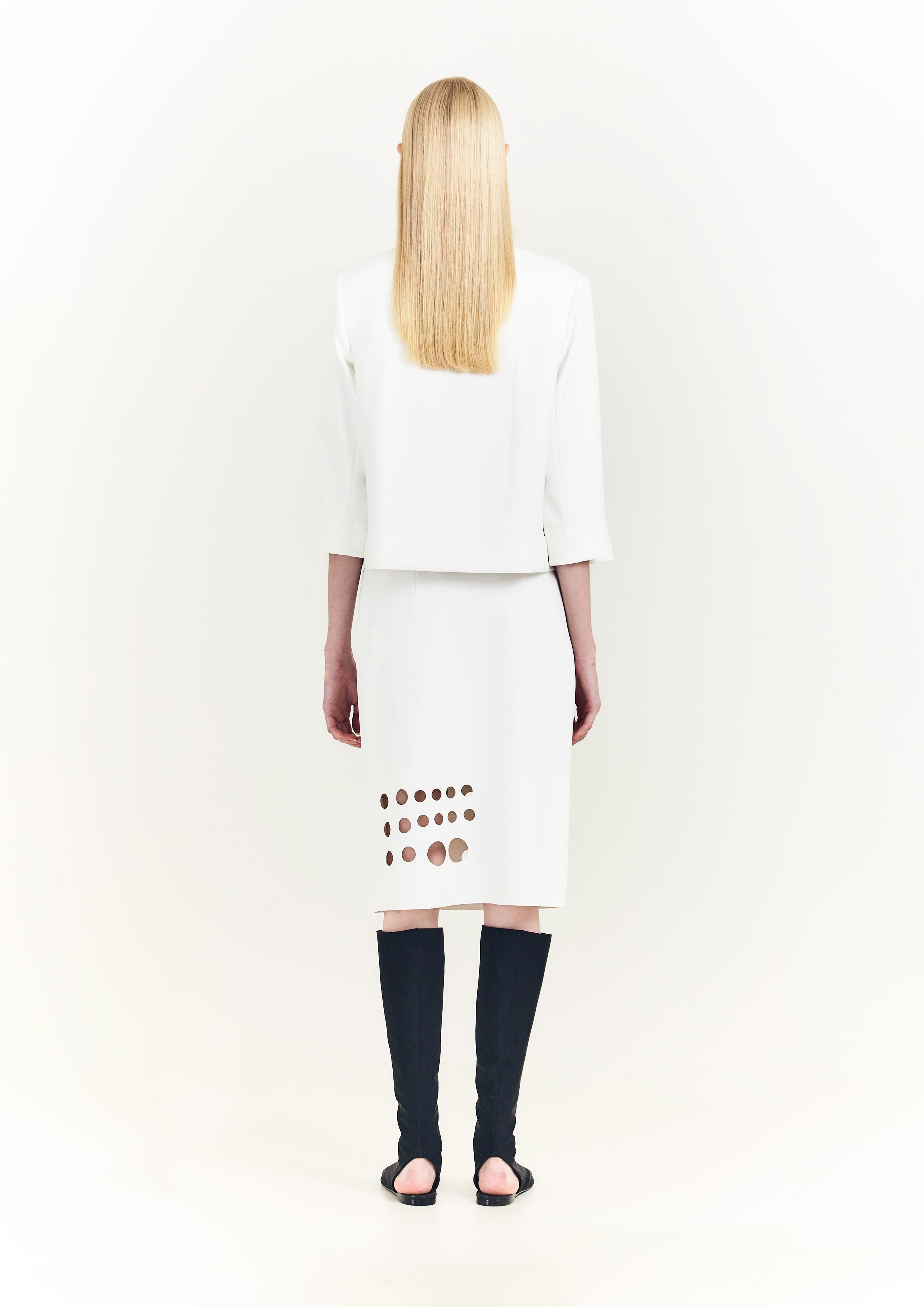 Saia midi de malha, com bolas vazadas nas laterais frente e costas.