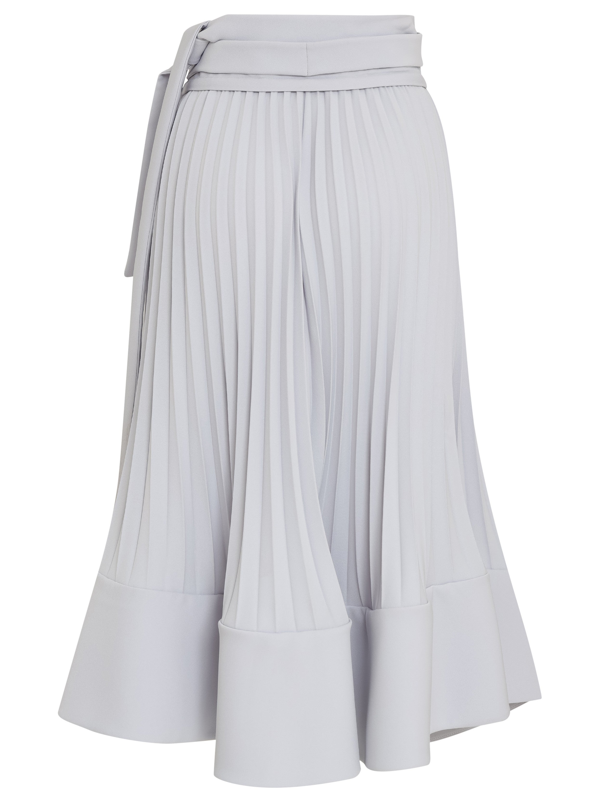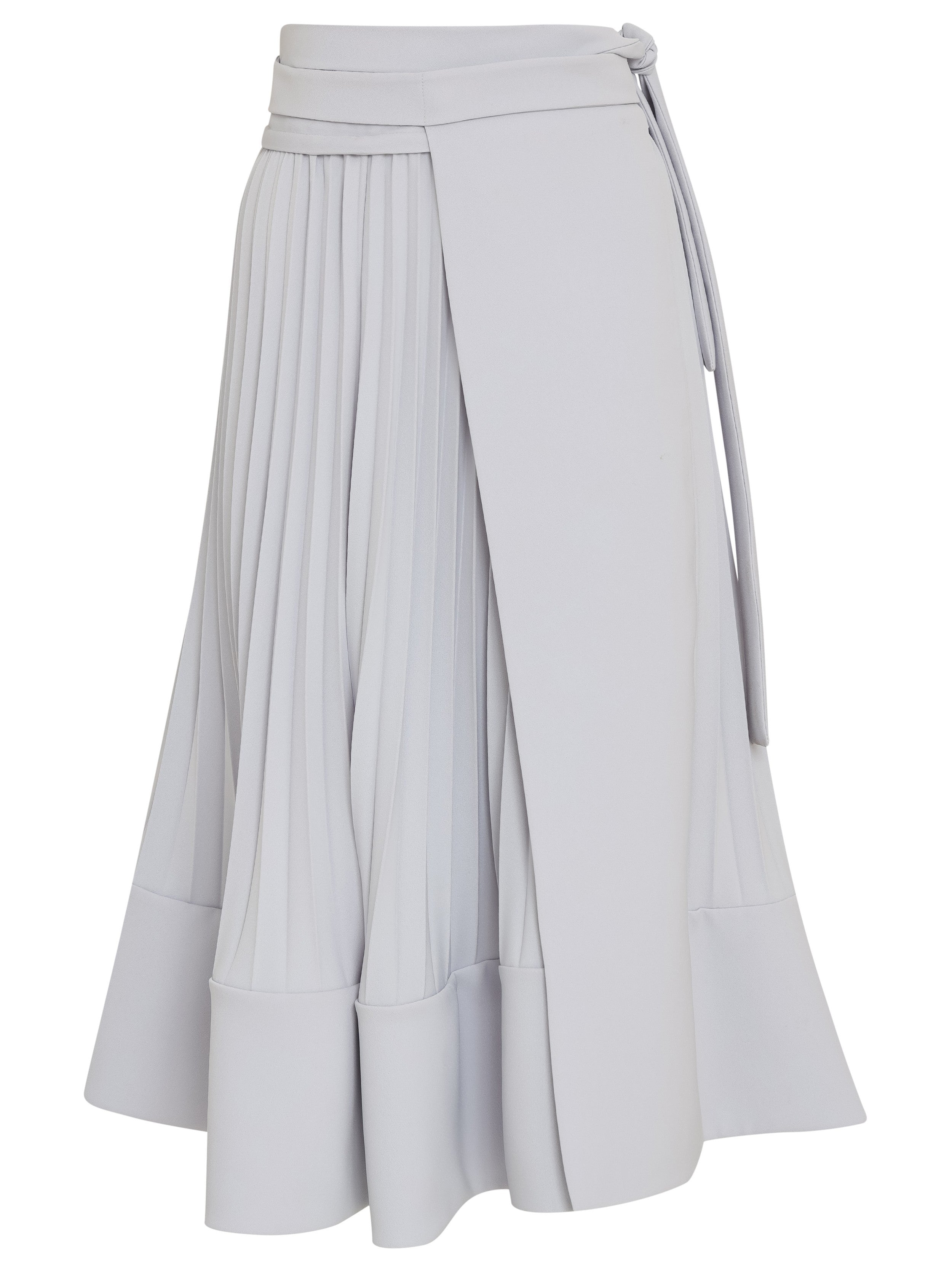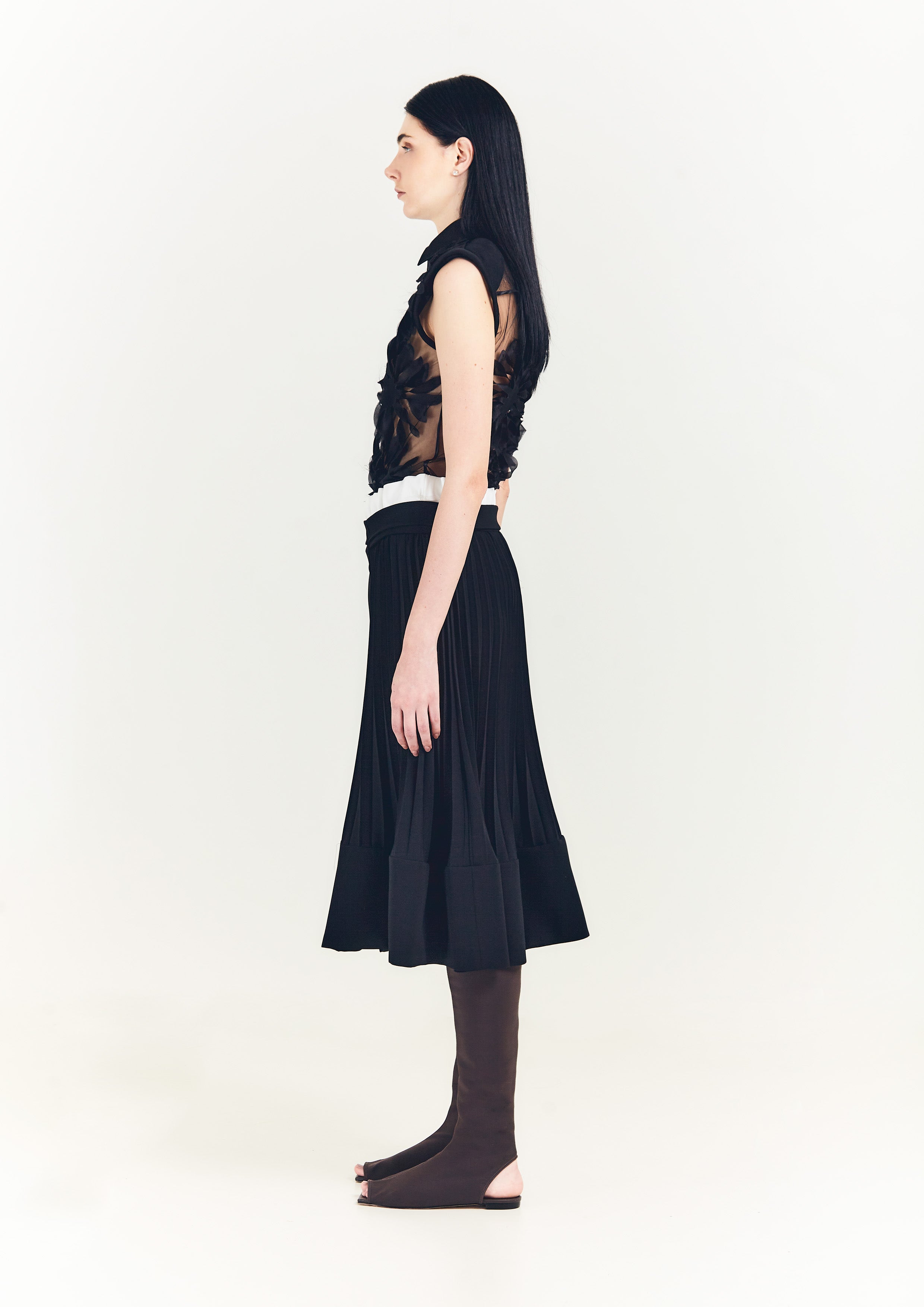 Saia transpassada plissada de crepe, com barrado largo liso.