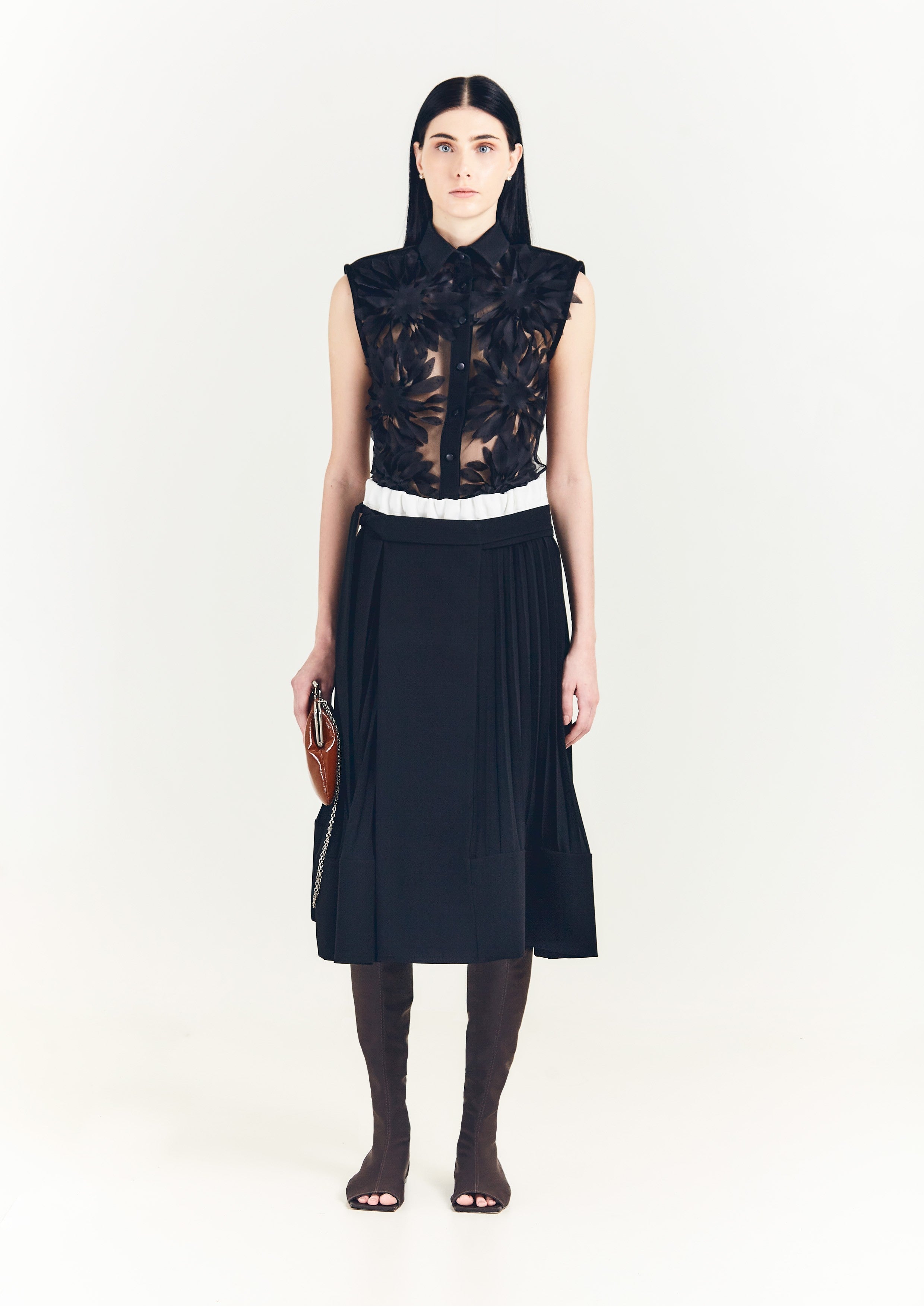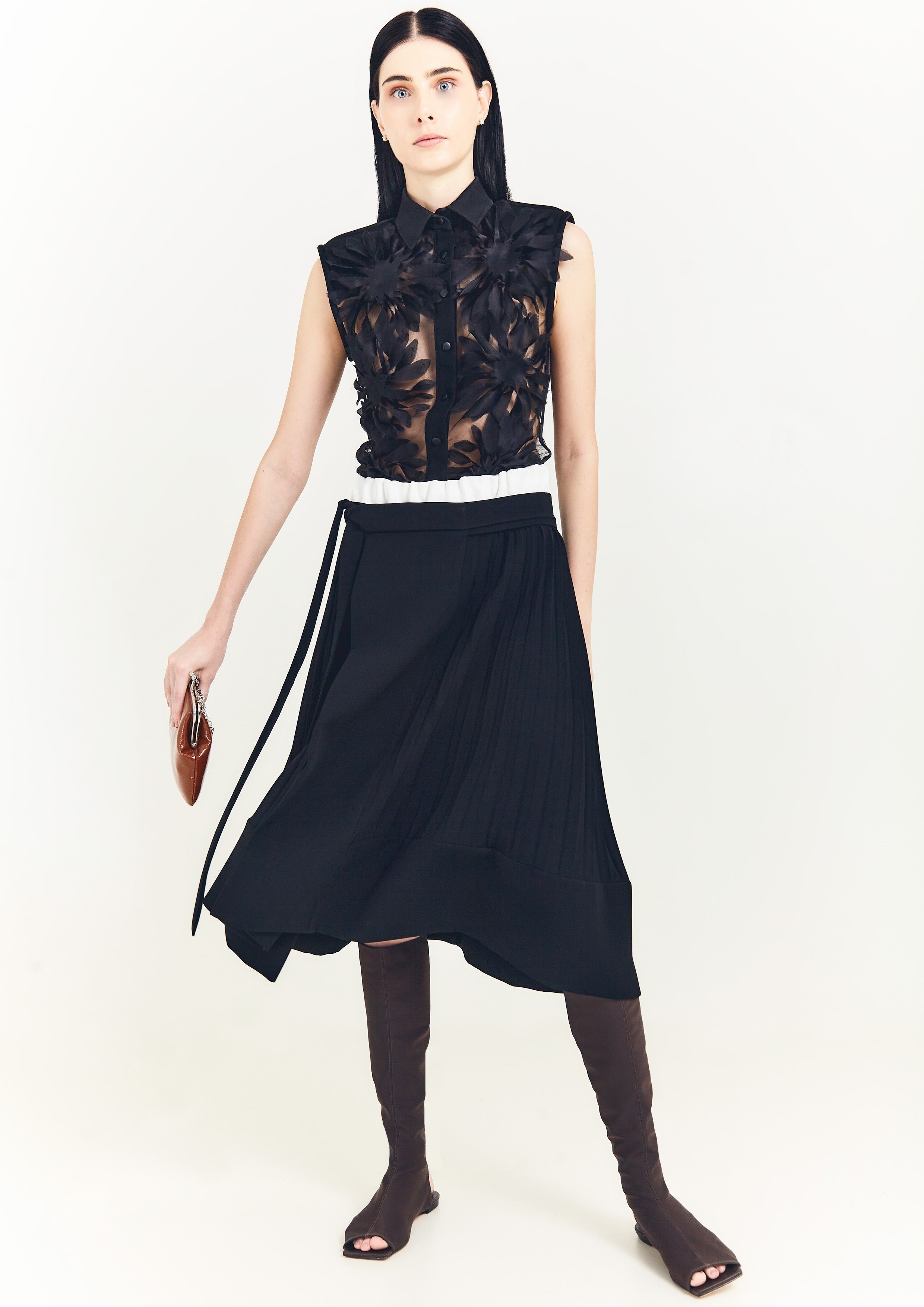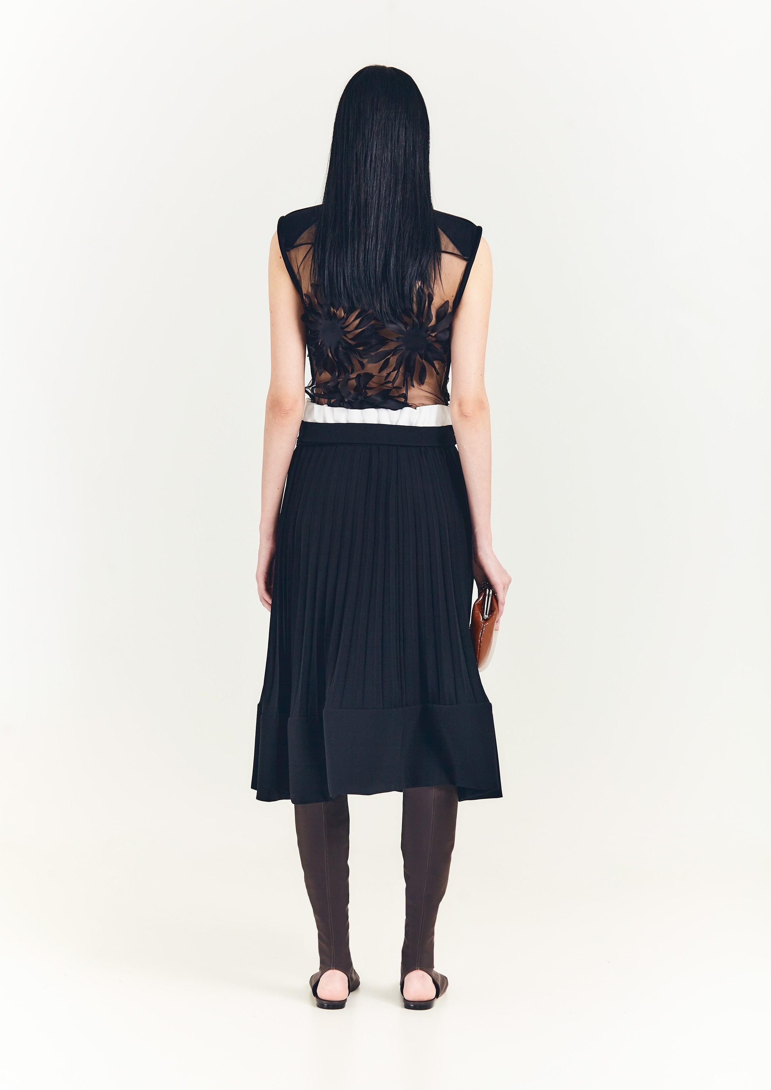 Saia transpassada plissada de crepe, com barrado largo liso.