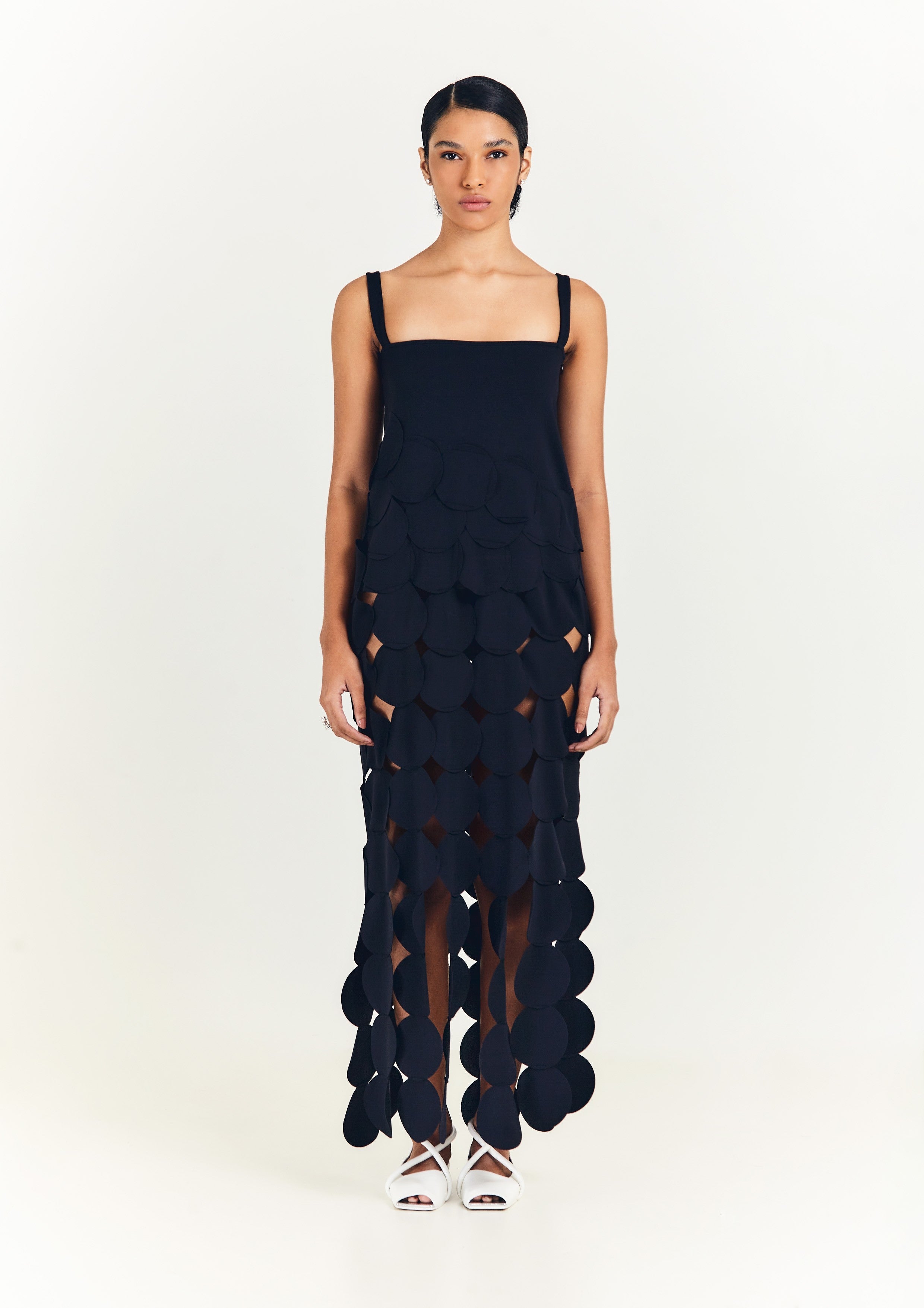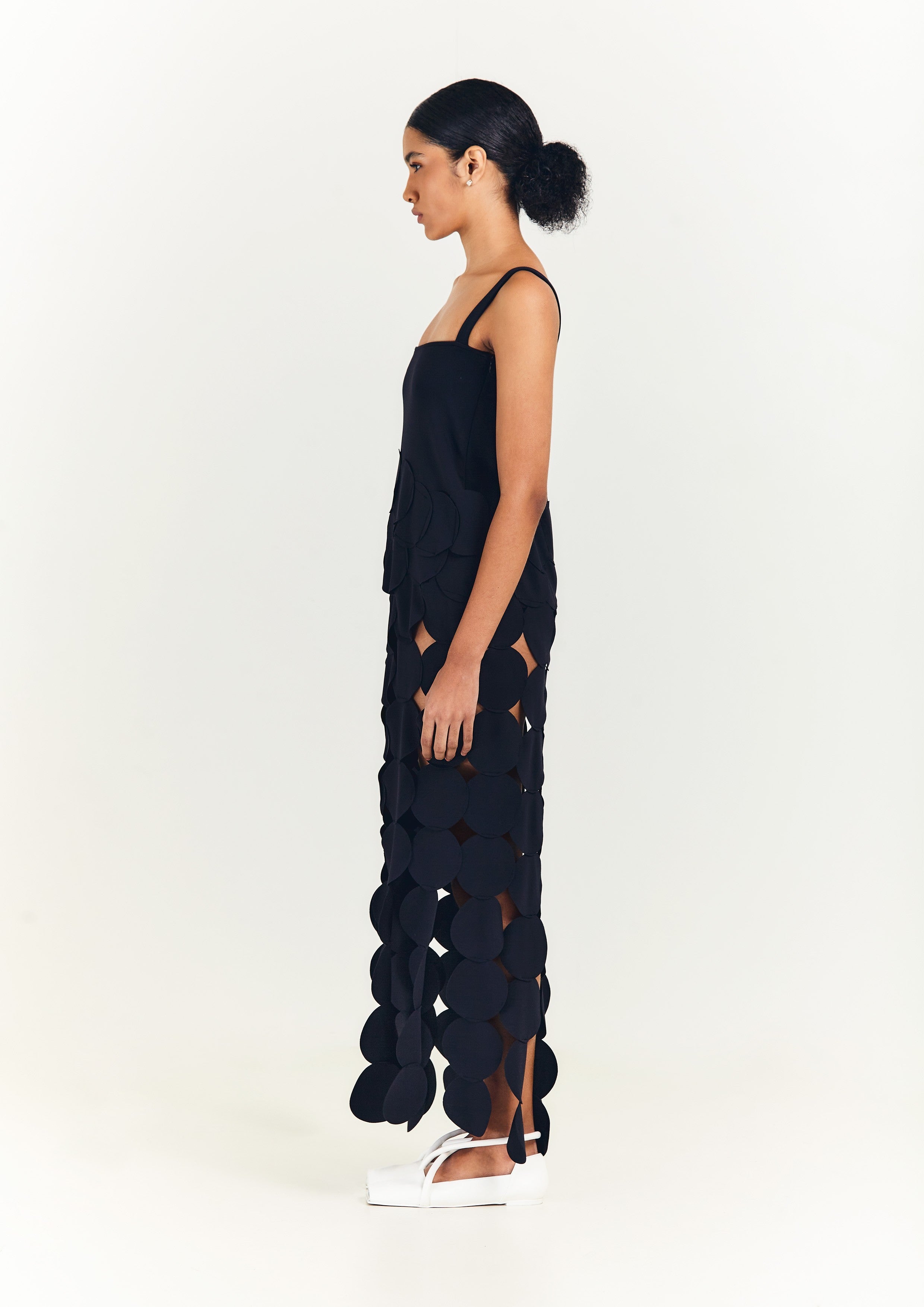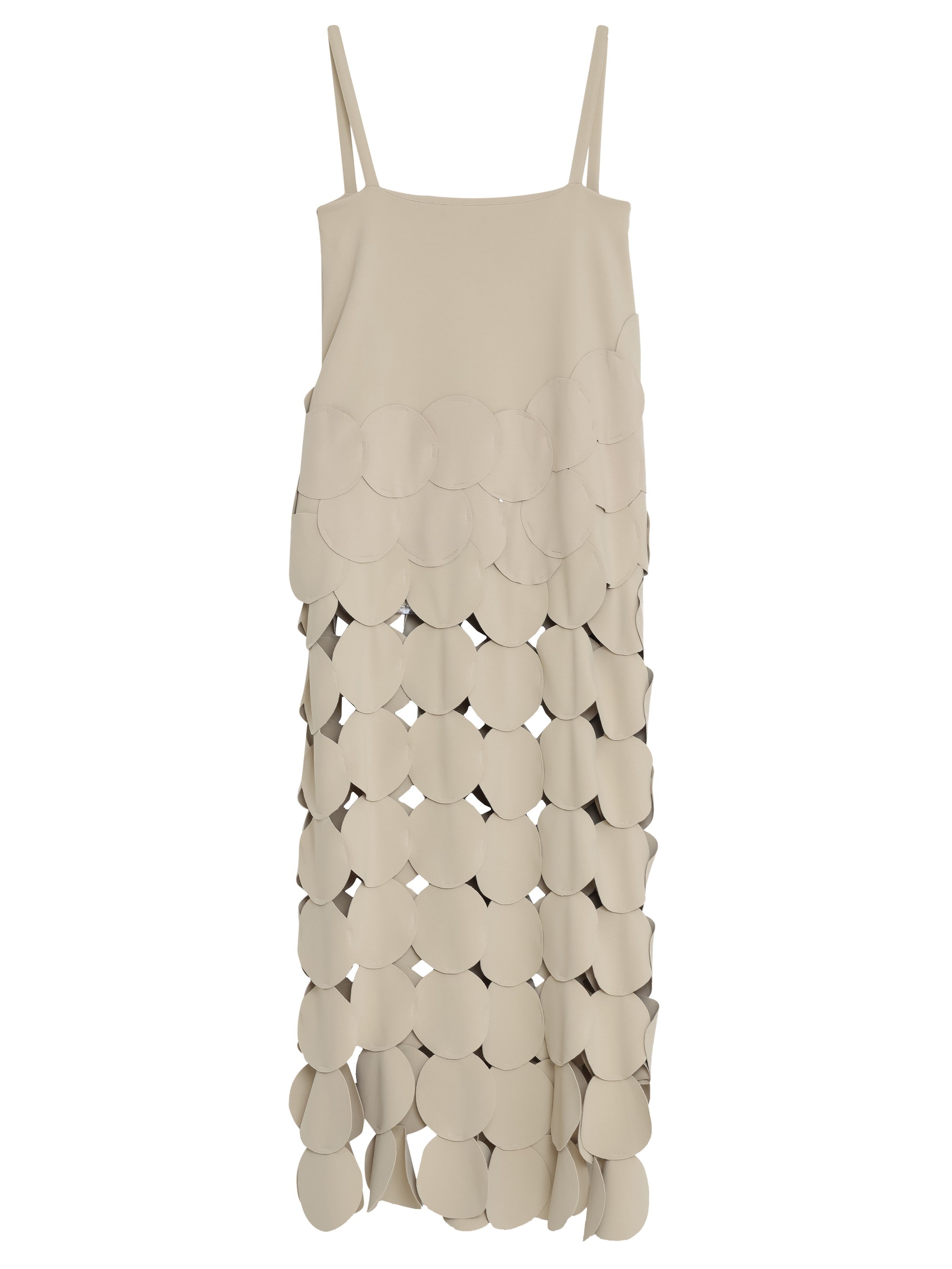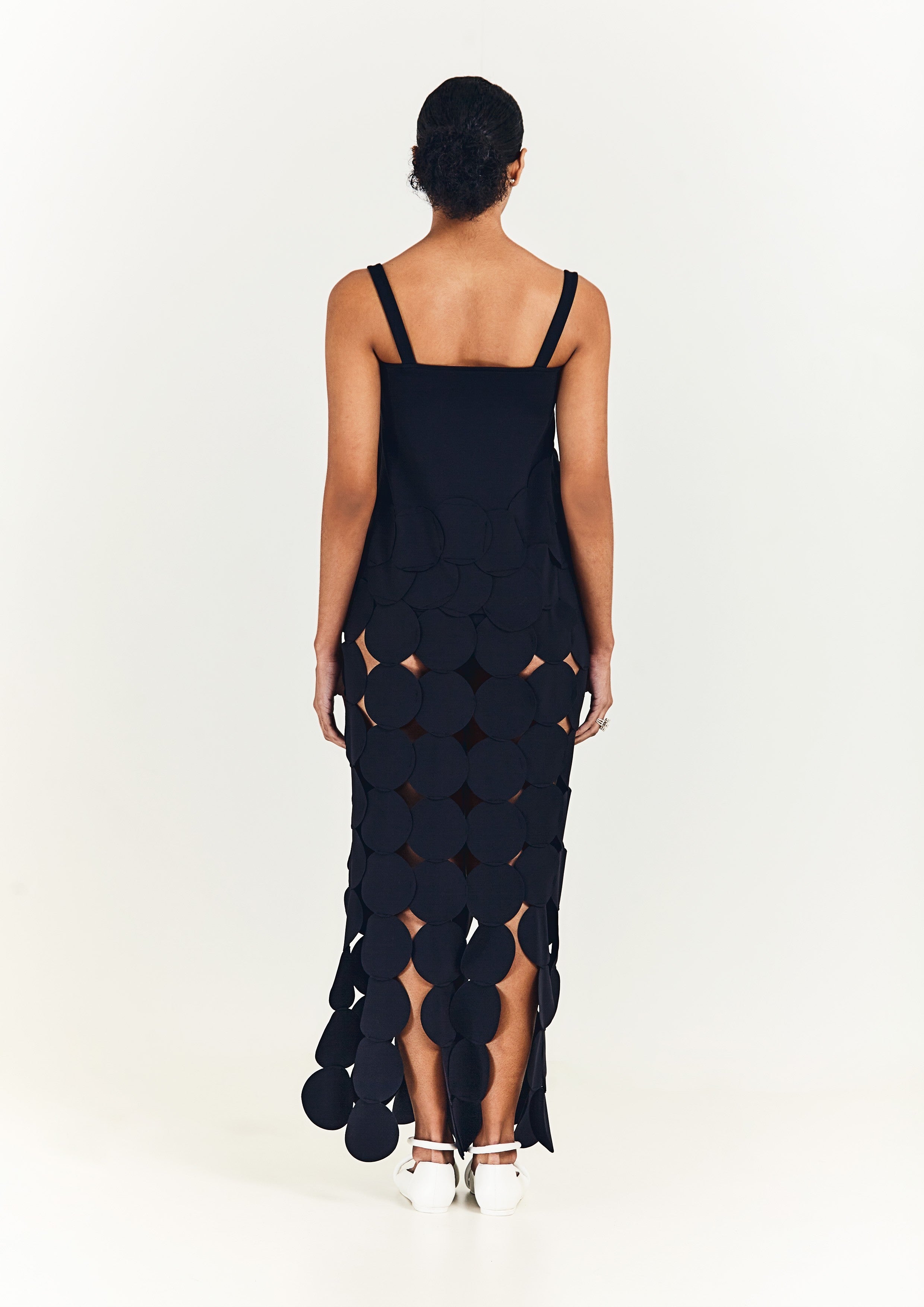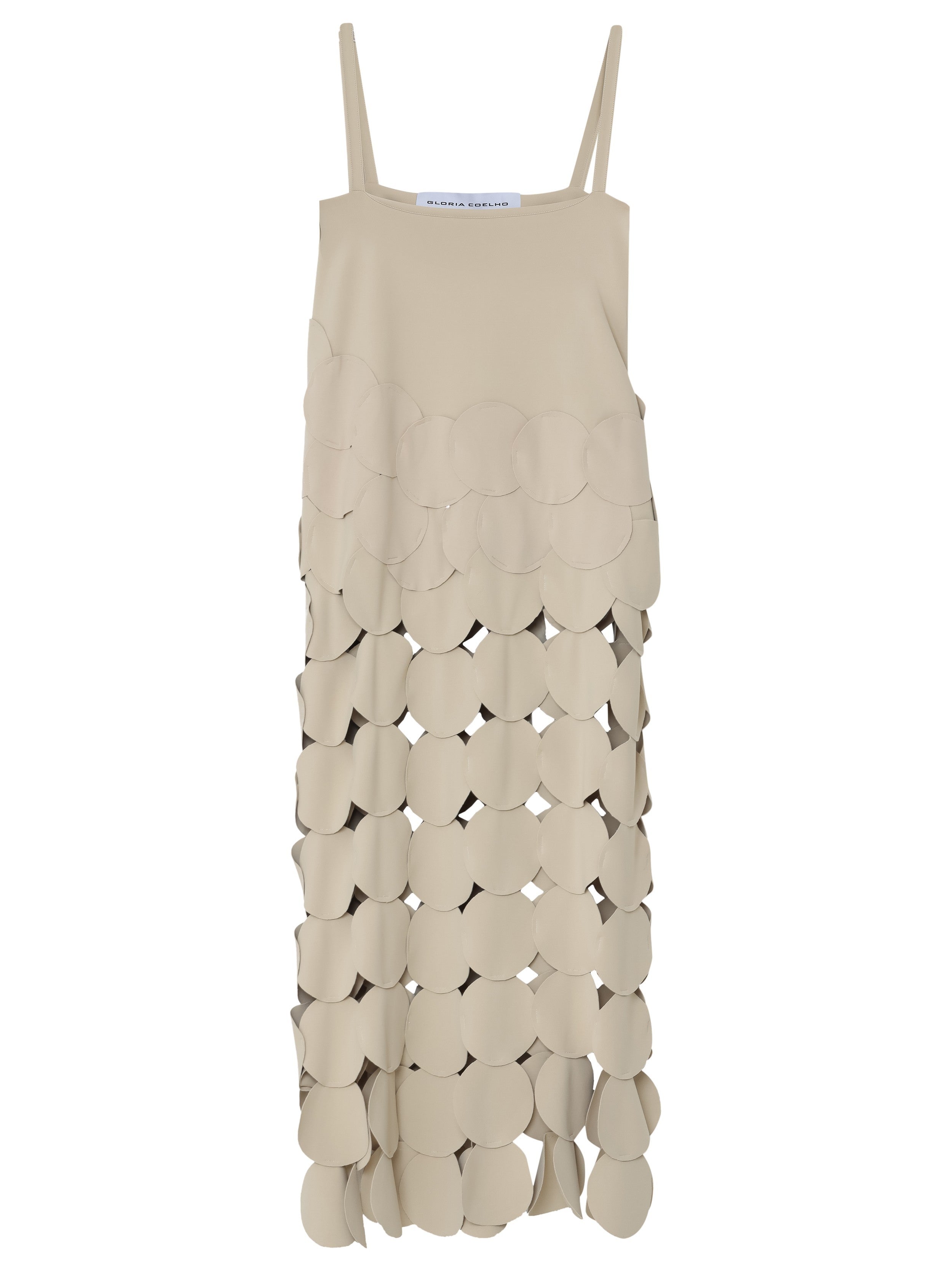 Saia de bolas de malha, com forro curto; a saia vem com alças, para que possa ser usada também como vestido.