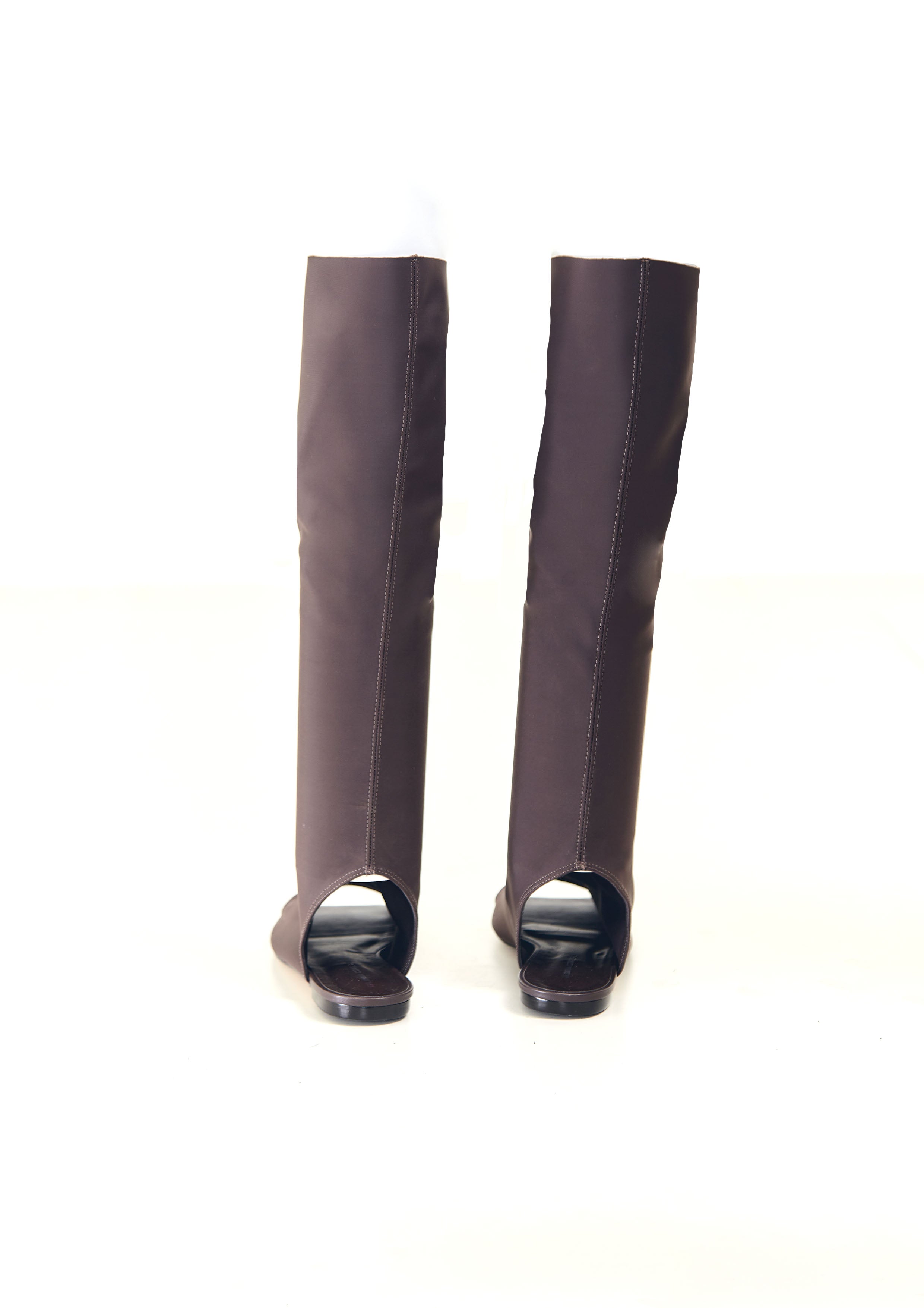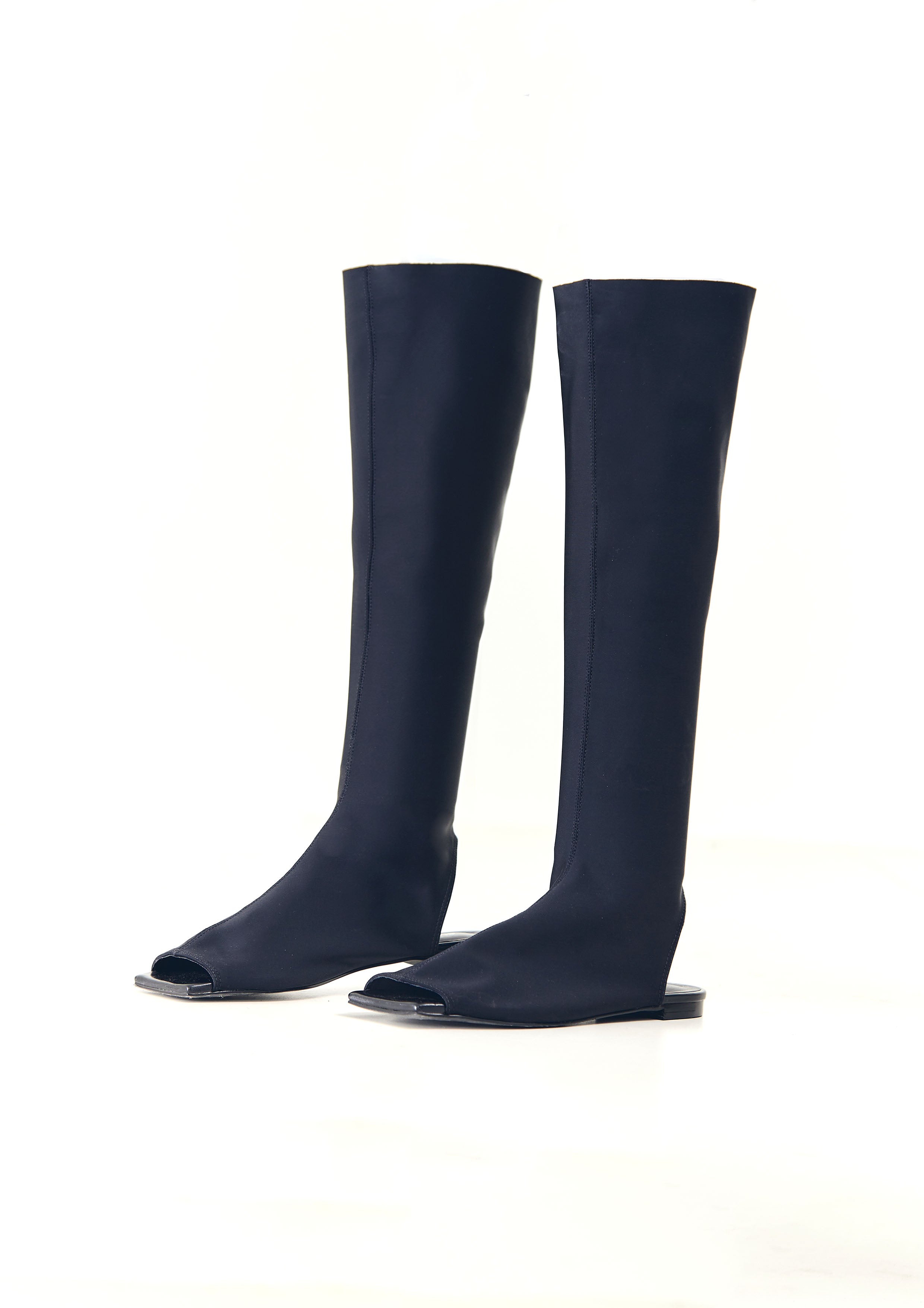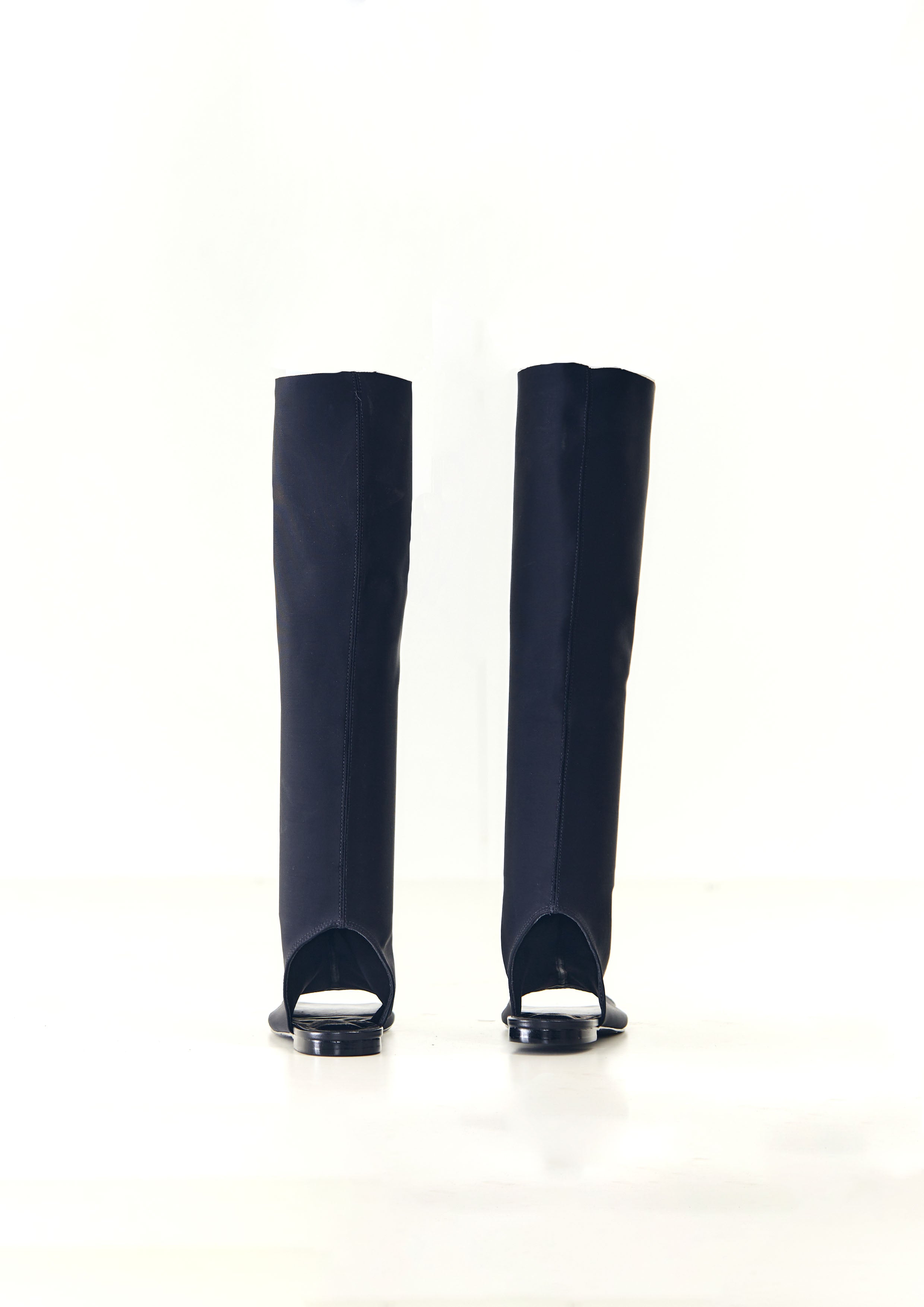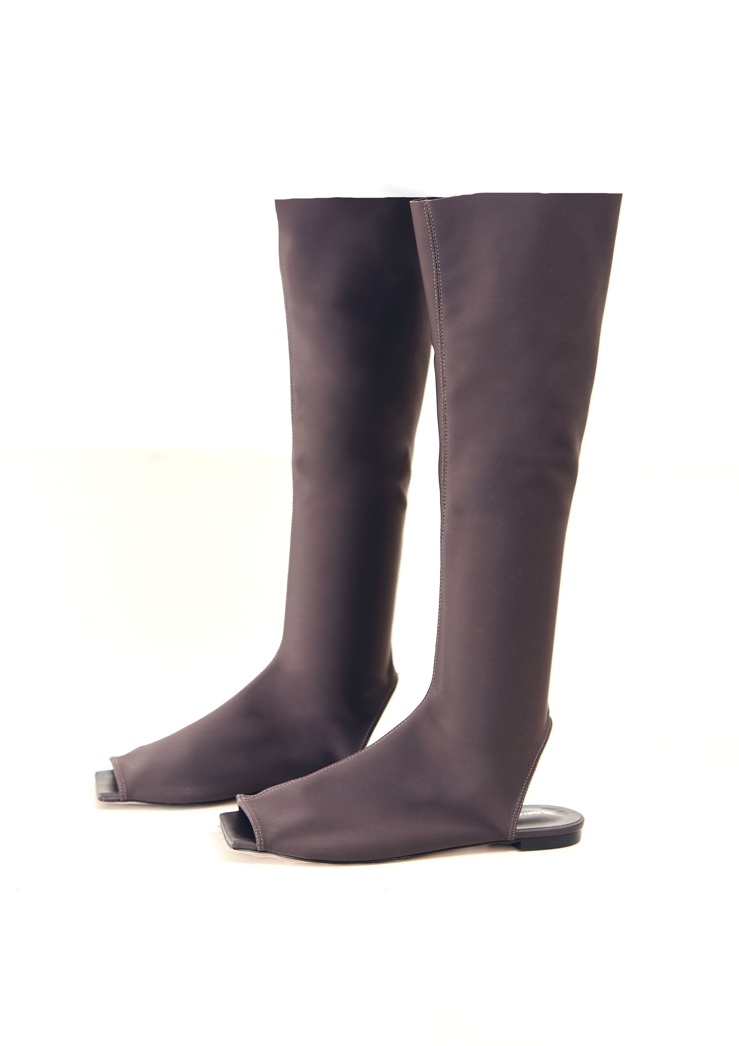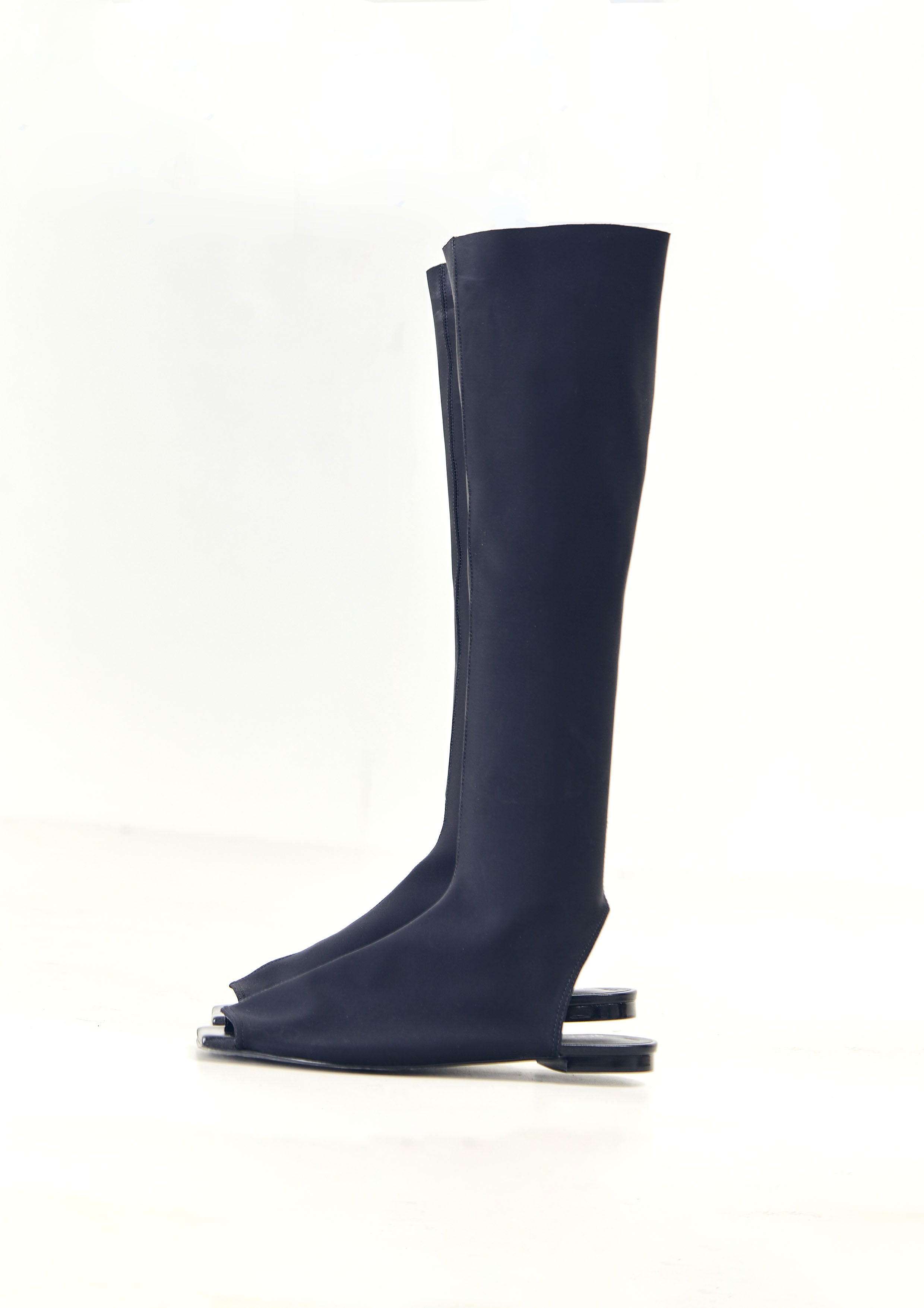 Bota de neoprene, com bico quadrado, frente e calcanhar aberto.