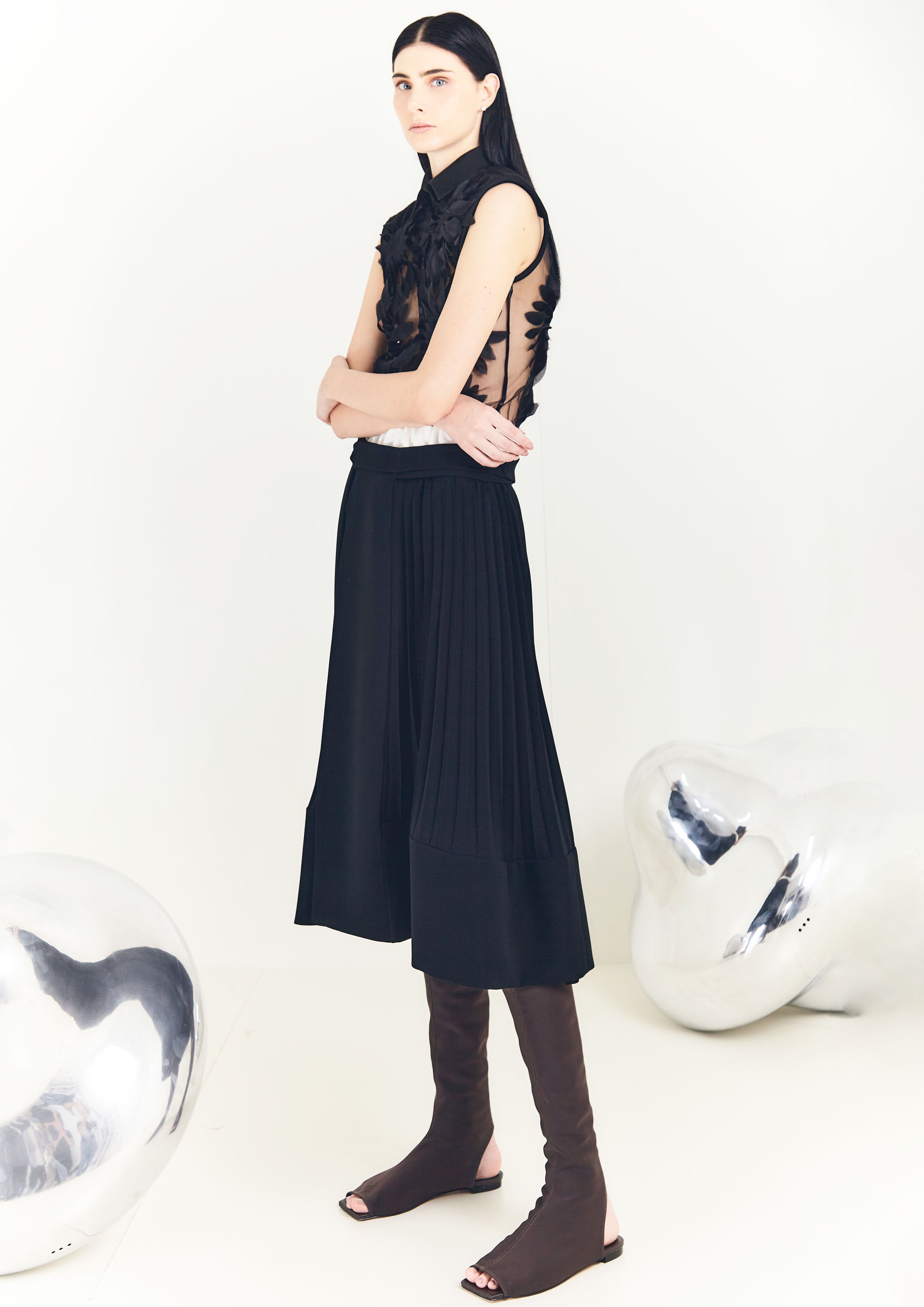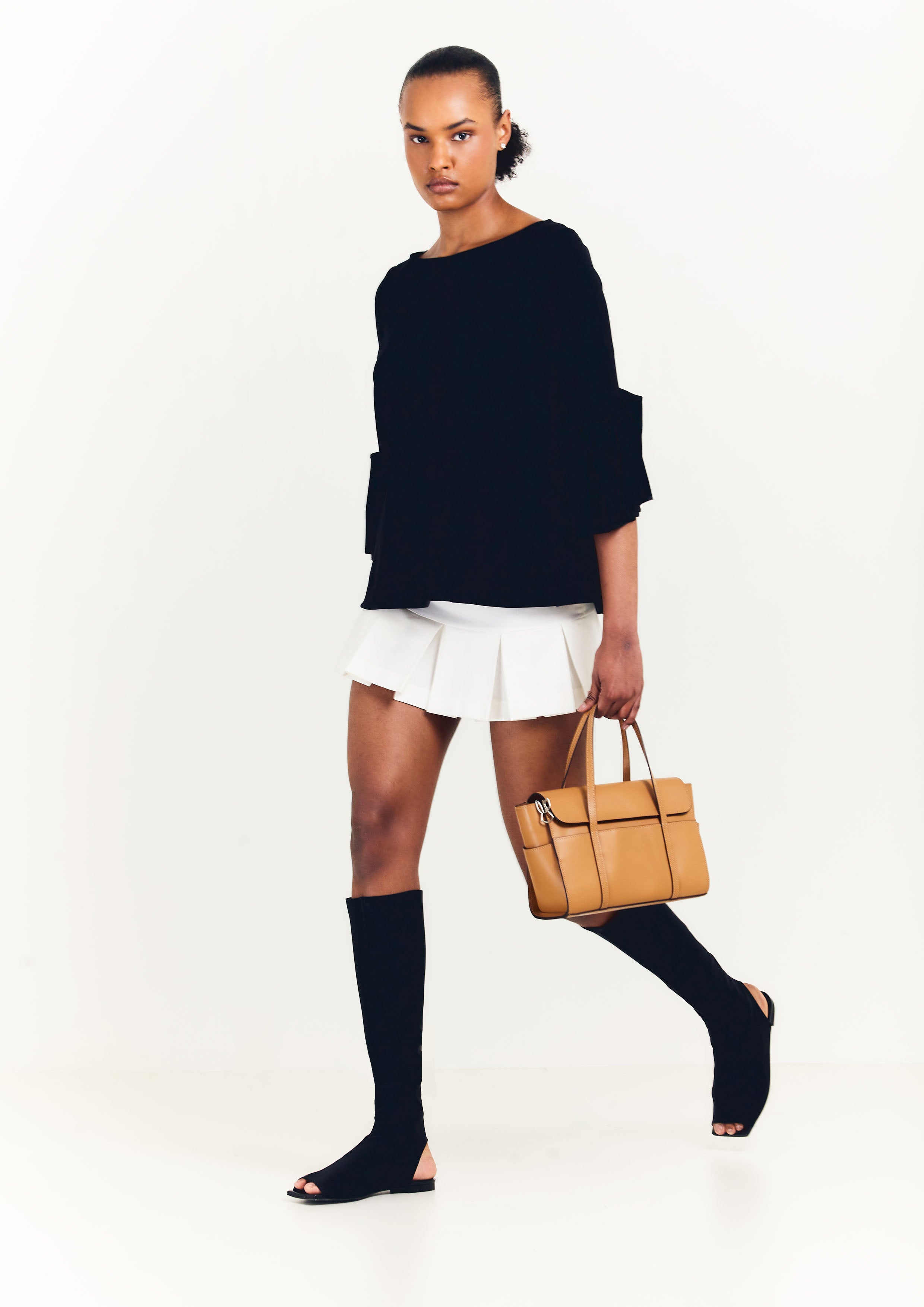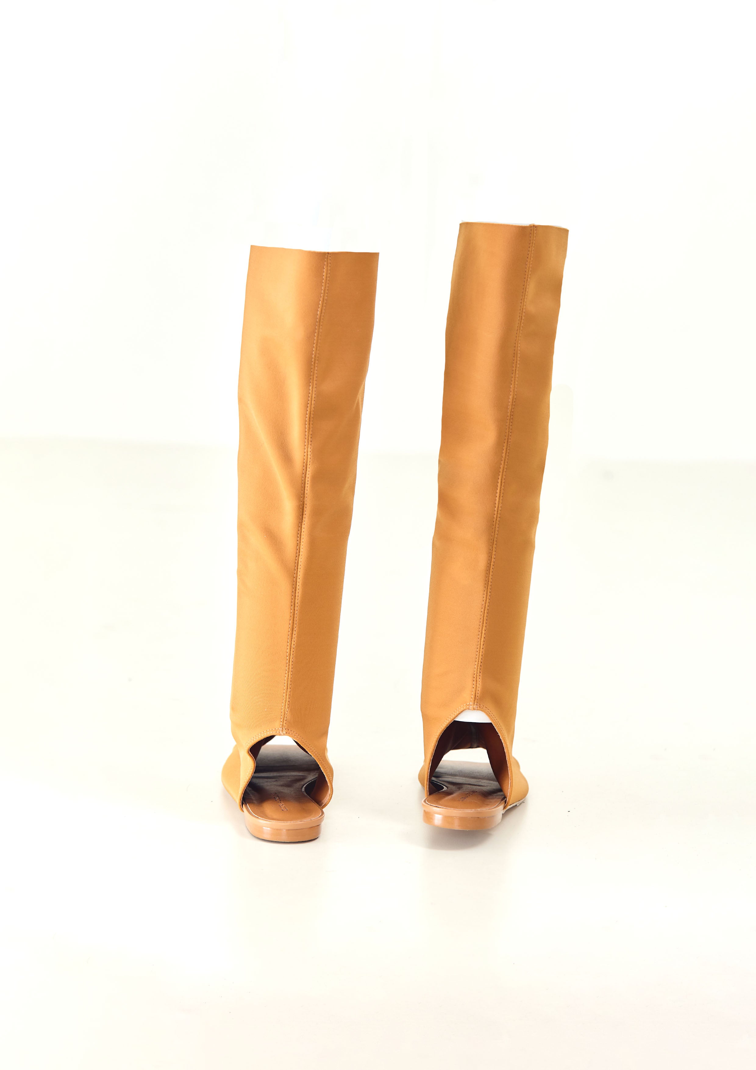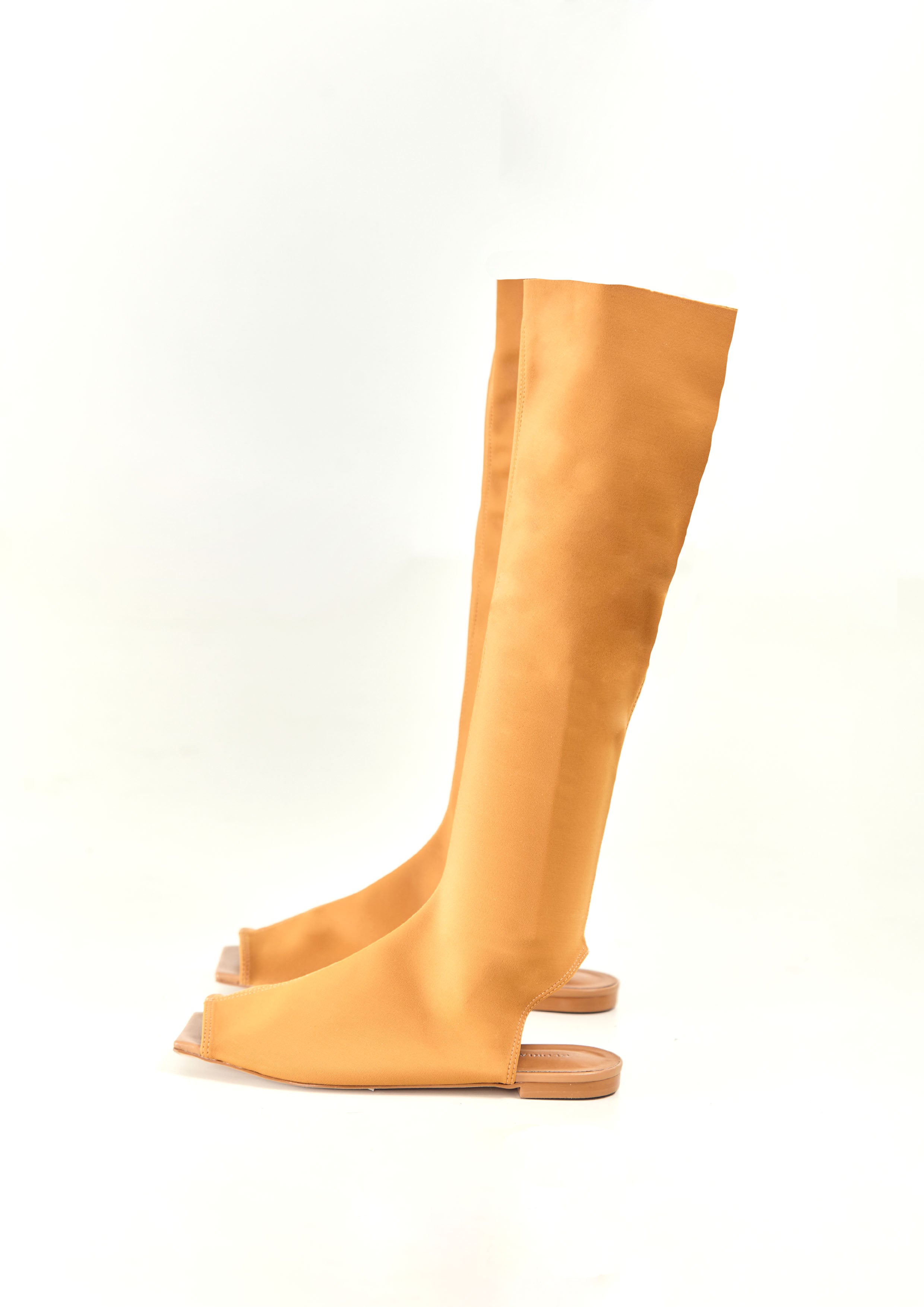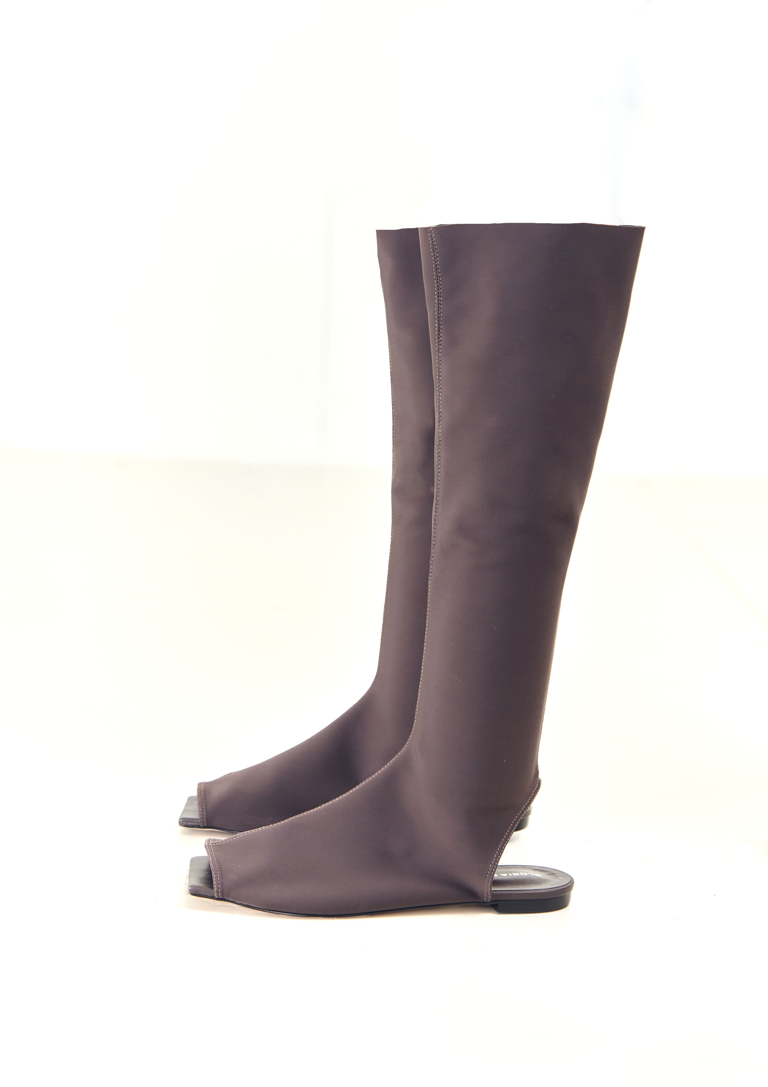 Bota de neoprene, com bico quadrado, frente e calcanhar aberto.