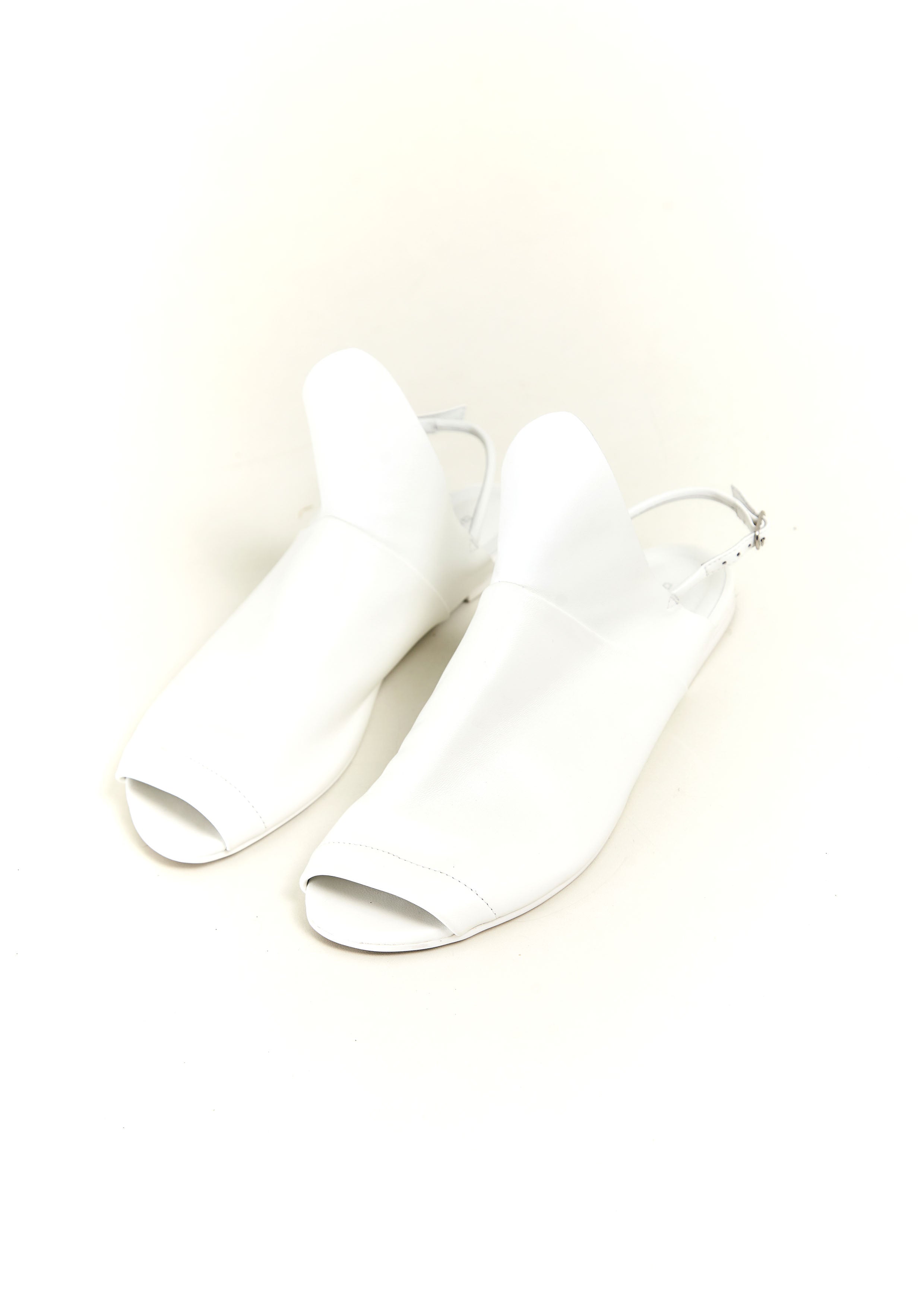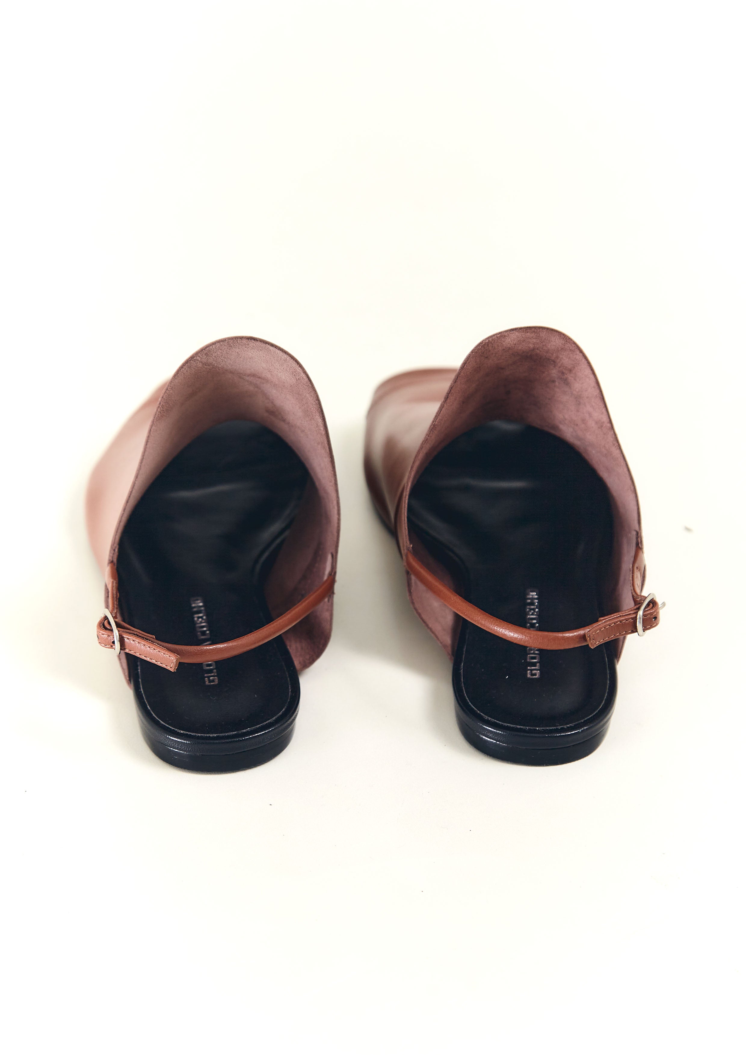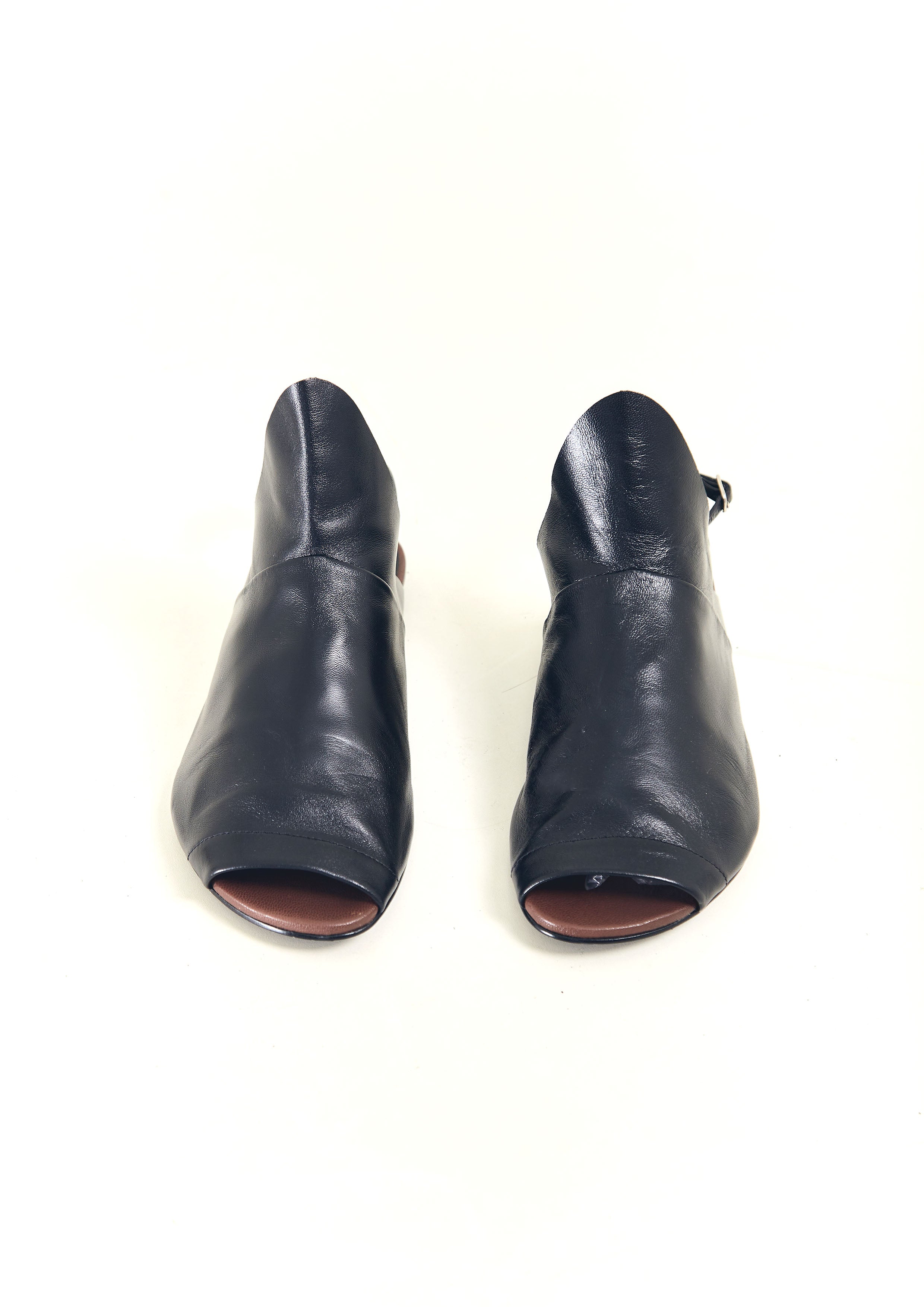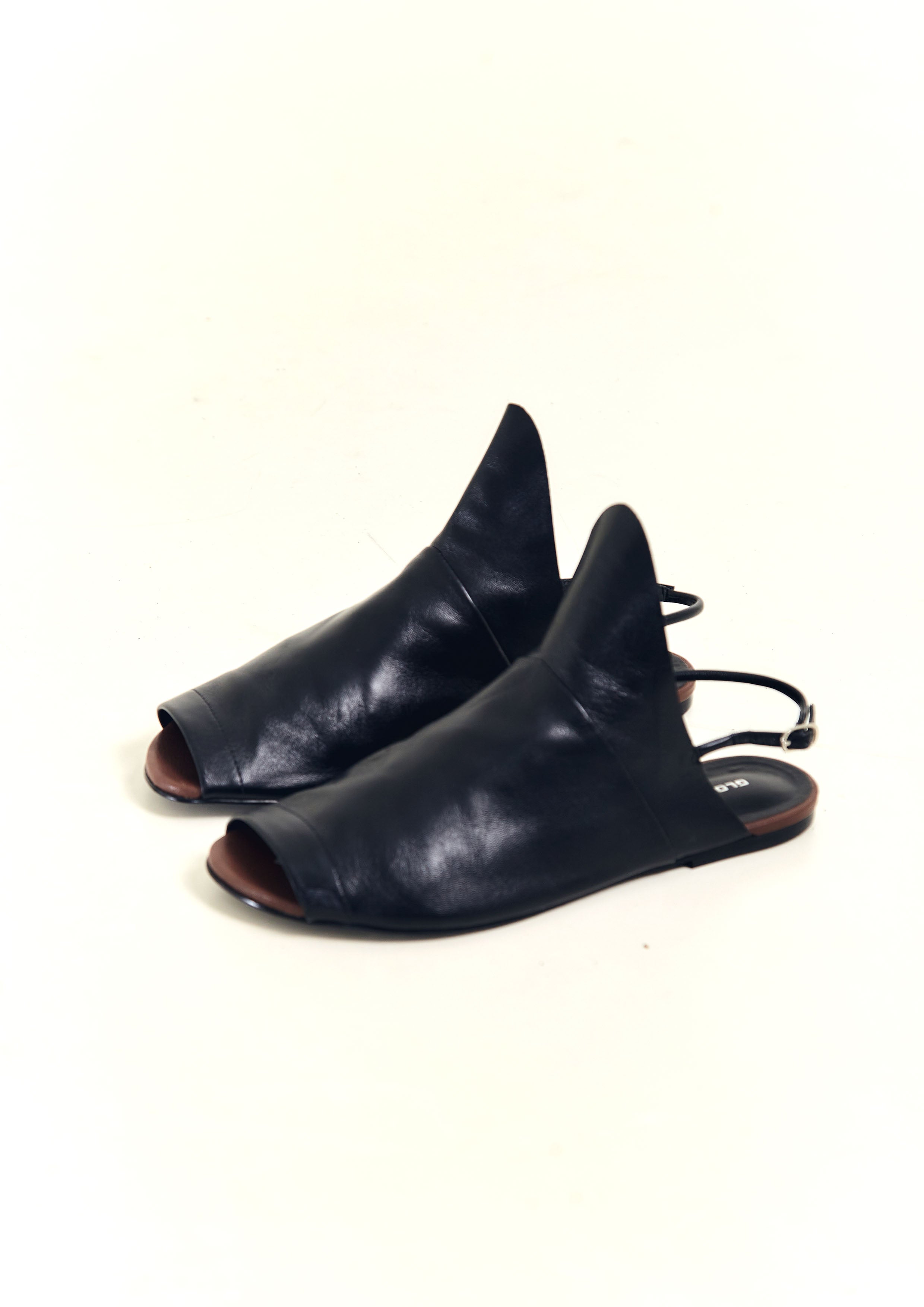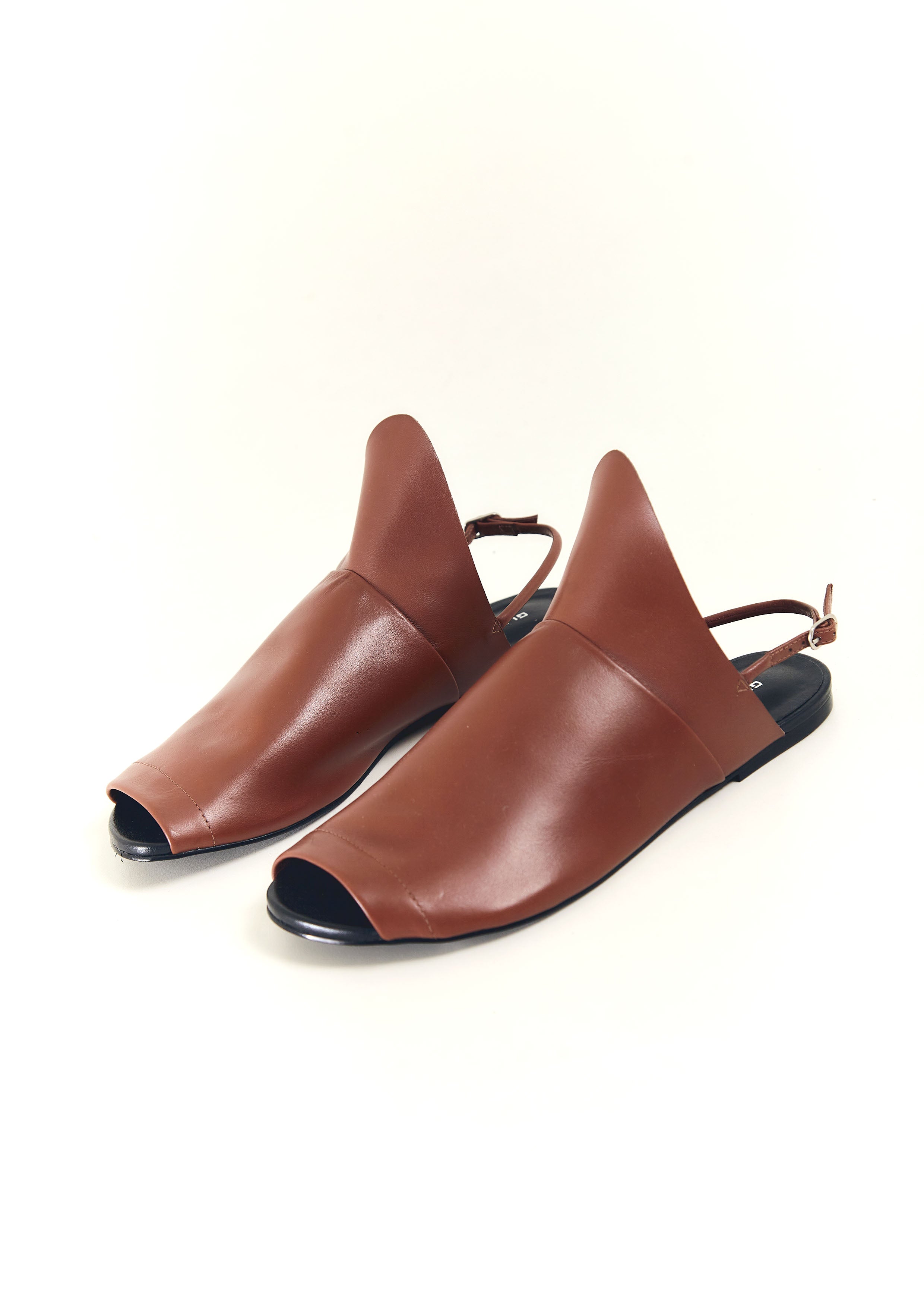 Sandália rasteira de couro, com tira no calcanhar e frente aberta.