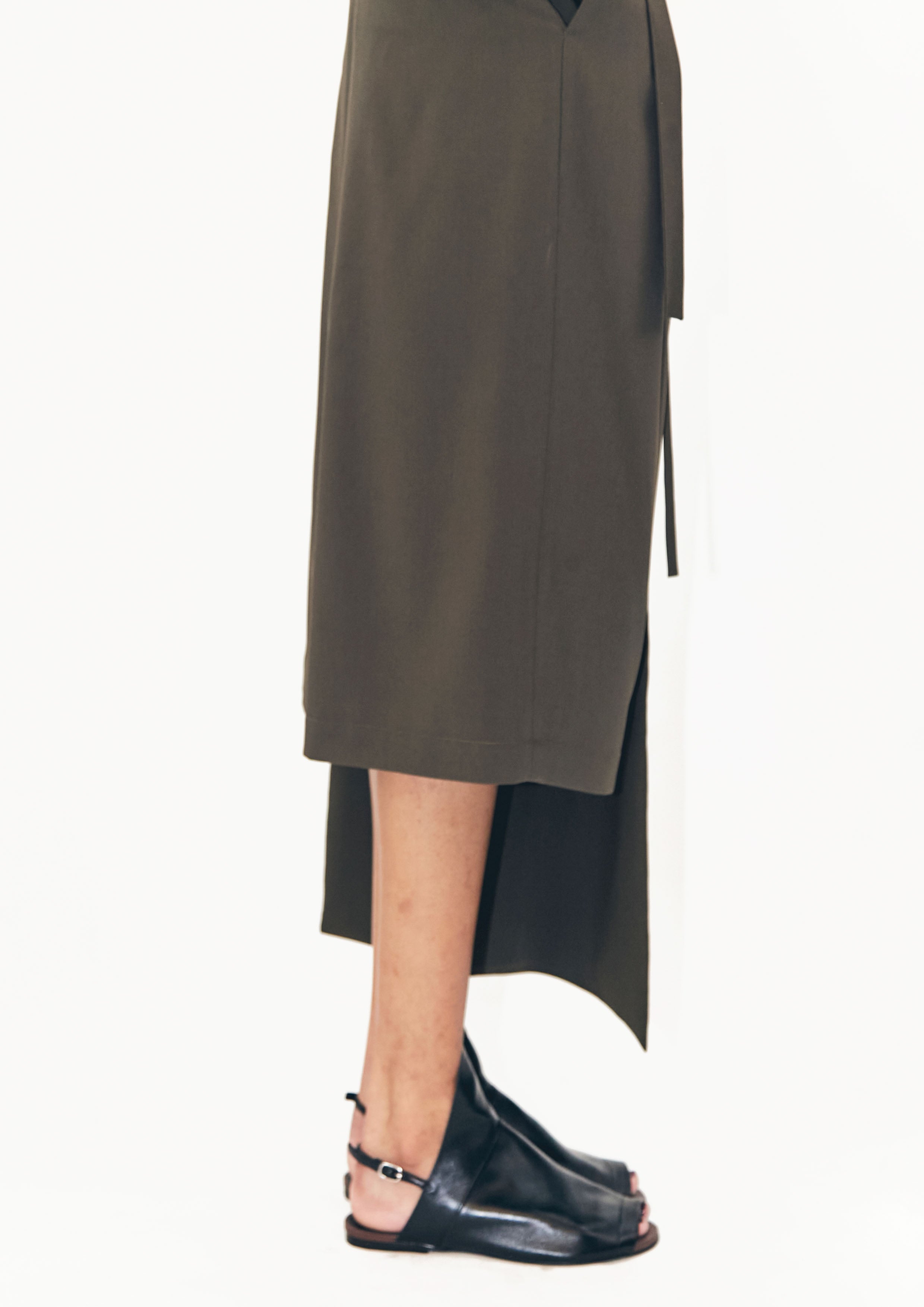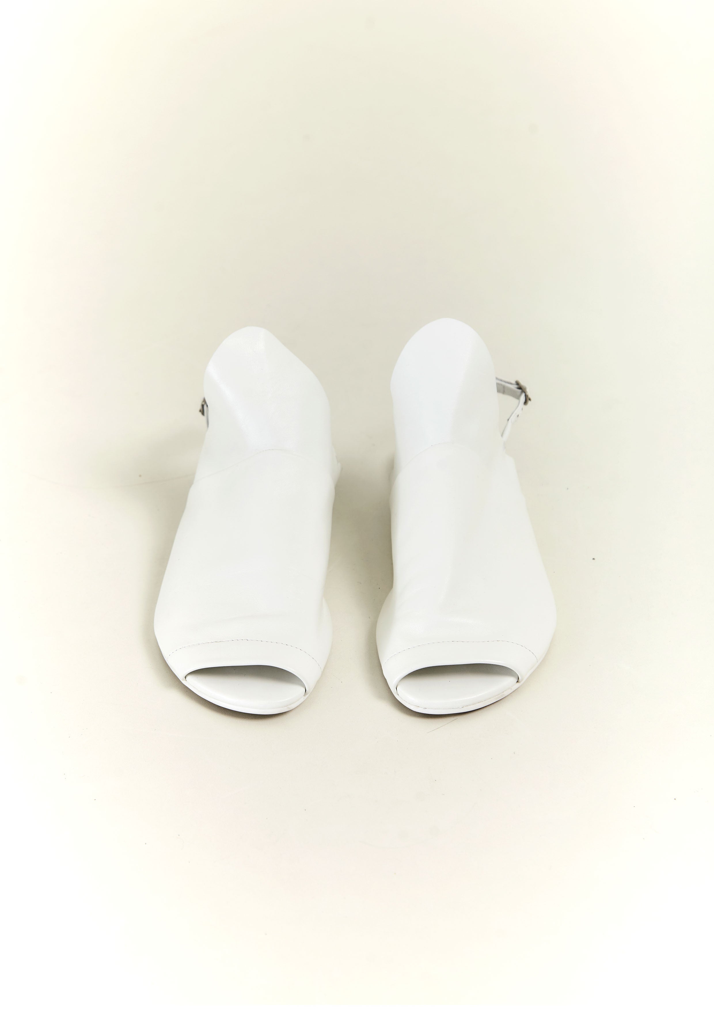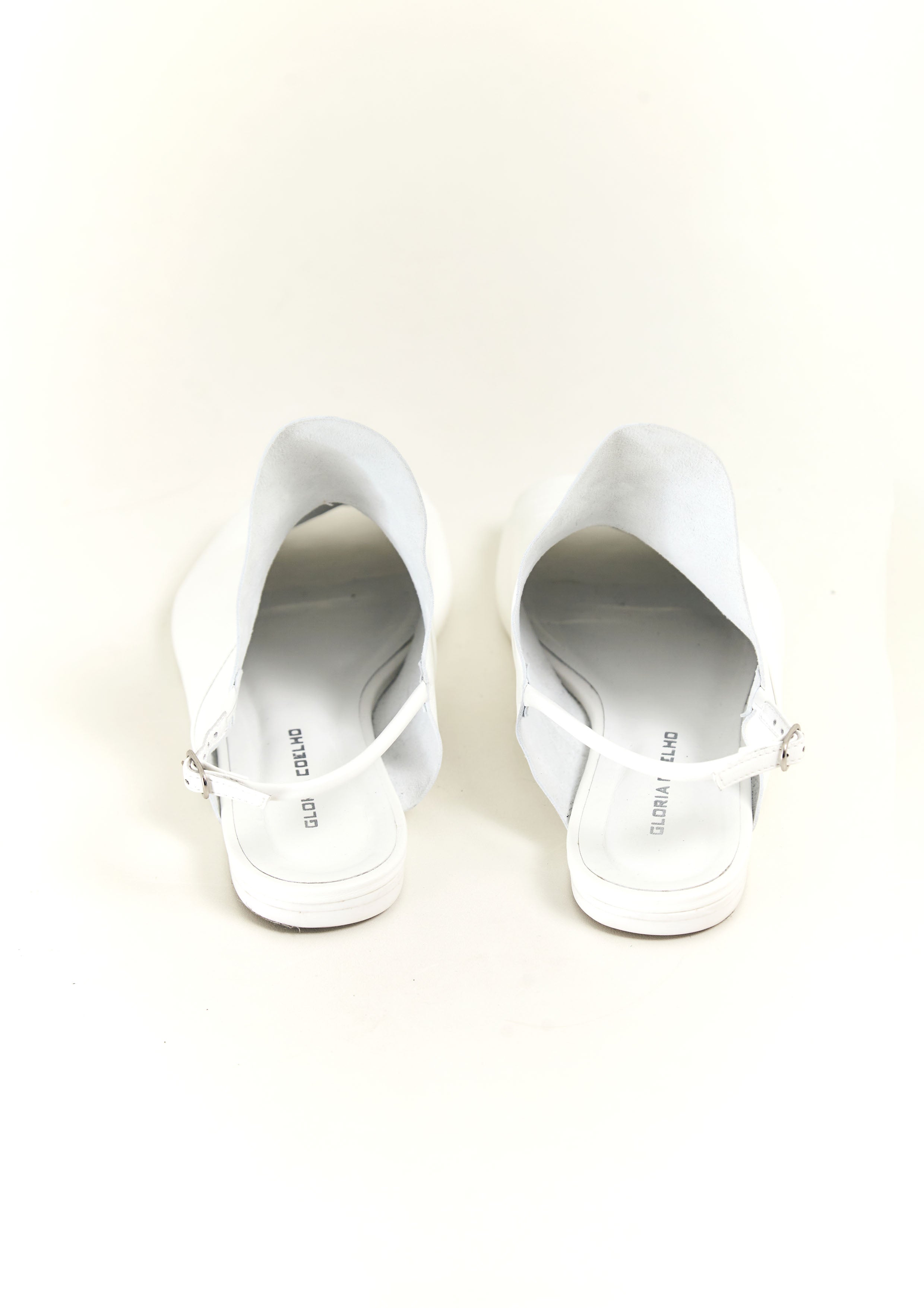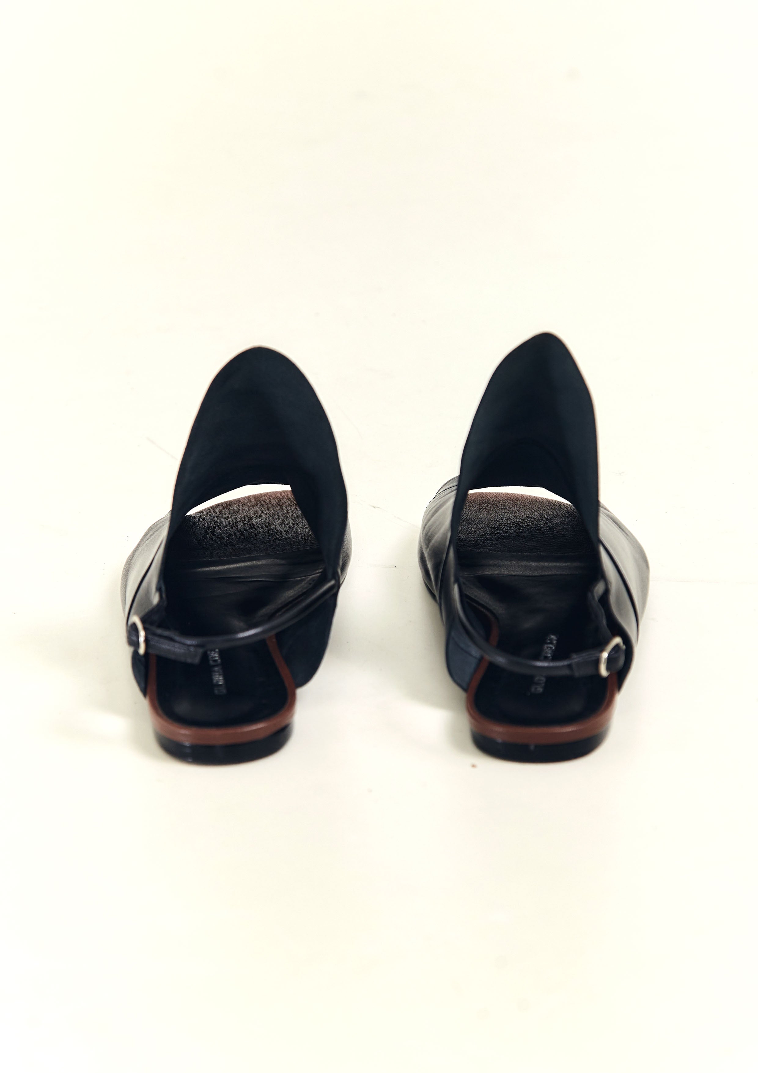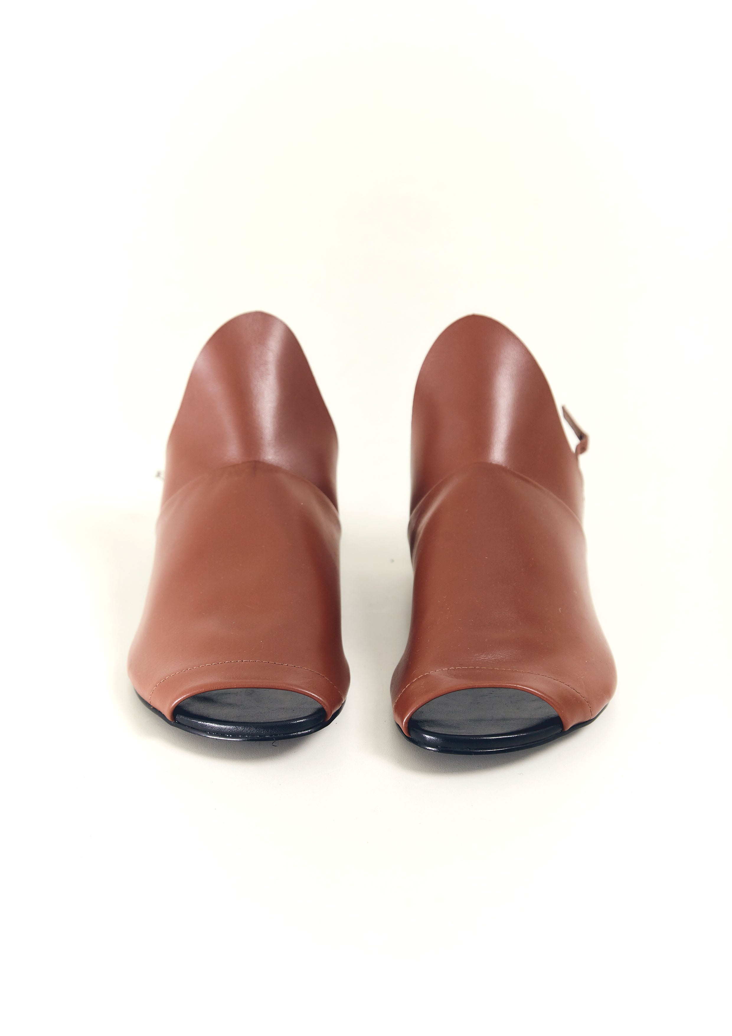 Sandália rasteira de couro, com tira no calcanhar e frente aberta.