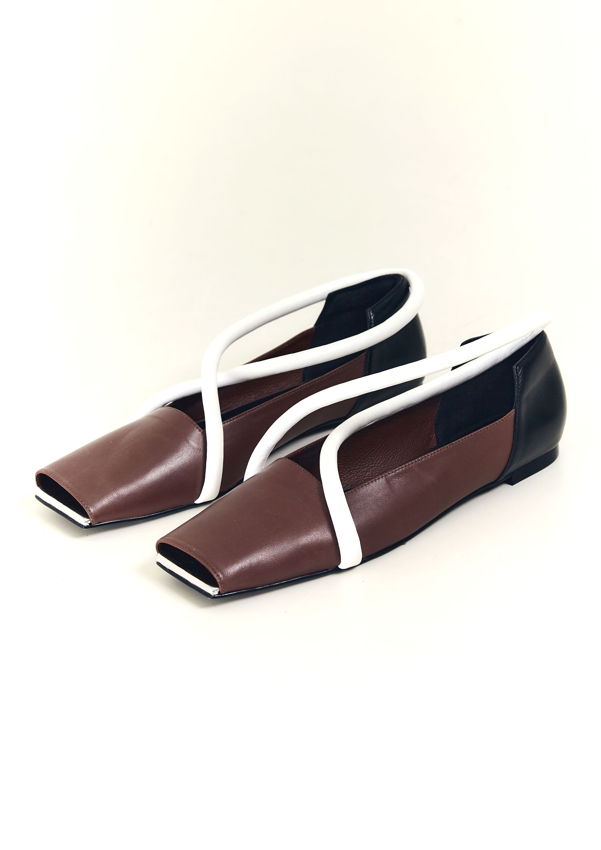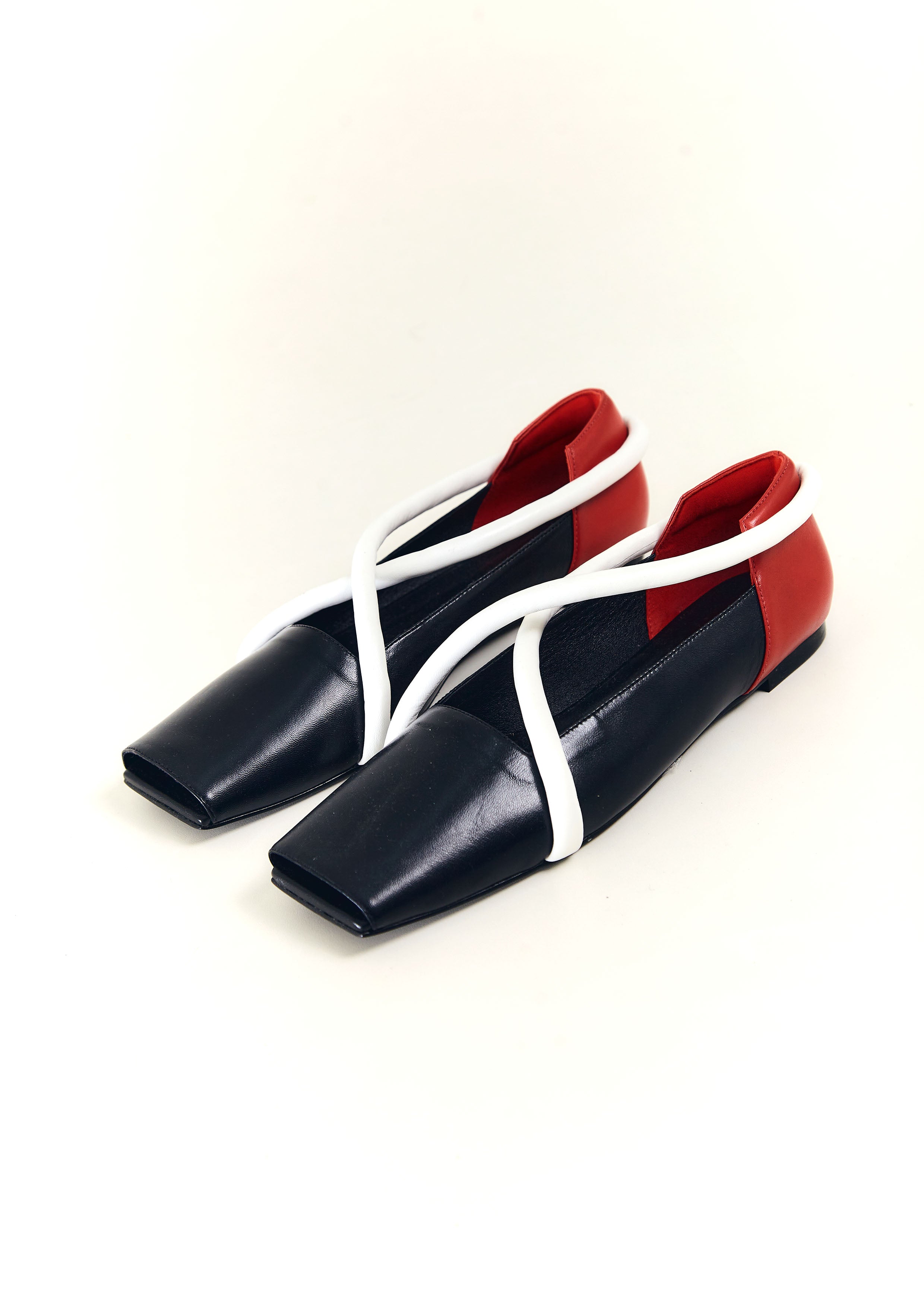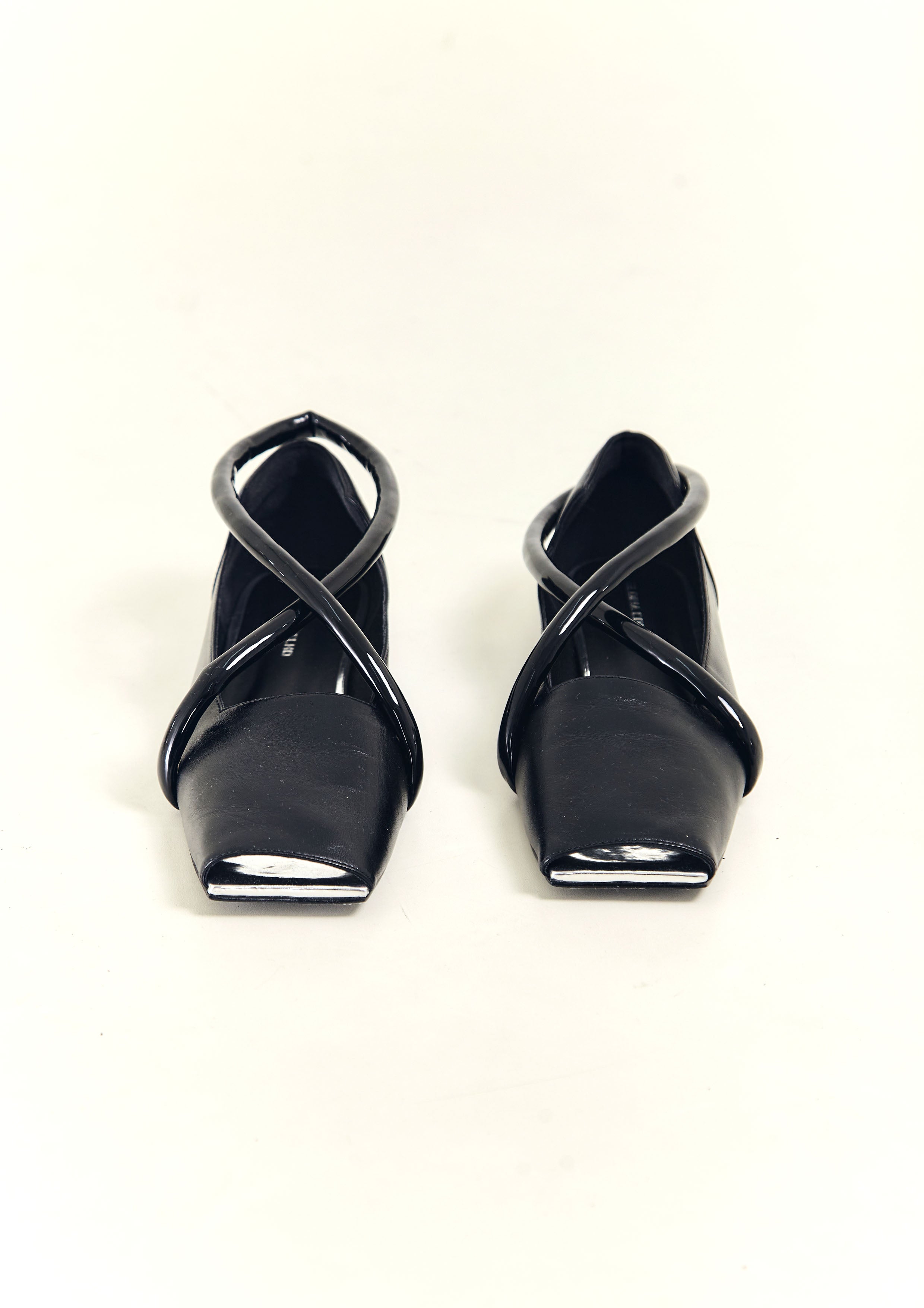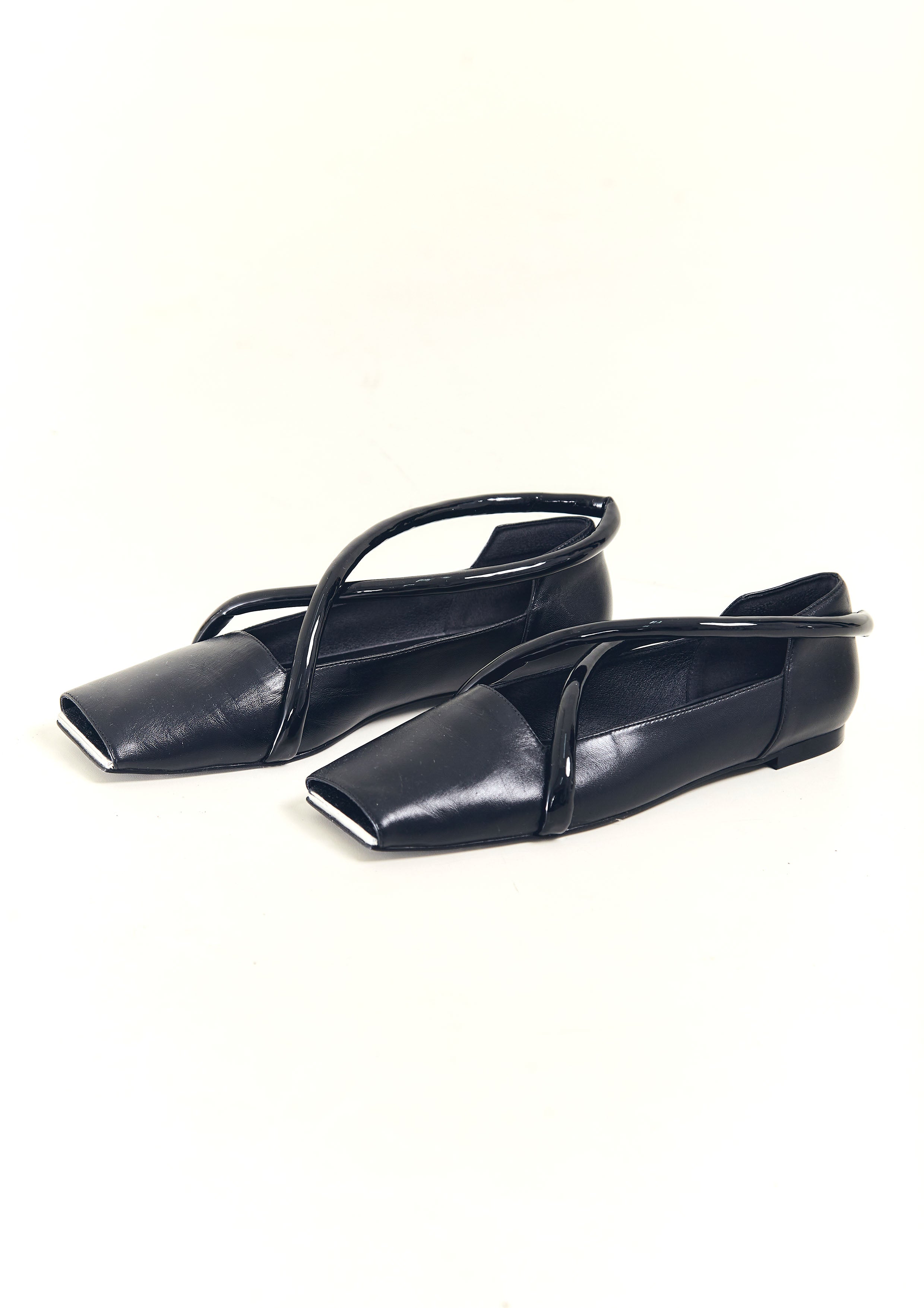 Sapatilha bico quadrado de couro, com tira em X de couro verniz, recorte quadrado e frente aberta.