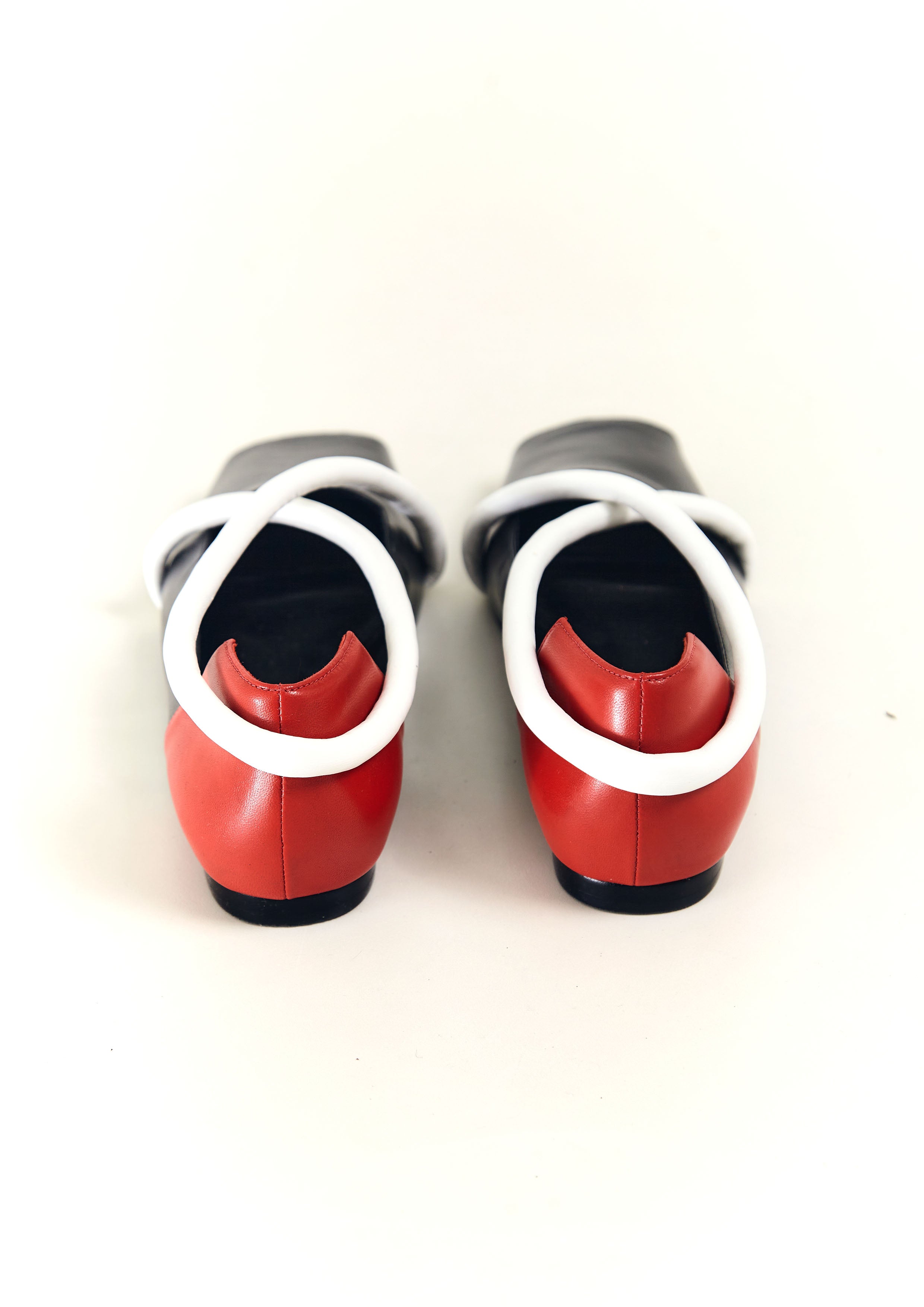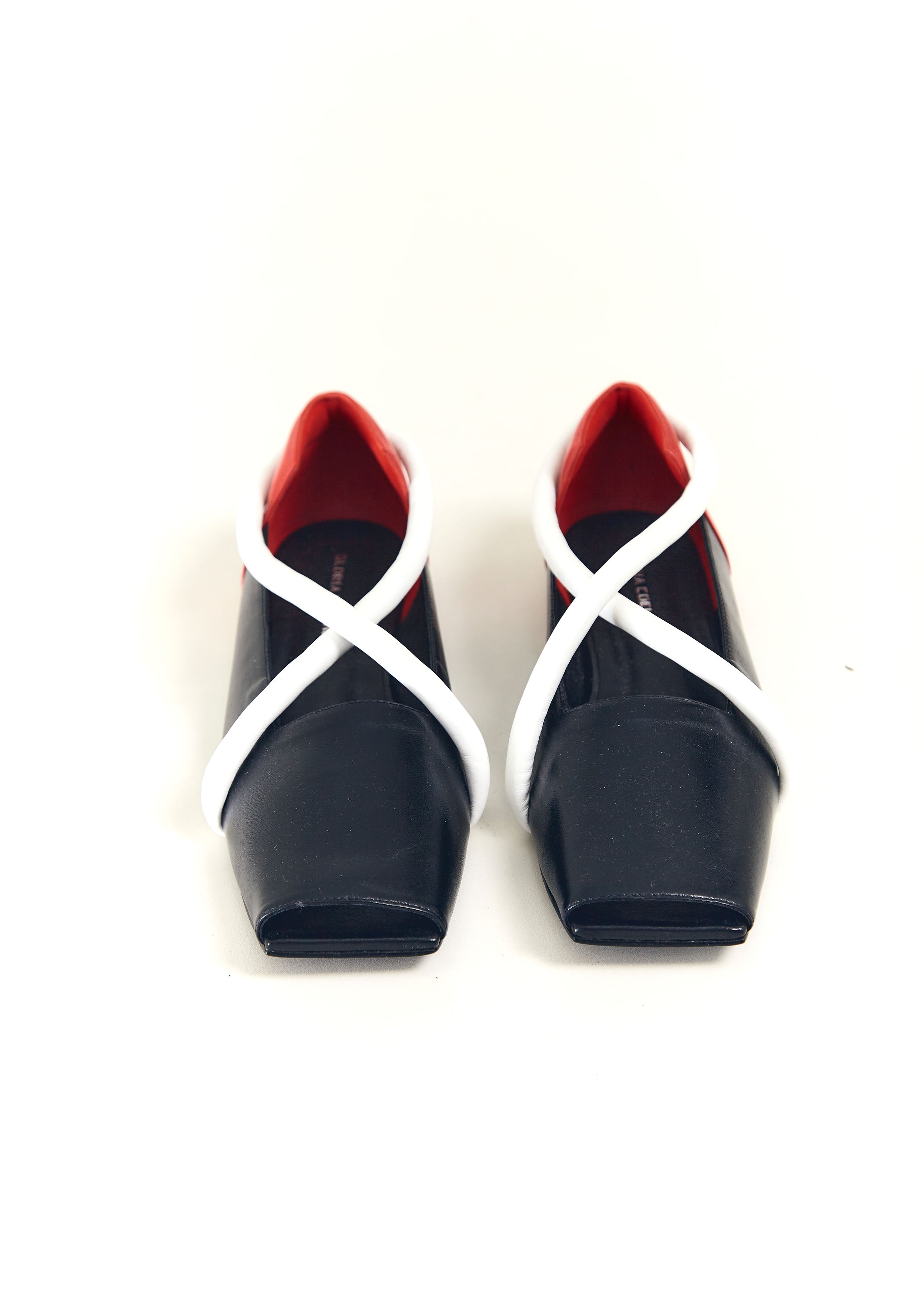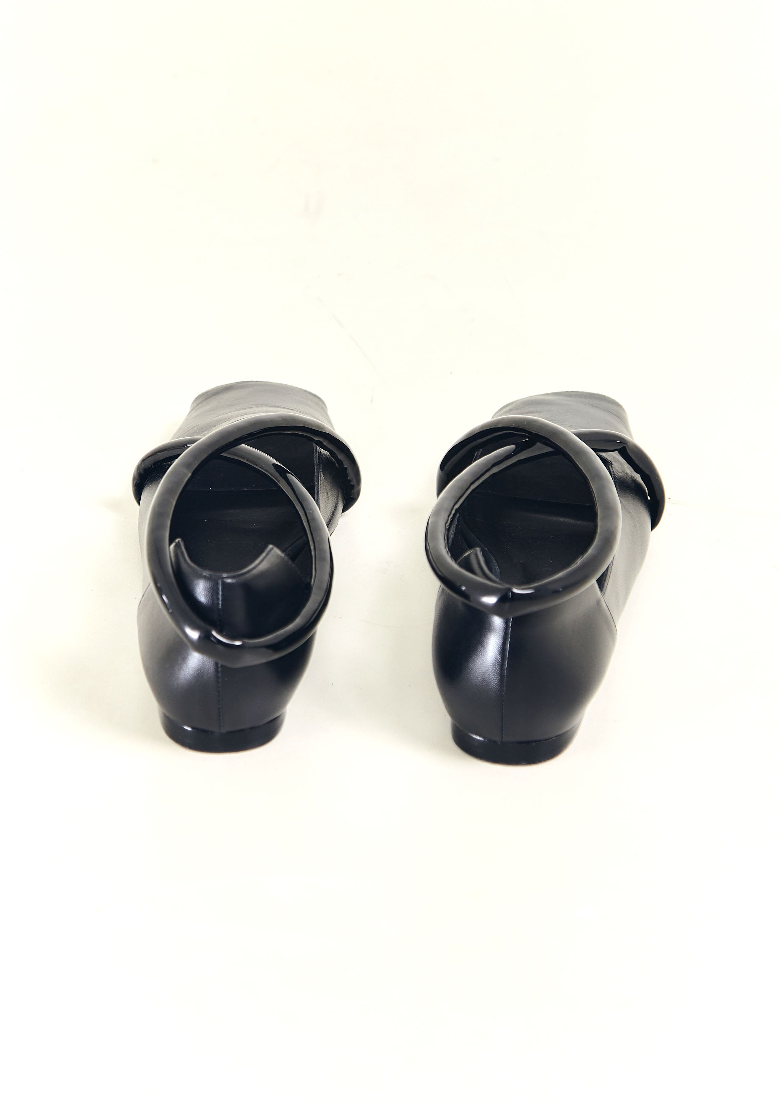 Sapatilha bico quadrado de couro, com tira em X de couro verniz, recorte quadrado e frente aberta.