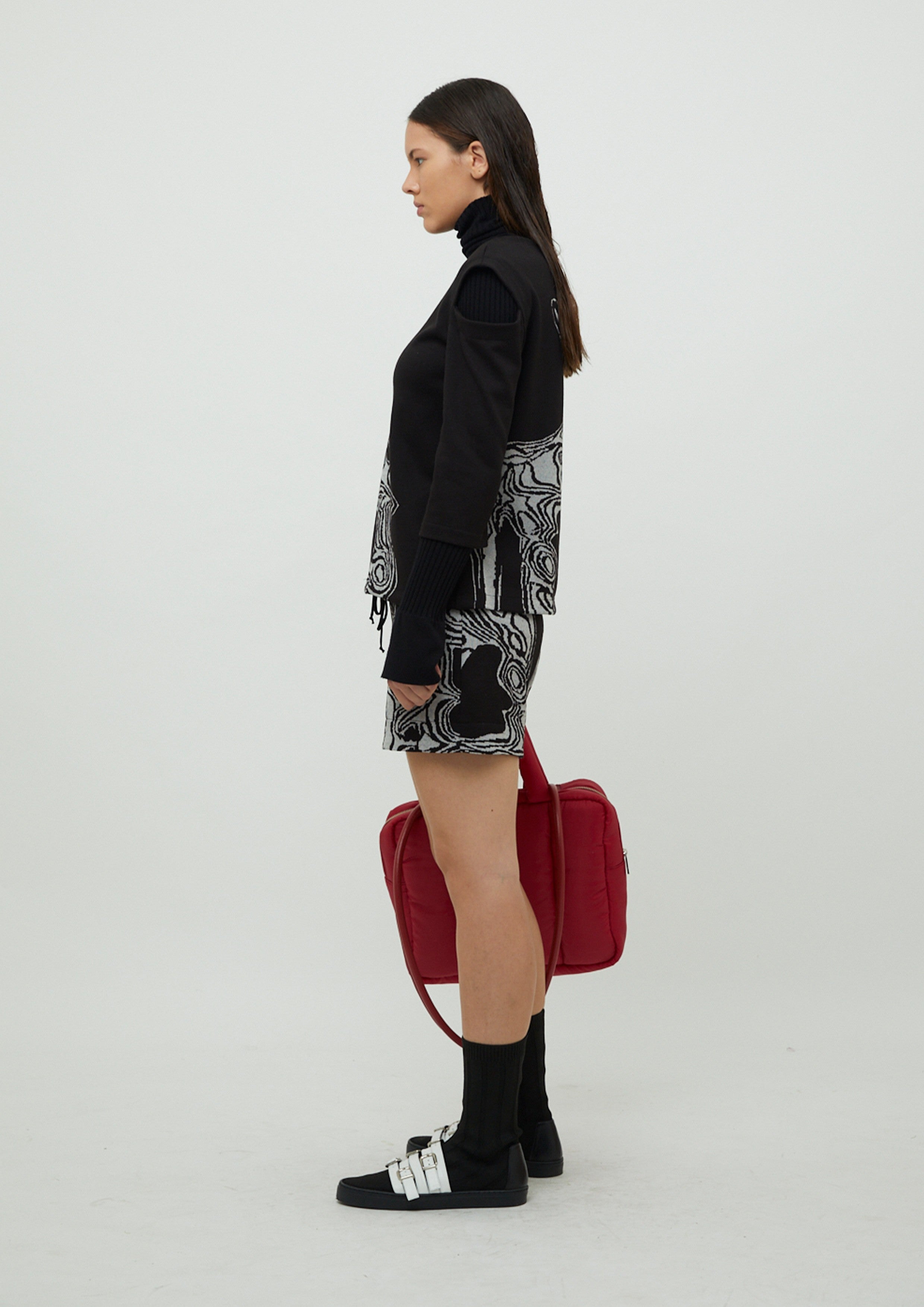 Shorts com estampa Corpo Virtual. Possui dois bolsos laterais com fecho em zíper, detalhe de faixa na cintura e fecho principal por amarração.