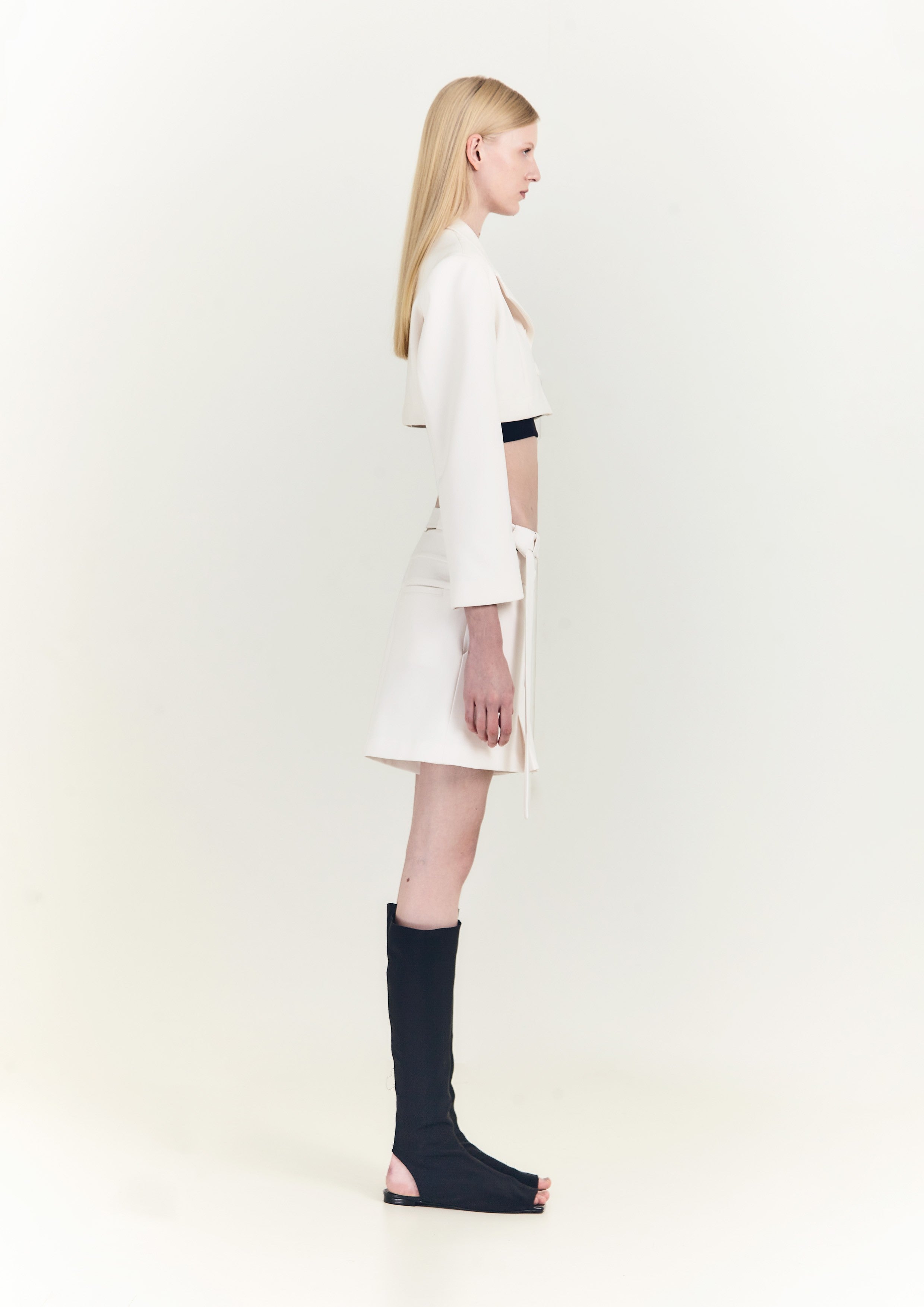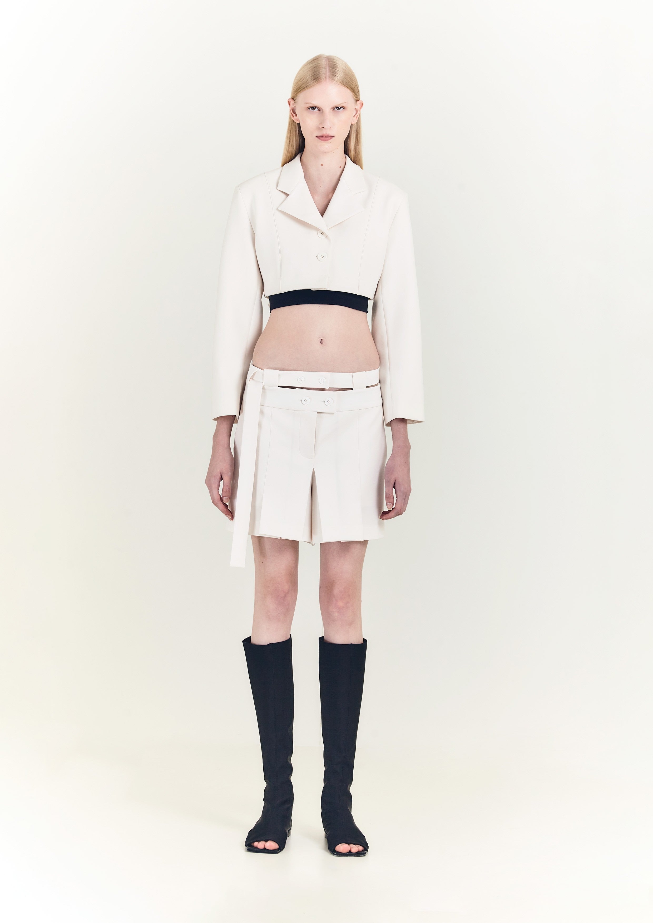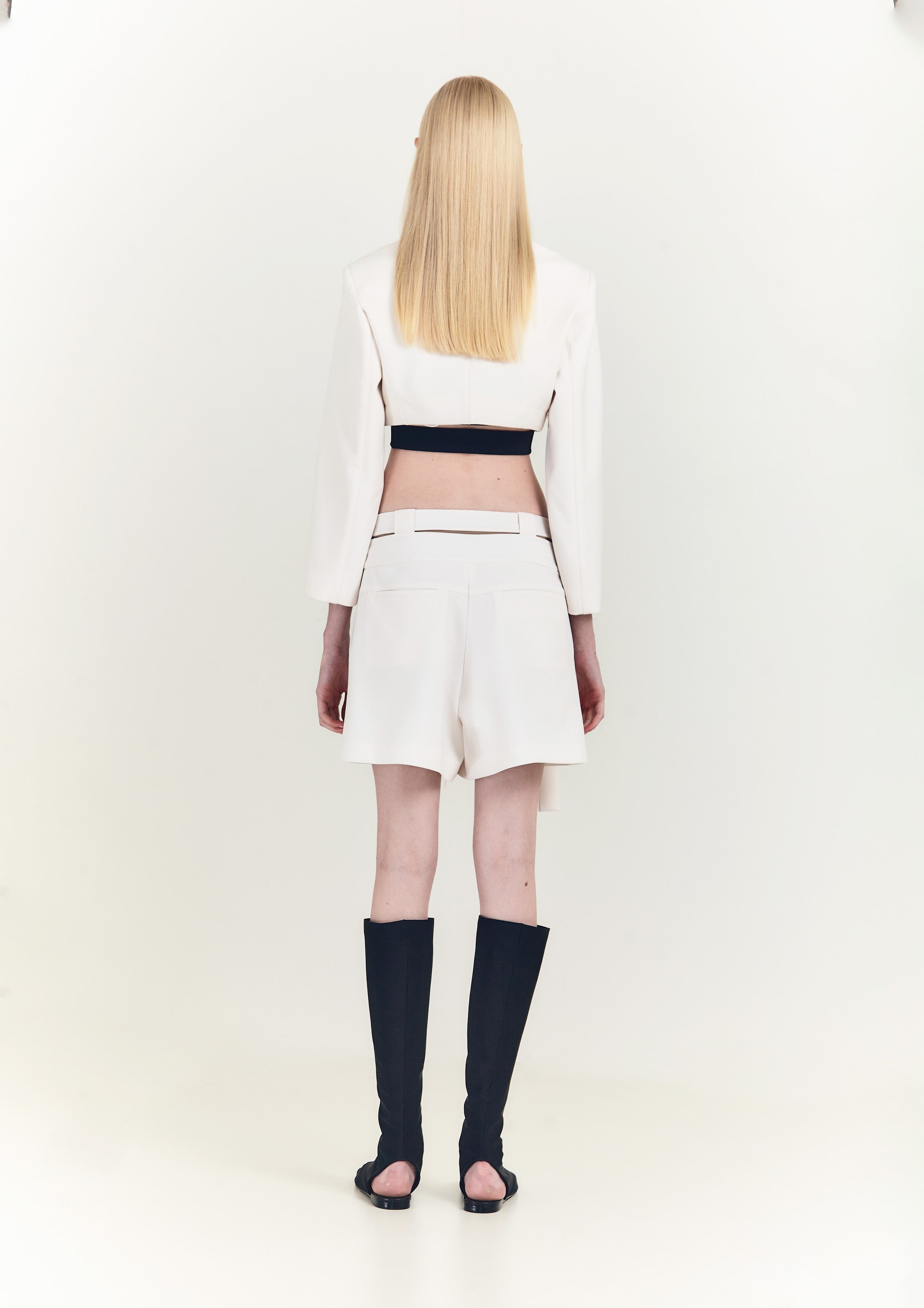 Short de gabardine, com pregas, cós duplo e cinto no mesmo tecido.