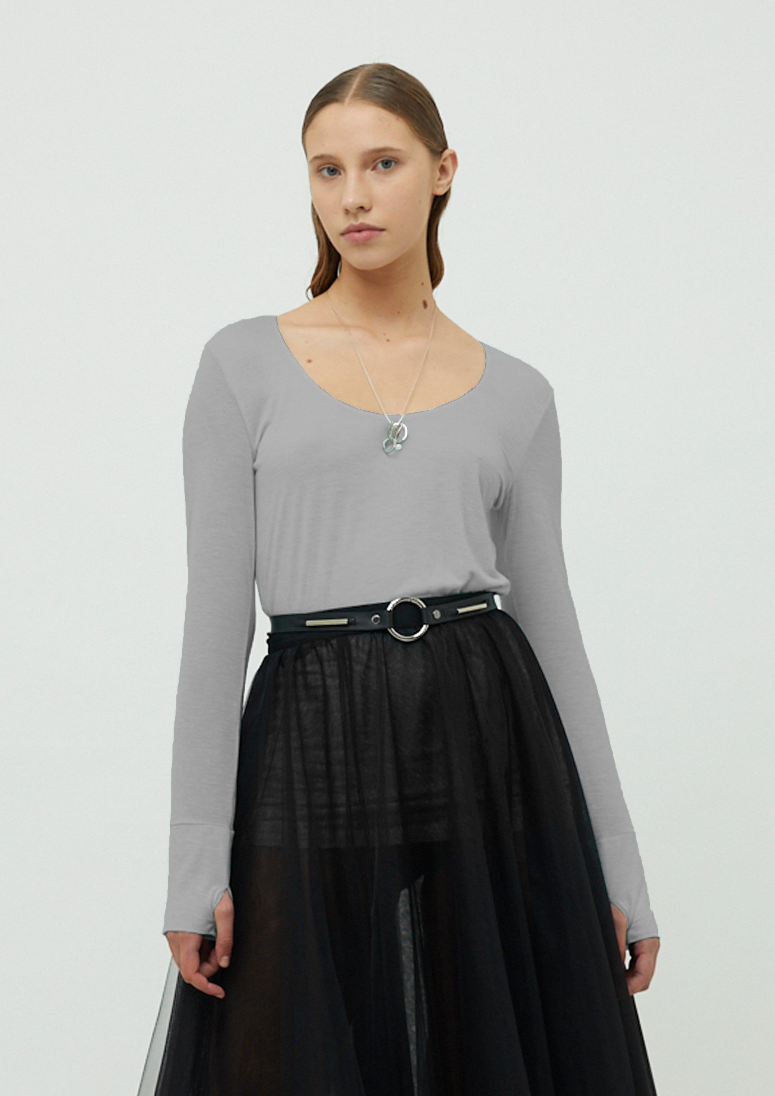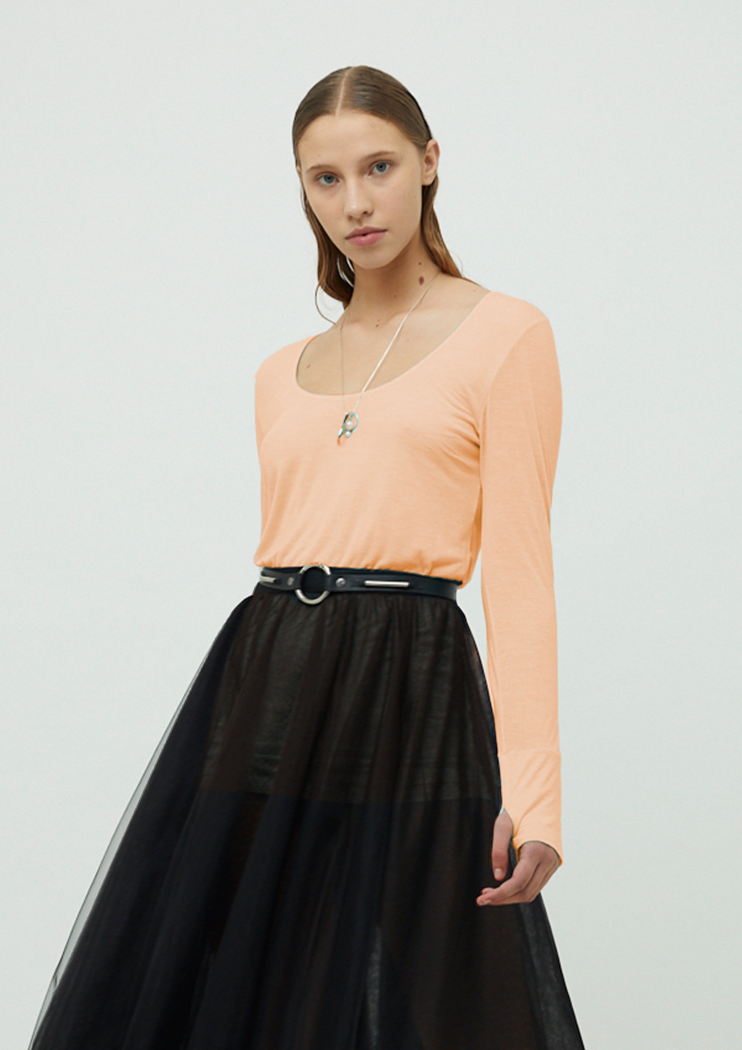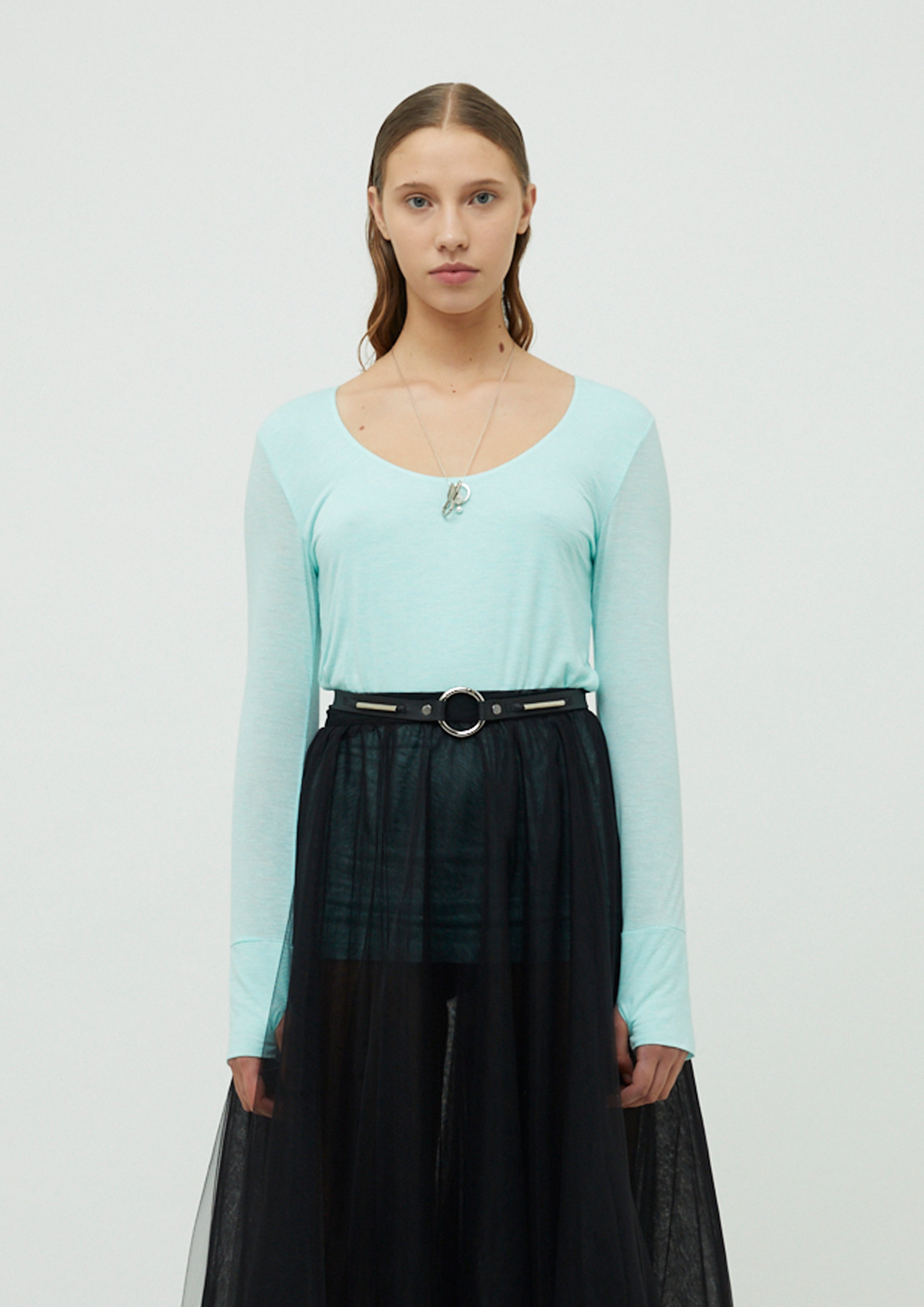 Blusa com decote U e mangas longas com leve transparência. Leve e prática para o dia a dia.